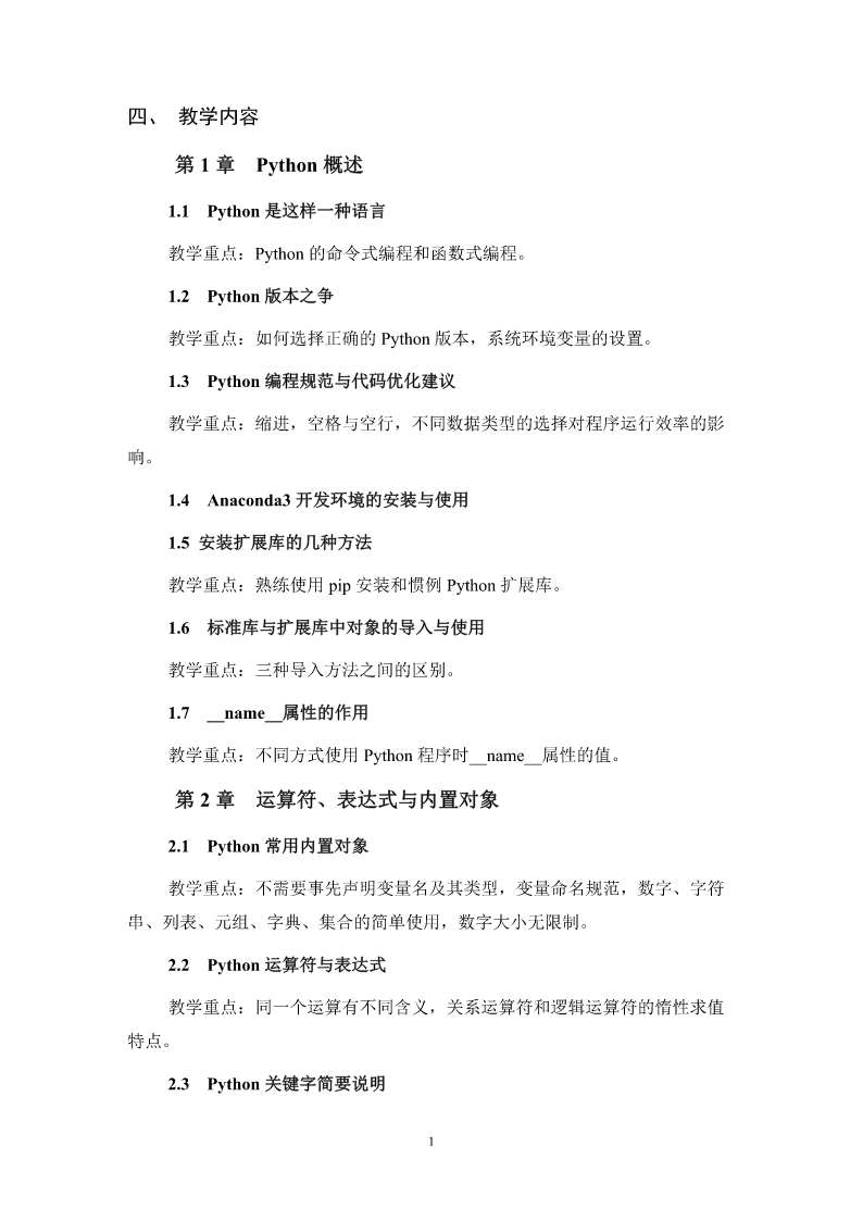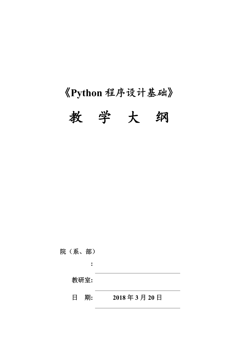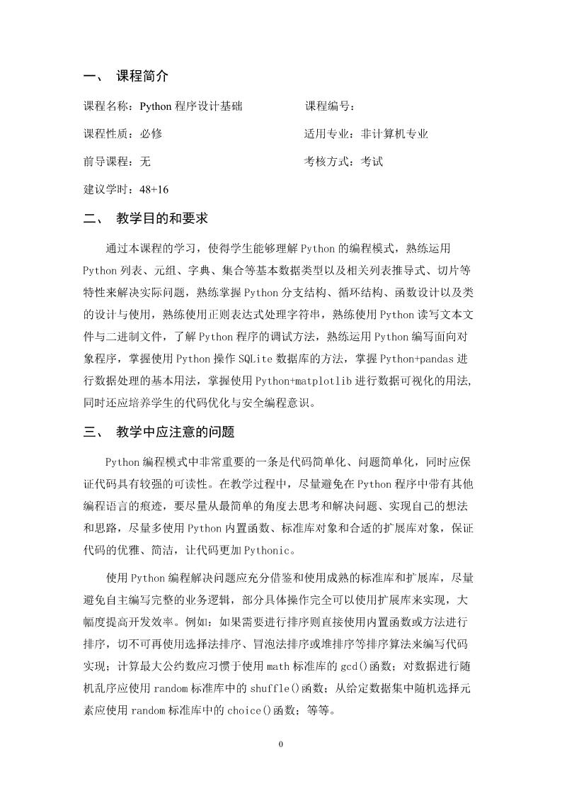 《Python程序设计基础》 教学大纲 院(系、部) : 教研室: 日期:2018年3月20日 目录 一、课程简介...................................................................................................................................1 二、教学目的和要求.......................................................................................................................1 三、教学中应注意的问题...............................................................................................................1 四、教学内容...................................................................................................................................2 五、教学课时分配...........................................................................................................................9 六、教材与参考书目.....................................................................................................................10 一、课程简介 课程名称:Python程序设计基础课程编号: 课程性质:必修适用专业:非计算机专业 前导课程:无考核方式:考试 建议学时:48+16 二、教学目的和要求 通过本课程的学习,使得学生能够理解Python的编程模式,熟练运用 Python列表、元组、字典、集合等基本数据类型以及相关列表推导式、切片等 特性来解决实际问题,熟练掌握Python分支结构、循环结构、函数设计以及类 的设计与使用,熟练使用正则表达式处理字符串,熟练使用Python读写文本文 件与二进制文件,了解Python程序的调试方法,熟练运用Python编写面向对 象程序,掌握使用Python操作SQLite数据库的方法,掌握Python+pandas进 行数据处理的基本用法,掌握使用Python+matplotlib进行数据可视化的用法, 同时还应培养学生的代码优化与安全编程意识。 三、教学中应注意的问题 Python编程模式中非常重要的一条是代码简单化、问题简单化,同时应保 证代码具有较强的可读性。在教学过程中,尽量避免在Python程序中带有其他 编程语言的痕迹,要尽量从最简单的角度去思考和解决问题、实现自己的想法 和思路,尽量多使用Python内置函数、标准库对象和合适的扩展库对象,保证 代码的优雅、简洁,让代码更加Pythonic。 使用Python编程解决问题应充分借鉴和使用成熟的标准库和扩展库,尽量 避免自主编写完整的业务逻辑,部分具体操作完全可以使用扩展库来实现,大 幅度提高开发效率。例如:如果需要进行排序则直接使用内置函数或方法进行 排序,切不可再使用选择法排序、冒泡法排序或堆排序等排序算法来编写代码 实现;计算最大公约数应习惯于使用math标准库的gcd()函数;对数据进行随 机乱序应使用random标准库中的shuffle()函数;从给定数据集中随机选择元 素应使用random标准库中的choice()函数;等等。 0 四、教学内容 第1章Python概述 1.1Python是这样一种语言 教学重点:Python的命令式编程和函数式编程。 1.2Python版本之争 教学重点:如何选择正确的Python版本,系统环境变量的设置。 1.3Python编程规范与代码优化建议 教学重点:缩进,空格与空行,不同数据类型的选择对程序运行效率的影 响。 1.4Anaconda3开发环境的安装与使用 1.5安装扩展库的几种方法 教学重点:熟练使用pip安装和惯例Python扩展库。 1.6标准库与扩展库中对象的导入与使用 教学重点:三种导入方法之间的区别。 1.7__name__属性的作用