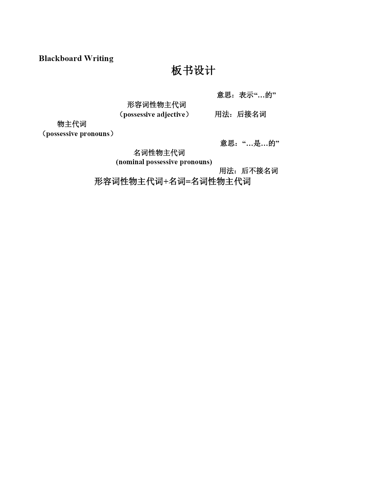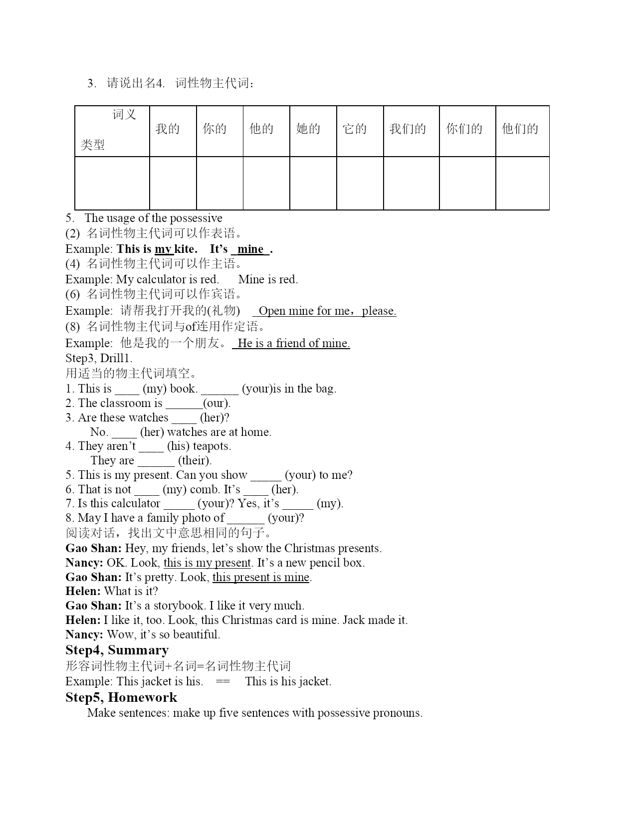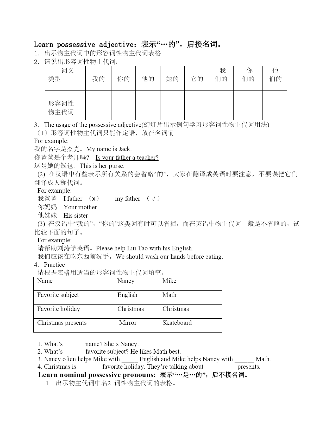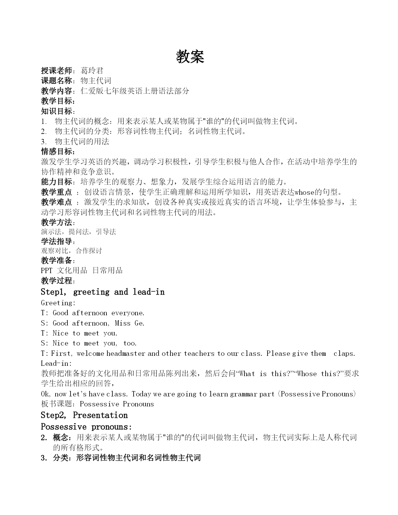 教案 授课老师:葛玲君 课题名称:物主代词 教学内容:仁爱版七年级英语上册语法部分 教学目标: 知识目标: 物主代词的概念:用来表示某人或某物属于"谁的"的代词叫做物主代词。 物主代词的分类:形容词性物主代词;名词性物主代词。 物主代词的用法 情感目标: 激发学生学习英语的兴趣,调动学习积极性,引导学生积极与他人合作,在活动中培养学生的协作精神和竞争意识。 能力目标:培养学生的观察力、想象力,发展学生综合运用语言的能力。 教学重点:创设语言情景,使学生正确理解和运用所学知识,用英语表达whose的句型。 教学难点:激发学生的求知欲,创设各种真实或接近真实的语言环境,让学生体验参与,主动学习形容词性物主代词和名词性物主代词的用法。 教学方法: 演示法,提问法,引导法 学法指导: 观察对比,合作探讨 教学准备: PPT文化用品日常用品 教学过程: Step1,greetingandlead-in Greeting: T:Goodafternooneveryone. S:Goodafternoon,MissGe. T:Nicetomeetyou. S:Nicetomeetyou,too. T:First,welcomeheadmasterandotherteacherstoourclass.Pleasegivethemclaps. Lead-in: 教师把准备好的文化用品和日常用品陈列出来,然后会问“Whatisthis?”“Whosethis?”要求学生给出相应的回答, Ok,nowlet’shaveclass.Todaywearegoingtolearngrammarpart(PossessivePronouns) 板书课题:PossessivePronouns Step2,Presentation Possessivepronouns: 概念:用来表示某人或某物属于"谁的"的代词叫做物主代词,物主代词实际上是人称代词的所有格形式。 分类:形容词性物主代词和名词性物主代词 Learnpossessiveadjective:表示“…的”,后接名词。 出示物主代词中的形容词性物主代词表格 请说出形容词性物主代词: 词义 类型 我的 你的 他的 她的 它的我 们的你 们的他们的 形容词性 物主代词Theusageofthepossessiveadjective(幻灯片出示例句学习形容词性物主代词用法) (1)形容词性物主代词只能作定语,放在名词前 Forexample: 我的名字是杰克。MynameisJack. 你爸爸是个老师吗?Isyourfatherateacher? 这是她的钱包。Thisisherpurse. (2)在汉语中有些表示所有关系的会省略“的”,大家在翻译成英语时要注意,不要误把它们翻译成人称代词。 Forexample: 我爸爸Ifather(х)myfather(√) 你妈妈Yourmother 他妹妹Hissister (3)在汉语中“我的”,“你的”这类词有时可以省掉,而在英语中物主代词一般是不省略的,试比较下面的句子。 Forexample: 请帮助刘涛学英语。PleasehelpLiuTaowithhisEnglish. 我们应该在吃东西前洗手。Weshouldwashourhandsbeforeeating. Practice 请根据表格用适当的形容词性物主代词填空。 NameNancyMikeFavoritesubjectEnglishMathFavoriteholidayChristmasChristmasChristmaspresentsMirrorSkateboard 1.What’s______name?She’sNancy. 2.What’s______favoritesubject?HelikesMathbest. 3.NancyoftenhelpsMikewith_____EnglishandMikehelpsNancywith______Math. 4.Christmasis_______favoriteholiday.They’retalkingabout________presents. Learnnominalpossessivepronouns:表示“…是…的”,后不接名词。 1. 出示物主代词中名2. 词性物主代词的表格。 3. 请说出名4. 词性物主代词: 词义 类型 我的 你的 他的 她的 它的 我们的 你们的 他们的Theusageofthepossessive 名词性物主代词可以作表语。 Example:Thisismykite.It’s_mine_. 名词性物主代词可以作主语。 Example:Mycalculatorisred.Mineisre