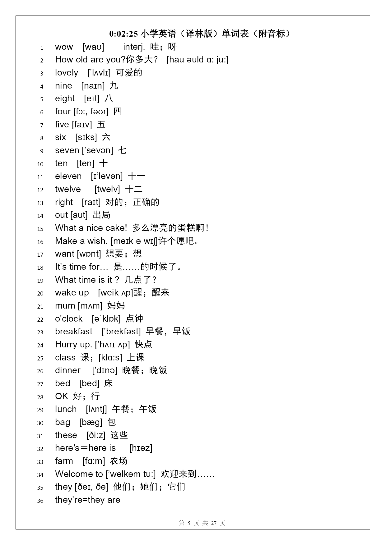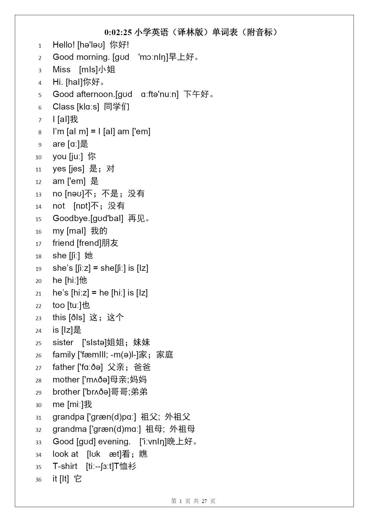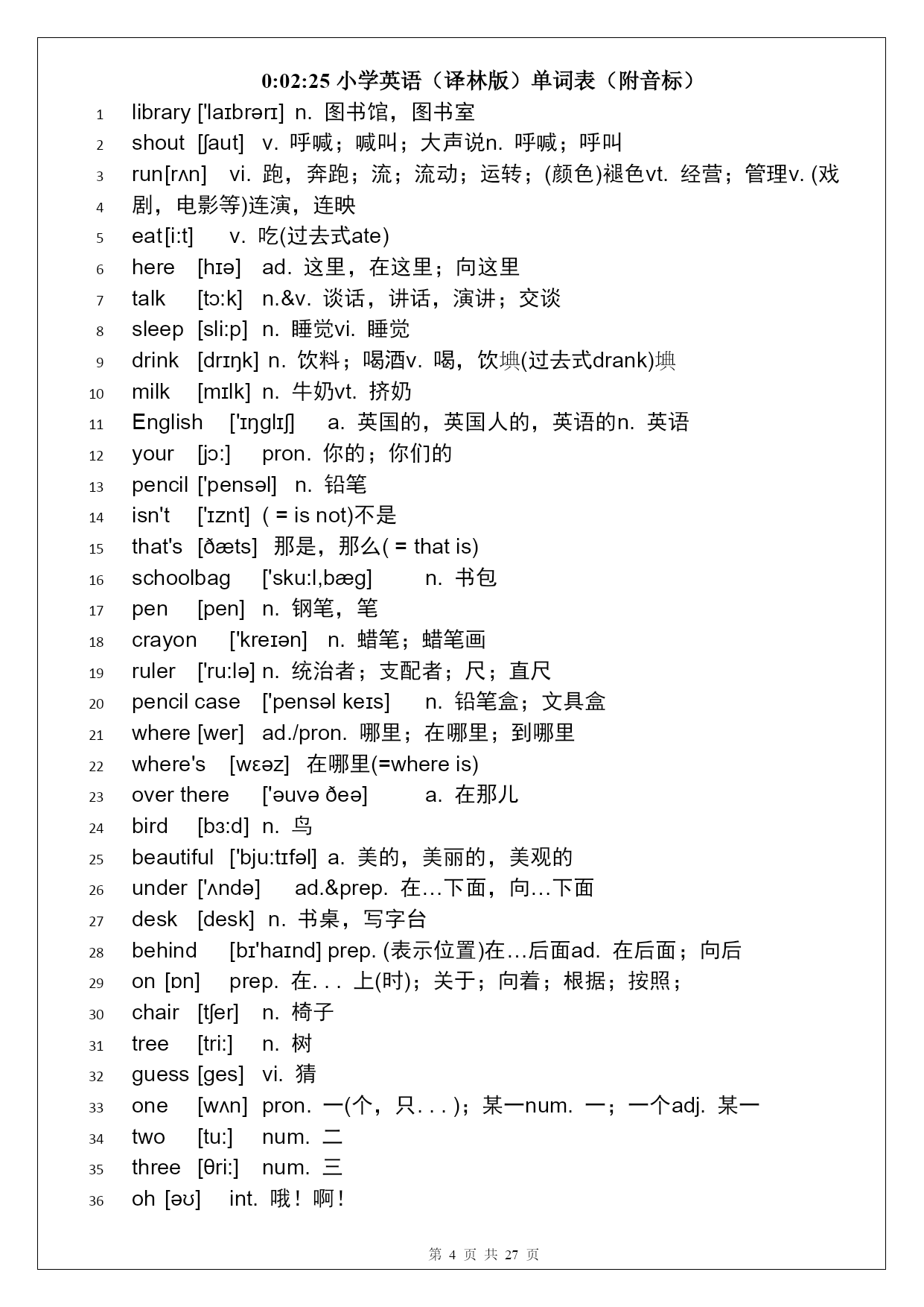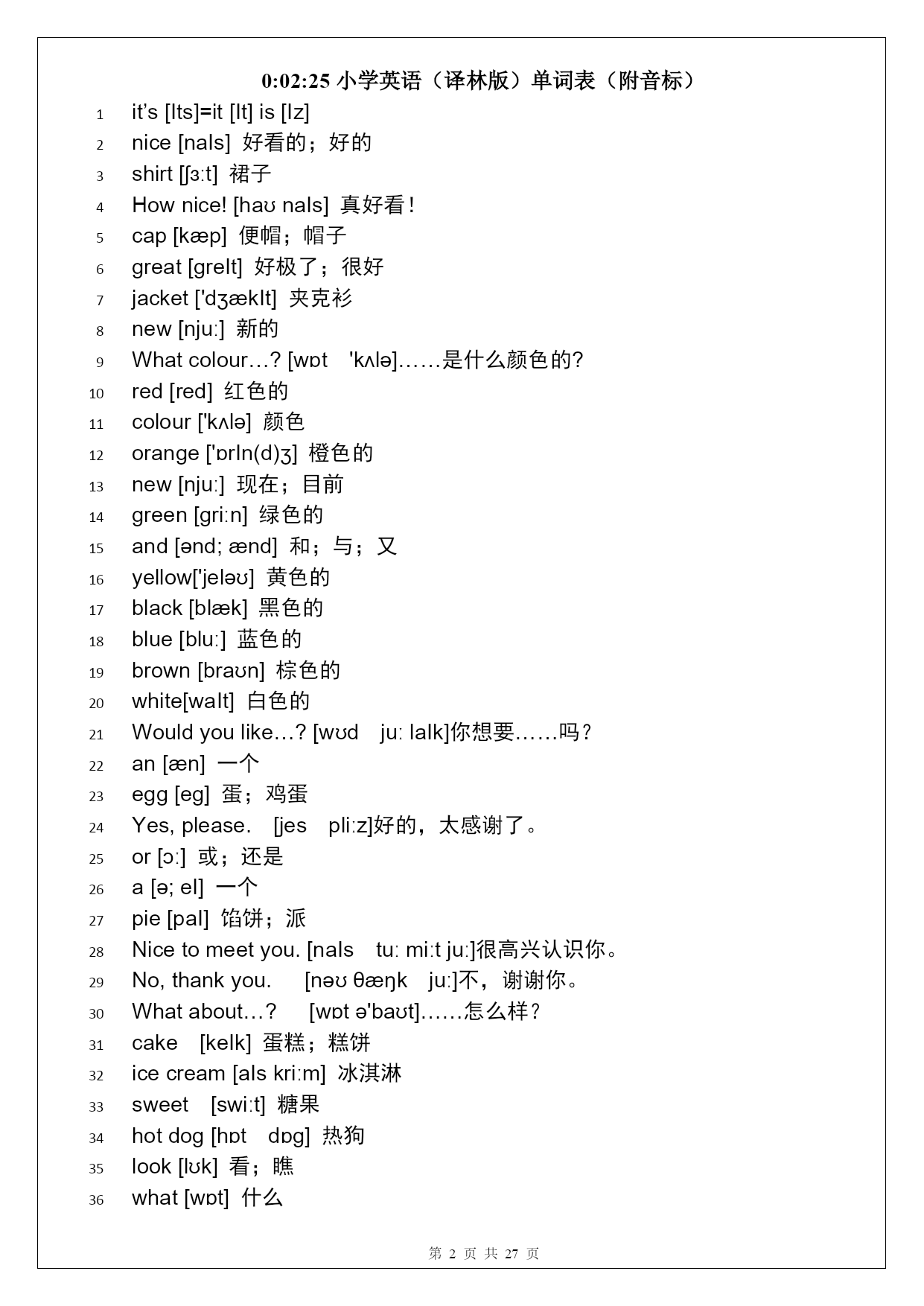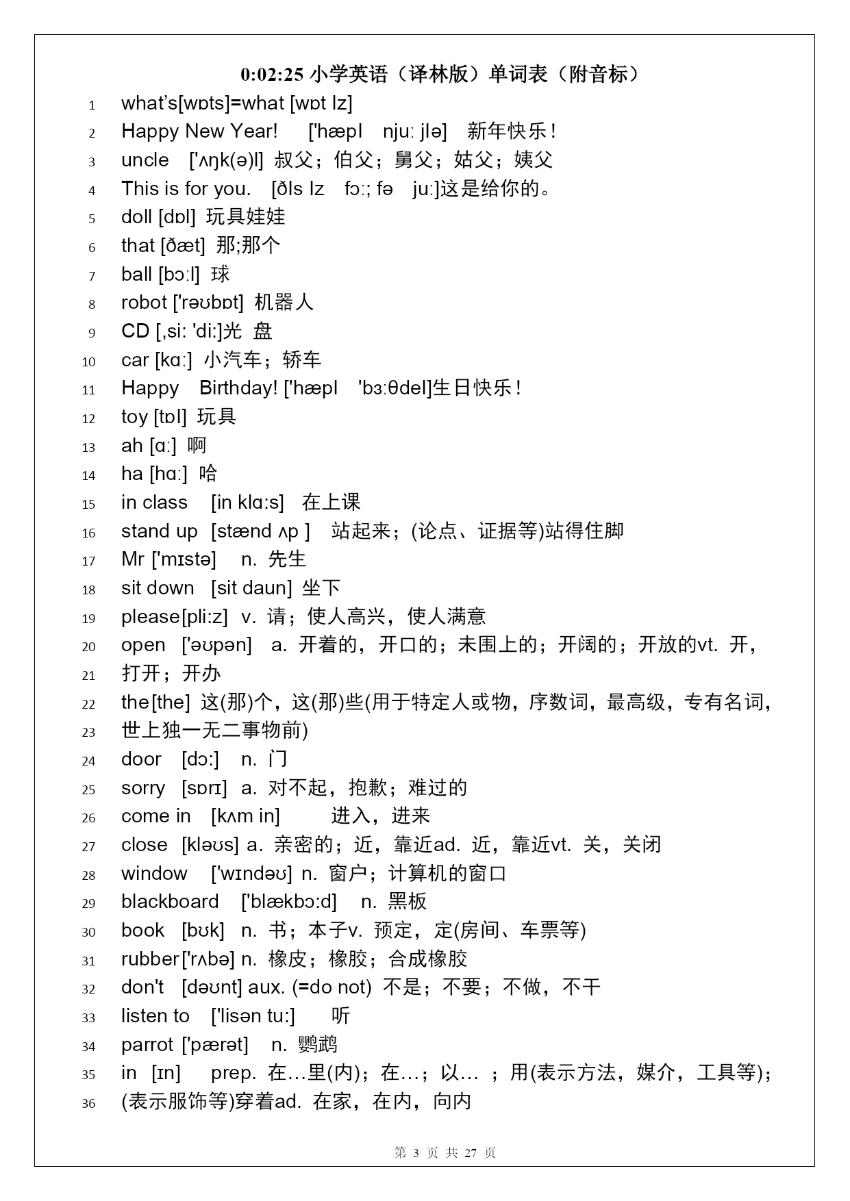 TIME\@"H:mm:ss"0:02:25小学英语(译林版)单词表(附音标) 第页共NUMPAGES27页 Hello![hə'ləʊ]你好! Goodmorning.[gʊd'mɔːnIŋ]早上好。 Miss[mIs]小姐 Hi.[haI]你好。 Goodafternoon.[gʊdɑːftə'nuːn]下午好。 Class[klɑːs]同学们 I[aI]我 I’m[aIm]=I[aI]am['em] are[ɑː]是 you[juː]你 yes[jes]是;对 am['em]是 no[nəʊ]不;不是;没有 not[nɒt]不;没有 Goodbye.[gʊd'baI]再见。 my[maI]我的 friend[frend]朋友 she[ʃiː]她 she’s[ʃiːz]=she[ʃiː]is[Iz] he[hiː]他 he’s[hiːz]=he[hiː]is[Iz] too[tuː]也 this[ðIs]这;这个 is[Iz]是 sister['sIstə]姐姐;妹妹 family['fæmIlI;-m(ə)l-]家;家庭 father['fɑːðə]父亲;爸爸 mother['mʌðə]母亲;妈妈 brother['brʌðə]哥哥;弟弟 me[miː]我 grandpa['græn(d)pɑː]祖父;外祖父 grandma['græn(d)mɑː]祖母;外祖母 Good[gʊd]evening.['iːvnIŋ]晚上好。 lookat[lʊkæt]看;瞧 T-shirt[tiː--ʃɜːt]T恤衫 it[It]它 it’s[Its]=it[It]is[Iz] nice[naIs]好看的;好的 shirt[ʃɜːt]裙子 Hownice![haʊnaIs]真好看! cap[kæp]便帽;帽子 great[greIt]好极了;很好 jacket['dʒækIt]夹克衫 new[njuː]新的 Whatcolour…?[wɒt'kʌlə]……是什么颜色的? red[red]红色的 colour['kʌlə]颜色 orange['ɒrIn(d)ʒ]橙色的 new[njuː]现在;目前 green[griːn]绿色的 and[ənd;ænd]和;与;又 yellow['jeləʊ]黄色的 black[blæk]黑色的 blue[bluː]蓝色的 brown[braʊn]棕色的 white[waIt]白色的 Wouldyoulike…?[wʊdjuːlaIk]你想要……吗? an[æn]一个 egg[eg]蛋;鸡蛋 Yes,please.[jespliːz]好的,太感谢了。 or[ɔː]或;还是 a[ə;eI]一个 pie[paI]馅饼;派 Nicetomeetyou.[naIstuːmiːtjuː]很高兴认识你。 No,thankyou.[nəʊθæŋkjuː]不,谢谢你。 Whatabout…?[wɒtə'baʊt]……怎么样? cake[keIk]蛋糕;糕饼 icecream[aIskriːm]冰淇淋 sweet[swiːt]糖果 hotdog[hɒtdɒg]热狗 look[lʊk]看;瞧 what[wɒt]什么 what’s[wɒts]=what[wɒtIz] HappyNewYear!['hæpInjuːjIə]新年快乐! uncle['ʌŋk(ə)l]叔父;伯父;舅父;姑父;姨父 Thisisforyou.[ðIsIzfɔː;fəjuː]这是给你的。 doll[dɒl]玩具娃娃 that[ðæt]那;那个 ball[bɔːl]球 robot['rəʊbɒt]机器人 CD[,si:'di:]光盘 car[kɑː]小汽车;轿车 HappyBirthday!['hæpI'bɜːθdeI]生日快乐! toy[tɒI]玩具 ah[ɑː]啊 ha[hɑː]哈 inclass [inklɑ:s] 在上课 standup [stændʌp] 站起来;(论点、证据等)站得住脚 Mr ['mɪstə] n.先生 sitdown [sitdaun] 坐下 please [pli:z] v.请;使人高兴,使人满意 open ['əʊpən] a.开着的,开口的;未围上的;开阔的;开放的vt.开,打开;开办 the [the]这(那)个,这(那)些(用于特定人或物,序数词,最高级,专有名词,世上独一无二事物前) door [dɔ:] n.门 sorry [sɒrɪ] a.对不起,抱歉;难过的 comein [kʌmin] 进入,进来 close [kləʊs] a.亲密的;近,靠近ad.近,靠近vt.关,关闭 window ['wɪndəʊ] n.窗户;计算机的窗口 blackboard ['blækbɔ:d] n.黑板 book