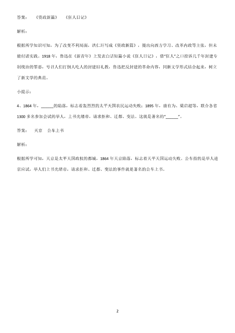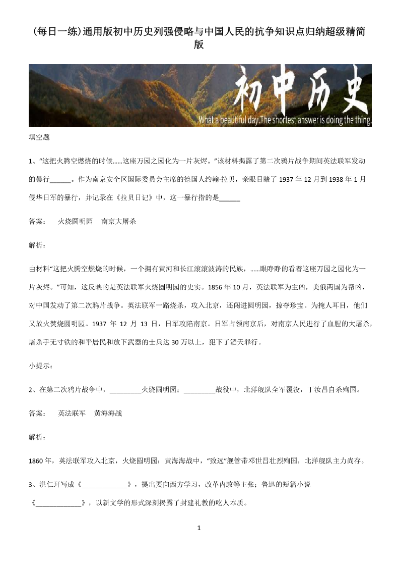 (每日一练)通用版初中历史列强侵略与中国人民的抗争知识点归纳超级精简 版 填空题 1、“这把火腾空燃烧的时候……这座万园之园化为一片灰烬。”该材料揭露了第二次鸦片战争期间英法联军发动 的暴行______。作为南京安全区国际委员会主席的德国人约翰·拉贝,亲眼目睹了1937年12月到1938年1月 侵华日军的暴行,并记录在《拉贝日记》中,这一暴行指的是______ 答案:火烧圆明园南京大屠杀 解析: 由材料“这把火腾空燃烧的时候,一个拥有黄河和长江滚滚波涛的民族,……眼睁睁的看着这座万园之园化为一 片灰烬。”可知,这反映的是英法联军火烧圆明园的史实。1856年10月,英法联军为主凶,美俄两国为帮凶, 对中国发动了第二次鸦片战争。英法联军一路烧杀,攻入北京,还闯进圆明园,掠夺珍宝。为掩人耳目,他们 又放火焚烧圆明园。1937年12月13日,日军攻陷南京。日军占领南京后,对南京人民进行了血腥的大屠杀, 屠杀手无寸铁的和平居民和放下武器的士兵达30万以上,犯下了滔天罪行。 小提示: 2、在第二次鸦片战争中,_________火烧圆明园;_________战役中,北洋舰队全军覆没,丁汝昌自杀殉国。 答案:英法联军黄海海战 解析: 1860年,英法联军攻入北京,火烧圆明园;黄海海战中,“致远”舰管带邓世昌壮烈殉国,北洋舰队主力尚存。 3、洪仁玕写成《_____________》,提出要向西方学习,改革内政等主张;鲁迅的短篇小说 《_____________》,以新文学的形式深刻揭露了封建礼教的吃人本质。 1 答案:《资政新篇》《狂人日记》 解析: 根据所学知识可知,为了改变不利局面,洪仁玕写成《资政新篇》,提出向西方学习、改革内政等主张,但未 能付诸实践。1918年,鲁迅在《新青年》上发表白话短篇小说《狂人日记》,借“狂人”之口控诉几千年封建专 制统治的罪恶,号召人们打倒人吃人的封建旧礼教,鲁迅把反封建的革命内容,同新文学形式结合起来,树立 了新文学的典范。 小提示: 4、1864年,______的陷落,标志着轰烈烈的太平天国农民运动失败;1895年,康有为、梁启超等,联合各省 1300多名参加会试的举人,上书光绪帝,请求拒和、迁都、变法。这就是著名的“______”。 答案:天京公车上书 解析: 根据所学可知,天京是太平天国政权的都城,1864年天京陷落,标志着天平天国运动失败。公车指的是举人进 京应试,举人们上书光绪帝,请求拒和、迁都、变法的事件就是著名的公车上书。 2