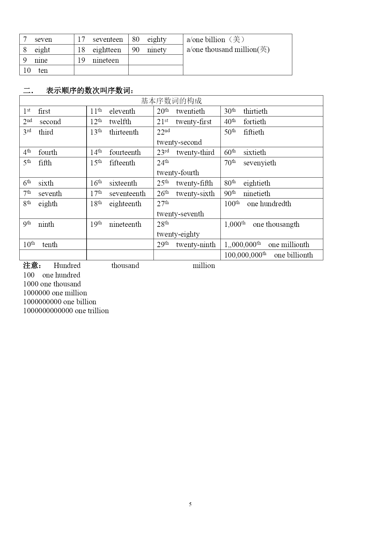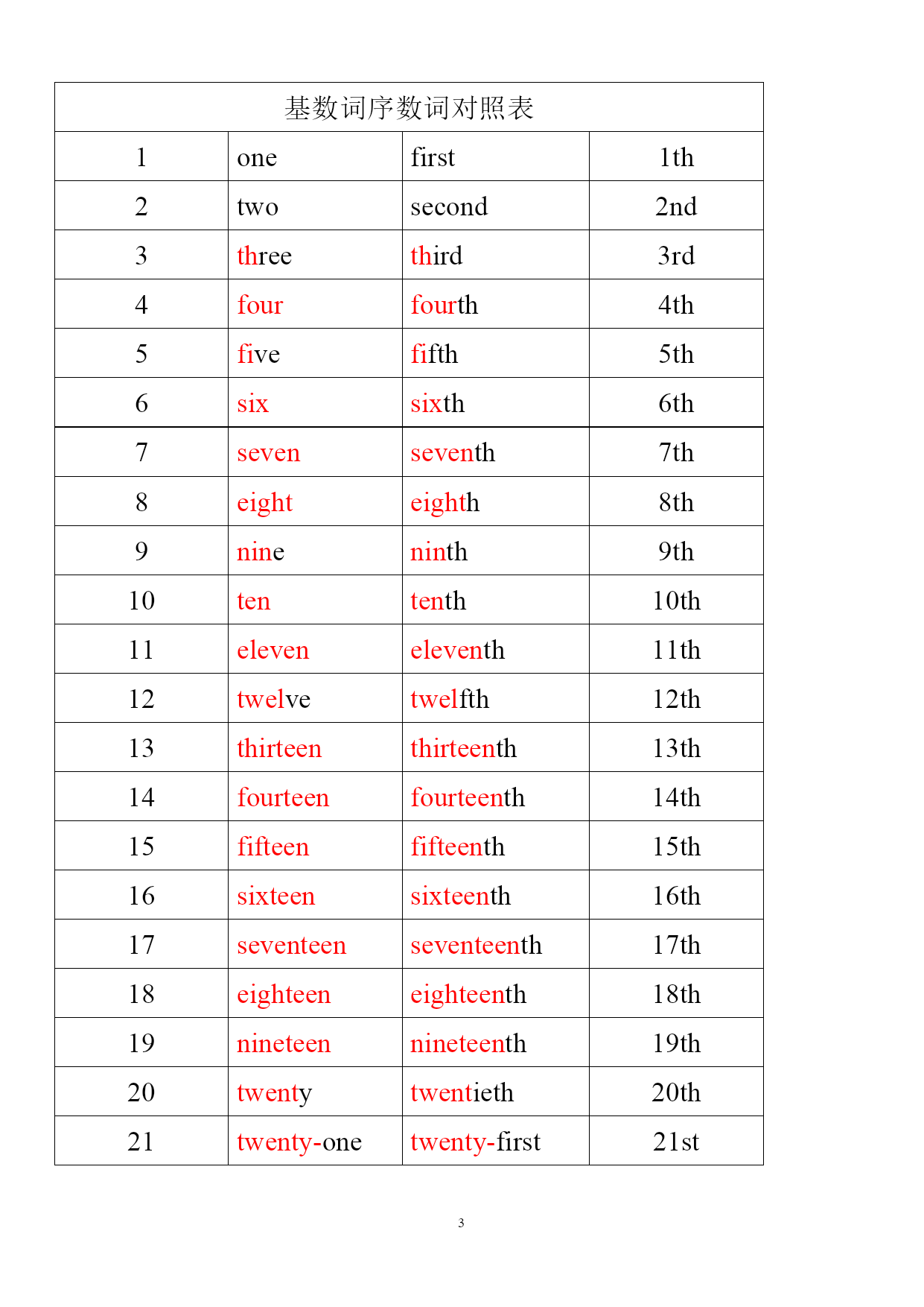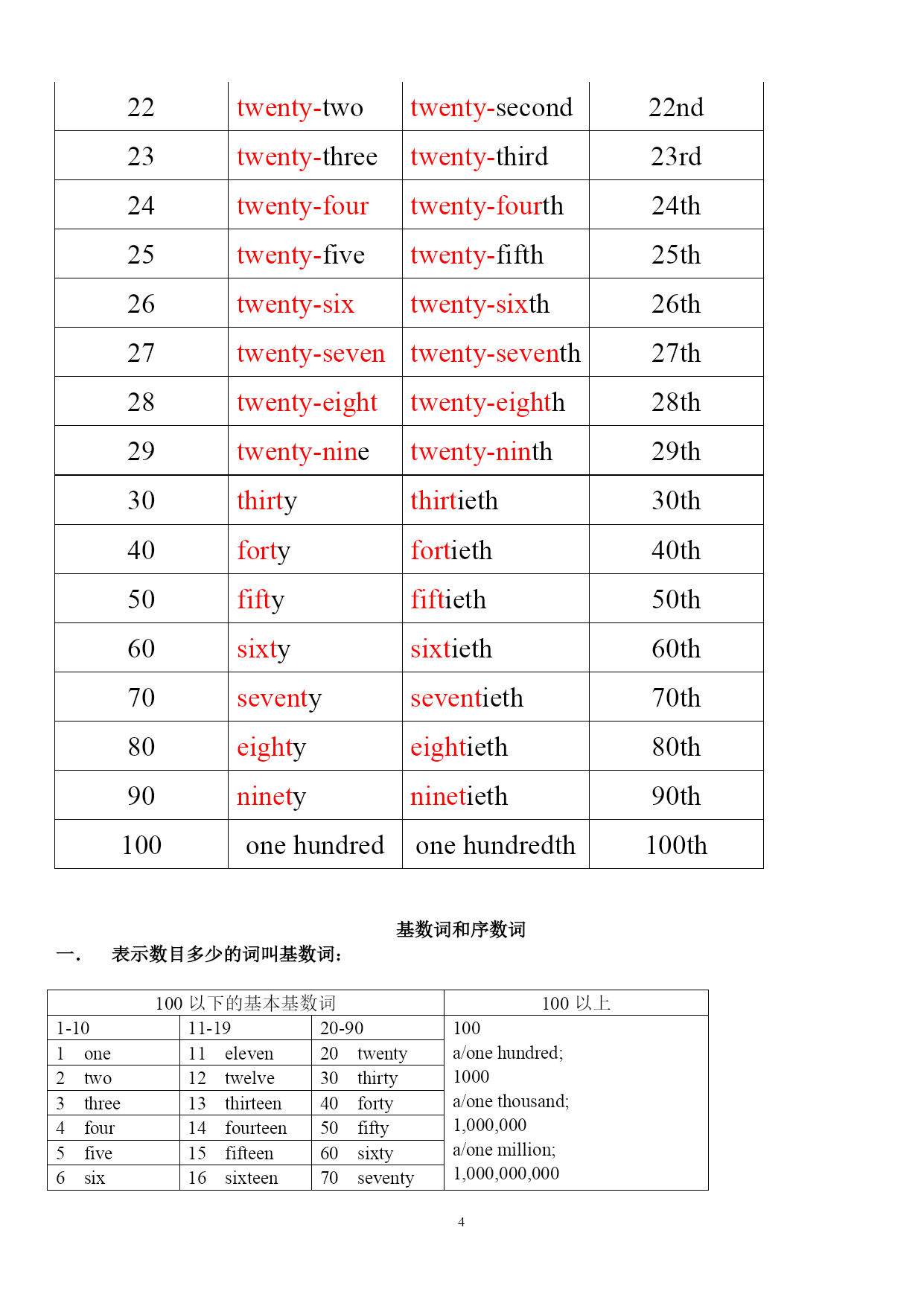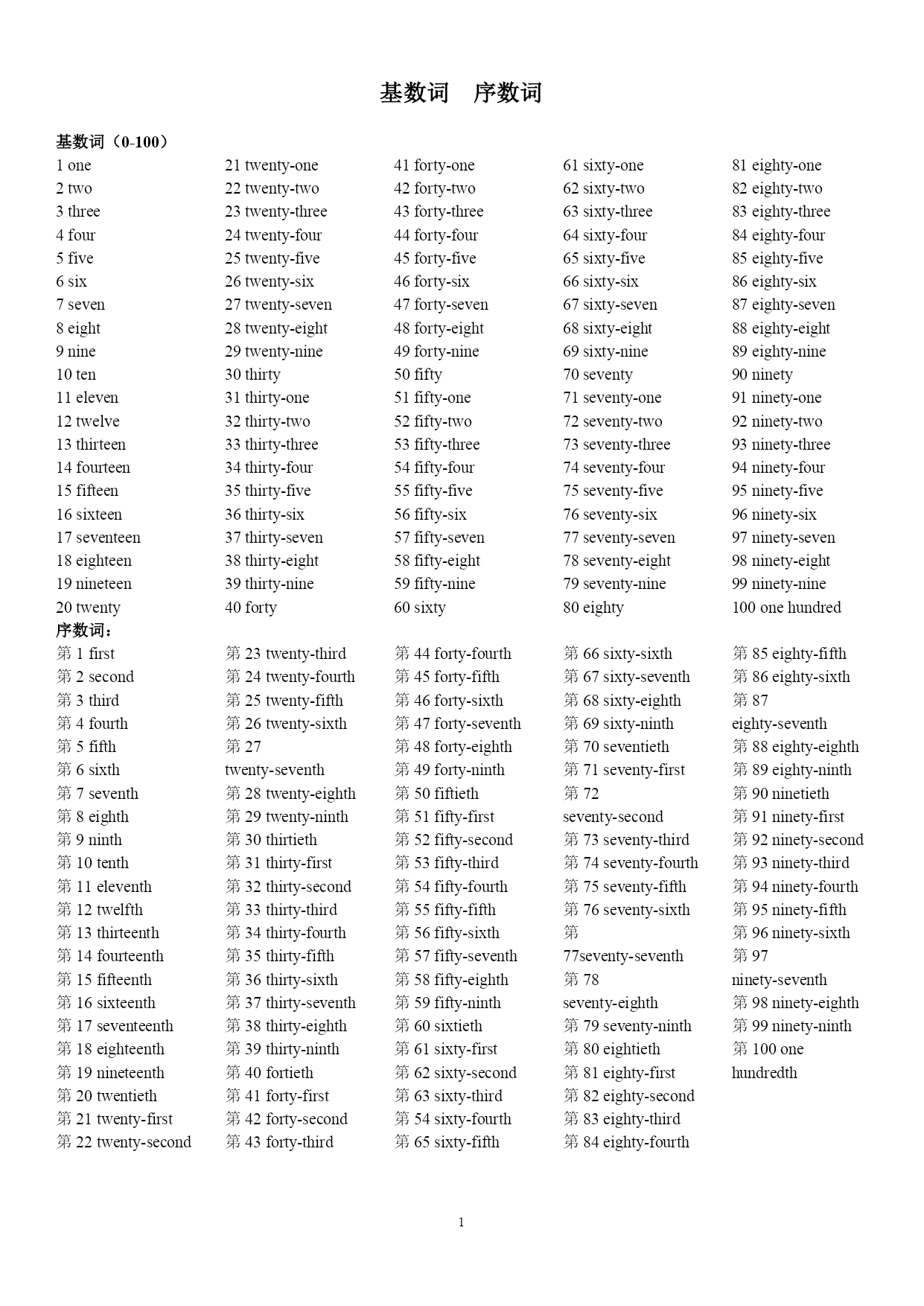 基数词序数词基数词(0-100) 1one 2two 3three 4four 5five 6six 7seven 8eight 9nine 10ten 11eleven 12twelve 13thirteen 14fourteen 15fifteen 16sixteen 17seventeen 18eighteen 19nineteen 20twenty 21twenty-one 22twenty-two 23twenty-three 24twenty-four 25twenty-five 26twenty-six 27twenty-seven 28twenty-eight 29twenty-nine 30thirty 31thirty-one 32thirty-two 33thirty-three 34thirty-four 35thirty-five 36thirty-six 37thirty-seven 38thirty-eight 39thirty-nine 40forty 41forty-one 42forty-two 43forty-three 44forty-four 45forty-five 46forty-six 47forty-seven 48forty-eight 49forty-nine 50fifty 51fifty-one 52fifty-two 53fifty-three 54fifty-four 55fifty-five 56fifty-six 57fifty-seven 58fifty-eight 59fifty-nine 60sixty 61sixty-one 62sixty-two 63sixty-three 64sixty-four 65sixty-five 66sixty-six 67sixty-seven 68sixty-eight 69sixty-nine 70seventy 71seventy-one 72seventy-two 73seventy-three 74seventy-four 75seventy-five 76seventy-six 77seventy-seven 78seventy-eight 79seventy-nine 80eighty 81eighty-one 82eighty-two 83eighty-three 84eighty-four 85eighty-five 86eighty-six 87eighty-seven 88eighty-eight 89eighty-nine 90ninety 91ninety-one 92ninety-two 93ninety-three 94ninety-four 95ninety-five 96ninety-six 97ninety-seven 98ninety-eight 99ninety-nine 100onehundred序数词:第1first 第2second 第3third 第4fourth 第5fifth 第6sixth 第7seventh 第8eighth 第9ninth 第10tenth 第11eleventh 第12twelfth 第13thirteenth 第14fourteenth 第15fifteenth 第16sixteenth 第17seventeenth 第18eighteenth 第19nineteenth 第20twentieth 第21twenty-first 第22twenty-second 第23twenty-third 第24twenty-fourth 第25twenty-fifth 第26twenty-sixth 第27twenty-seventh 第28twenty-eighth 第29twenty-ninth 第30thirtieth 第31thirty-first 第32thirty-second 第33thirty-third 第34thirty-fourth 第35thirty-fifth 第36thirty-sixth 第37thirty-seventh 第38thirty-eighth 第39thirty-ninth 第40fortieth 第41forty-first 第42forty-second 第43forty-third 第44forty-fourth 第45forty-fifth 第46forty-sixth 第47forty-seventh 第48forty-eighth 第49forty-ninth 第50fiftieth 第51fifty-first 第52fifty-second 第53fifty-third 第54f