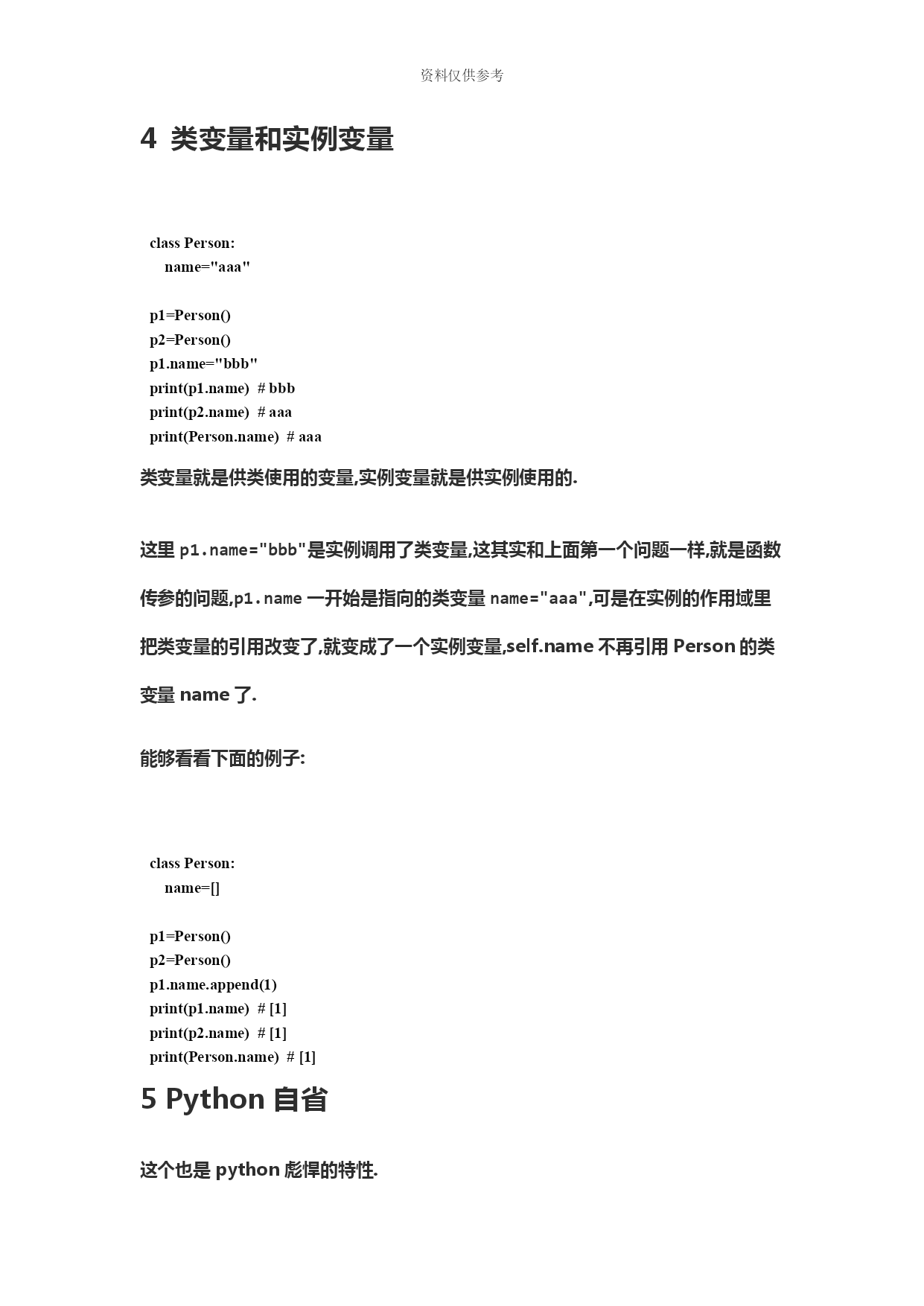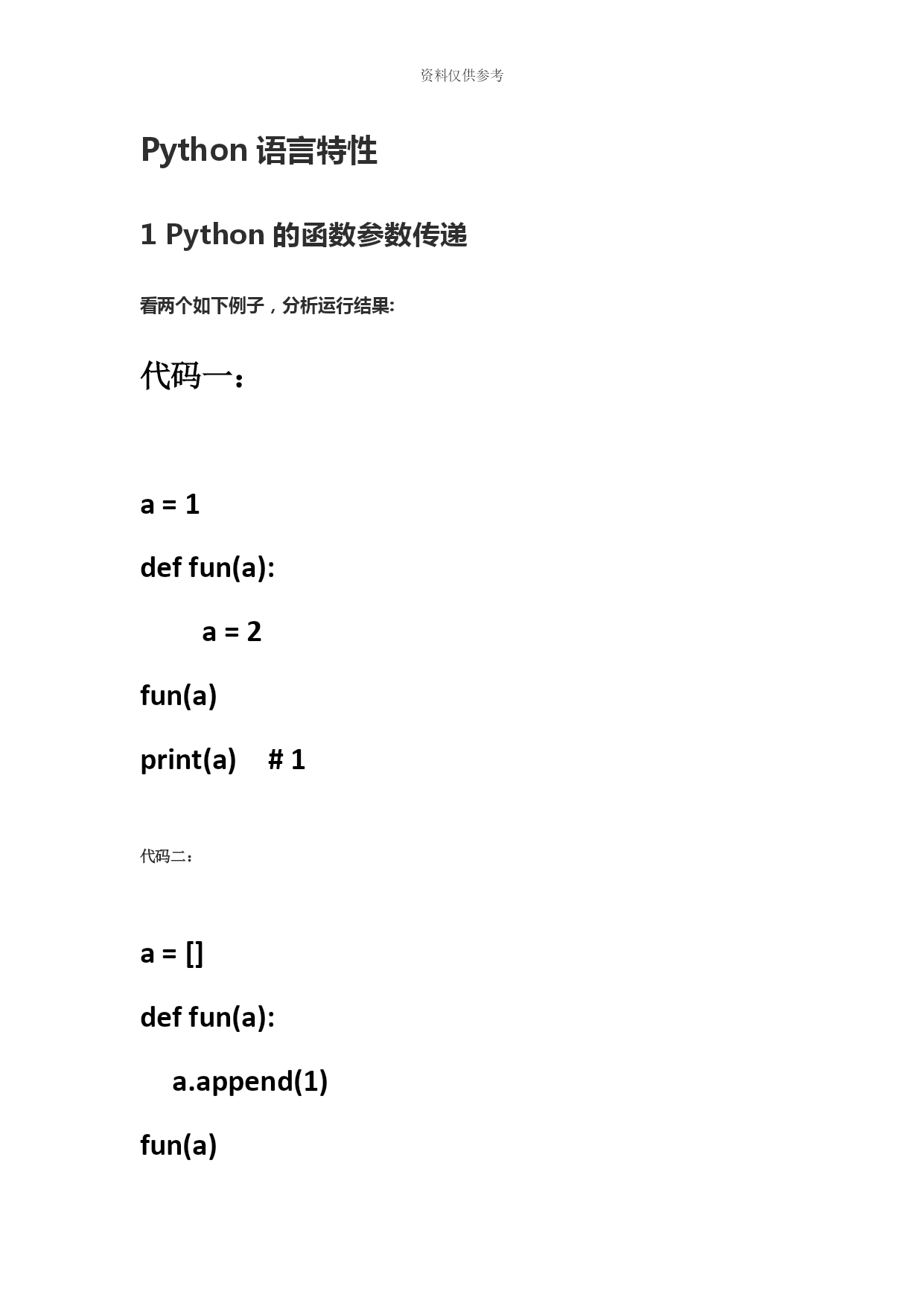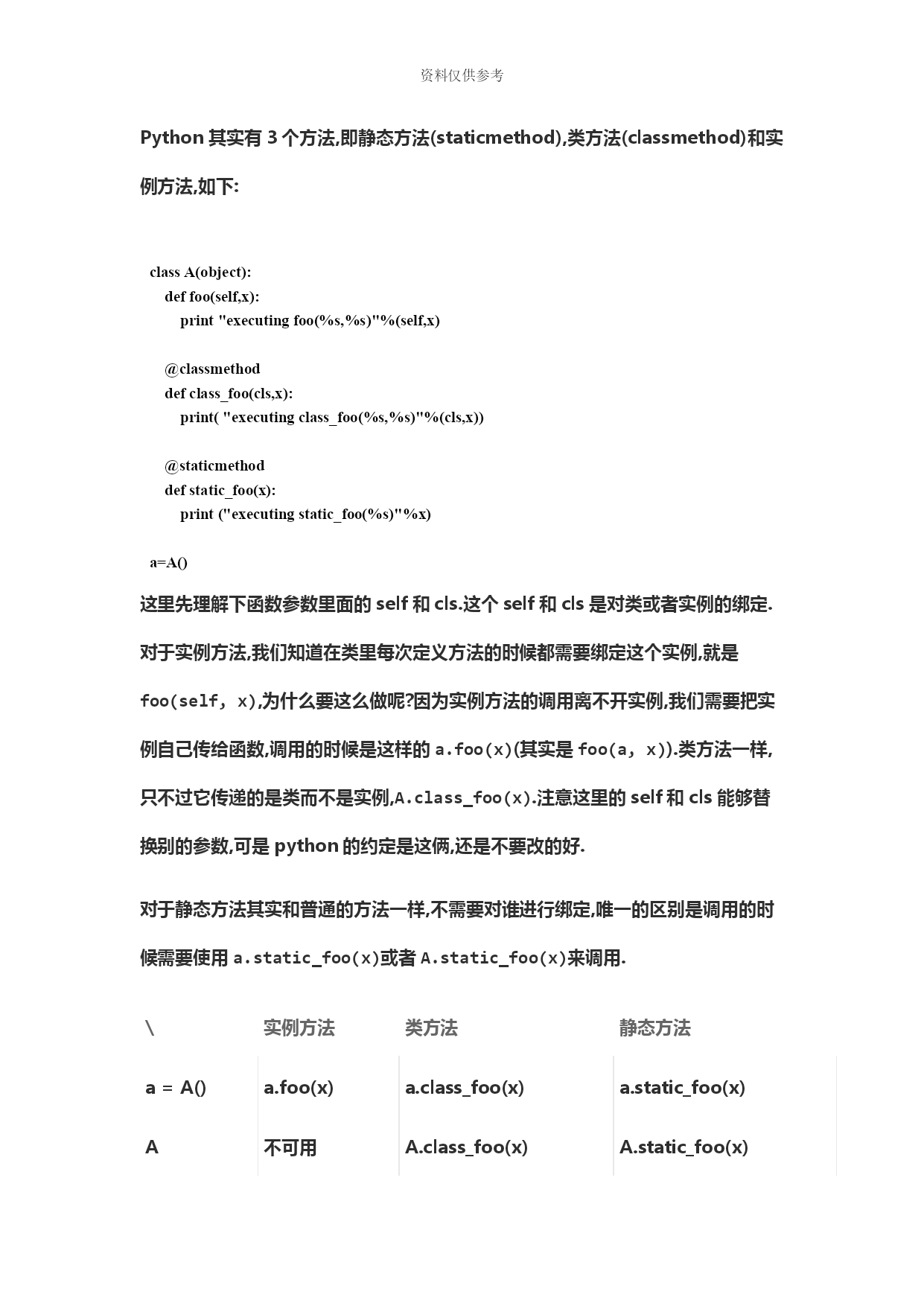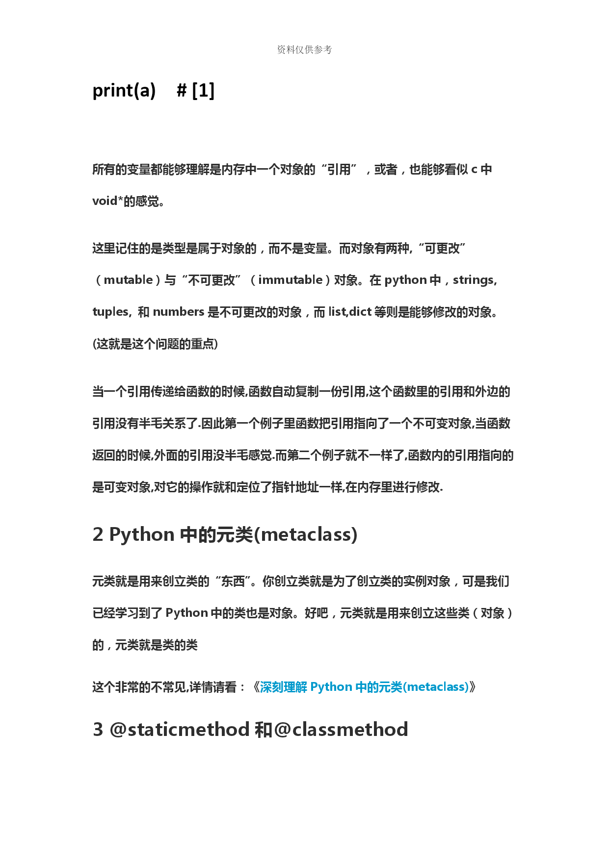 python面试题100 资料仅供参考 Python语言特性 1Python的函数参数传递 看两个如下例子,分析运行结果: 代码一: a=1 deffun(a): a=2 fun(a) print(a)#1 代码二: a=[] deffun(a): a.append(1) fun(a) print(a)#[1] 所有的变量都能够理解是内存中一个对象的“引用”,或者,也能够看似c中void*的感觉。 这里记住的是类型是属于对象的,而不是变量。而对象有两种,“可更改”(mutable)与“不可更改”(immutable)对象。在python中,strings,tuples,和numbers是不可更改的对象,而list,dict等则是能够修改的对象。(这就是这个问题的重点) 当一个引用传递给函数的时候,函数自动复制一份引用,这个函数里的引用和外边的引用没有半毛关系了.因此第一个例子里函数把引用指向了一个不可变对象,当函数返回的时候,外面的引用没半毛感觉.而第二个例子就不一样了,函数内的引用指向的是可变对象,对它的操作就和定位了指针地址一样,在内存里进行修改. 2Python中的元类(metaclass) 元类就是用来创立类的“东西”。你创立类就是为了创立类的实例对象,可是我们已经学习到了Python中的类也是对象。好吧,元类就是用来创立这些类(对象)的,元类就是类的类 这个非常的不常见,详情请看:《HYPERLINK""\t"_blank"深刻理解Python中的元类(metaclass)》 3@staticmethod和@classmethod Python其实有3个方法,即静态方法(staticmethod),类方法(classmethod)和实例方法,如下: classA(object): deffoo(self,x): print"executingfoo(%s,%s)"%(self,x) @classmethod defclass_foo(cls,x): print("executingclass_foo(%s,%s)"%(cls,x)) @staticmethod defstatic_foo(x): print("executingstatic_foo(%s)"%x) a=A()这里先理解下函数参数里面的self和cls.这个self和cls是对类或者实例的绑定.对于实例方法,我们知道在类里每次定义方法的时候都需要绑定这个实例,就是foo(self,x),为什么要这么做呢?因为实例方法的调用离不开实例,我们需要把实例自己传给函数,调用的时候是这样的a.foo(x)(其实是foo(a,x)).类方法一样,只不过它传递的是类而不是实例,A.class_foo(x).注意这里的self和cls能够替换别的参数,可是python的约定是这俩,还是不要改的好. 对于静态方法其实和普通的方法一样,不需要对谁进行绑定,唯一的区别是调用的时候需要使用a.static_foo(x)或者A.static_foo(x)来调用. \实例方法类方法静态方法a=A()a.foo(x)a.class_foo(x)a.static_foo(x)A不可用A.class_foo(x)A.static_foo(x)4类变量和实例变量 classPerson: name="aaa" p1=Person() p2=Person() p1.name="bbb" print(p1.name)#bbb print(p2.name)#aaa print(Person.name)#aaa类变量就是供类使用的变量,实例变量就是供实例使用的. 这里p1.name="bbb"是实例调用了类变量,这其实和上面第一个问题一样,就是函数传参的问题,p1.name一开始是指向的类变量name="aaa",可是在实例的作用域里把类变量的引用改变了,就变成了一个实例变量,self.name不再引用Person的类变量name了. 能够看看下面的例子: classPerson: name=[] p1=Person() p2=Person() p1.name.append(1) print(p1.name)#[1] print(p2.name)#[1] print(Person.name)#[1]5Python自省 这个也是python彪悍的特性. 自省就是面向对象的语言所写的程序在运行时,所能知道对象的类型.简单一句就是运行时能够获得对象的类型.比如type(),dir(),getattr(),hasattr(),isinstance(). 6字典推导式 可能你见过列表推导时,却没有见过字典推导式,在2.7中才加入的: d={key:valuefor(key,v