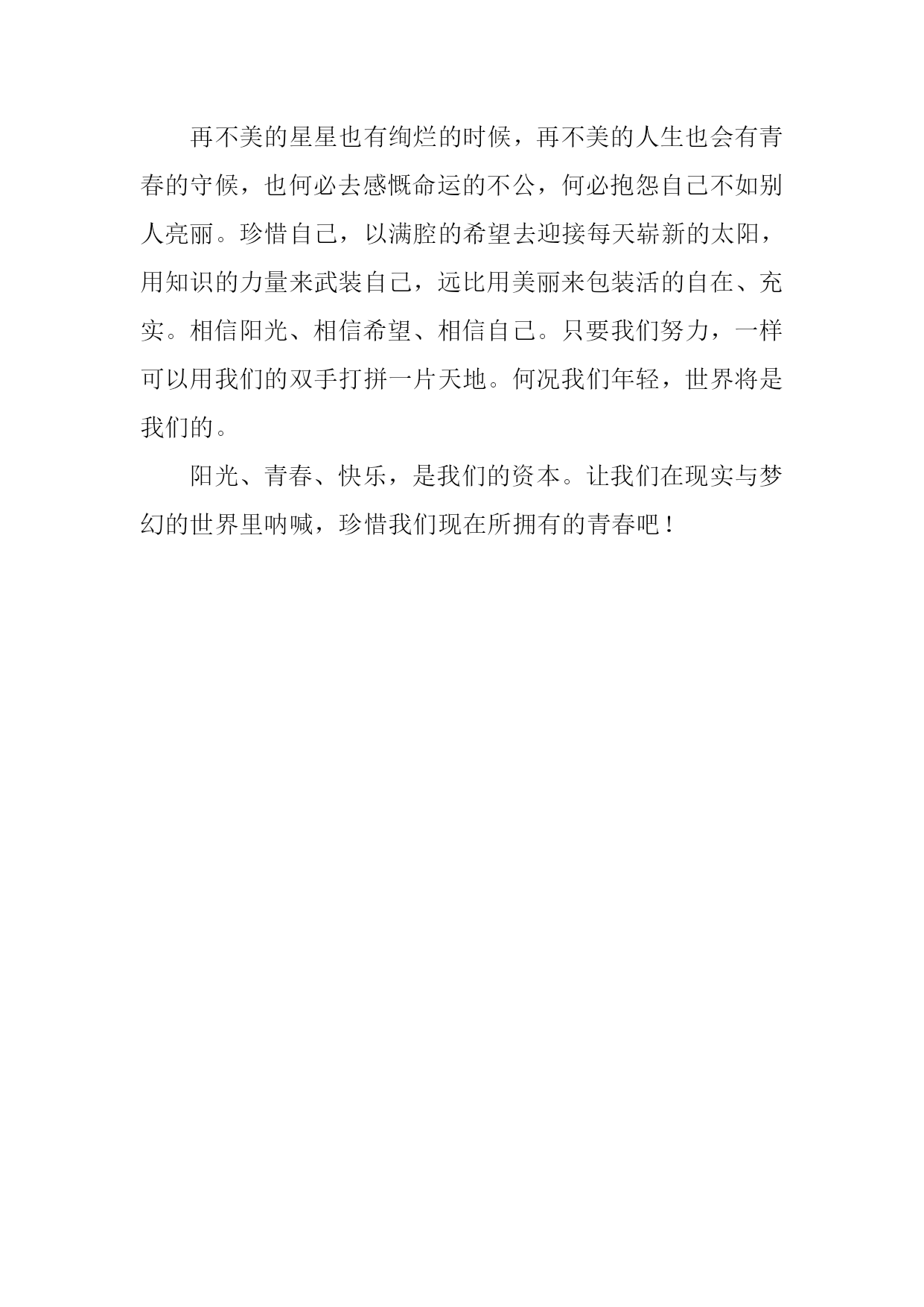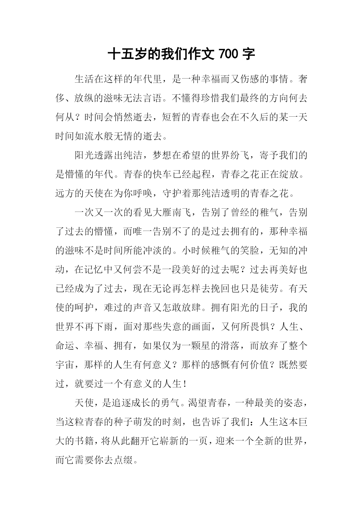 十五岁的我们作文700字 生活在这样的年代里,是一种幸福而又伤感的事情。奢侈、放纵的滋味无法言语。不懂得珍惜我们最终的方向何去何从?时间会悄然逝去,短暂的青春也会在不久后的某一天时间如流水般无情的逝去。阳光透露出纯洁,梦想在希望的世界纷飞,寄予我们的是懵懂的年代。青春的快车已经起程,青春之花正在绽放。远方的天使在为你呼唤,守护着那纯洁透明的青春之花。一次又一次的看见大雁南飞,告别了曾经的稚气,告别了过去的懵懂,而唯一告别不了的是过去拥有的,那种幸福的滋味不是时间所能冲淡的。小时候稚气的笑脸,无知的冲动,在记忆中又何尝不是一段美好的过去呢?过去再美好也已经成为了过去,现在无论再怎样去挽回也只是徒劳。有天使的呵护,难过的声音又怎敢放肆。拥有阳光的日子,我的世界不再下雨,面对那些失意的画面,又何所畏惧?人生、命运、幸福、拥有,如果仅为一颗星的滑落,而放弃了整个宇宙,那样的人生有何意义?那样的感慨有何价值?既然要过,就要过一个有意义的人生!天使,是追逐成长的勇气。渴望青春,一种最美的姿态,当这粒青春的种子萌发的时刻,也告诉了我们:人生这本巨大的书籍,将从此翻开它崭新的一页,迎来一个全新的世界,而它需要你去点缀。再不美的星星也有绚烂的时候,再不美的人生也会有青春的守候,也何必去感慨命运的不公,何必抱怨自己不如别人亮丽。珍惜自己,以满腔的希望去迎接每天崭新的太阳,用知识的力量来武装自己,远比用美丽来包装活的自在、充实。相信阳光、相信希望、相信自己。只要我们努力,一样可以用我们的双手打拼一片天地。何况我们年轻,世界将是我们的。阳光、青春、快乐,是我们的资本。让我们在现实与梦幻的世界里呐喊,珍惜我们现在所拥有的青春吧!