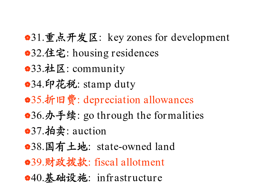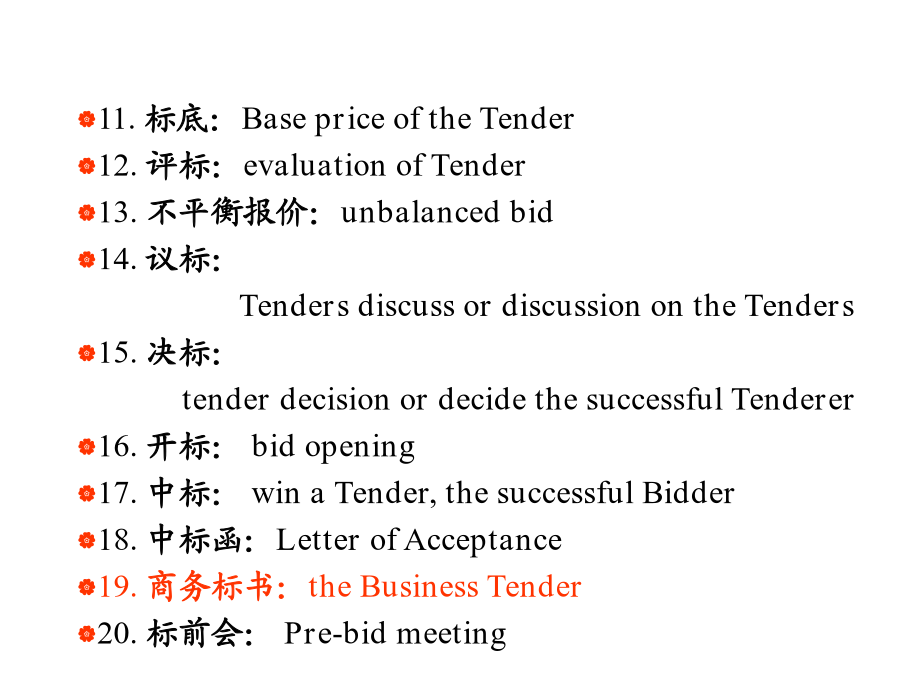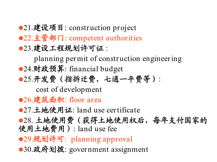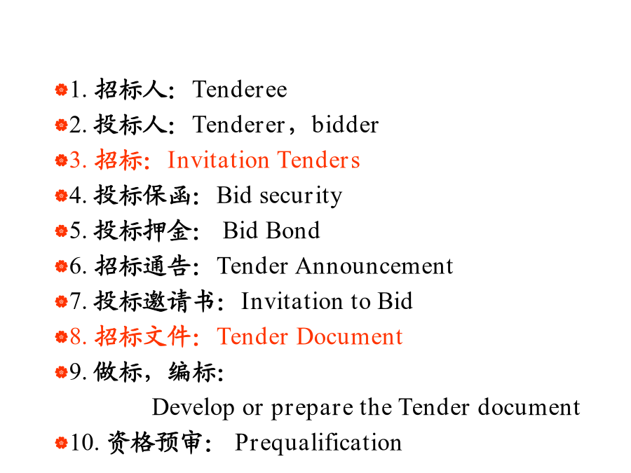 国际工程管理专业英语词汇ENGLISHREADINGSININTERNATIONALPROJECTMANAGEME1.招标人:Tenderee 2.投标人:Tenderer,bidder 3.招标:InvitationTenders 4.投标保函:Bidsecurity 5.投标押金:BidBond 6.招标通告:TenderAnnouncement 7.投标邀请书:InvitationtoBid 8.招标文件:TenderDocument 9.做标,编标: DeveloporpreparetheTenderdocument 10.资格预审:Prequalification11.标底:BasepriceoftheTender 12.评标:evaluationofTender 13.不平衡报价:unbalancedbid 14.议标: TendersdiscussordiscussionontheTenders 15.决标: tenderdecisionordecidethesuccessfulTenderer 16.开标:bidopening 17.中标:winaTender,thesuccessfulBidder 18.中标函:LetterofAcceptance 19.商务标书:theBusinessTender 20.标前会:Pre-bidmeeting21.建设项目:constructionproject 22.主管部门:competentauthorities 23.建设工程规划许可证: planningpermitofconstructionengineering 24.财政预算:financialbudget 25.开发费(指拆迁费,七通一平费等): costofdevelopment 26.建筑面积:floorarea 27.土地使用证:landusecertificate 28.土地使用费(获得土地使用权后,每年支付国家的使用土地费用):landusefee 29.规划许可:planningapproval 30.政府划拨:governmentassignment31.重点开发区:keyzonesfordevelopment 32.住宅:housingresidences 33.社区:community 34.印花税:stampduty 35.折旧费:depreciationallowances 36.办手续:gothroughtheformalities 37.拍卖:auction 38.国有土地:state-ownedland 39.财政拨款:fiscalallotment 40.基础设施:infrastructure41.城市规划:urbanplanning 42.工程验收:acceptanceofaproject 43.验收规范:acceptancespecification 44.验收试验:acceptancetest 45.安全措施:accidentprevention 46.人身事故:accidenttoworkmen 47.工伤事故:accidentworkinjury 48.空心砖:airbrick 49.替代方案:alternativesolution 50.索赔额:amountofclaim51.角钢:anglesteel 52.预期成本:anticipatedcost 53.预期收益:anticipatedgain 54.预期利息:anticipatedinterest 55.预期价格:anticipatedprice 56.预期利润:anticipatedprofit 57.仲裁申请:applicationforarbitration 58.投保单:applicationforinsurance 59.报销:applicationforreimbursement 60.拨款:appropriatemoney61.梁式桥:beambridge 62.拱式桥:archbridge 63.悬索桥:suspensionbridge 64.斜拉桥:cablestayedbridge 65.竣工文件:as-builtdocuments 66.竣工图纸:as-builtdrawing 67.实际工期:as-builtschedule 68.计划工期:as-plannedschedule 69.拖欠,欠款:arrear 70.资产与负债:assetsandliabilities71.附属建筑物:auxiliarystructures adjacentaccommodation outbuilding ancillarybuilding associatedstructure 72.蓝图:bluepr
