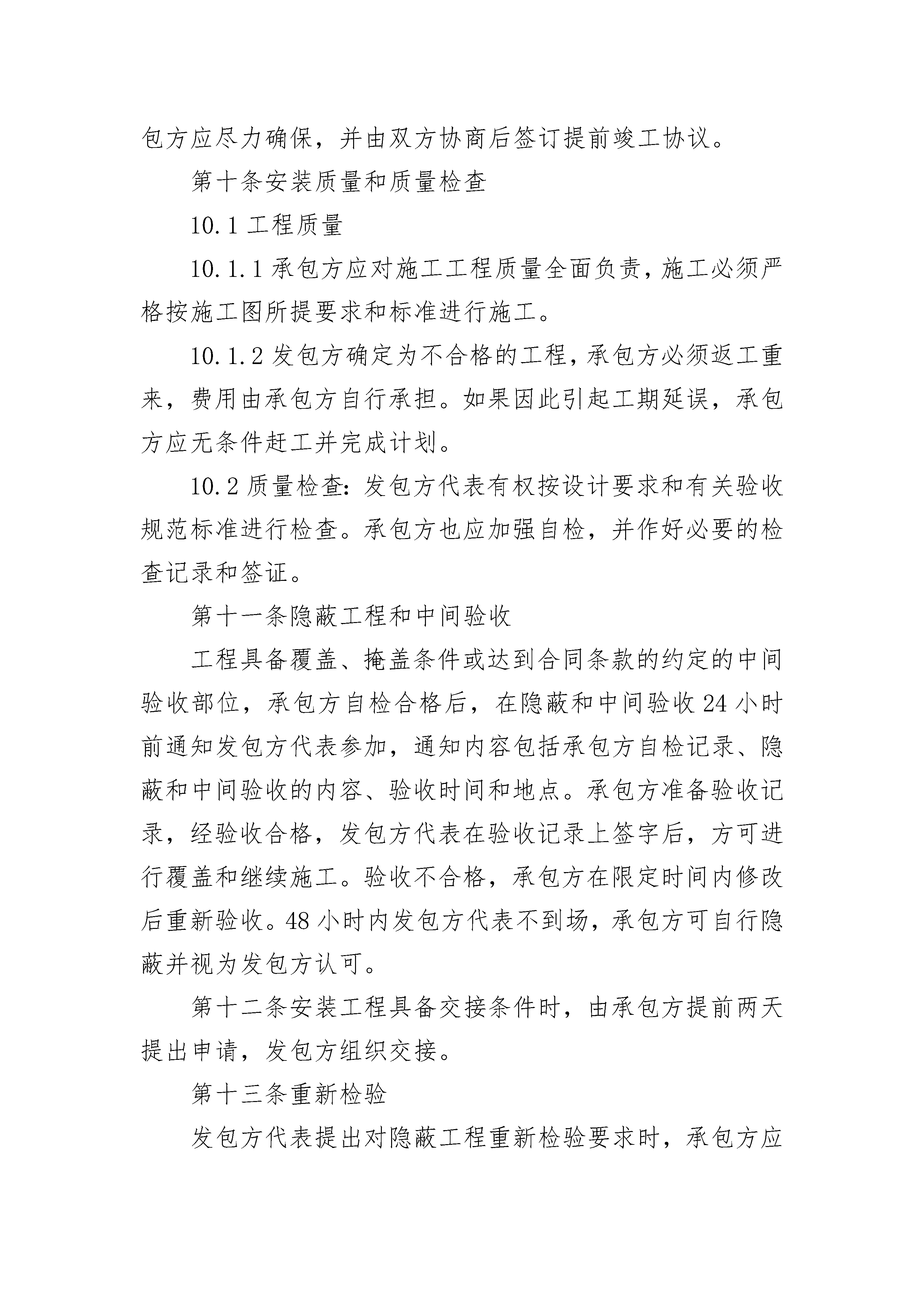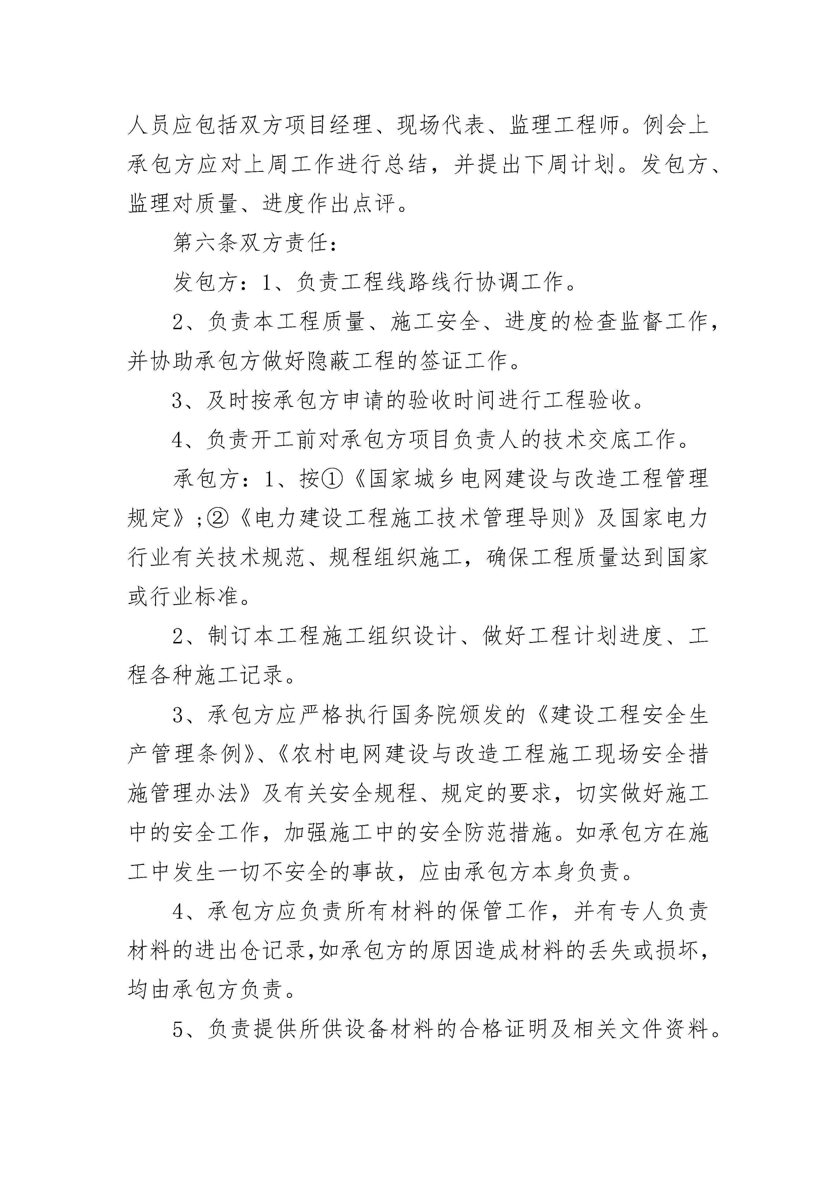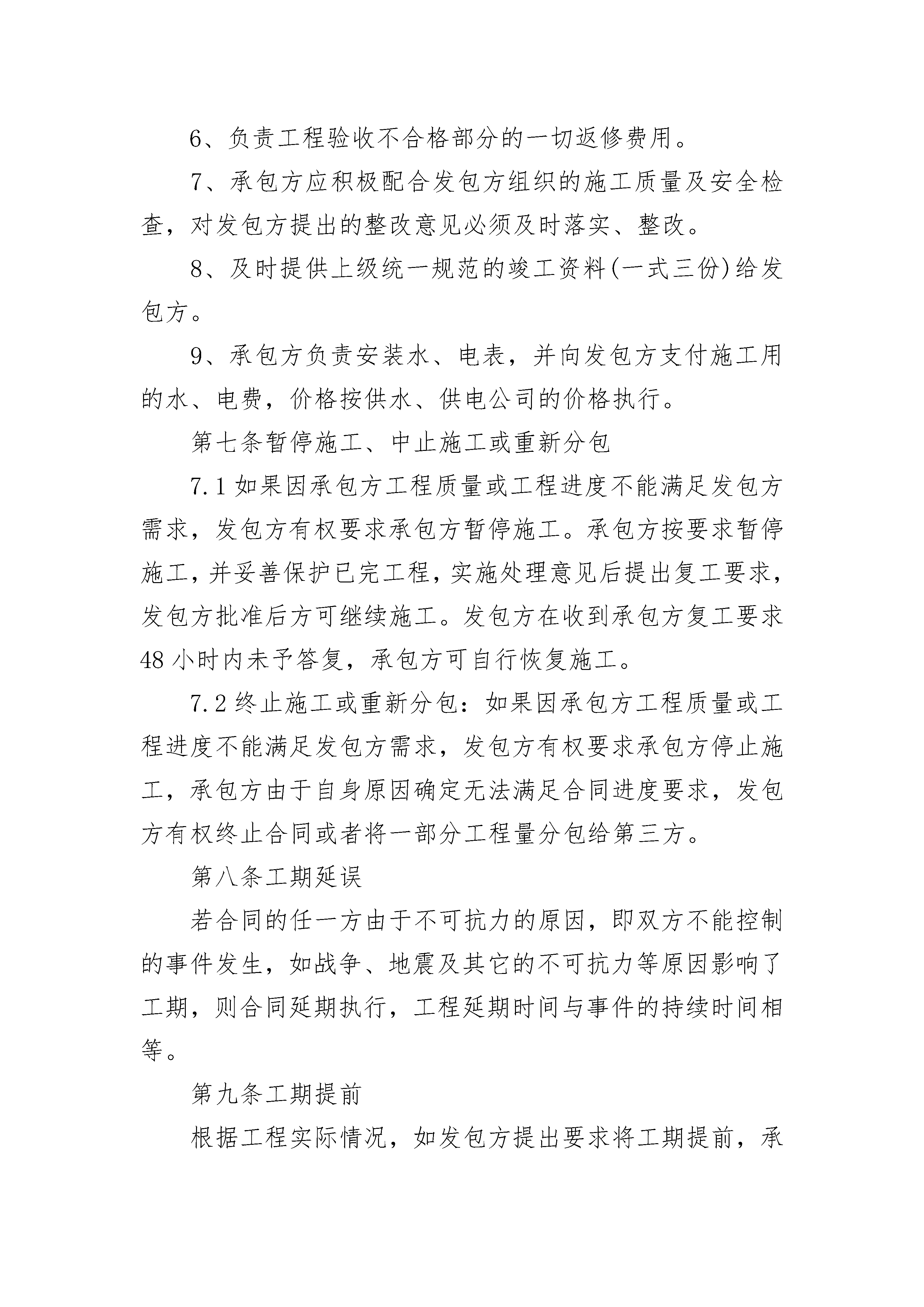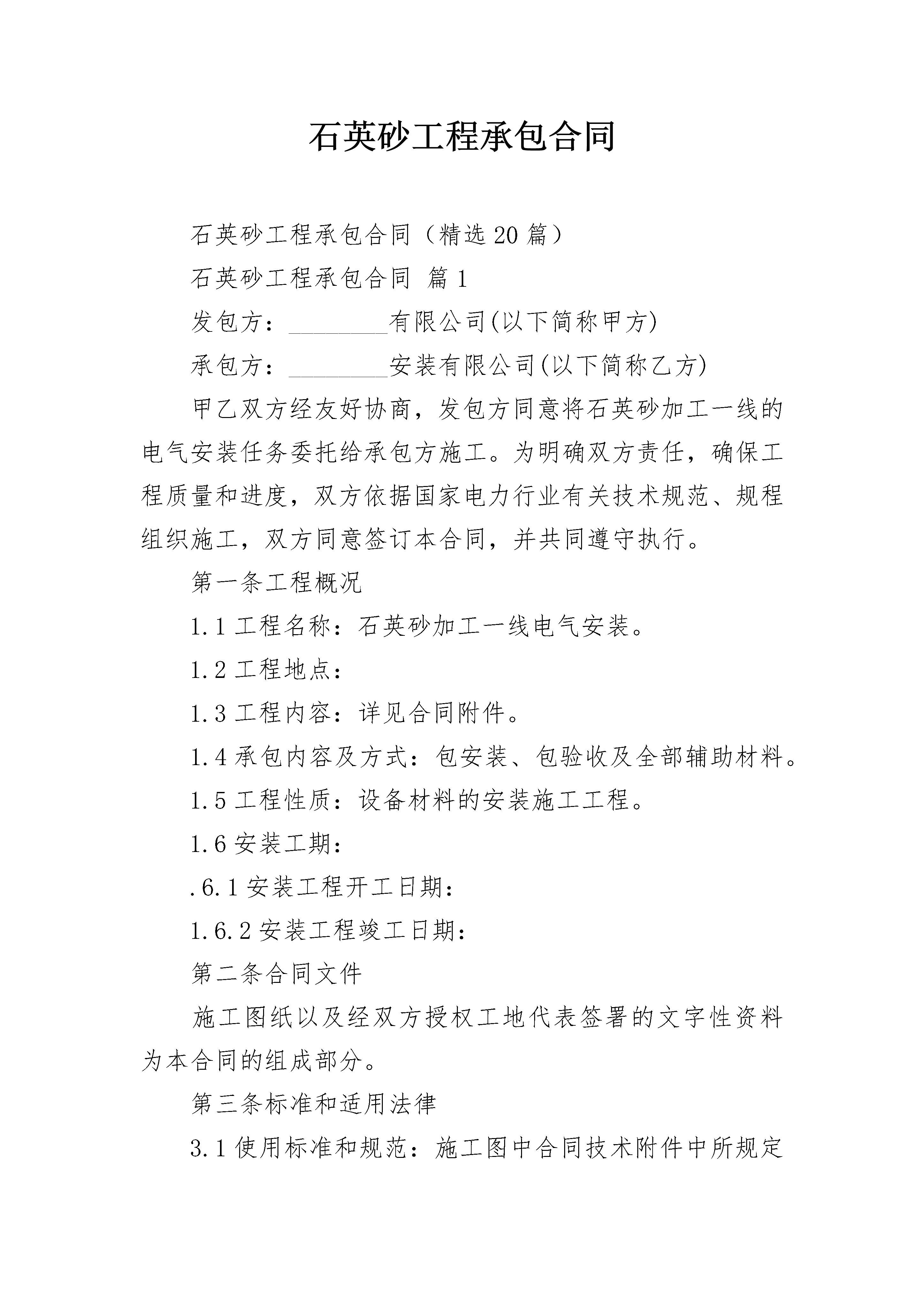 石英砂工程承包合同石英砂工程承包合同(精选20篇)石英砂工程承包合同篇1发包方:________有限公司(以下简称甲方)承包方:________安装有限公司(以下简称乙方)甲乙双方经友好协商,发包方同意将石英砂加工一线的电气安装任务委托给承包方施工。为明确双方责任,确保工程质量和进度,双方依据国家电力行业有关技术规范、规程组织施工,双方同意签订本合同,并共同遵守执行。第一条工程概况1.1工程名称:石英砂加工一线电气安装。1.2工程地点:1.3工程内容:详见合同附件。1.4承包内容及方式:包安装、包验收及全部辅助材料。1.5工程性质:设备材料的安装施工工程。1.6安装工期:.6.1安装工程开工日期:1.6.2安装工程竣工日期:第二条合同文件施工图纸以及经双方授权工地代表签署的文字性资料为本合同的组成部分。第三条标准和适用法律3.1使用标准和规范:施工图中合同技术附件中所规定的技术要求及相关的国家行业规范与标准。3.2适用法律法规:中华人民共和国有关法律和河源市东源县有关法规及规范性文件。第四条图纸及技术资料4.1图纸保密要求:发包方所提供的图纸资料为发包方享有的技术权益,承包方仅限于本项目施工,不得用于其它项目。承包方未经发包方认可,不得复印、转借以及以任何形式泄漏给非施工人员或第三方并保证工程完工后及时把全部技术图纸资料归还给发包方,否则,发包方有权要求承包方按合同总金额的10%承担违约责任。4.2发包方提供资料:本施工工程所需发包方提供的相关资料和图纸,承包方可根据现场情况适当调整除发包方代表反对以外;其余均由承包方参照发包方技术附件的要求以及行业规范自行设计,经发包方书面同意后方可施工。4.3承包方应在竣工之日起20天内或工程验收前提交2套完整的竣工图及施工过程中的原始记录、更改设计单、检验报告等有关竣工资料,竣工资料必须符合发包方档案统一规范,否则发包方有权拒绝结算。第五条甲、乙双方授权工地代表5.发包方授权工地代表:按照合同条款行使合同约定的权力,履行合同约定的职责,其合法性需发包方书面委任。5.2承包方授权工地代表:按照合同条款行使合同约定的权力,履行合同约定的职责,其合法性需承包方书面委任。5.3甲、乙双方每周定期召开工程协调例会,参加例会人员应包括双方项目经理、现场代表、监理工程师。例会上承包方应对上周工作进行总结,并提出下周计划。发包方、监理对质量、进度作出点评。第六条双方责任:发包方:1、负责工程线路线行协调工作。2、负责本工程质量、施工安全、进度的检查监督工作,并协助承包方做好隐蔽工程的签证工作。3、及时按承包方申请的验收时间进行工程验收。4、负责开工前对承包方项目负责人的技术交底工作。承包方:1、按①《国家城乡电网建设与改造工程管理规定》;②《电力建设工程施工技术管理导则》及国家电力行业有关技术规范、规程组织施工,确保工程质量达到国家或行业标准。2、制订本工程施工组织设计、做好工程计划进度、工程各种施工记录。3、承包方应严格执行国务院颁发的《建设工程安全生产管理条例》、《农村电网建设与改造工程施工现场安全措施管理办法》及有关安全规程、规定的要求,切实做好施工中的安全工作,加强施工中的安全防范措施。如承包方在施工中发生一切不安全的事故,应由承包方本身负责。4、承包方应负责所有材料的保管工作,并有专人负责材料的进出仓记录,如承包方的原因造成材料的丢失或损坏,均由承包方负责。5、负责提供所供设备材料的合格证明及相关文件资料。6、负责工程验收不合格部分的一切返修费用。7、承包方应积极配合发包方组织的施工质量及安全检查,对发包方提出的整改意见必须及时落实、整改。8、及时提供上级统一规范的竣工资料(一式三份)给发包方。9、承包方负责安装水、电表,并向发包方支付施工用的水、电费,价格按供水、供电公司的价格执行。第七条暂停施工、中止施工或重新分包7.1如果因承包方工程质量或工程进度不能满足发包方需求,发包方有权要求承包方暂停施工。承包方按要求暂停施工,并妥善保护已完工程,实施处理意见后提出复工要求,发包方批准后方可继续施工。发包方在收到承包方复工要求48小时内未予答复,承包方可自行恢复施工。7.2终止施工或重新分包:如果因承包方工程质量或工程进度不能满足发包方需求,发包方有权要求承包方停止施工,承包方由于自身原因确定无法满足合同进度要求,发包方有权终止合同或者将一部分工程量分包给第三方。第八条工期延误若合同的任一方由于不可抗力的原因,即双方不能控制的事件发生,如战争、地震及其它的不可抗力等原因影响了工期,则合同延期执行,工程延期时间与事件的持续时间相等。第九条工期提前根据工程实际情况,如发包方提出要求将工期提前,承包方应尽力确保,并由双方协商后签订提前竣工协议。第十条安装质量和质量检查10.1工程质量10.1.1承包