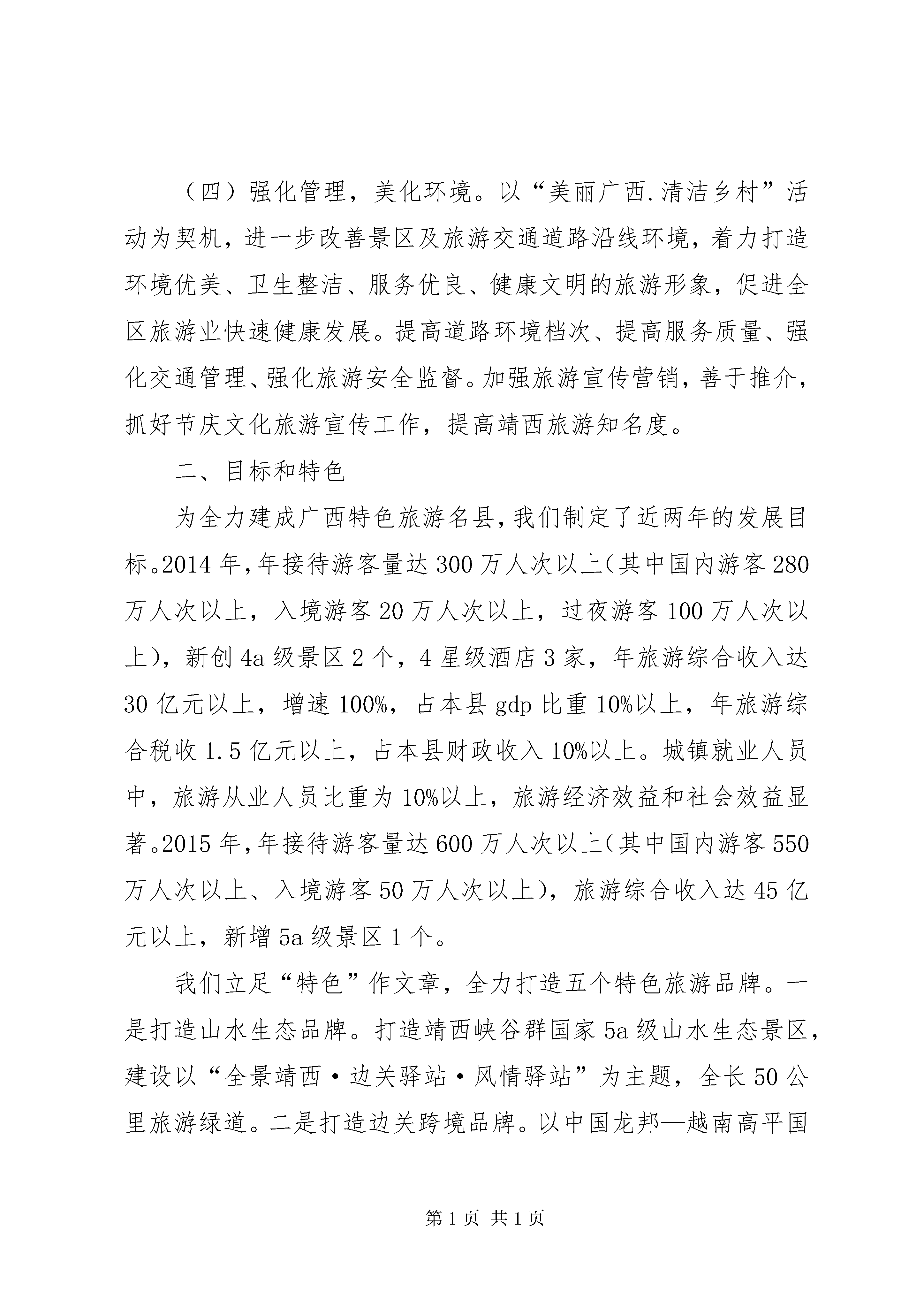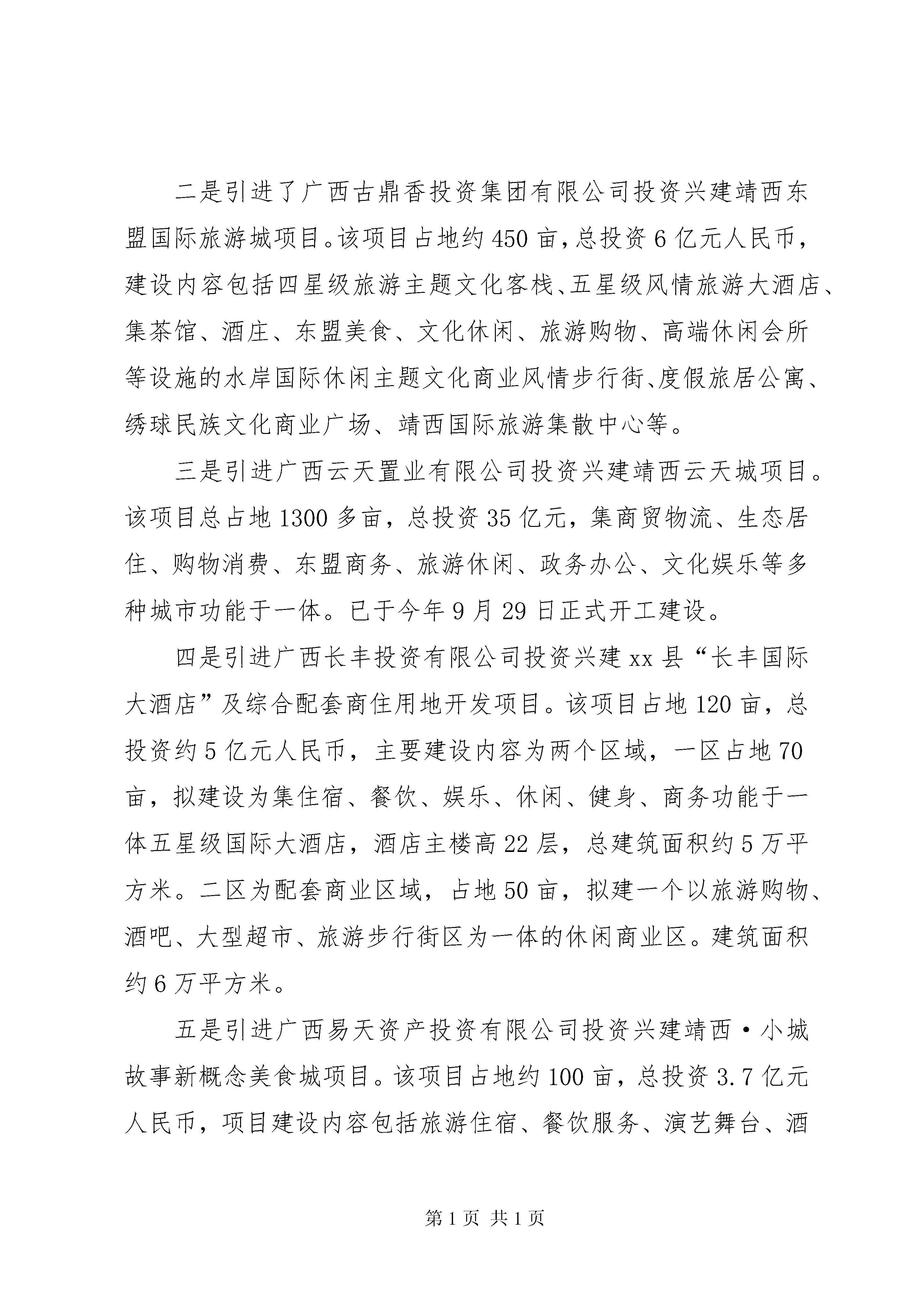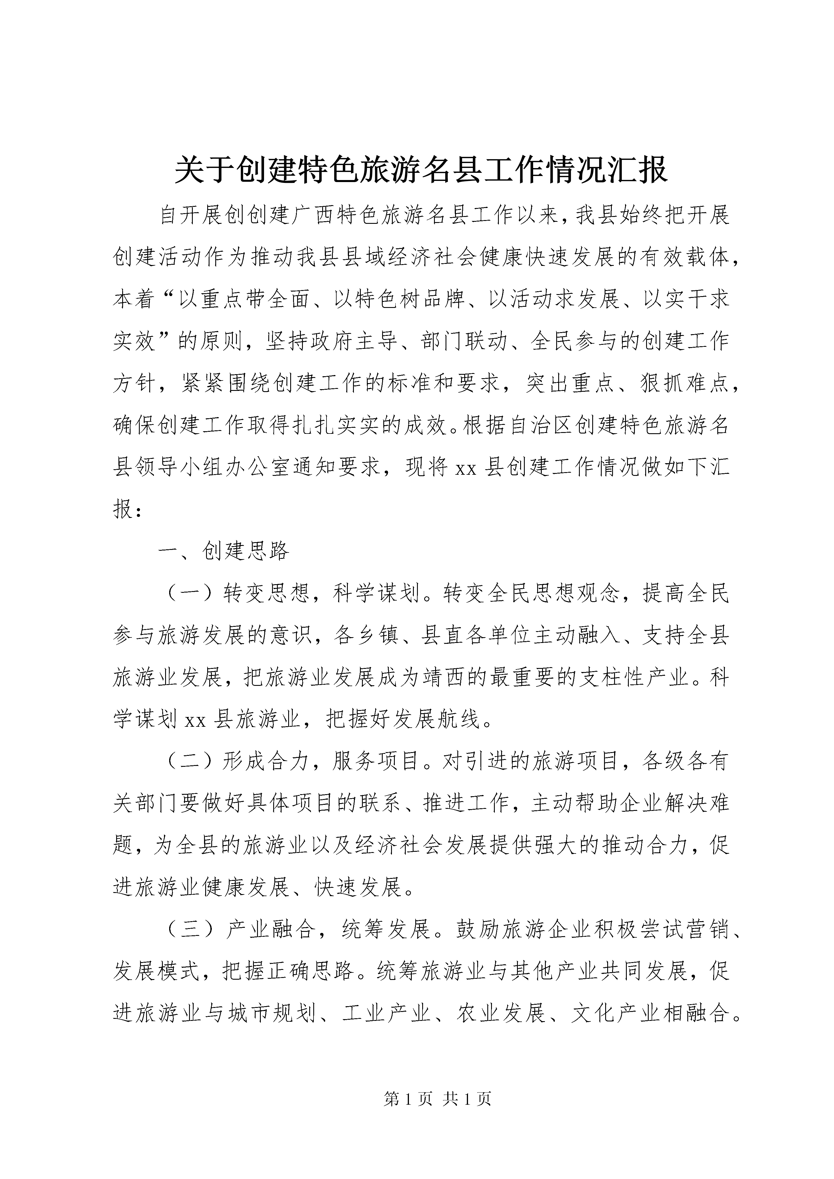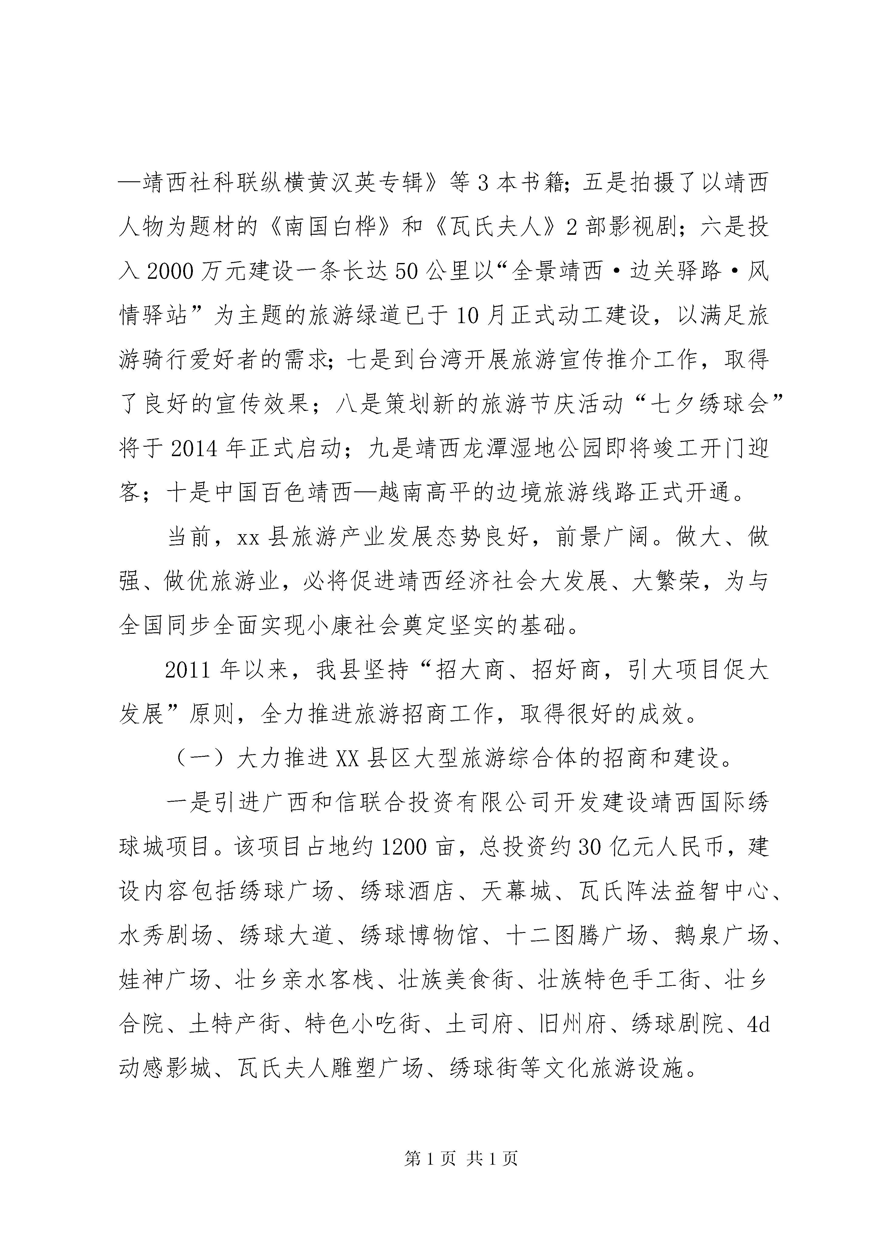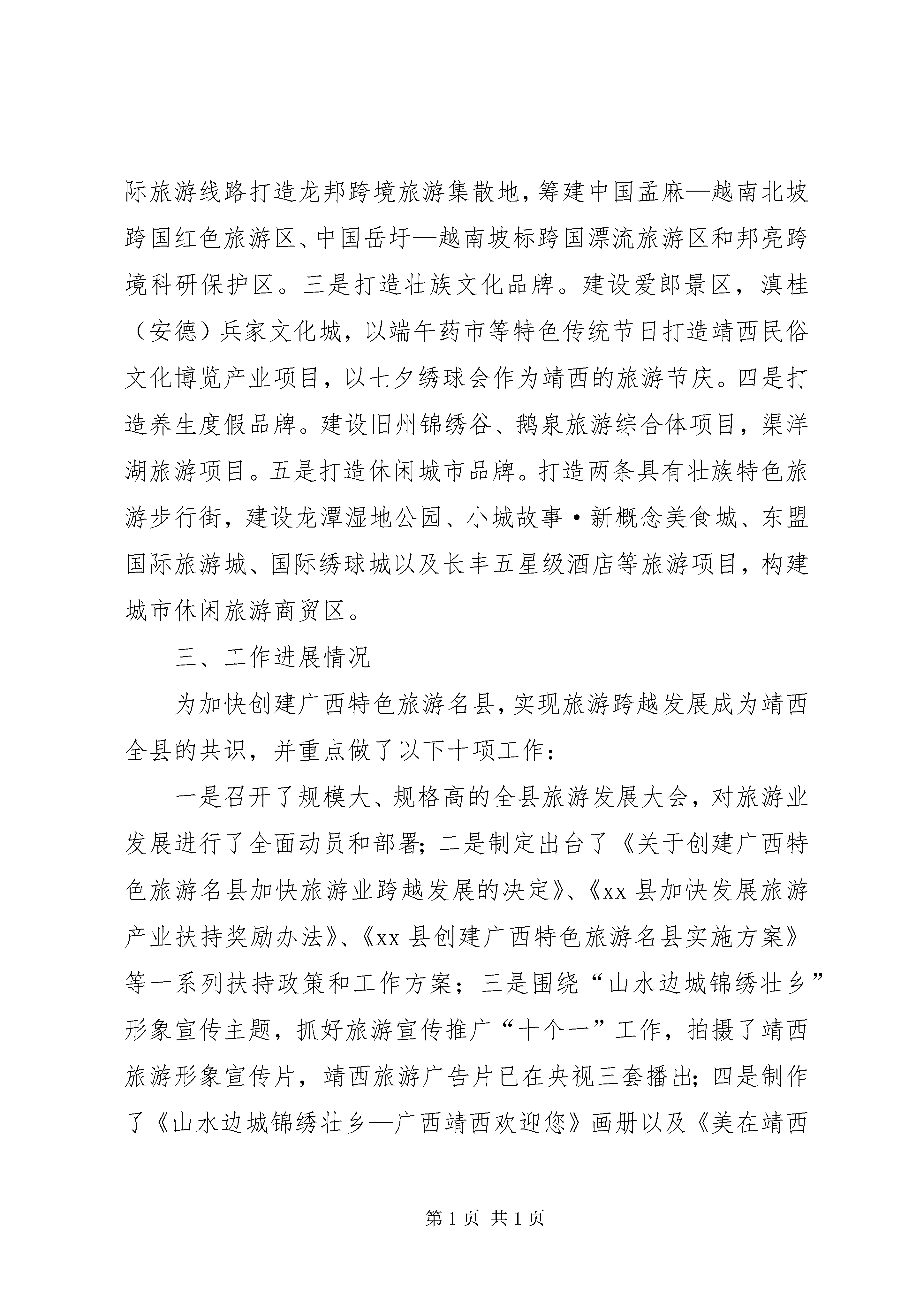关于创建特色旅游名县工作情况汇报自开展创创建广西特色旅游名县工作以来,我县始终把开展创建活动作为推动我县县域经济社会健康快速发展的有效载体,本着“以重点带全面、以特色树品牌、以活动求发展、以实干求实效”的原则,坚持政府主导、部门联动、全民参与的创建工作方针,紧紧围绕创建工作的标准和要求,突出重点、狠抓难点,确保创建工作取得扎扎实实的成效。根据自治区创建特色旅游名县领导小组办公室通知要求,现将xx县创建工作情况做如下汇报:一、创建思路(一)转变思想,科学谋划。转变全民思想观念,提高全民参与旅游发展的意识,各乡镇、县直各单位主动融入、支持全县旅游业发展,把旅游业发展成为靖西的最重要的支柱性产业。科学谋划xx县旅游业,把握好发展航线。(二)形成合力,服务项目。对引进的旅游项目,各级各有关部门要做好具体项目的联系、推进工作,主动帮助企业解决难题,为全县的旅游业以及经济社会发展提供强大的推动合力,促进旅游业健康发展、快速发展。(三)产业融合,统筹发展。鼓励旅游企业积极尝试营销、发展模式,把握正确思路。统筹旅游业与其他产业共同发展,促进旅游业与城市规划、工业产业、农业发展、文化产业相融合。(四)强化管理,美化环境。以“美丽广西.清洁乡村”活动为契机,进一步改善景区及旅游交通道路沿线环境,着力打造环境优美、卫生整洁、服务优良、健康文明的旅游形象,促进全区旅游业快速健康发展。提高道路环境档次、提高服务质量、强化交通管理、强化旅游安全监督。加强旅游宣传营销,善于推介,抓好节庆文化旅游宣传工作,提高靖西旅游知名度。二、目标和特色为全力建成广西特色旅游名县,我们制定了近两年的发展目标。2014年,年接待游客量达300万人次以上(其中国内游客280万人次以上,入境游客20万人次以上,过夜游客100万人次以上),新创4a级景区2个,4星级酒店3家,年旅游综合收入达30亿元以上,增速100%,占本县gdp比重10%以上,年旅游综合税收1.5亿元以上,占本县财政收入10%以上。城镇就业人员中,旅游从业人员比重为10%以上,旅游经济效益和社会效益显著。2015年,年接待游客量达600万人次以上(其中国内游客550万人次以上、入境游客50万人次以上),旅游综合收入达45亿元以上,新增5a级景区1个。我们立足“特色”作文章,全力打造五个特色旅游品牌。一是打造山水生态品牌。打造靖西峡谷群国家5a级山水生态景区,建设以“全景靖西·边关驿站·风情驿站”为主题,全长50公里旅游绿道。二是打造边关跨境品牌。以中国龙邦—越南高平国际旅游线路打造龙邦跨境旅游集散地,筹建中国孟麻—越南北坡跨国红色旅游区、中国岳圩—越南坡标跨国漂流旅游区和邦亮跨境科研保护区。三是打造壮族文化品牌。建设爱郎景区,滇桂(安德)兵家文化城,以端午药市等特色传统节日打造靖西民俗文化博览产业项目,以七夕绣球会作为靖西的旅游节庆。四是打造养生度假品牌。建设旧州锦绣谷、鹅泉旅游综合体项目,渠洋湖旅游项目。五是打造休闲城市品牌。打造两条具有壮族特色旅游步行街,建设龙潭湿地公园、小城故事·新概念美食城、东盟国际旅游城、国际绣球城以及长丰五星级酒店等旅游项目,构建城市休闲旅游商贸区。三、工作进展情况为加快创建广西特色旅游名县,实现旅游跨越发展成为靖西全县的共识,并重点做了以下十项工作:一是召开了规模大、规格高的全县旅游发展大会,对旅游业发展进行了全面动员和部署;二是制定出台了《关于创建广西特色旅游名县加快旅游业跨越发展的决定》、《xx县加快发展旅游产业扶持奖励办法》、《xx县创建广西特色旅游名县实施方案》等一系列扶持政策和工作方案;三是围绕“山水边城锦绣壮乡”形象宣传主题,抓好旅游宣传推广“十个一”工作,拍摄了靖西旅游形象宣传片,靖西旅游广告片已在央视三套播出;四是制作了《山水边城锦绣壮乡—广西靖西欢迎您》画册以及《美在靖西—靖西社科联纵横黄汉英专辑》等3本书籍;五是拍摄了以靖西人物为题材的《南国白桦》和《瓦氏夫人》2部影视剧;六是投入2000万元建设一条长达50公里以“全景靖西·边关驿路·风情驿站”为主题的旅游绿道已于10月正式动工建设,以满足旅游骑行爱好者的需求;七是到台湾开展旅游宣传推介工作,取得了良好的宣传效果;八是策划新的旅游节庆活动“七夕绣球会”将于2014年正式启动;九是靖西龙潭湿地公园即将竣工开门迎客;十是中国百色靖西—越南高平的边境旅游线路正式开通。当前,xx县旅游产业发展态势良好,前景广阔。做大、做强、做优旅游业,必将促进靖西经济社会大发展、大繁荣,为与全国同步全面实现小康社会奠定坚实的基础。2011年以来,我县坚持“招大商、招好商,引大项目促大发展”原则,全力推进旅游招商工作,取得很好的成效。(一)大力推进XX县区大型旅游综合体的招商和建设。一是引进广西和信联合投资有