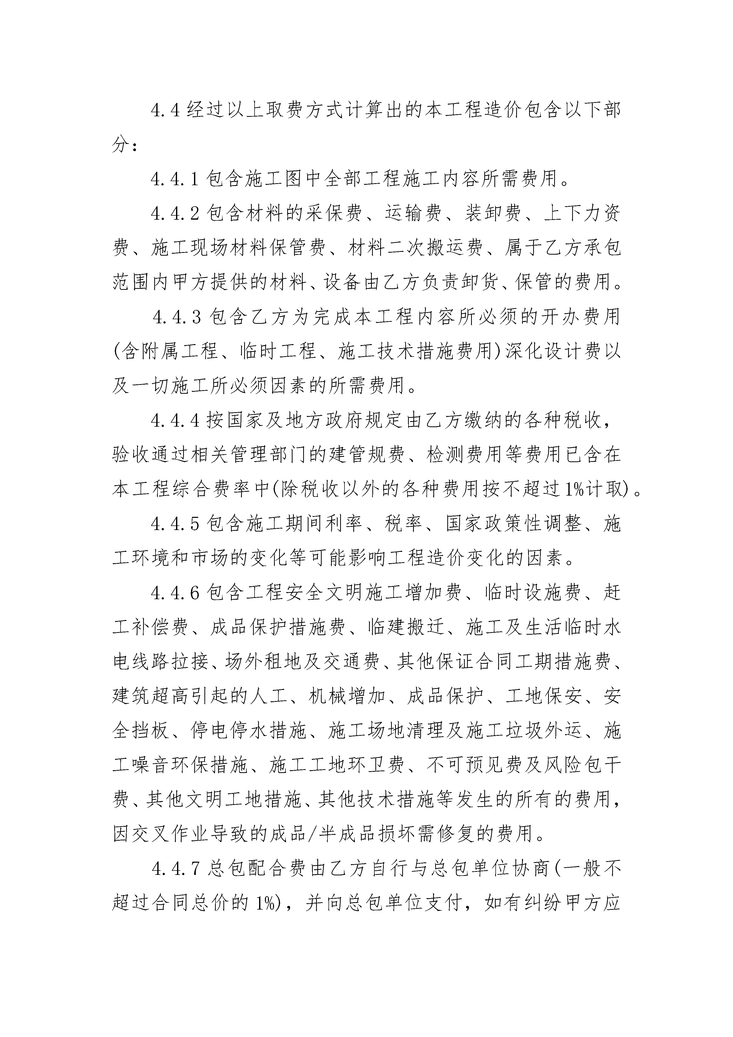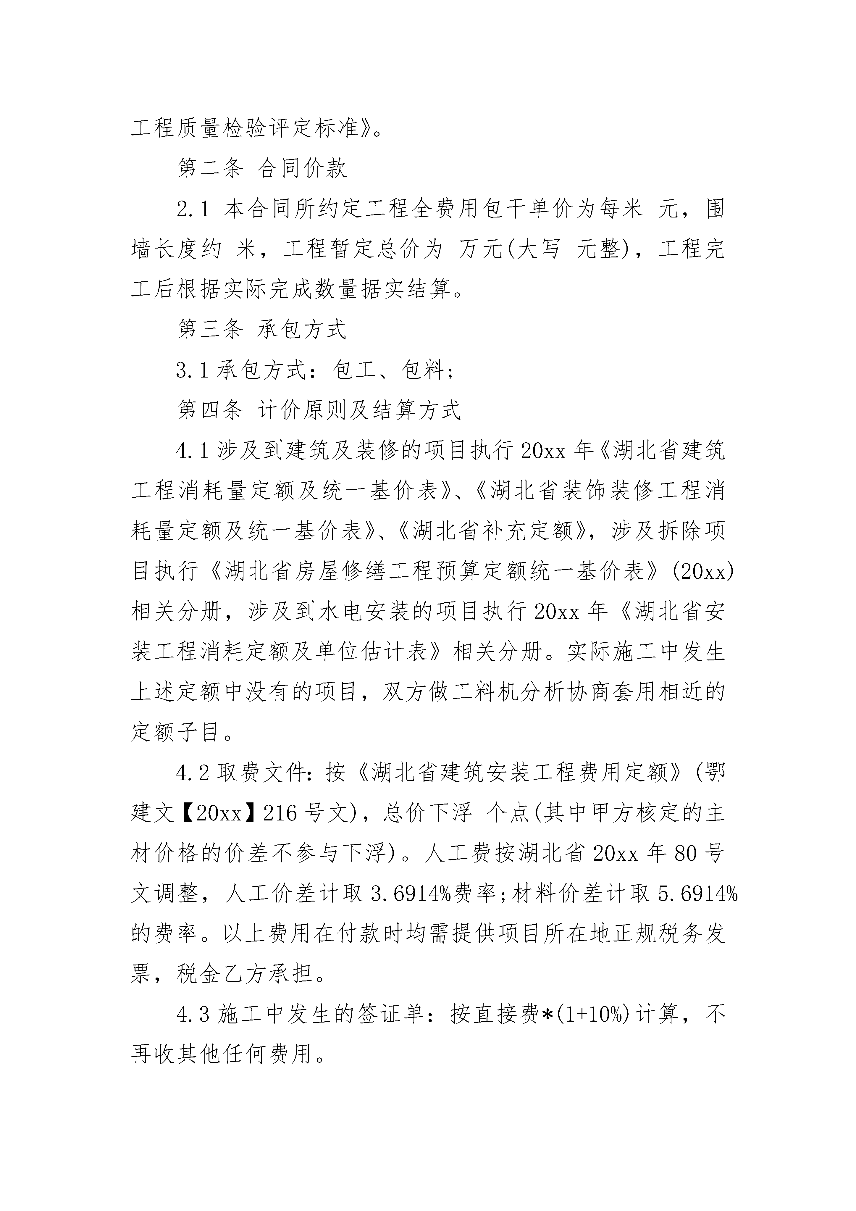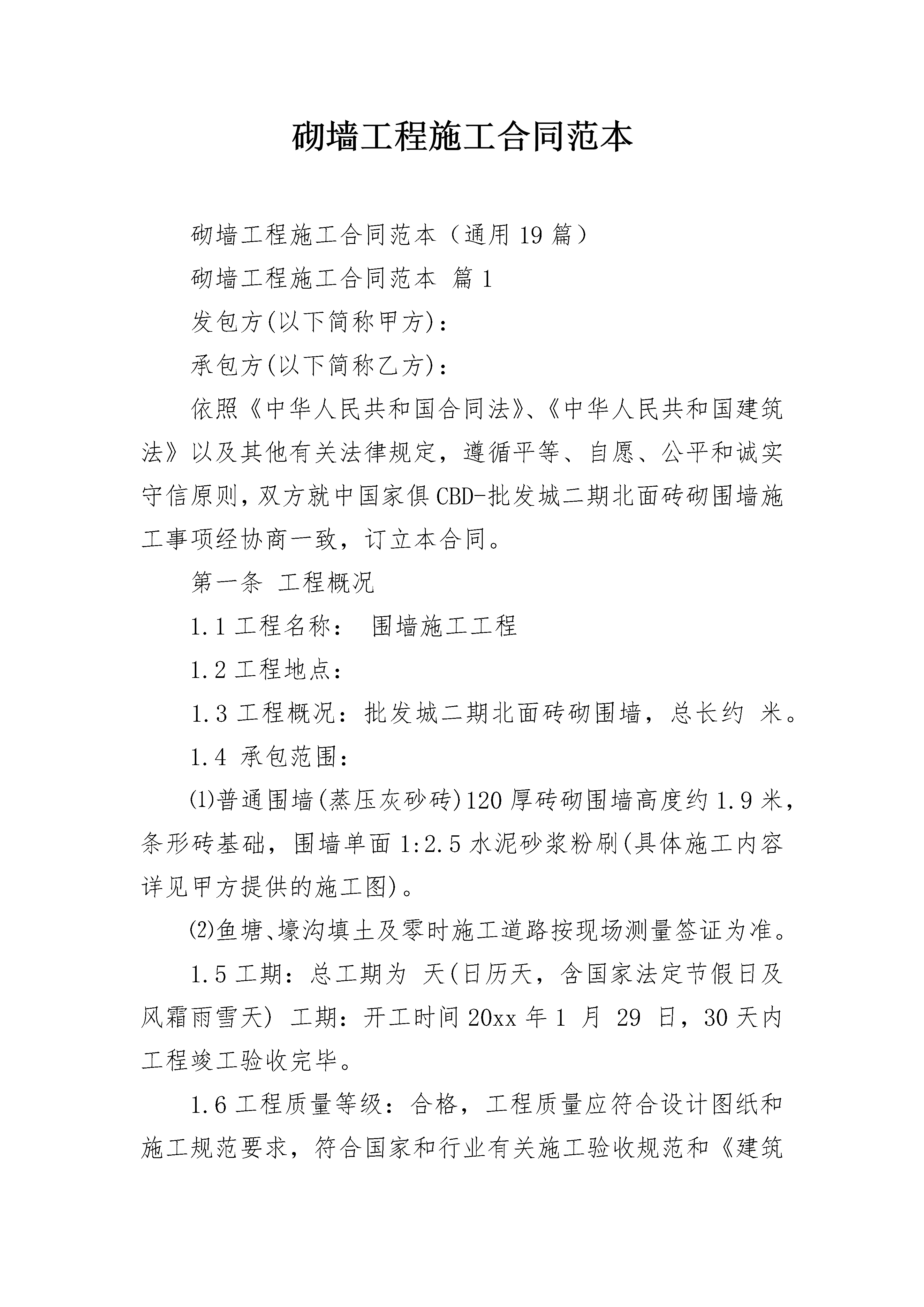 砌墙工程施工合同范本砌墙工程施工合同范本(通用19篇)砌墙工程施工合同范本篇1发包方(以下简称甲方):承包方(以下简称乙方):依照《中华人民共和国合同法》、《中华人民共和国建筑法》以及其他有关法律规定,遵循平等、自愿、公平和诚实守信原则,双方就中国家俱CBD-批发城二期北面砖砌围墙施工事项经协商一致,订立本合同。第一条工程概况1.1工程名称:围墙施工工程1.2工程地点:1.3工程概况:批发城二期北面砖砌围墙,总长约米。1.4承包范围:⑴普通围墙(蒸压灰砂砖)120厚砖砌围墙高度约1.9米,条形砖基础,围墙单面1:2.5水泥砂浆粉刷(具体施工内容详见甲方提供的施工图)。⑵鱼塘、壕沟填土及零时施工道路按现场测量签证为准。1.5工期:总工期为天(日历天,含国家法定节假日及风霜雨雪天)工期:开工时间20xx年1月29日,30天内工程竣工验收完毕。1.6工程质量等级:合格,工程质量应符合设计图纸和施工规范要求,符合国家和行业有关施工验收规范和《建筑工程质量检验评定标准》。第二条合同价款2.1本合同所约定工程全费用包干单价为每米元,围墙长度约米,工程暂定总价为万元(大写元整),工程完工后根据实际完成数量据实结算。第三条承包方式3.1承包方式:包工、包料;第四条计价原则及结算方式4.1涉及到建筑及装修的项目执行20xx年《湖北省建筑工程消耗量定额及统一基价表》、《湖北省装饰装修工程消耗量定额及统一基价表》、《湖北省补充定额》,涉及拆除项目执行《湖北省房屋修缮工程预算定额统一基价表》(20xx)相关分册,涉及到水电安装的项目执行20xx年《湖北省安装工程消耗定额及单位估计表》相关分册。实际施工中发生上述定额中没有的项目,双方做工料机分析协商套用相近的定额子目。4.2取费文件:按《湖北省建筑安装工程费用定额》(鄂建文【20xx】216号文),总价下浮个点(其中甲方核定的主材价格的价差不参与下浮)。人工费按湖北省20xx年80号文调整,人工价差计取3.6914%费率;材料价差计取5.6914%的费率。以上费用在付款时均需提供项目所在地正规税务发票,税金乙方承担。4.3施工中发生的签证单:按直接费*(1+10%)计算,不再收其他任何费用。4.4经过以上取费方式计算出的本工程造价包含以下部分:4.4.1包含施工图中全部工程施工内容所需费用。4.4.2包含材料的采保费、运输费、装卸费、上下力资费、施工现场材料保管费、材料二次搬运费、属于乙方承包范围内甲方提供的材料、设备由乙方负责卸货、保管的费用。4.4.3包含乙方为完成本工程内容所必须的开办费用(含附属工程、临时工程、施工技术措施费用)深化设计费以及一切施工所必须因素的所需费用。4.4.4按国家及地方政府规定由乙方缴纳的各种税收,验收通过相关管理部门的建管规费、检测费用等费用已含在本工程综合费率中(除税收以外的各种费用按不超过1%计取)。4.4.5包含施工期间利率、税率、国家政策性调整、施工环境和市场的变化等可能影响工程造价变化的因素。4.4.6包含工程安全文明施工增加费、临时设施费、赶工补偿费、成品保护措施费、临建搬迁、施工及生活临时水电线路拉接、场外租地及交通费、其他保证合同工期措施费、建筑超高引起的人工、机械增加、成品保护、工地保安、安全挡板、停电停水措施、施工场地清理及施工垃圾外运、施工噪音环保措施、施工工地环卫费、不可预见费及风险包干费、其他文明工地措施、其他技术措施等发生的所有的费用,因交叉作业导致的成品/半成品损坏需修复的费用。4.4.7总包配合费由乙方自行与总包单位协商(一般不超过合同总价的1%),并向总包单位支付,如有纠纷甲方应尽力组织双方协商。4.5、工程结算依据为:(1)本合同;(2)取费标准为本合同约定的取费标准的条款;(3)施工图及设计说明;(4)招投标文件;(5)建设方和本工程项目监理认可签字的施工组织设计;(6)施工日志;(7)甲方核定的材料核价单;(8)工程竣工图;(9)设计变更单(须经监理和甲方确认、盖章);(10)现场签证单(须经监理和甲方确认、盖章);(11)加盖施工方公章的正式的工程结算书及工程量计算式。按本合同第四条约定据实计算工程总价。4.6工程结算复核:4.6.1工程竣工验收合格后15天内,乙方向甲方提交《劳务人员工资已结清声明》(见附件三)、完整的工程结算报告后(报告内容须符合《工程结算送审资料标准清单》之要求。(见附件一),甲方受理结算资料后90日内出具结算初审意见。4.6.2乙方在提交工程结算书15日后,应联系甲方初审部门的相关人员,具体确定校正、复核有关工程量和价格的时间安排,并无条件出席校正、复核,直至乙方与甲方造价人员有初步一致的结算书面意见。4.6.3最终结算造价以建设方集团复审部门与乙方双方核对量价后,双方签字盖章的复审金额为准。工程结
