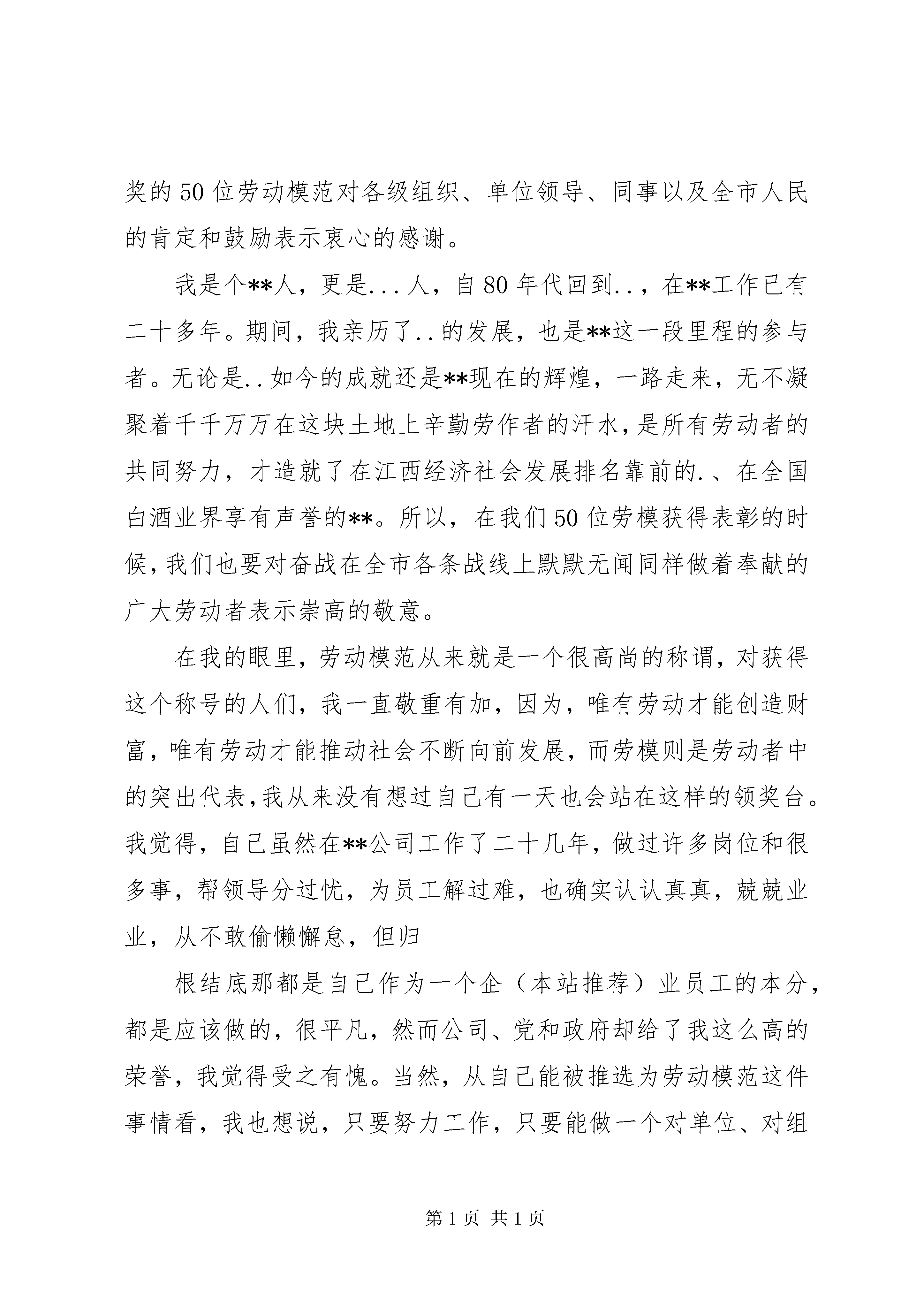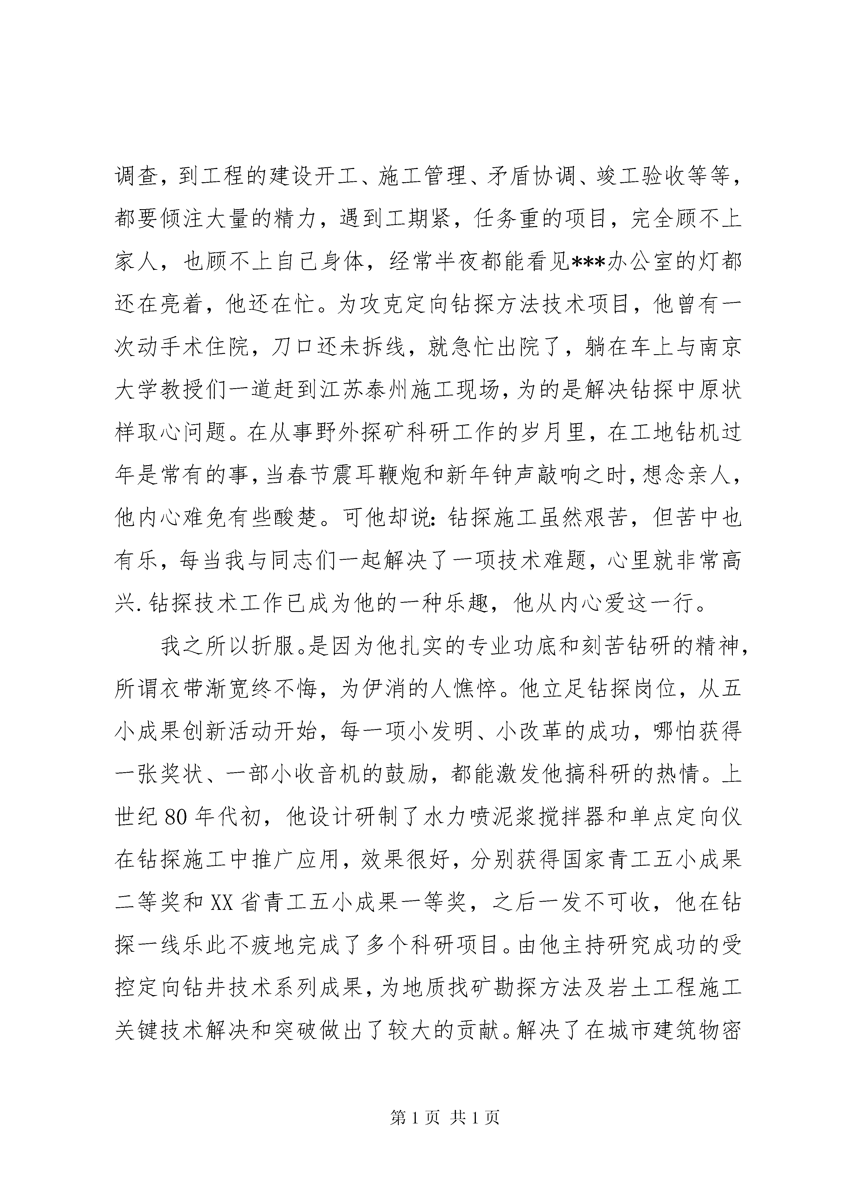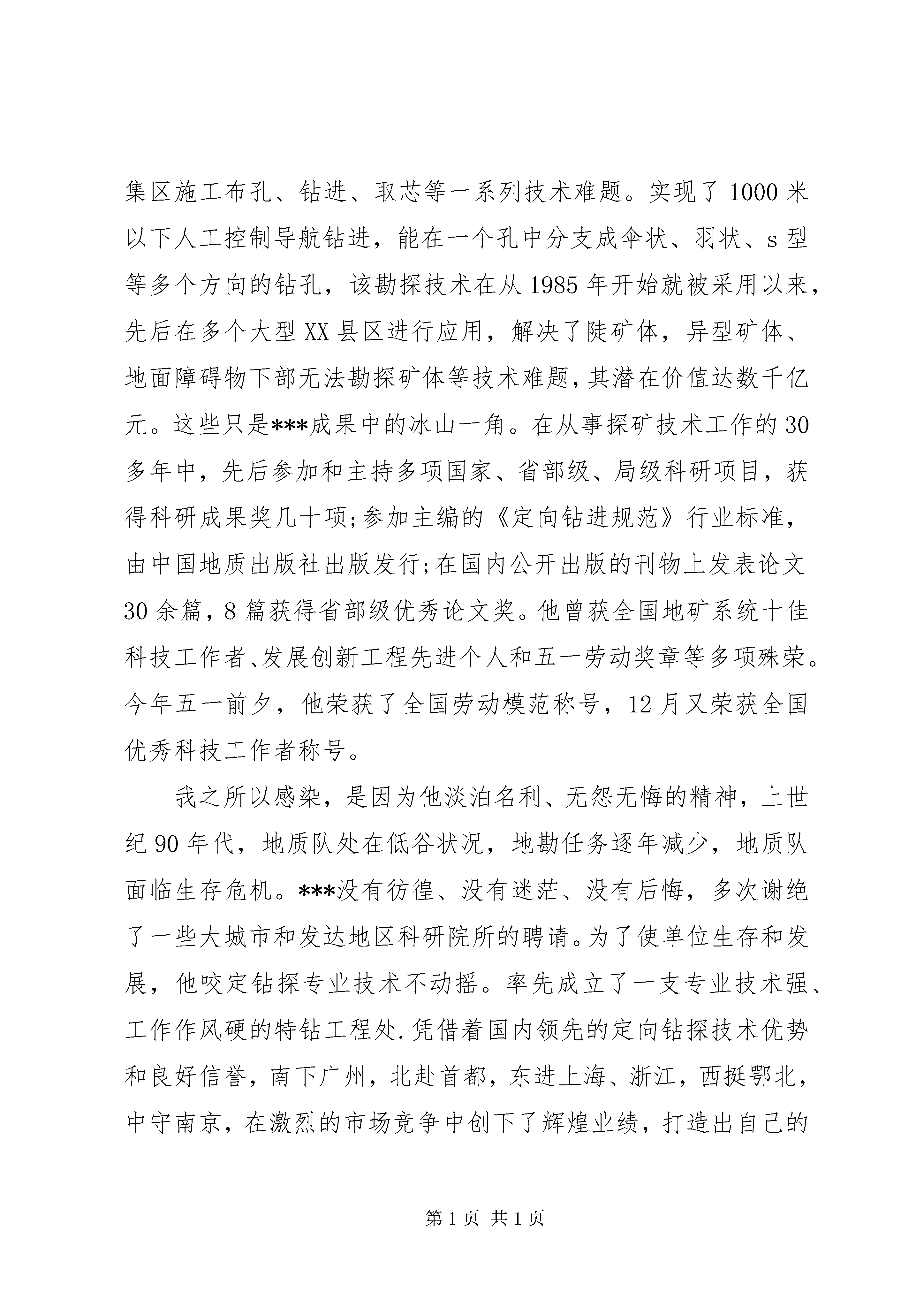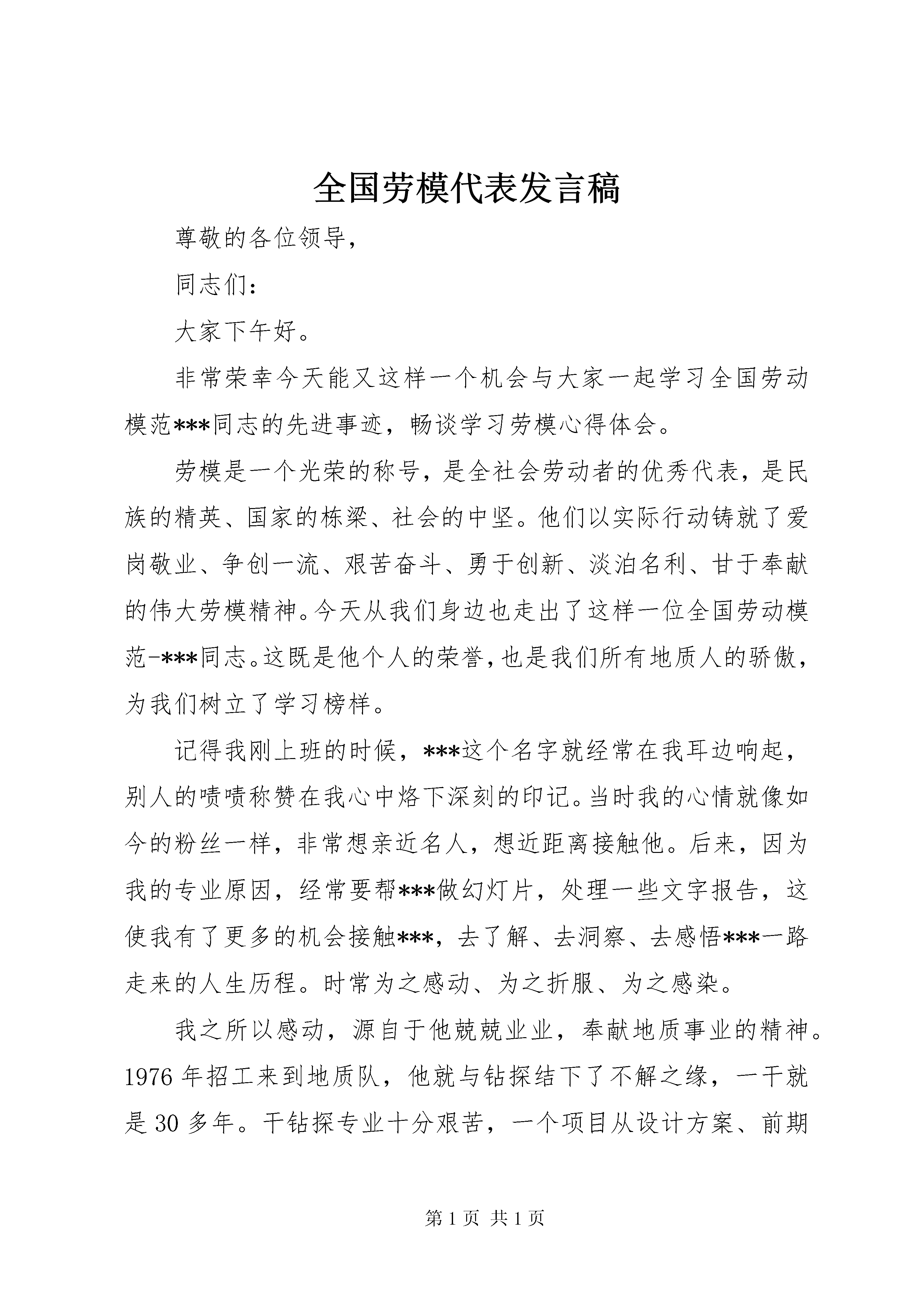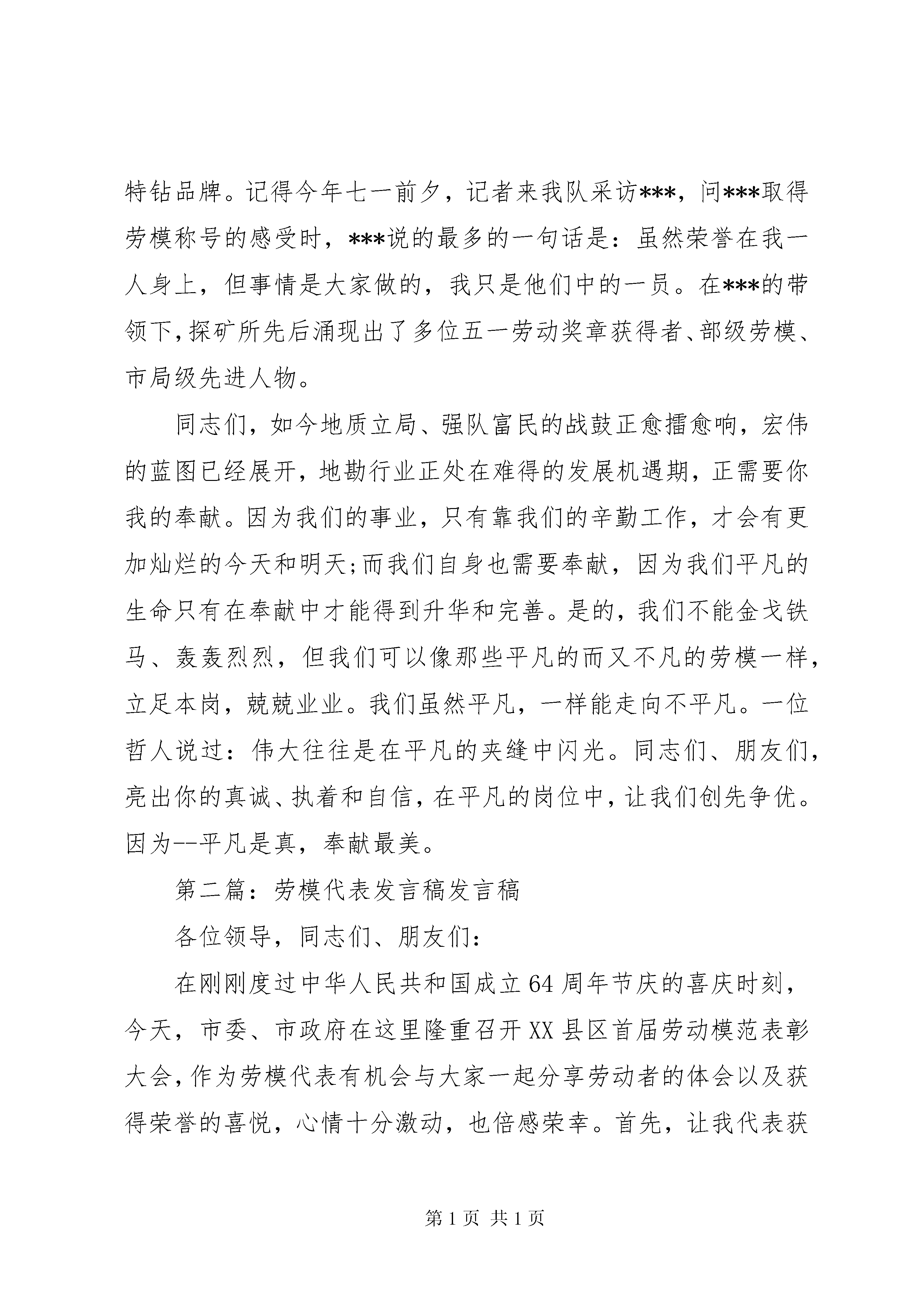 全国劳模代表发言稿尊敬的各位领导,同志们:大家下午好。非常荣幸今天能又这样一个机会与大家一起学习全国劳动模范***同志的先进事迹,畅谈学习劳模心得体会。劳模是一个光荣的称号,是全社会劳动者的优秀代表,是民族的精英、国家的栋梁、社会的中坚。他们以实际行动铸就了爱岗敬业、争创一流、艰苦奋斗、勇于创新、淡泊名利、甘于奉献的伟大劳模精神。今天从我们身边也走出了这样一位全国劳动模范-***同志。这既是他个人的荣誉,也是我们所有地质人的骄傲,为我们树立了学习榜样。记得我刚上班的时候,***这个名字就经常在我耳边响起,别人的啧啧称赞在我心中烙下深刻的印记。当时我的心情就像如今的粉丝一样,非常想亲近名人,想近距离接触他。后来,因为我的专业原因,经常要帮***做幻灯片,处理一些文字报告,这使我有了更多的机会接触***,去了解、去洞察、去感悟***一路走来的人生历程。时常为之感动、为之折服、为之感染。我之所以感动,源自于他兢兢业业,奉献地质事业的精神。1976年招工来到地质队,他就与钻探结下了不解之缘,一干就是30多年。干钻探专业十分艰苦,一个项目从设计方案、前期调查,到工程的建设开工、施工管理、矛盾协调、竣工验收等等,都要倾注大量的精力,遇到工期紧,任务重的项目,完全顾不上家人,也顾不上自己身体,经常半夜都能看见***办公室的灯都还在亮着,他还在忙。为攻克定向钻探方法技术项目,他曾有一次动手术住院,刀口还未拆线,就急忙出院了,躺在车上与南京大学教授们一道赶到江苏泰州施工现场,为的是解决钻探中原状样取心问题。在从事野外探矿科研工作的岁月里,在工地钻机过年是常有的事,当春节震耳鞭炮和新年钟声敲响之时,想念亲人,他内心难免有些酸楚。可他却说:钻探施工虽然艰苦,但苦中也有乐,每当我与同志们一起解决了一项技术难题,心里就非常高兴.钻探技术工作已成为他的一种乐趣,他从内心爱这一行。我之所以折服。是因为他扎实的专业功底和刻苦钻研的精神,所谓衣带渐宽终不悔,为伊消的人憔悴。他立足钻探岗位,从五小成果创新活动开始,每一项小发明、小改革的成功,哪怕获得一张奖状、一部小收音机的鼓励,都能激发他搞科研的热情。上世纪80年代初,他设计研制了水力喷泥浆搅拌器和单点定向仪在钻探施工中推广应用,效果很好,分别获得国家青工五小成果二等奖和XX省青工五小成果一等奖,之后一发不可收,他在钻探一线乐此不疲地完成了多个科研项目。由他主持研究成功的受控定向钻井技术系列成果,为地质找矿勘探方法及岩土工程施工关键技术解决和突破做出了较大的贡献。解决了在城市建筑物密集区施工布孔、钻进、取芯等一系列技术难题。实现了1000米以下人工控制导航钻进,能在一个孔中分支成伞状、羽状、s型等多个方向的钻孔,该勘探技术在从1985年开始就被采用以来,先后在多个大型XX县区进行应用,解决了陡矿体,异型矿体、地面障碍物下部无法勘探矿体等技术难题,其潜在价值达数千亿元。这些只是***成果中的冰山一角。在从事探矿技术工作的30多年中,先后参加和主持多项国家、省部级、局级科研项目,获得科研成果奖几十项;参加主编的《定向钻进规范》行业标准,由中国地质出版社出版发行;在国内公开出版的刊物上发表论文30余篇,8篇获得省部级优秀论文奖。他曾获全国地矿系统十佳科技工作者、发展创新工程先进个人和五一劳动奖章等多项殊荣。今年五一前夕,他荣获了全国劳动模范称号,12月又荣获全国优秀科技工作者称号。我之所以感染,是因为他淡泊名利、无怨无悔的精神,上世纪90年代,地质队处在低谷状况,地勘任务逐年减少,地质队面临生存危机。***没有彷徨、没有迷茫、没有后悔,多次谢绝了一些大城市和发达地区科研院所的聘请。为了使单位生存和发展,他咬定钻探专业技术不动摇。率先成立了一支专业技术强、工作作风硬的特钻工程处.凭借着国内领先的定向钻探技术优势和良好信誉,南下广州,北赴首都,东进上海、浙江,西挺鄂北,中守南京,在激烈的市场竞争中创下了辉煌业绩,打造出自己的特钻品牌。记得今年七一前夕,记者来我队采访***,问***取得劳模称号的感受时,***说的最多的一句话是:虽然荣誉在我一人身上,但事情是大家做的,我只是他们中的一员。在***的带领下,探矿所先后涌现出了多位五一劳动奖章获得者、部级劳模、市局级先进人物。同志们,如今地质立局、强队富民的战鼓正愈擂愈响,宏伟的蓝图已经展开,地勘行业正处在难得的发展机遇期,正需要你我的奉献。因为我们的事业,只有靠我们的辛勤工作,才会有更加灿烂的今天和明天;而我们自身也需要奉献,因为我们平凡的生命只有在奉献中才能得到升华和完善。是的,我们不能金戈铁马、轰轰烈烈,但我们可以像那些平凡的而又不凡的劳模一样,立足本岗,兢兢业业。我们虽然平凡,一样能走向不平凡。一位哲人说过:伟大往往是在平凡的夹缝中闪光。同志