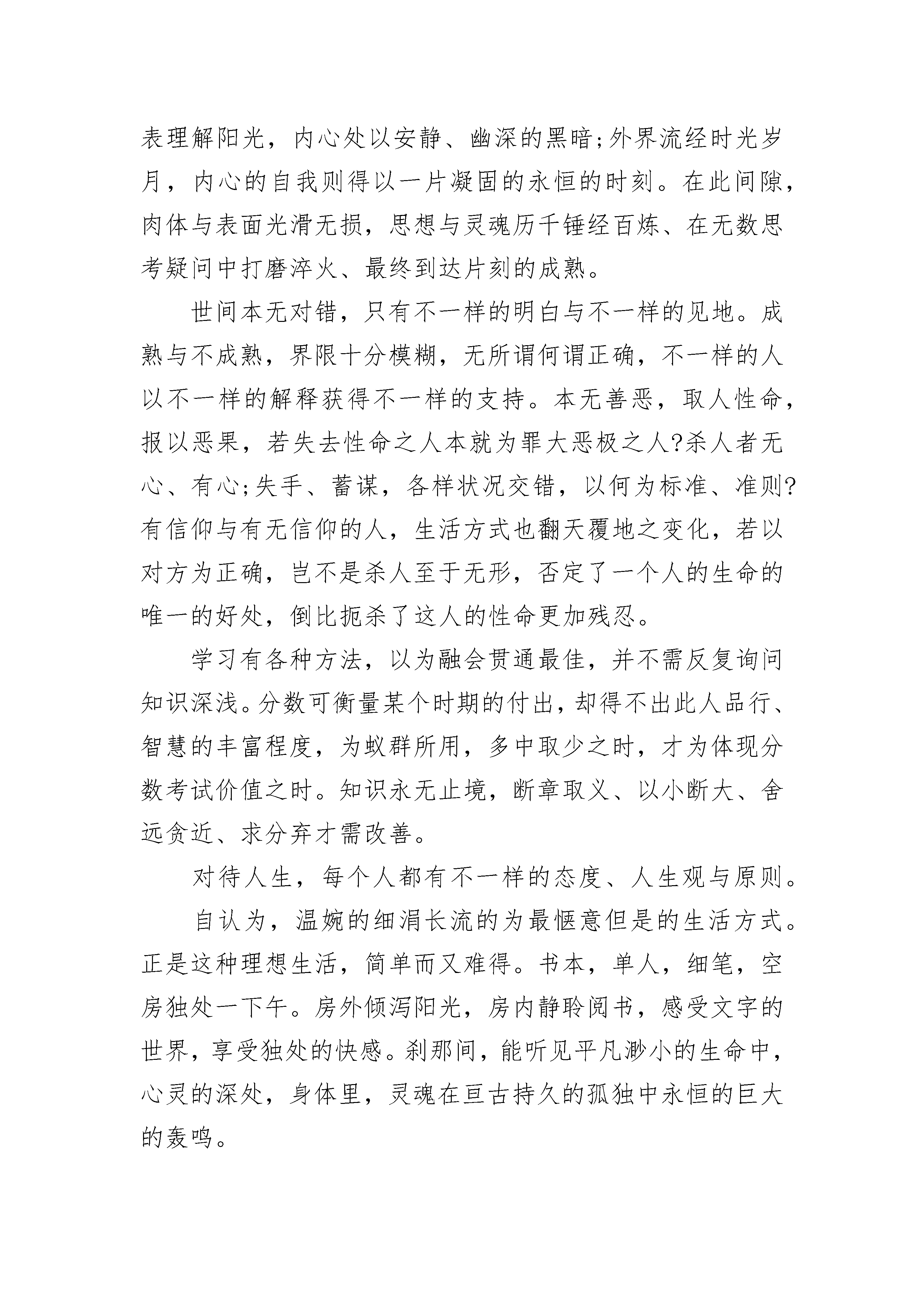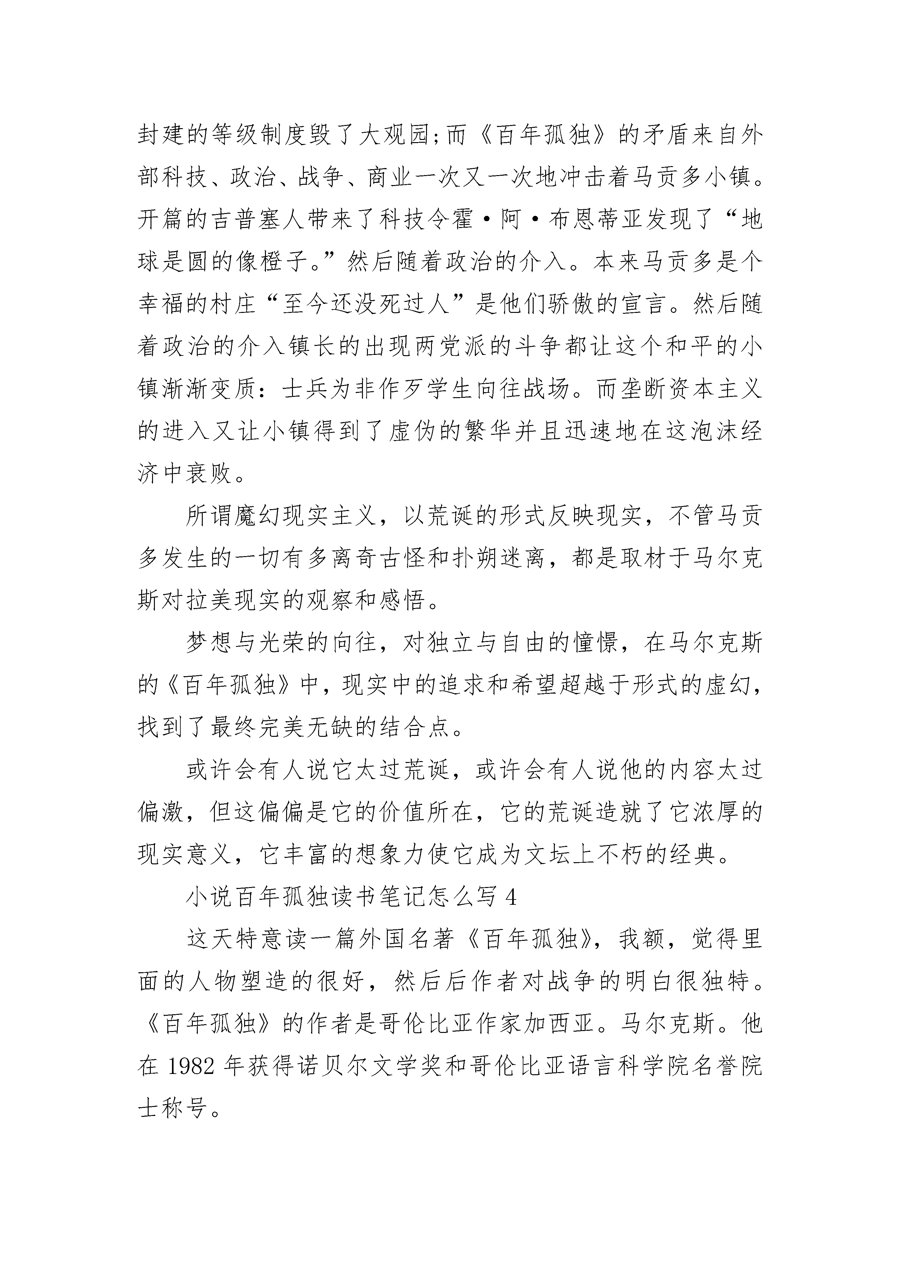 小说百年孤独读书笔记怎么写5篇小说百年孤独读书笔记怎么写1《百年孤独》,作为为马尔克斯赢得了诺贝尔文学奖的成名作,它无异是一本不容错过的精彩小说。不少人分析这部作品,说它反映了拉丁美洲的历史演变和社会现实等等。我没有足够的知识供我写下如此深刻的评论。因此只能作为读者,去讲述这部小说中最令我记忆深刻的,两位迥然不同的女性。“乌尔苏拉象丈夫一样勤劳。她是一个严肃、活跃和矮小的女人,意志坚强,大概一辈子都没唱过歌,每天从黎明到深夜,四处都有她的踪影,到处都能听到她那浆过的荷兰亚麻布裙子轻微的沙沙声。”比起那个无比经典的开头,我想这句话要显得平凡的多,因此通常不被人所注意——这是这本书中出现的第一句正面描述乌尔苏拉的话语。正像书中所描述的那样,乌尔苏拉这样一位看似平凡的女人,她的勤劳和坚强是她身上最为耀眼的闪光点。她是一位妻子,一位母亲。无论是她的丈夫为怪异的学术痴狂之时,亦或是发现她的子孙陷入了怪诞的命运之中,她都不懈地与命运抗争着。试图让困境得以扭转,让人与人之间多一丝联系,统一起分散的力量。尽管最后这种尝试仍以失败告终,而她的晚年也在由眼疾带来的模糊黑暗和过于长久的岁月所致的逐渐衍生的的孤独感中度过。但她的热情坚强,在一堆性格孤僻怪异的族人中显得尤为珍贵难得。而由她所操持的,几代人同堂而居的生活,也一度是《百年孤独》中最为幸福美好的场景。阿玛兰塔·布恩迪亚,乌尔苏拉的小女儿,这位面容娇俏的少女爱上了钢琴技师皮埃特罗。嫉妒使她不惜一再破坏表亲丽贝卡与他的婚姻,直到无意中毒死了哥哥的妻子——年幼而贤淑的蕾梅黛丝。强烈的悔意与仇恨交织,扭曲了她的心理。她与皮埃特罗交往,但却又拒绝与他结婚,使得皮埃特罗为此自杀。出于悔恨,她故意烧伤一只手,终生用黑色绷带缠起来,决心永不嫁人。但内心的孤独、苦闷让她难以忍受,甚至和刚刚成年的侄儿厮混,即便如此她始终无法摆脱内心的孤独。她把自己终日关在房中缝制殓衣,缝了拆,拆了缝,直至生命的最后一刻。小说百年孤独读书笔记怎么写2我不知道孤独象征着何物,也许是精神,也许是肉体。人类生而孤独,死后灵魂也无法幸免。也许这个世界给予人类的唯一的一生务必背负着的沉重的烙印,便是如影随形的孤独。从这一点上来看,无人不孤独。肉体、外在与表面是停留在这个繁华热闹的世界,与无数人打着交道,生活在群体中。灵魂、内在、却是活在独自、只有唯一的世界里,精神是独立于肉体而存在的,思想能与外界分享、交流,可灵魂务必得到独立的思考才能得以更高层次的深化。有时候身边的人越多,与外界的沟通越多,得到的信息与反馈越多,就越能体会到内在世界精神的唯一与独立。外表理解阳光,内心处以安静、幽深的黑暗;外界流经时光岁月,内心的自我则得以一片凝固的永恒的时刻。在此间隙,肉体与表面光滑无损,思想与灵魂历千锤经百炼、在无数思考疑问中打磨淬火、最终到达片刻的成熟。世间本无对错,只有不一样的明白与不一样的见地。成熟与不成熟,界限十分模糊,无所谓何谓正确,不一样的人以不一样的解释获得不一样的支持。本无善恶,取人性命,报以恶果,若失去性命之人本就为罪大恶极之人?杀人者无心、有心;失手、蓄谋,各样状况交错,以何为标准、准则?有信仰与有无信仰的人,生活方式也翻天覆地之变化,若以对方为正确,岂不是杀人至于无形,否定了一个人的生命的唯一的好处,倒比扼杀了这人的性命更加残忍。学习有各种方法,以为融会贯通最佳,并不需反复询问知识深浅。分数可衡量某个时期的付出,却得不出此人品行、智慧的丰富程度,为蚁群所用,多中取少之时,才为体现分数考试价值之时。知识永无止境,断章取义、以小断大、舍远贪近、求分弃才需改善。对待人生,每个人都有不一样的态度、人生观与原则。自认为,温婉的细涓长流的为最惬意但是的生活方式。正是这种理想生活,简单而又难得。书本,单人,细笔,空房独处一下午。房外倾泻阳光,房内静聆阅书,感受文字的世界,享受独处的快感。刹那间,能听见平凡渺小的生命中,心灵的深处,身体里,灵魂在亘古持久的孤独中永恒的巨大的轰鸣。我的生活态度,也便是独立且无时无刻不在思考,无论是应对过去,此刻,或是未来。小说百年孤独读书笔记怎么写3《百年孤独》的叙事结构不同一般马尔克斯采用了连环、环环相套、循环往复的叙事结构来展现小镇马孔多的历史。仿佛一个循环向上的气流。这种环环相套的结构恰如其分地表现了小说的一个主题:人的孤独、封闭以及由孤独封闭而造成的落后、消亡。作者对“孤独”这一具有民族特性的问题作了深刻的揭示。马尔克斯在谈及作品中人物孤独性时,他说过:“孤独的反义词是团结。”这是以这个家族的命运来反映整个拉丁美洲的命运,他希望于整个民族的团结。“布恩地亚家族都不懂爱情,不通人道,就是他们孤独和受挫的秘密”他们的孤独并不是拥有真理的灵魂而具有的高洁峭拔,因不能与人分享智慧的快乐而孤独寂寞。而是由于与愚