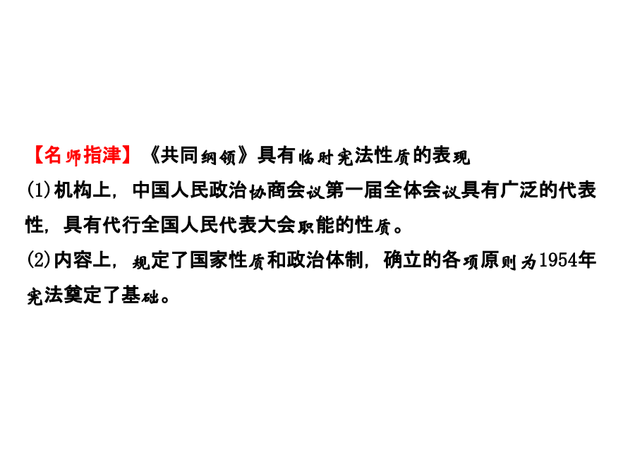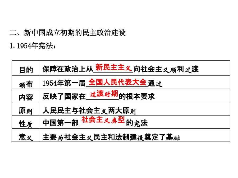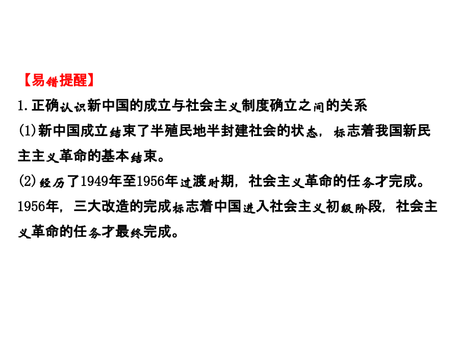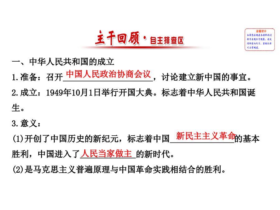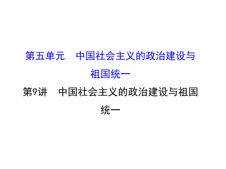第五单元中国社会主义的政治建设与祖国统一 第9讲中国社会主义的政治建设与祖国统一一、中华人民共和国的成立 1.准备:召开_____________________,讨论建立新中国的事宜。 2.成立:1949年10月1日举行开国大典。标志着中华人民共和国诞 生。 3.意义: (1)开创了中国历史的新纪元,标志着中国_______________的基本 胜利,中国进入了_____________的新时代。 (2)是马克思主义普遍原理与中国革命实践相结合的胜利。【名师指津】《共同纲领》具有临时宪法性质的表现 (1)机构上,中国人民政治协商会议第一届全体会议具有广泛的代表性,具有代行全国人民代表大会职能的性质。 (2)内容上,规定了国家性质和政治体制,确立的各项原则为1954年宪法奠定了基础。【易错提醒】 1.正确认识新中国的成立与社会主义制度确立之间的关系 (1)新中国成立结束了半殖民地半封建社会的状态,标志着我国新民主主义革命的基本结束。 (2)经历了1949年至1956年过渡时期,社会主义革命的任务才完成。1956年,三大改造的完成标志着中国进入社会主义初级阶段,社会主义革命的任务才最终完成。二、新中国成立初期的民主政治建设 1.1954年宪法:2.人民代表大会制度:【易错提醒】 2.正确区分人民代表大会与全国人民代表大会的关系 人民代表大会是我国的权力机关,但不能说是最高国家权力机关。因为人民代表大会包含全国人民代表大会和地方各级人民代表大会,全国人民代表大会才是我国的最高国家权力机关。3.中国共产党领导的多党合作和政治协商制度:4.民族区域自治制度: (1)含义:在国家的统一领导下,实现全国各民族一律_____和各民族 大团结,在一些_____________的地方实行区域自治,设立自治机 构,行使_______。 (2)依据:1949年的《中国人民政治协商会议共同纲领》和_______ _____先后作出了明确规定。 (3)实施。 ①形成内蒙古、新疆、广西、宁夏、西藏五大省级自治区。 ②建立自治州、县,民族自治区建设已初具规模。(4)意义:少数民族实现了_________,加强了民族团结,促进了国家的全面发展。【易错提醒】 3.民族区域自治制度并不是让各少数民族实现“民族自治” 民族区域自治不是“民族自治”,而是民族因素与区域因素的结合。民族区域自治制度下的自治是少数民族聚居区的各民族共同行使自治权利,而不是某一少数民族的自治。三、“文化大革命” 1.原因:党的主要领导人犯了严重的“左”倾错误,被林彪、江青反革命集团利用。 2.对民主法制的破坏: (1)在全国性无政府状态下,人民生命财产得不到保障。【名师指津】“文化大革命”的教训 完善社会主义民主与法制,坚持依法治国,进一步推进政治体制改革,而不单是防止教条主义和个人崇拜。(2)一元化权力机关——___________成立。林彪、江青一伙煽动“打倒旧政府”“砸烂公检法”,社会秩序极端混乱。 (3)人民代表大会制度、多党合作和政治协商制度遭到了破坏。 (4)_________________彻底瘫痪。国家的法律形同虚设,人权被严重践踏。 (5)党的规章制度被践踏,党内政治生活无法正常进行。 3.后果:使我国的民主政治建设严重倒退。四、改革开放以来民主与法制的建设【易错提醒】正确区分“法制”与“法治”的含义 法制并列于政治制度、经济制度,法治则相对于人治;法制内涵是指法律及相关制度,法治内涵则相对于人治的治国理论、原则和方法。【图示记忆】民主政治建设的曲折五、“一国两制”的理论与实践【易错提醒】正确区别港澳和台湾问题 台湾问题是内战遗留的问题,属于内政,而港澳问题是殖民主义遗留的问题,涉及国家领土和主权问题,属于外交范畴。【名师指津】“一国两制”下特别行政区的地位 (1)特别行政区享有高度自治权,但并不是完全自治。(2)特别行政区有一定的外事权,但不能行使国家的主权,在国际上代表中国的只能是中华人民共和国及其中央人民政府。六、海峡两岸关系的新发展 1.背景: (1)随着“文化大革命”的结束,祖国大陆实行_________政策。 (2)台湾问题的解决,将大大加快中国现代化的进程。 2.表现: (1)和平统一方针:1979年元旦,全国人大常委会发表《_________ _____》,宣布了_________祖国的方针,并停止炮击金门,实现两 岸30年来真正停火。(2)民间交流。 ①20世纪80年代以来,海峡两岸_________________限制放宽,两岸民间交流增加。2008年,两岸实现直接“三通”。 ②1992年,在“海峡两岸均坚持_________原则”上达成共识。【图示记忆】祖国统一大业的图示【名师指津】 1.“一国两制”成功实践的意义 (1)大发展:丰富发展了马克思主