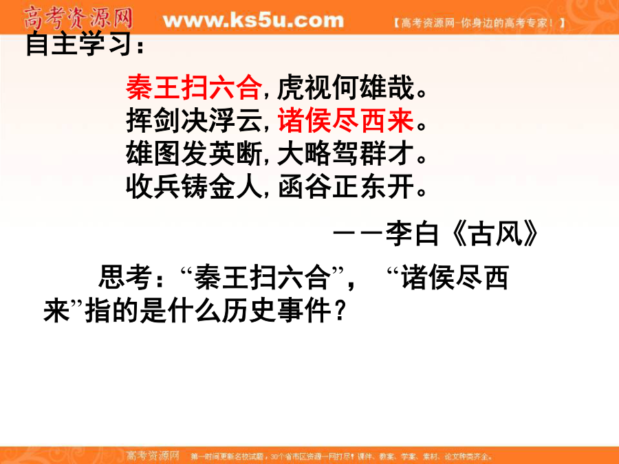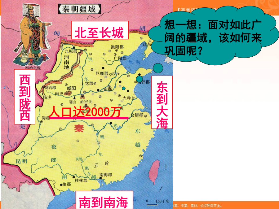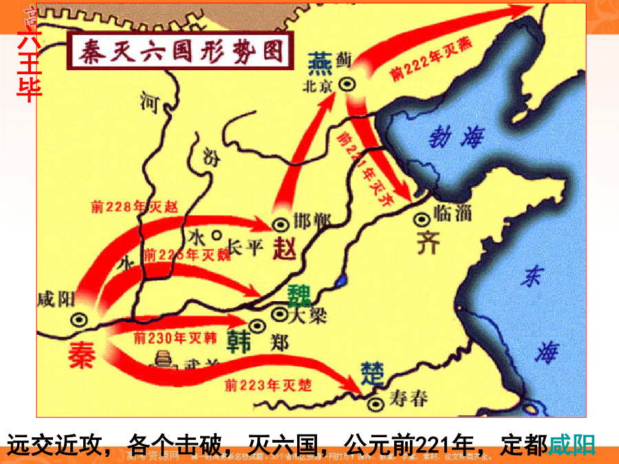 二走向“大一统”的秦汉政治远交近攻,各个击破,灭六国,公元前221年,定都咸阳思考:“秦王扫六合”,“诸侯尽西来”指的是什么历史事件?四海一——实现统一东到大海二、海内为郡县议分封制与郡县制的不同点三、百官公卿小结秦行政机构示意图再见始皇帝的由来秦王嬴政,即秦始皇,公元前二四六年至公元前二一○年在位。他是我国历史上杰出的地主阶级政治家。辽东秦朝古长城湘水今日灵渠风光