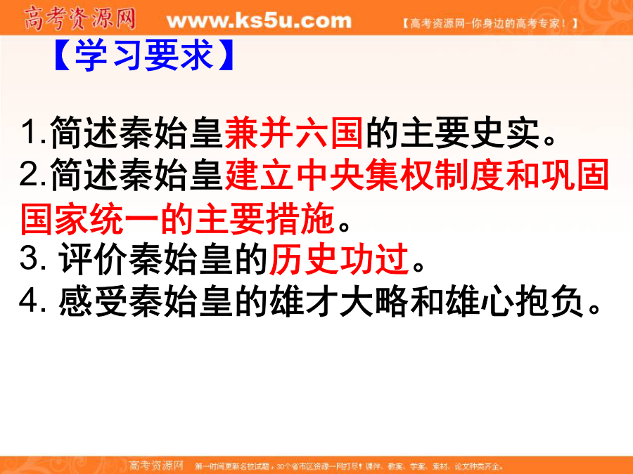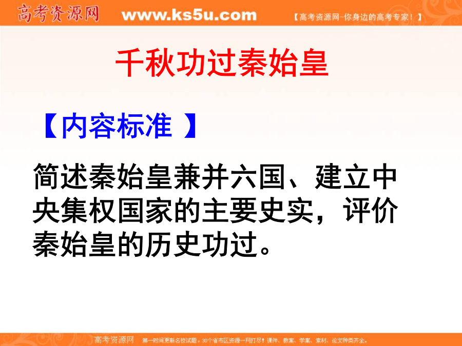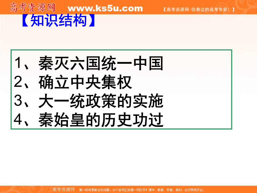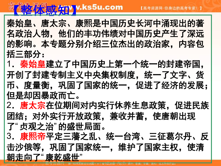 复习专题一古代中国的政治家【整体感知】千秋功过秦始皇【学习要求】【知识结构】【基础知识回顾】2、过程:二、确立中央集权3、影响三、大一统政策的实施【重难点突破】【史论共享】2、过失【典型例题】(2)“惩戒亡秦孤立之败”是什么意思?从现在看来这种说法有什么问题?课堂检测1、据一本书中提到,公元前213年,咸阳有一位商人坐马车来到象郡,用他携带的200枚秦半两钱买了三个象牙、10本《庄子》以及109斤水稻,根据所学知识判断,这一记载() A、属实B、不可能是事实 C、不能判断D、有可能是事实2、柳宗元在《封建论》中说:“秦有天下,裂都会而为之郡邑,废侯卫而为之守宰。……此其所以为得也。”这句话指的是() A、推行分封制B、设立郡县制 C、废除郡县制D、废除行省制3、“六合之内,皇帝之土;乃今皇帝,一家天下,”这份纪功石刻说的是() A、周天子分封天下B、秦始皇统一六国C、汉武帝开拓疆土D、忽必烈一定乾元 4、周武王主张实行分封制,而秦始皇反对实行分封制。根据他们各自所处的历史环境,最恰当的评价是() A、都是片面的B、都是相对进步的 C、都阻碍了历史进步D、有利于封建统治