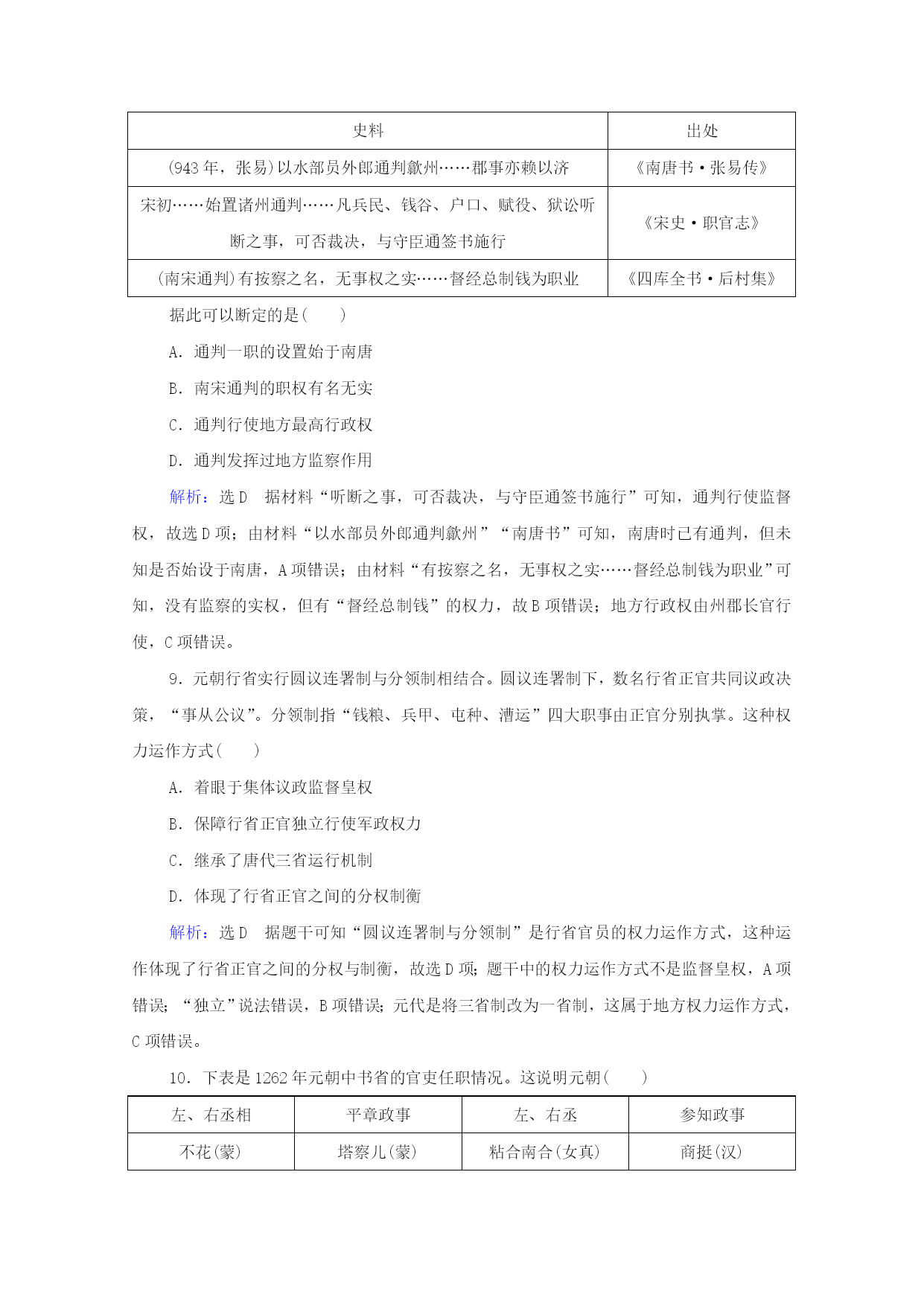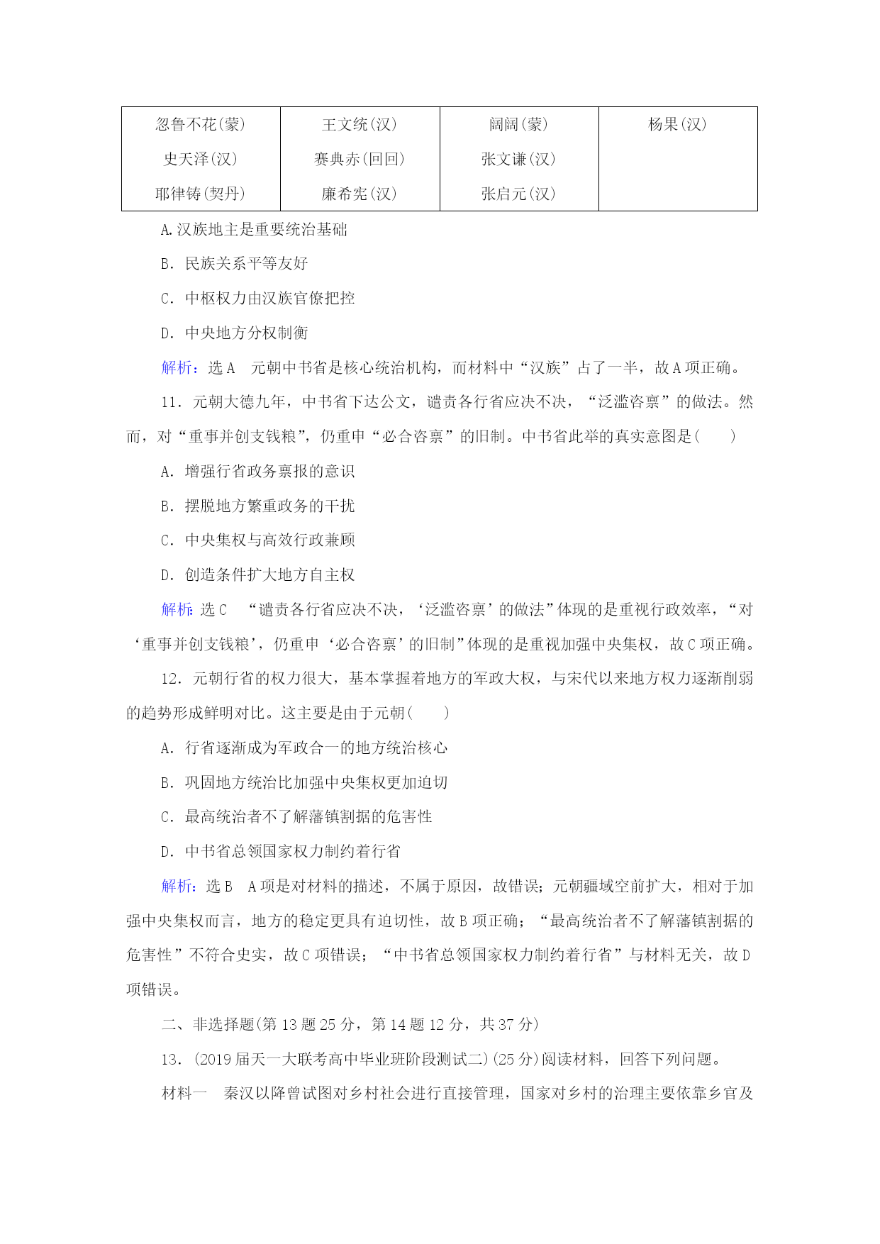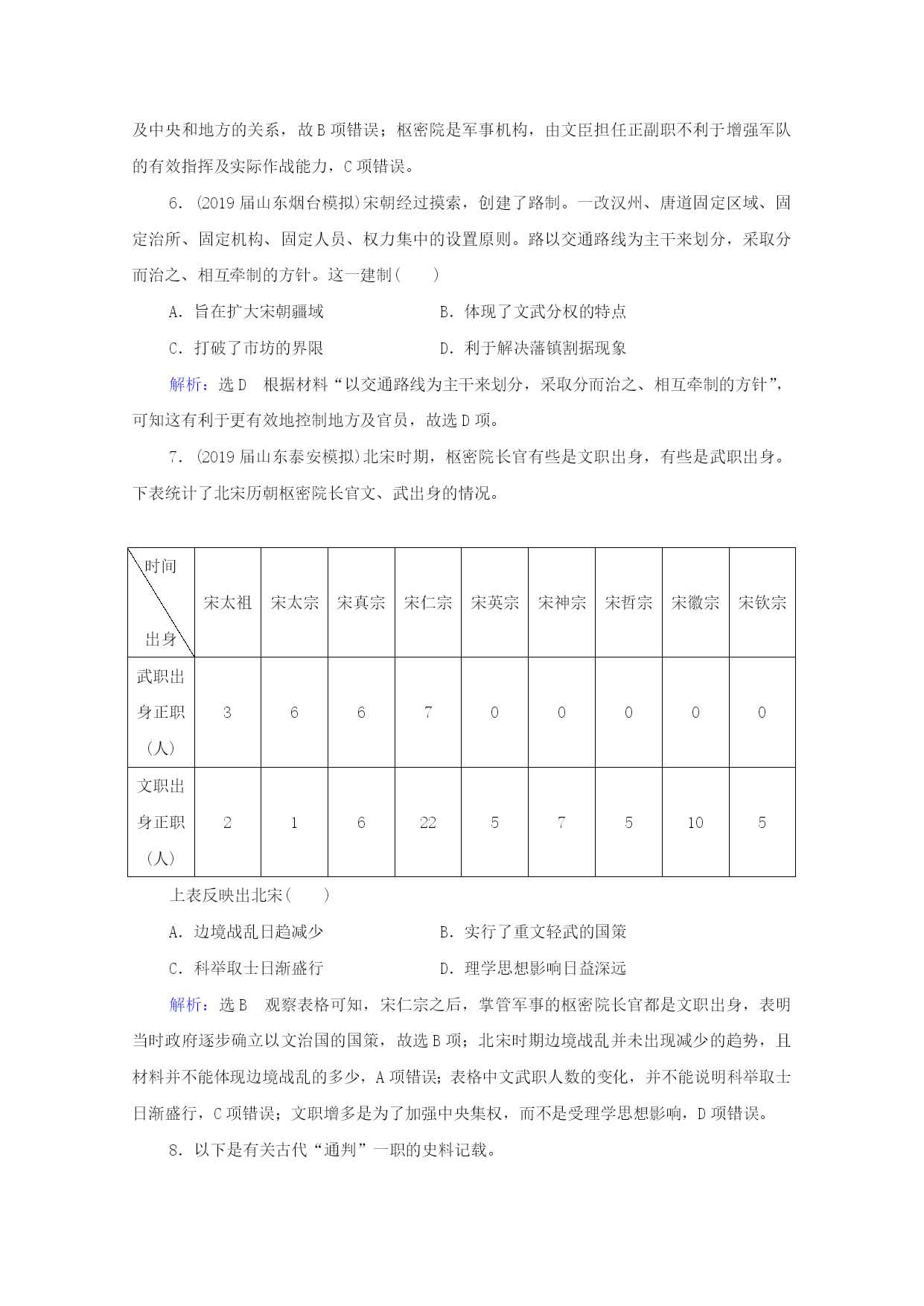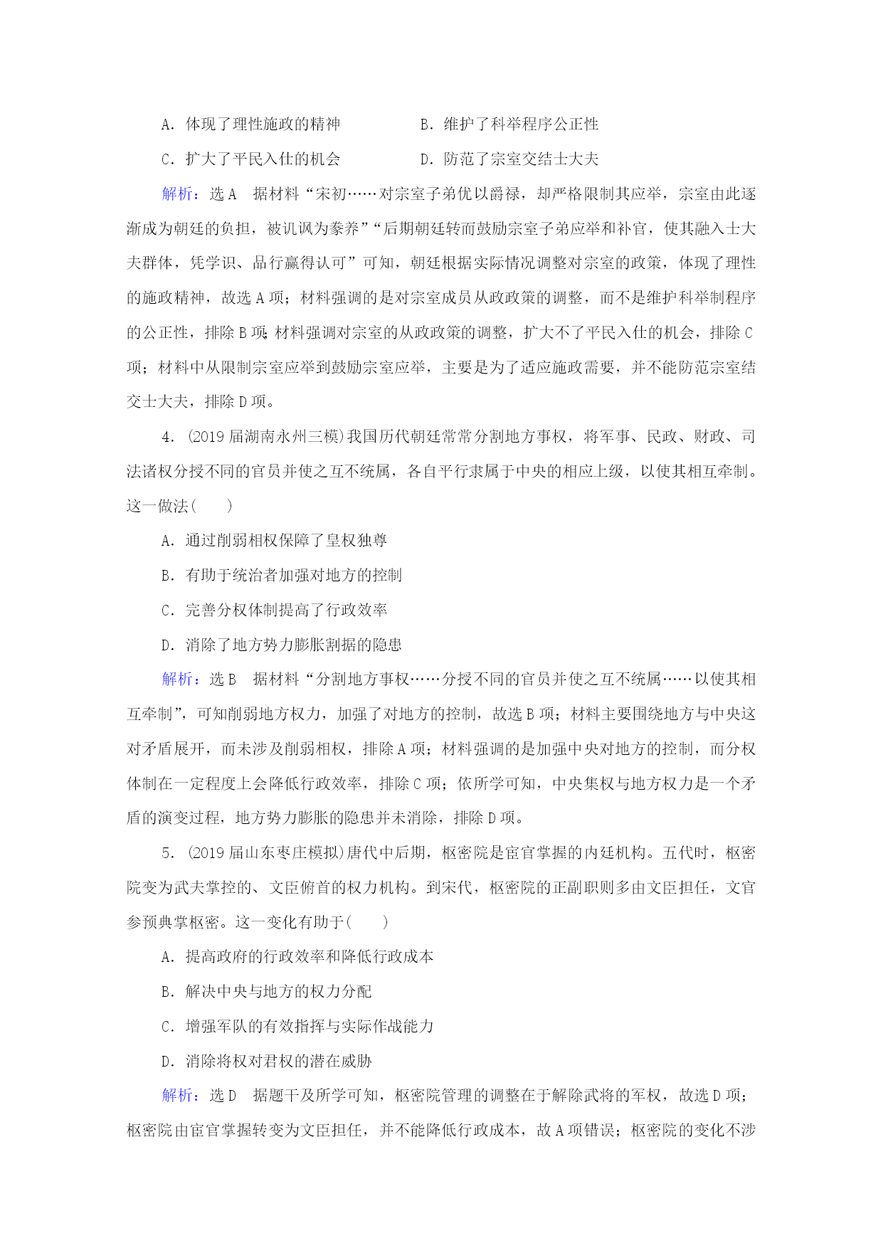 模块一第四单元第8讲宋元时期的政治 一、选择题(每小题4分,共48分) 1.(2019届湖南衡阳三模)北宋的御史台和谏院合称“台谏”,是中央最主要的监察机构。台谏官称为“言官”,可直接参与决策、批评政事,既牵制宰相、又约束皇帝。宋太祖曾规定,“与士大夫共治天下”,“不杀士大夫和上书言事者”。宋朝的这一传统() A.保证了宋王朝长治久安 B.助推了士人的参政热情 C.完善了古代的监察制度 D.有效地制约了君主权力 解析:选B材料分两层信息,第一层是宋朝台谏官“可直接参与决策、批评政事,既牵制宰相、又约束皇帝”,说明宋朝台谏官权力大,第二层中宋太祖的规定“与士大夫共治天下”“不杀士大夫和上书言事者”,说明宋朝文人地位大大提高,综合两层信息可知宋朝文官位高权重,这便大大助推了士人的参政热情,故选B项;宋朝重文传统只会有助于政治清明,起不到保证宋王朝长治久安的作用,排除A项;材料中宋朝台谏官的权力设置延续了前代制度,因而宋朝这一传统并非是对古代监察制度的完善,排除C项;宋朝台谏官能在一定程度上限制君主权力,但起不到有效制约的作用,排除D项。 2.(2019届河北石家庄二模)宋代“职”“官”分离,另有“差遣”负责具体事务。朝廷通过授予“职”来体现文官的特殊地位,其多为进士出身,如太宗时期入龙图阁者,“一经此职,遂为名流”。据此可知,宋代() A.国家机关行政效率提高 B.中枢权力机构不断完善 C.科举制度功能得以加强 D.官僚政治取代贵族政治 解析:选C通过题干可知,在宋代,文官被朝廷授予“职”来显示其特殊地位,而文官大多为进士出身,说明通过科举考试来取得“职”的功能增强了,故选C项;宋代“‘职’‘官’分离,另有‘差遣’负责具体事务”,可知其行政效率有所降低,排除A项;题干提及了宋代的“‘职'‘官’分离,另有‘差遣’负责具体事务”,并没有详细地介绍其中枢机构的变化情况,排除B项;通过所学知识可知,在秦朝就已经完成了“官僚政治取代贵族政治”的转变,排除D项。 3.(2019届广东二模)宋初,朝廷重用士大夫,对宗室子弟优以爵禄,却严格限制其应举,宗室由此逐渐成为朝廷的负担,被讥讽为豢养。后期朝廷转而鼓励宗室子弟应举和补官,使其融入士大夫群体,凭学识、品行赢得认可。宋朝这些措施() A.体现了理性施政的精神 B.维护了科举程序公正性 C.扩大了平民入仕的机会 D.防范了宗室交结士大夫 解析:选A据材料“宋初……对宗室子弟优以爵禄,却严格限制其应举,宗室由此逐渐成为朝廷的负担,被讥讽为豢养”“后期朝廷转而鼓励宗室子弟应举和补官,使其融入士大夫群体,凭学识、品行赢得认可”可知,朝廷根据实际情况调整对宗室的政策,体现了理性的施政精神,故选A项;材料强调的是对宗室成员从政政策的调整,而不是维护科举制程序的公正性,排除B项;材料强调对宗室的从政政策的调整,扩大不了平民入仕的机会,排除C项;材料中从限制宗室应举到鼓励宗室应举,主要是为了适应施政需要,并不能防范宗室结交士大夫,排除D项。 4.(2019届湖南永州三模)我国历代朝廷常常分割地方事权,将军事、民政、财政、司法诸权分授不同的官员并使之互不统属,各自平行隶属于中央的相应上级,以使其相互牵制。这一做法() A.通过削弱相权保障了皇权独尊 B.有助于统治者加强对地方的控制 C.完善分权体制提高了行政效率 D.消除了地方势力膨胀割据的隐患 解析:选B据材料“分割地方事权……分授不同的官员并使之互不统属……以使其相互牵制”,可知削弱地方权力,加强了对地方的控制,故选B项;材料主要围绕地方与中央这对矛盾展开,而未涉及削弱相权,排除A项;材料强调的是加强中央对地方的控制,而分权体制在一定程度上会降低行政效率,排除C项;依所学可知,中央集权与地方权力是一个矛盾的演变过程,地方势力膨胀的隐患并未消除,排除D项。 5.(2019届山东枣庄模拟)唐代中后期,枢密院是宦官掌握的内廷机构。五代时,枢密院变为武夫掌控的、文臣俯首的权力机构。到宋代,枢密院的正副职则多由文臣担任,文官参预典掌枢密。这一变化有助于() A.提高政府的行政效率和降低行政成本 B.解决中央与地方的权力分配 C.增强军队的有效指挥与实际作战能力 D.消除将权对君权的潜在威胁 解析:选D据题干及所学可知,枢密院管理的调整在于解除武将的军权,故选D项;枢密院由宦官掌握转变为文臣担任,并不能降低行政成本,故A项错误;枢密院的变化不涉及中央和地方的关系,故B项错误;枢密院是军事机构,由文臣担任正副职不利于增强军队的有效指挥及实际作战能力,C项错误。 6.(2019届山东烟台模拟)宋朝经过摸索,创建了路制。一改汉州、唐道固定区域、固定治所、固定机构、固定人员、权力集中的设置原则。路以交通路线为主干来划分,采取分而治之、相互牵制的方针。这一建制() A.旨在扩