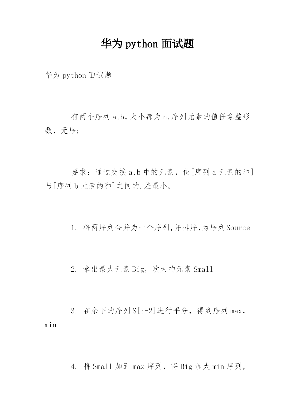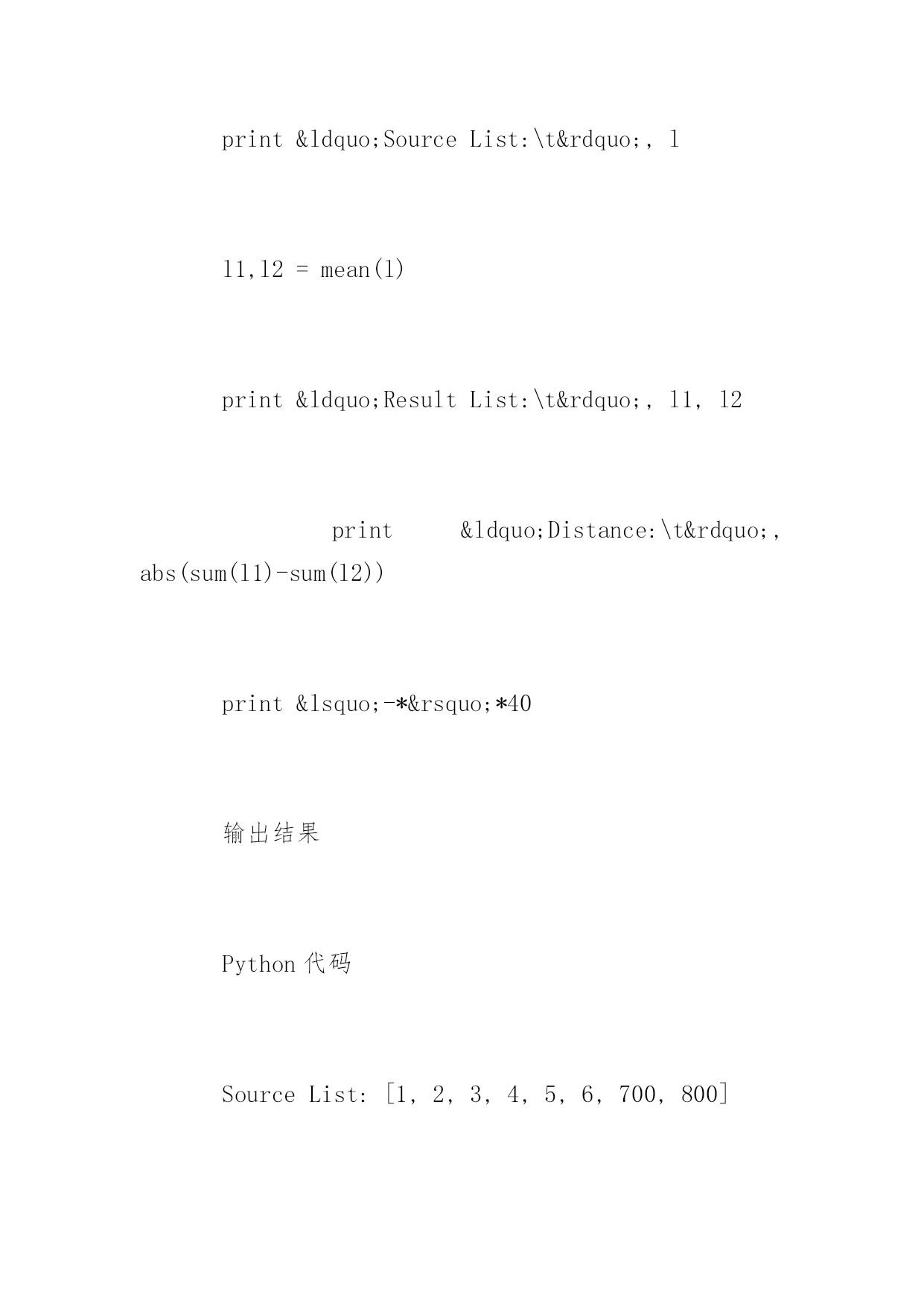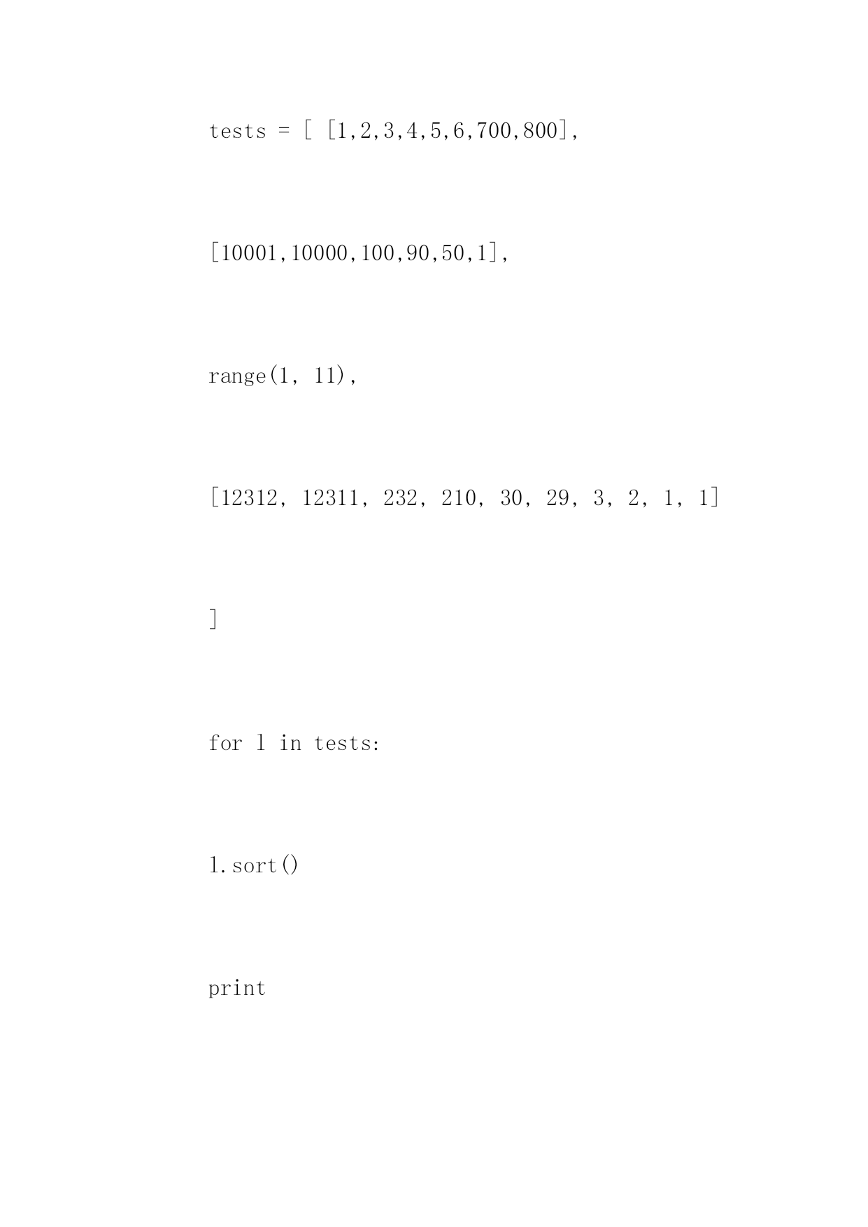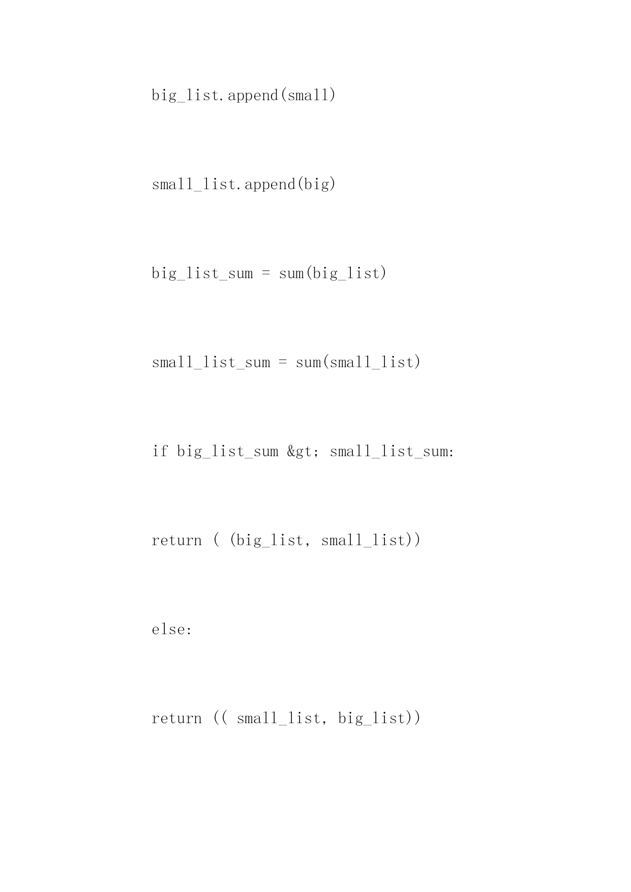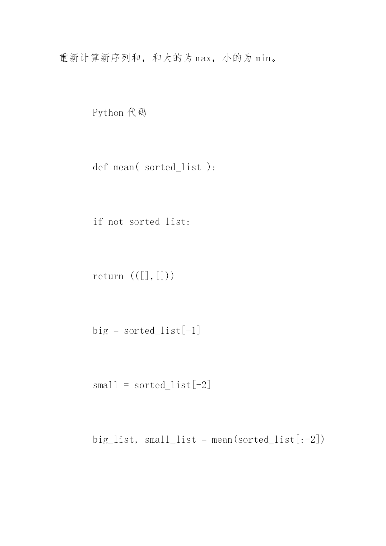 华为python面试题 华为python面试题 有两个序列a,b,大小都为n,序列元素的值任意整形数,无序; 要求:通过交换a,b中的元素,使[序列a元素的和]与[序列b元素的和]之间的.差最小。 1.将两序列合并为一个序列,并排序,为序列Source 2.拿出最大元素Big,次大的元素Small 3.在余下的序列S[:-2]进行平分,得到序列max,min 4.将Small加到max序列,将Big加大min序列,重新计算新序列和,和大的为max,小的为min。 Python代码 defmean(sorted_list): ifnotsorted_list: return(([],[])) big=sorted_list[-1] small=sorted_list[-2] big_list,small_list=mean(sorted_list[:-2]) big_list.append(small) small_list.append(big) big_list_sum=sum(big_list) small_list_sum=sum(small_list) ifbig_list_sum>small_list_sum: return((big_list,small_list)) else: return((small_list,big_list)) tests=[[1,2,3,4,5,6,700,800], [10001,10000,100,90,50,1], range(1,11), [12312,12311,232,210,30,29,3,2,1,1] ] forlintests: l.sort() print print“SourceList:\t”,l l1,l2=mean(l) print“ResultList:\t”,l1,l2 print“Distance:\t”,abs(sum(l1)-sum(l2)) print‘-*’*40 输出结果 Python代码 SourceList:[1,2,3,4,5,6,700,800] ResultList:[1,4,5,800][2,3,6,700] Distance:99 -*-*-*-*-*-*-*-*-*-*-*-*-*-*-*-*-*-*-*-*-*-*-*-*-*-*-*-*-*-*-*-*-*-*-*-*-*-*-*-* SourceList:[1,50,90,100,10000,10001] ResultList:[50,90,10000][1,100,10001] Distance:38 -*-*-*-*-*-*-*-*-*-*-*-*-*-*-*-*-*-*-*-*-*-*-*-*-*-*-*-*-*-*-*-*-*-*-*-*-*-*-*-* SourceList:[1,2,3,4,5,6,7,8,9,10] ResultList:[2,3,6,7,10][1,4,5,8,9] Distance:1 -*-*-*-*-*-*-*-*-*-*-*-*-*-*-*-*-*-*-*-*-*-*-*-*-*-*-*-*-*-*-*-*-*-*-*-*-*-*-*-* SourceList:[1,1,2,3,29,30,210,232,12311,12312] ResultList:[1,3,29,232,12311][1,2,30,210,12312] Distance:21