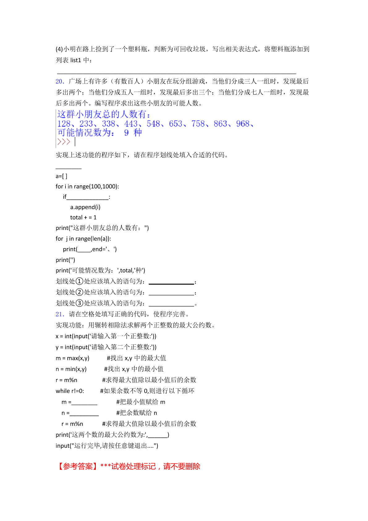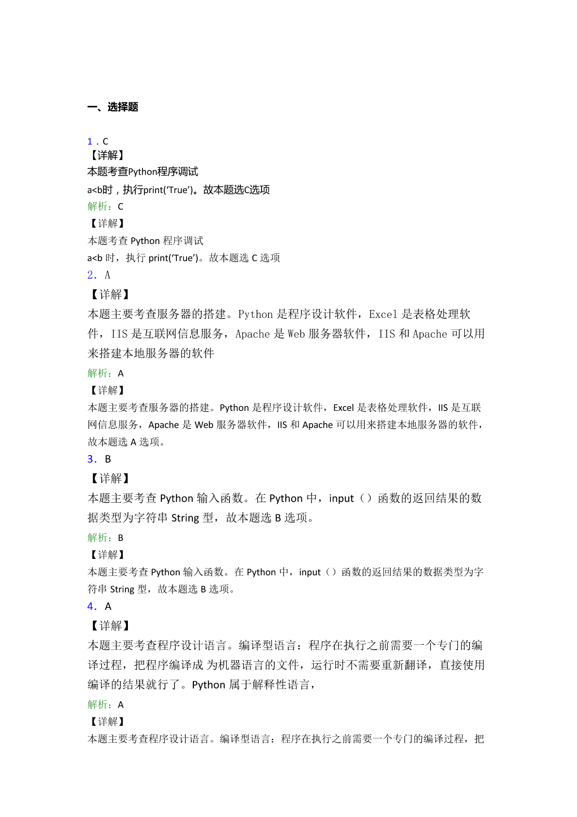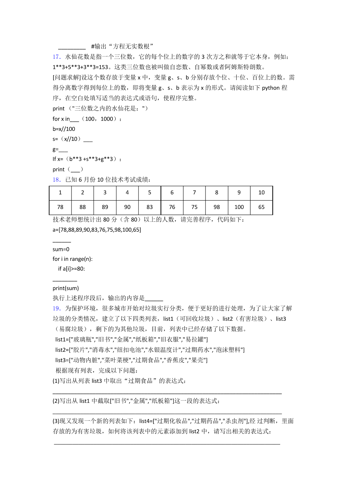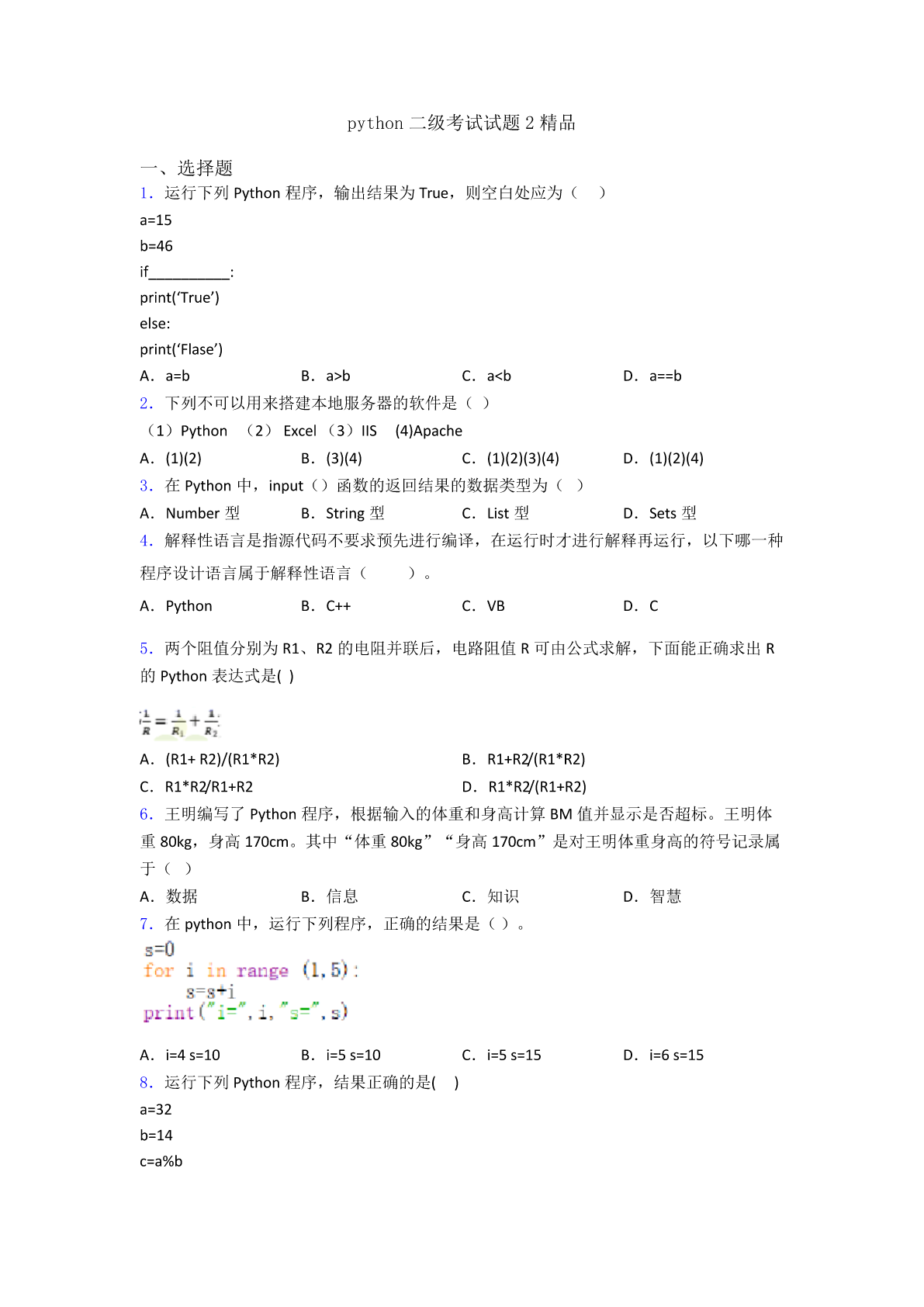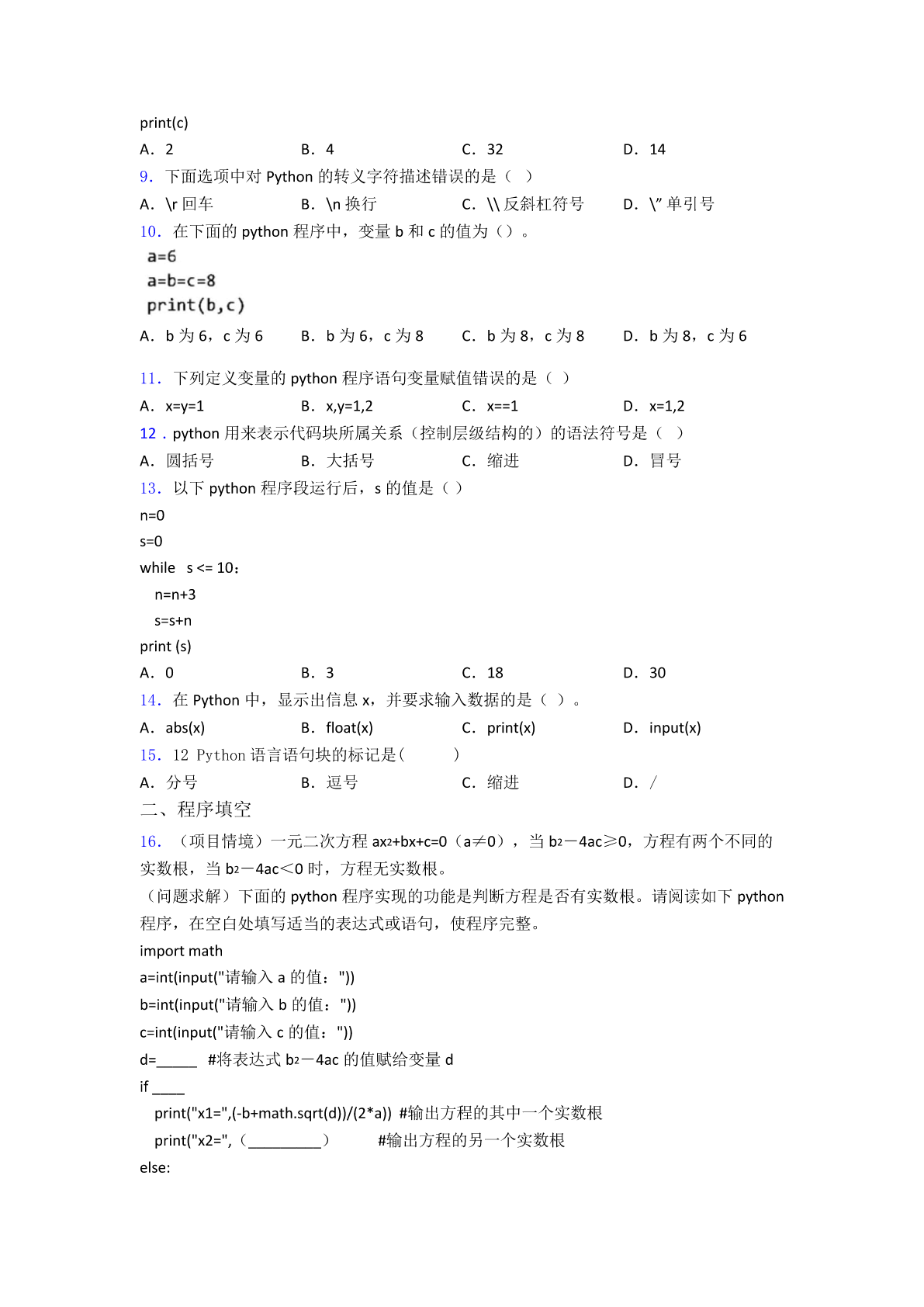 python二级考试试题2精品 一、选择题 1.运行下列Python程序,输出结果为True,则空白处应为() a=15 b=46 if__________: print(‘True’) else: print(‘Flase’) A.a=bB.a>bC.a<bD.a==b 2.下列不可以用来搭建本地服务器的软件是() (1)Python(2)Excel(3)IIS(4)Apache A.(1)(2)B.(3)(4)C.(1)(2)(3)(4)D.(1)(2)(4) 3.在Python中,input()函数的返回结果的数据类型为() A.Number型B.String型C.List型D.Sets型 4.解释性语言是指源代码不要求预先进行编译,在运行时才进行解释再运行,以下哪一种 程序设计语言属于解释性语言()。 A.PythonB.C++C.VBD.C 5.两个阻值分别为R1、R2的电阻并联后,电路阻值R可由公式求解,下面能正确求出R 的Python表达式是() A.(R1+R2)/(R1*R2)B.R1+R2/(R1*R2) C.R1*R2/R1+R2D.R1*R2/(R1+R2) 6.王明编写了Python程序,根据输入的体重和身高计算BM值并显示是否超标。王明体 重80kg,身高170cm。其中“体重80kg”“身高170cm”是对王明体重身高的符号记录属 于() A.数据B.信息C.知识D.智慧 7.在python中,运行下列程序,正确的结果是()。 A.i=4s=10B.i=5s=10C.i=5s=15D.i=6s=15 8.运行下列Python程序,结果正确的是() a=32 b=14 c=a%b print(c) A.2B.4C.32D.14 9.下面选项中对Python的转义字符描述错误的是() A.\r回车B.\n换行C.\\反斜杠符号D.\”单引号 10.在下面的python程序中,变量b和c的值为()。 A.b为6,c为6B.b为6,c为8C.b为8,c为8D.b为8,c为6 11.下列定义变量的python程序语句变量赋值错误的是() A.x=y=1B.x,y=1,2C.x==1D.x=1,2 12.python用来表示代码块所属关系(控制层级结构的)的语法符号是() A.圆括号B.大括号C.缩进D.冒号 13.以下python程序段运行后,s的值是() n=0 s=0 whiles<=10: n=n+3 s=s+n print(s) A.0B.3C.18D.30 14.在Python中,显示出信息x,并要求输入数据的是()。 A.abs(x)B.float(x)C.print(x)D.input(x) 15.12Python语言语句块的标记是() A.分号B.逗号C.缩进D./ 二、程序填空 16.(项目情境)一元二次方程ax2+bx+c=0(a≠0),当b2-4ac≥0,方程有两个不同的 实数根,当b2-4ac<0时,方程无实数根。 (问题求解)下面的python程序实现的功能是判断方程是否有实数根。请阅读如下python 程序,在空白处填写适当的表达式或语句,使程序完整。 importmath a=int(input("请输入a的值:")) b=int(input("请输入b的值:")) c=int(input("请输入c的值:")) d=_____#将表达式b2-4ac的值赋给变量d if____ print("x1=",(-b+math.sqrt(d))/(2*a))#输出方程的其中一个实数根 print("x2=",(_________)#输出方程的另一个实数根 else: _________#输出“方程无实数根” 17.水仙花数是指一个三位数,它的每个位上的数字的3次方之和就等于它本身,例如: 1**3+5**3+3**3=153。这类三位数也被叫做自恋数、自幂数或者阿姆斯特朗数。 [问题求解]设这个数存放于变量x中,变量g、s、b分别存放个位、十位、百位上的数。需 得分离数字得到每位上的数,即将变量g、s、b表示为x的形式。请阅读如下python程 序,在空白处填写适当的表达式或语句,使程序完整。 print("三位数之内的水仙花是:") forxin___(100,1000): b=x//100 s=(x//10)___ g=___ Ifx=(b**3+s**3+g**3): print(___) 18.已知6月份10位技术考试成绩: 12345678910 788889908376759810065 技术老师想统计出80分(含80)以上的人数,请完善程序,代码如下: a=[78,88,89,90,83,76,75,98,100,65] ___
