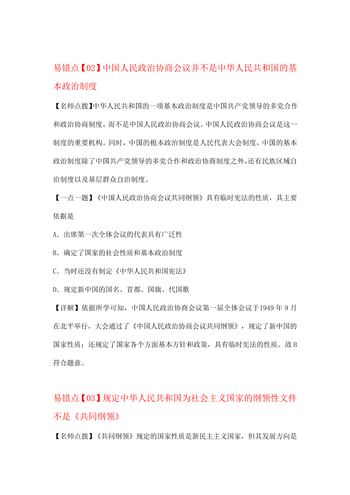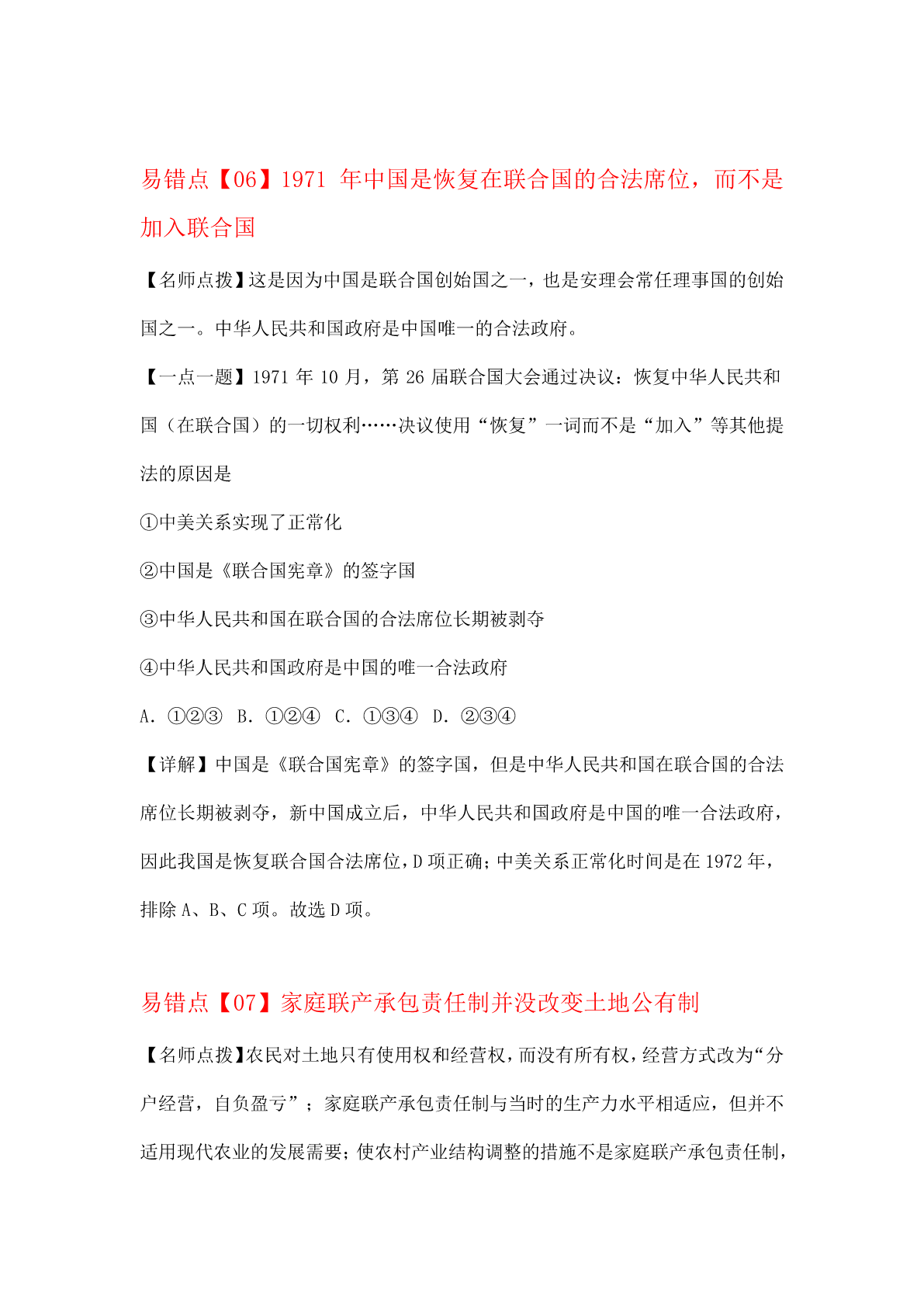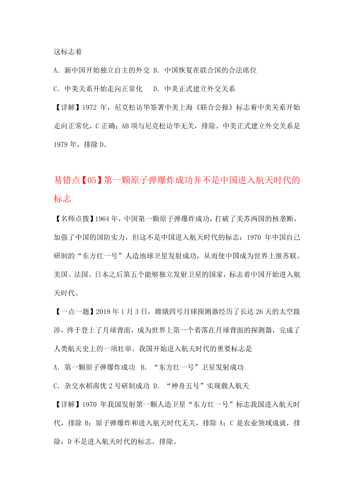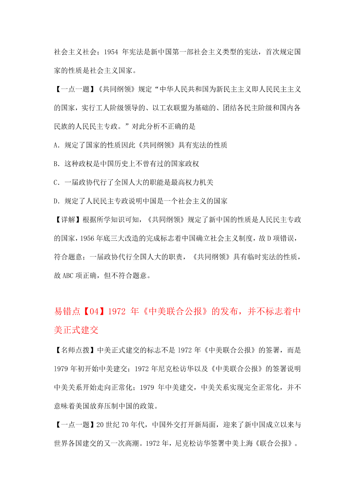 易错点08中华人民共和国成立 易错点【01】新中国的成立并不标志着社会主义制度的建立 【名师点拨】新中国的成立标志着我国新民主主义革命的基本结束,而不是社会 主义革命的结束。它是社会主义革命的开始。社会主义三大改造的完成标志着中 国进入社会主义初级阶段。 【一点一题】2022年是新中国成立73周年。下列关于新中国成立的历史意义叙 述正确的是 ①标志着崭新的人民共和国在世界的建立 ②标志着中国半殖民地半封建社会的结束 ③标志着中国新民主主义革命的基本结束 ④标志着社会主义制度在中国的基本确立 A.①③④B.①②④C.②③④D.①②③ 【详解】中华人民共和国成立开辟了中国历史的新纪元。从此,真正成为独立自 主的国家新中国的成立,壮大了世界和平、民主和社会主义的力量,故①符合题 意;新中国的成立,彻底结束了旧中国半殖民地半封建社会的历史,故②符合题 意;新中国的成立,标志着民族独立与人民解放的这个历史任务胜利完成,故③ 符合题意;1956年底三大改造基本完成,社会主义的基本经济制度在中国全面 地建立起来了,标志着社会主义制度在中国的基本确立,故④不符合题意。故选 ①②③组合,故排除ABC,D符合题意。故选D。 易错点【02】中国人民政治协商会议并不是中华人民共和国的基 本政治制度 【名师点拨】中华人民共和国的一项基本政治制度是中国共产党领导的多党合作 和政治协商制度,而不是中国人民政治协商会议。中国人民政治协商会议是这一 制度的重要机构。同时,中国的根本政治制度是人民代表大会制度,中国的基本 政治制度除了中国共产党领导的多党合作和政治协商制度之外,还有民族区域自 治制度以及基层群众自治制度。 【一点一题】《中国人民政治协商会议共同纲领》具有临时宪法的性质,其主要 依据是 A.出席第一次全体会议的代表具有广泛性 B.确定了国家的社会性质和基本政治制度 C.当时还没有制定《中华人民共和国宪法》 D.规定新中国的国名、首都、国旗、代国歌 【详解】依据所学可知,中国人民政治协商会议第一届全体会议于1949年9月 在北平举行,大会通过了《中国人民政治协商会议共同纲领》,规定了新中国的 国家性质;还规定了国家各个方面基本方针和政策,具有临时宪法的性质。故B 符合题意。 易错点【03】规定中华人民共和国为社会主义国家的纲领性文件 不是《共同纲领》 【名师点拨】《共同纲领》规定的国家性质是新民主主义国家,但其发展方向是 社会主义社会;1954年宪法是新中国第一部社会主义类型的宪法,首次规定国 家的性质是社会主义国家。 【一点一题】《共同纲领》规定“中华人民共和国为新民主主义即人民民主主义 的国家,实行工人阶级领导的、以工农联盟为基础的、团结各民主阶级和国内各 民族的人民民主专政。”对此分析不正确的是 A.规定了国家的性质因此《共同纲领》具有宪法的性质 B.这种政权是中国历史上不曾有过的国家政权 C.一届政协代行了全国人大的职能是最高权力机关 D.规定了人民民主专政说明中国是一个社会主义的国家 【详解】根据所学知识可知,《共同纲领》规定了新中国的性质是人民民主专政 的国家,1956年底三大改造的完成标志着中国确立社会主义制度,故D项错误, 符合题意;一届政协代行全国人大的职责,《共同纲领》具有临时宪法的性质, 故ABC项正确,但不符合题意。 易错点【04】1972年《中美联合公报》的发布,并不标志着中 美正式建交 【名师点拨】中美正式建交的标志不是l972年《中美联合公报》的签署,而是 l979年初开始中美建交;1972年尼克松访华以及《中美联合公报》的签署说明 中美关系开始走向正常化;1979年中美建交,中美关系实现完全正常化,并不 意味着美国放弃压制中国的政策。 【一点一题】20世纪70年代,中国外交打开新局面,迎来了新中国成立以来与 世界各国建交的又一次高潮。1972年,尼克松访华签署中美上海《联合公报》。 这标志着 A.新中国开始独立自主的外交B.中国恢复在联合国的合法席位 C.中美关系开始走向正常化D.中美正式建立外交关系 【详解】1972年,尼克松访华签署中美上海《联合公报》标志着中美关系开始 走向正常化,C正确;AB项与尼克松访华无关,排除。中美正式建立外交关系是 1979年,排除D。 易错点【05】第一颗原子弹爆炸成功并不是中国进入航天时代的 标志 【名师点拨】1964年,中国第一颗原子弹爆炸成功,打破了美苏两国的核垄断, 加强了中国的国防实力,但这不是中国进入航天时代的标志;1970年中国自己 研制的“东方红一号”人造地球卫星发射成功,从而使中国成为世界上继苏联、 美