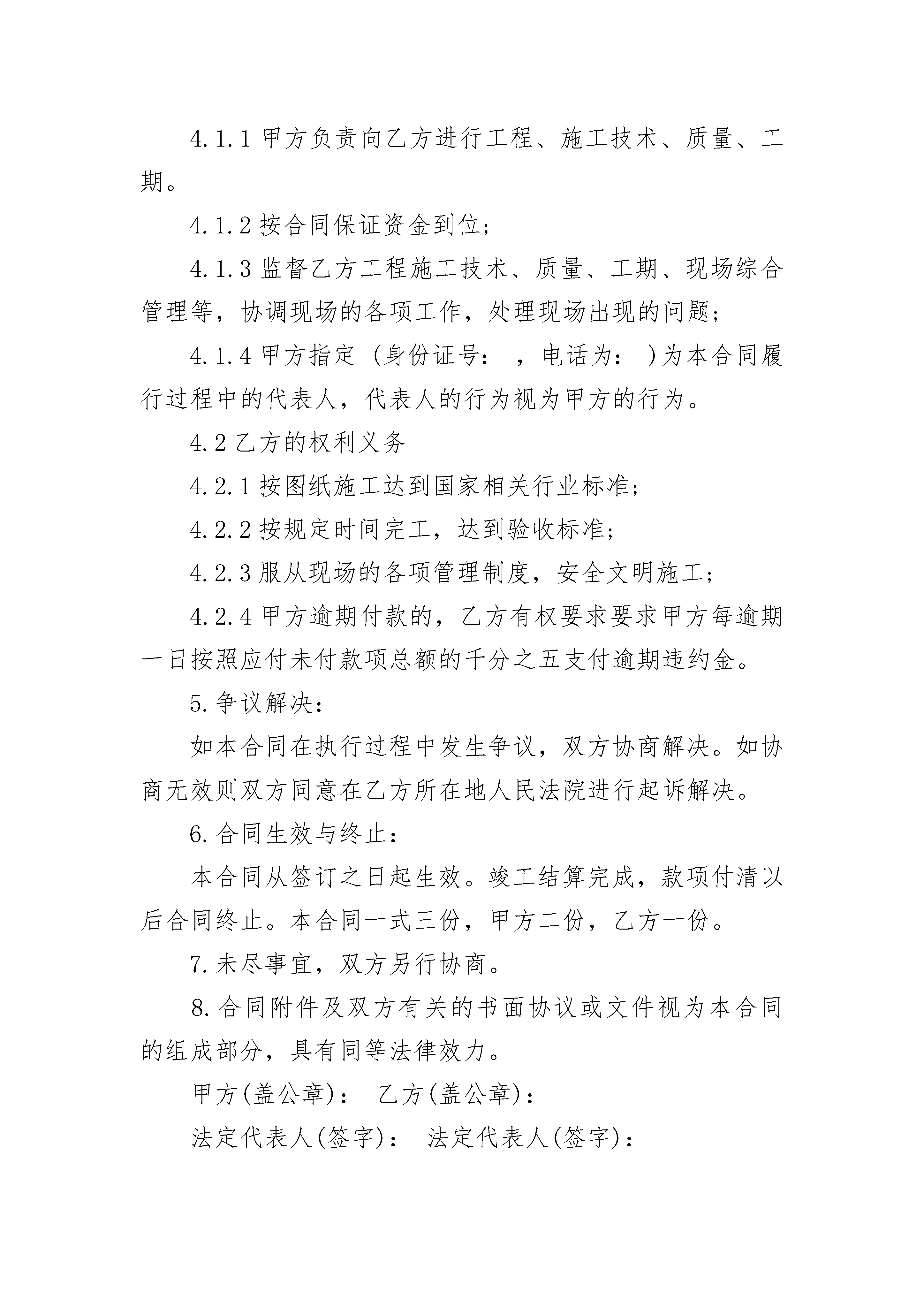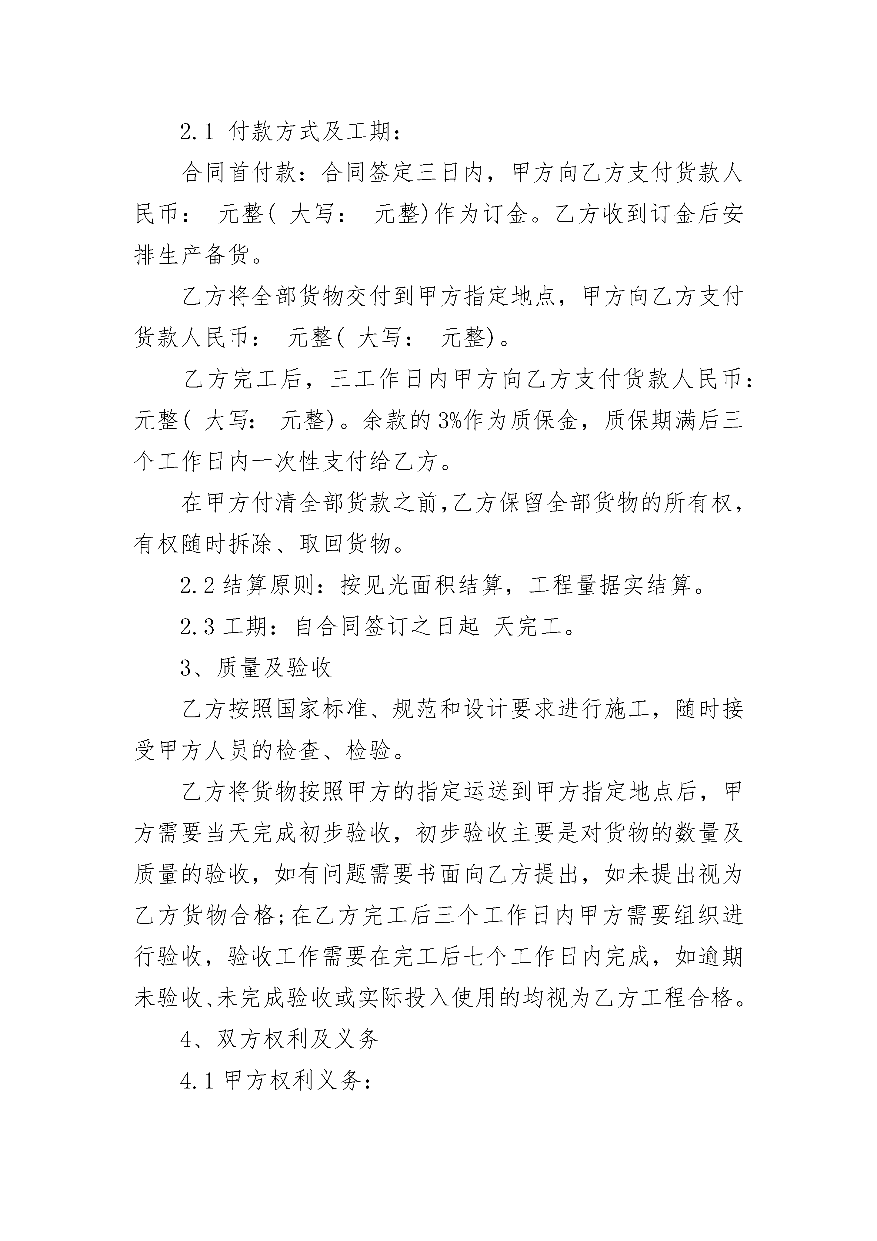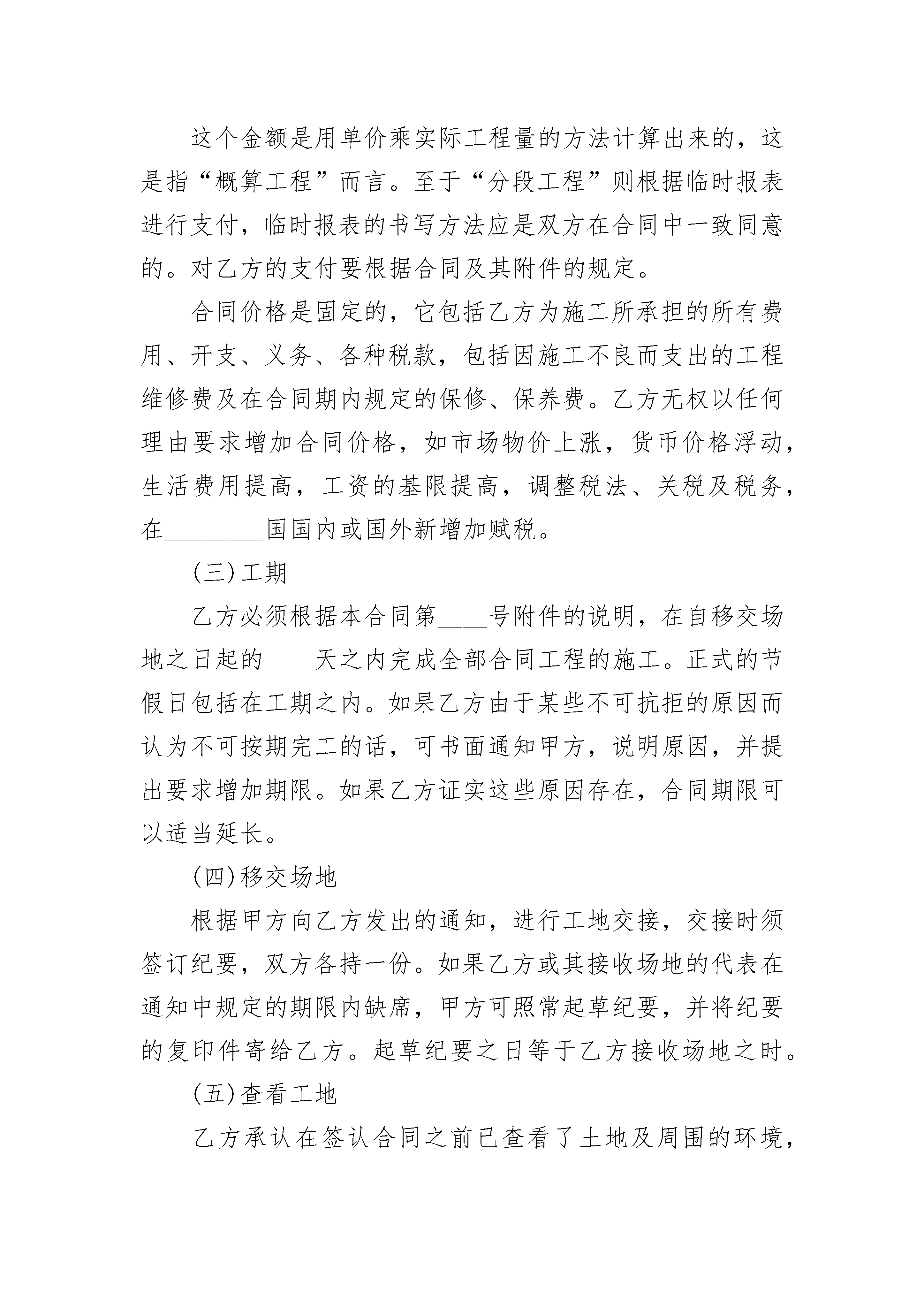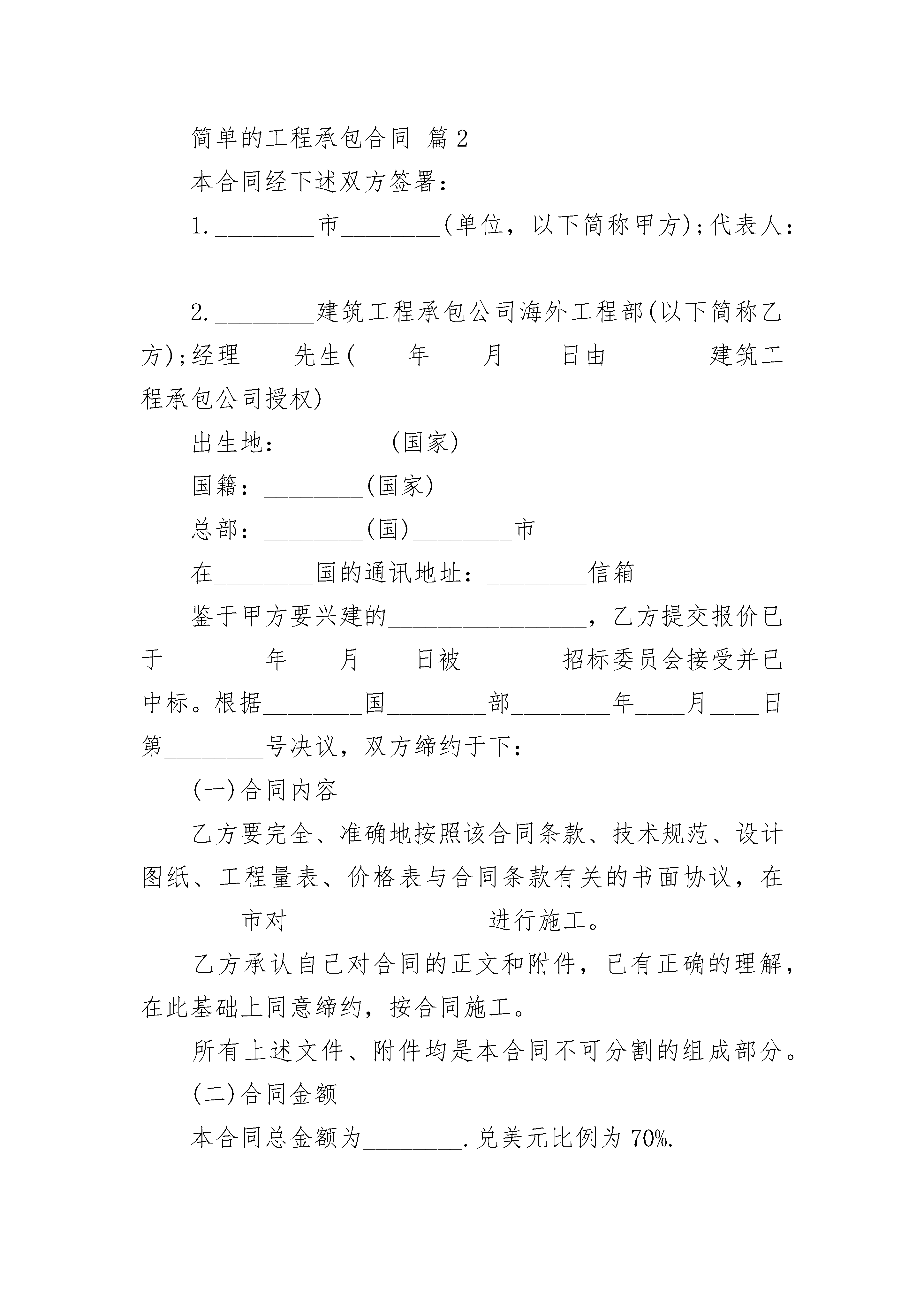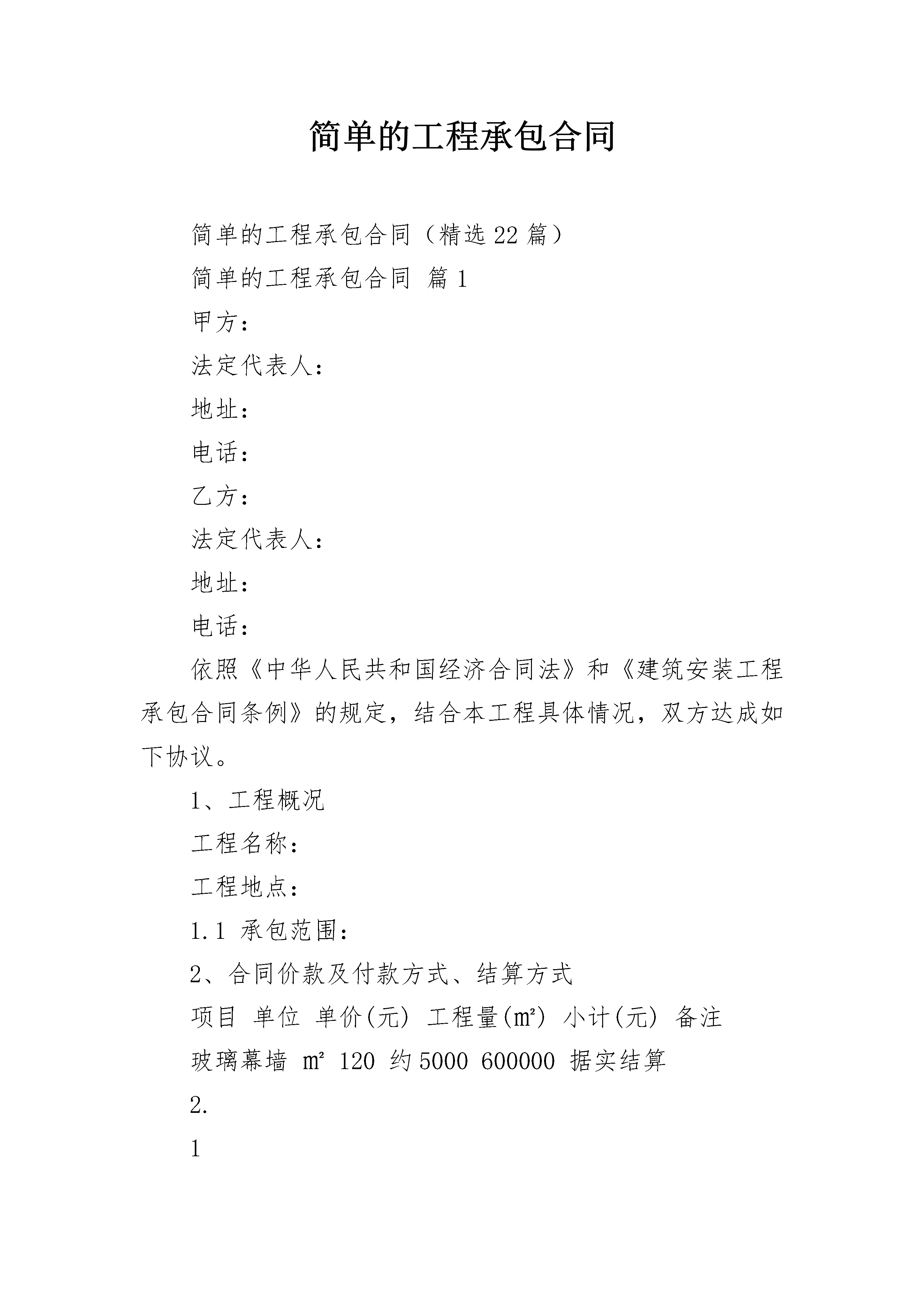简单的工程承包合同简单的工程承包合同(精选22篇)简单的工程承包合同篇1甲方:法定代表人:地址:电话:乙方:法定代表人:地址:电话:依照《中华人民共和国经济合同法》和《建筑安装工程承包合同条例》的规定,结合本工程具体情况,双方达成如下协议。1、工程概况工程名称:工程地点:1.1承包范围:2、合同价款及付款方式、结算方式项目单位单价(元)工程量(㎡)小计(元)备注玻璃幕墙㎡120约5000600000据实结算2.12.1付款方式及工期:合同首付款:合同签定三日内,甲方向乙方支付货款人民币:元整(大写:元整)作为订金。乙方收到订金后安排生产备货。乙方将全部货物交付到甲方指定地点,甲方向乙方支付货款人民币:元整(大写:元整)。乙方完工后,三工作日内甲方向乙方支付货款人民币:元整(大写:元整)。余款的3%作为质保金,质保期满后三个工作日内一次性支付给乙方。在甲方付清全部货款之前,乙方保留全部货物的所有权,有权随时拆除、取回货物。2.2结算原则:按见光面积结算,工程量据实结算。2.3工期:自合同签订之日起天完工。3、质量及验收乙方按照国家标准、规范和设计要求进行施工,随时接受甲方人员的检查、检验。乙方将货物按照甲方的指定运送到甲方指定地点后,甲方需要当天完成初步验收,初步验收主要是对货物的数量及质量的验收,如有问题需要书面向乙方提出,如未提出视为乙方货物合格;在乙方完工后三个工作日内甲方需要组织进行验收,验收工作需要在完工后七个工作日内完成,如逾期未验收、未完成验收或实际投入使用的均视为乙方工程合格。4、双方权利及义务4.1甲方权利义务:4.1.1甲方负责向乙方进行工程、施工技术、质量、工期。4.1.2按合同保证资金到位;4.1.3监督乙方工程施工技术、质量、工期、现场综合管理等,协调现场的各项工作,处理现场出现的问题;4.1.4甲方指定(身份证号:,电话为:)为本合同履行过程中的代表人,代表人的行为视为甲方的行为。4.2乙方的权利义务4.2.1按图纸施工达到国家相关行业标准;4.2.2按规定时间完工,达到验收标准;4.2.3服从现场的各项管理制度,安全文明施工;4.2.4甲方逾期付款的,乙方有权要求要求甲方每逾期一日按照应付未付款项总额的千分之五支付逾期违约金。5.争议解决:如本合同在执行过程中发生争议,双方协商解决。如协商无效则双方同意在乙方所在地人民法院进行起诉解决。6.合同生效与终止:本合同从签订之日起生效。竣工结算完成,款项付清以后合同终止。本合同一式三份,甲方二份,乙方一份。7.未尽事宜,双方另行协商。8.合同附件及双方有关的书面协议或文件视为本合同的组成部分,具有同等法律效力。甲方(盖公章):乙方(盖公章):法定代表人(签字):法定代表人(签字):简单的工程承包合同篇2本合同经下述双方签署:1.________市________(单位,以下简称甲方);代表人:________2.________建筑工程承包公司海外工程部(以下简称乙方);经理____先生(____年____月____日由________建筑工程承包公司授权)出生地:________(国家)国籍:________(国家)总部:________(国)________市在________国的通讯地址:________信箱鉴于甲方要兴建的________________,乙方提交报价已于________年____月____日被________招标委员会接受并已中标。根据________国________部________年____月____日第________号决议,双方缔约于下:(一)合同内容乙方要完全、准确地按照该合同条款、技术规范、设计图纸、工程量表、价格表与合同条款有关的书面协议,在________市对________________进行施工。乙方承认自己对合同的正文和附件,已有正确的理解,在此基础上同意缔约,按合同施工。所有上述文件、附件均是本合同不可分割的组成部分。(二)合同金额本合同总金额为________.兑美元比例为70%.这个金额是用单价乘实际工程量的方法计算出来的,这是指“概算工程”而言。至于“分段工程”则根据临时报表进行支付,临时报表的书写方法应是双方在合同中一致同意的。对乙方的支付要根据合同及其附件的规定。合同价格是固定的,它包括乙方为施工所承担的所有费用、开支、义务、各种税款,包括因施工不良而支出的工程维修费及在合同期内规定的保修、保养费。乙方无权以任何理由要求增加合同价格,如市场物价上涨,货币价格浮动,生活费用提高,工资的基限提高,调整税法、关税及税务,在________国国内或国外新增加赋税。(三)工期乙方必须根据本合同第____号附件的说明,在自移交场地之日起的____天之内完成全部合同工程的施工。正式的节假日包括在工期之内。