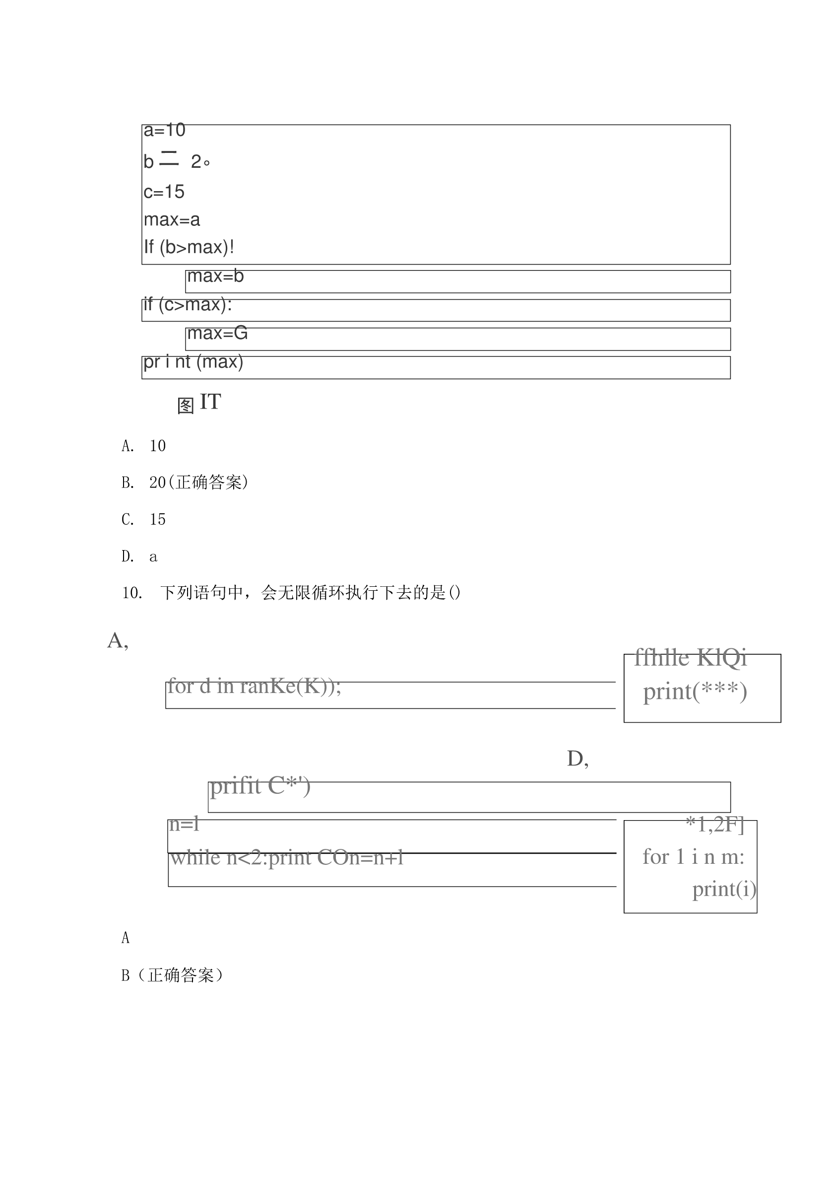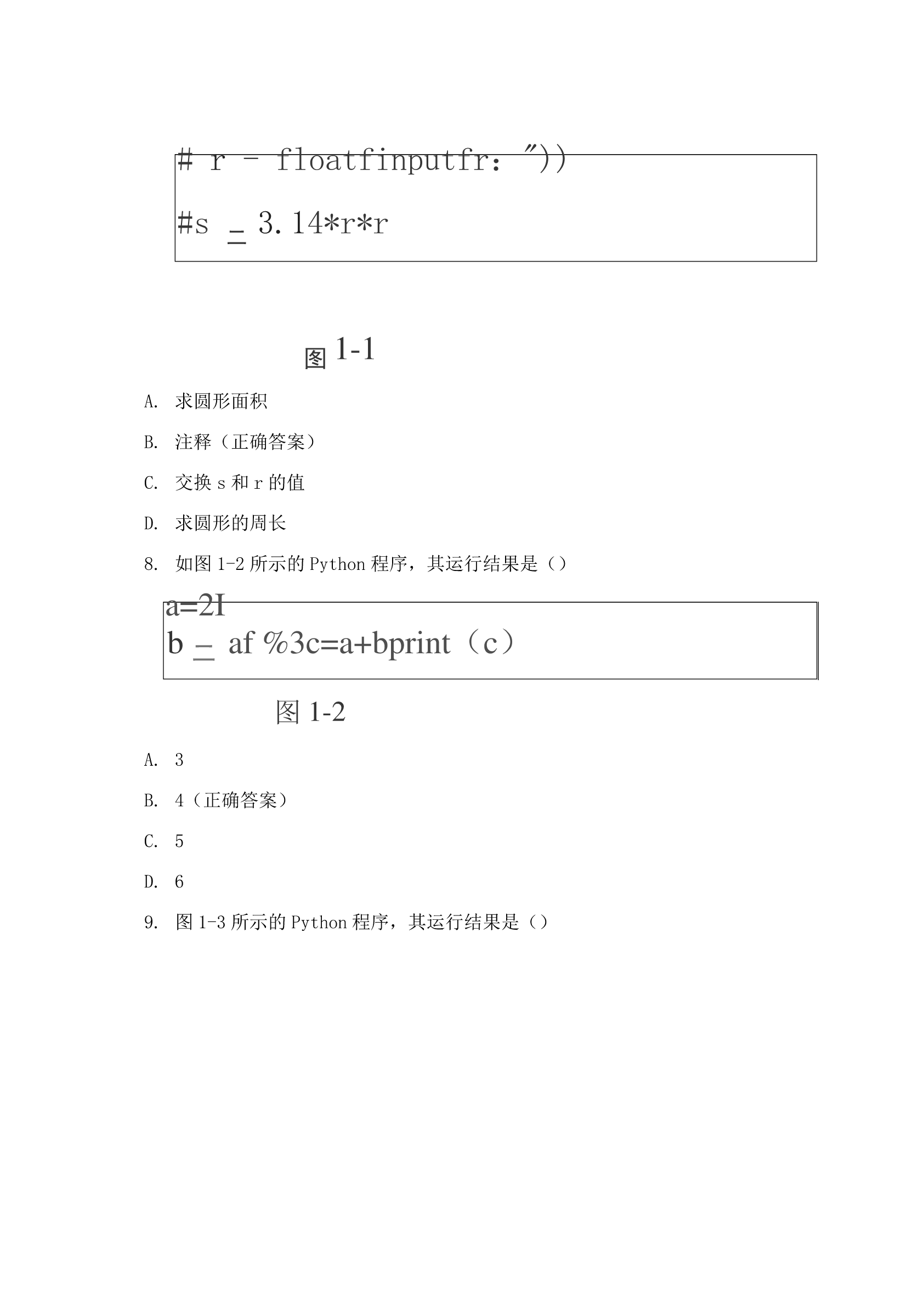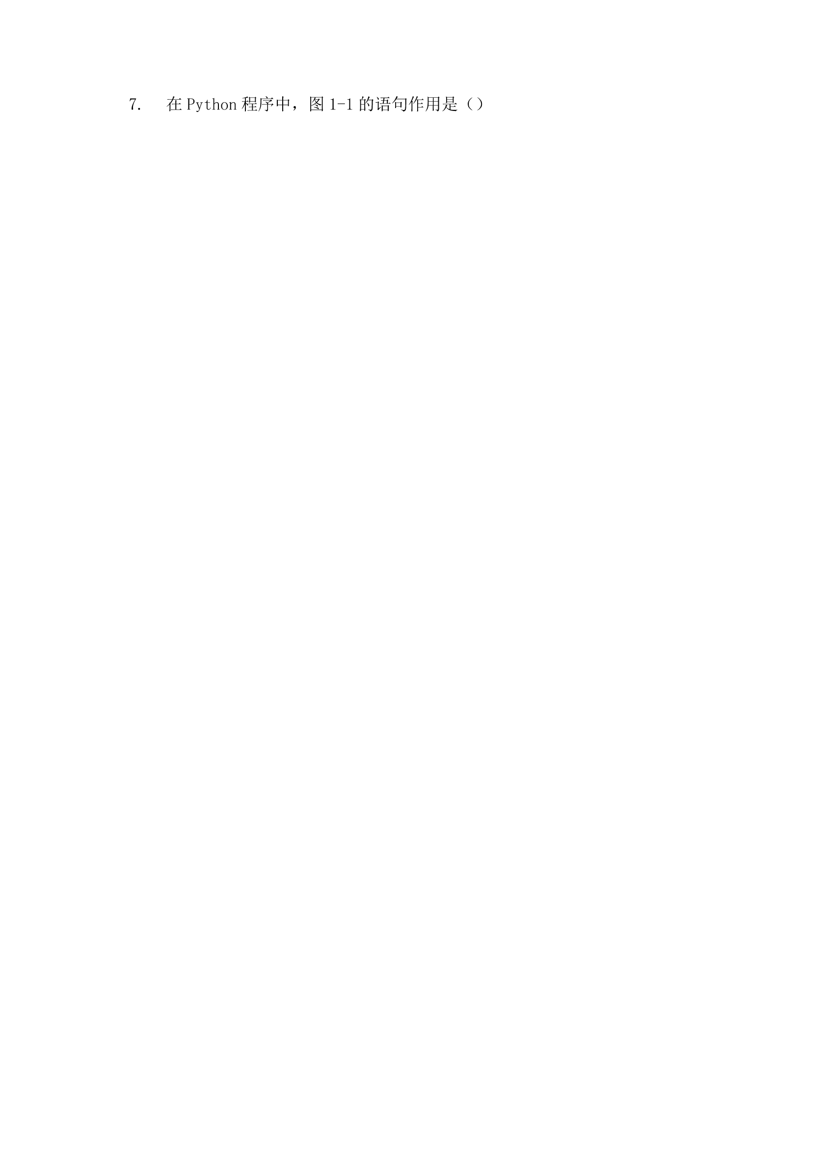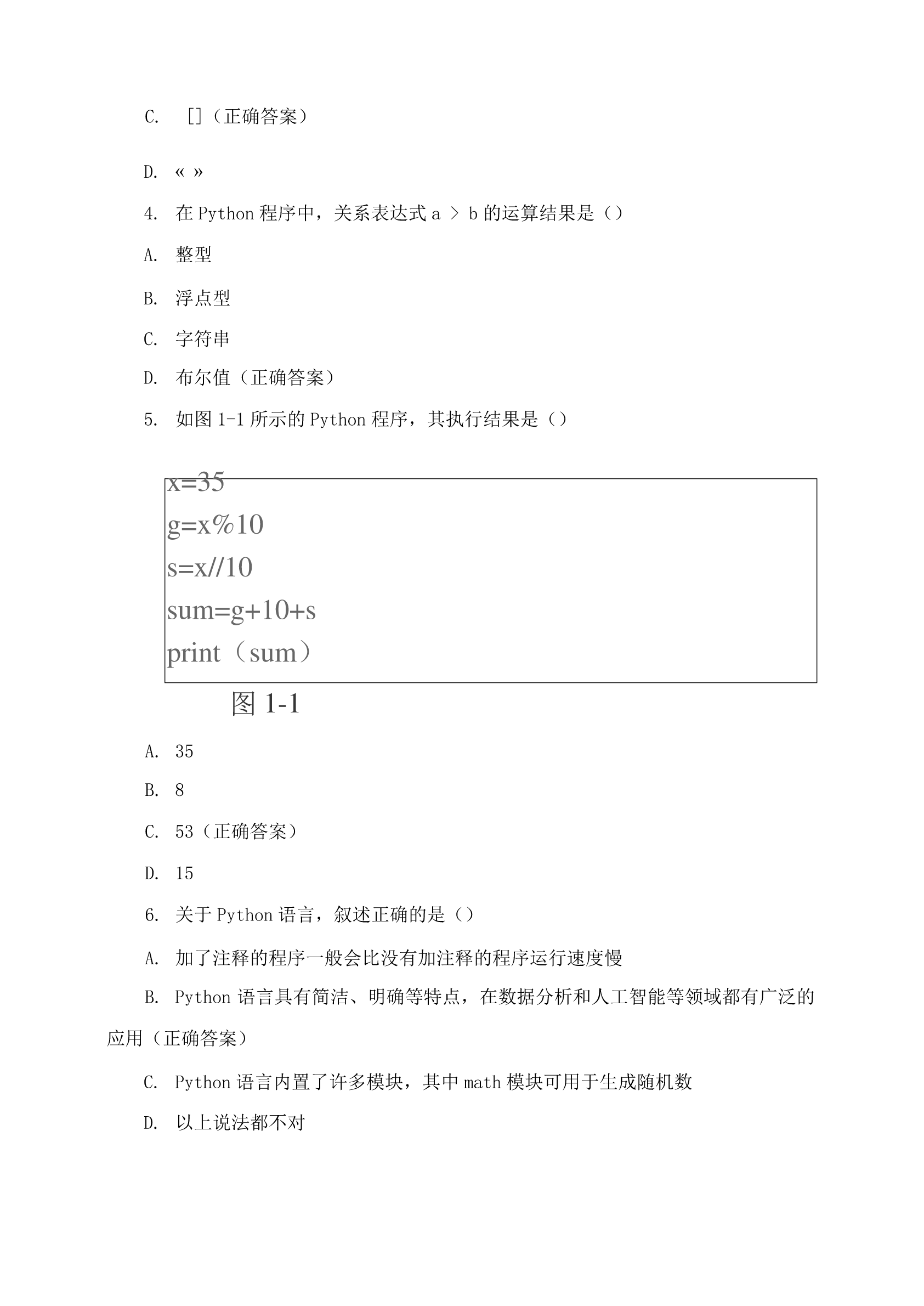 python知识点复习题与答案 一、单选题(每题2分,共20题,共40分) 1.算法必须能在执行有限个步骤之后终止,即算法步骤不可能是无限的。此特征 就是算法的()。 A.可行性 B.输出性 C.确定性 D.有穷性(正确答案) 2.利用计算机编程解决问题时,一般需要设计算法。算法有三种基本控制结 构,图1-2描述的是()。 A.顺序结构 B.分支结构 C.选择结构 D.循环结构(正确答案) 3.在Python程序中,创建列表类型数据时需要使用的符号是() A.{} B.() C.[](正确答案) D.«» 4.在Python程序中,关系表达式a>b的运算结果是() A.整型 B.浮点型 C.字符串 D.布尔值(正确答案) 5.如图1-1所示的Python程序,其执行结果是() x=35 g=x%10 s=x//10 sum=g+10+s print(sum) 图1-1 A.35 B.8 C.53(正确答案) D.15 6.关于Python语言,叙述正确的是() A.加了注释的程序一般会比没有加注释的程序运行速度慢 B.Python语言具有简洁、明确等特点,在数据分析和人工智能等领域都有广泛的 应用(正确答案) C.Python语言内置了许多模块,其中math模块可用于生成随机数 D.以上说法都不对 7.在Python程序中,图1-1的语句作用是() #r-floatfinputfr:")) #s二3.14*r*r 图1-1 A.求圆形面积 B.注释(正确答案) C.交换s和r的值 D.求圆形的周长 8.如图1-2所示的Python程序,其运行结果是() a=2I b二af%3c=a+bprint(c) 图1-2 A.3 B.4(正确答案) C.5 D.6 9.图1-3所示的Python程序,其运行结果是() a=10 b二2。 c=15 max=a If(b>max)! max=b if(c>max): max=G print(max) 图IT A.10 B.20(正确答案) C.15 D.a 10.下列语句中,会无限循环执行下去的是() A, ffhlleKlQi fordinranKe(K));print(***) D, prifitC*') n=l*1,2F] whilen<2:printCOn=n+lfor1inm: print(i) A B(正确答案) c D 11.在如图IT所示Python程序中,print语句执行的次数是() i=2 whilei<0:print(i;i=i+l 图IT A.执行2次 B.无限次 C.执行1次 D.一次也不执行(正确答案) 12.下列定义列表的正确格式是() A.(1,2,3,4) B.[1234] C.[1,2,3,4](正确答案) D.(1234) 13、下列代码中循环体执行的次数是() foriinrange(1,9,3): print(i) A.7 B.6 C.4 D.3(正确答案) 14.Python运算符的优先级排列正确的是()。 A.算术运算符〉关系运算符〉逻辑运算符(正确答案) B.算术运算符〉逻辑运算符〉赋值运算符 C.算术运算符〉逻辑运算符〉成员运算符 D.以上全不正确 15.介于自然语言和计算机语言之间的一种算法描述是下列哪个选项?() A.流程图 B.伪代码(正确答案) C.高级语言 D.VB程序设计语言 16.下列关于算法说法不正确的是() A-算法独立于任何具体的语言,Python算法只能用Python语言来实现(正确答 案) B.解决问题的过程就是实现算法的过程 C.算法是程序设计的“灵魂” D.算法可以通过编程来实现 17.以下不属于算法基本特征的是() A.可执行性 B.确定性 C.有穷性 D.无限性(正确答案) 18.下面说法正确的是() 配算法+数据结构=程序(正确答案) B-算法就是程序 C.数据结构就是程序 »算法包括数据结构 19.水仙花数是三位整数:其各位数字立方各等于该数本身,如 153=1A3+5A3+3A3,如果要求出所有的水仙花数,下列算法最合适的是() A.枚举法(正确答案) B.查找法 C.解析法 D.排序法 20.以下哪个是算法的描述方法?() A.流程图(正确答案) B.枚举法 C.顺序法 D.列表法 二、多选题(每题3分,少选得2分,错选或多选不得分,共10题,共30分) 21.关于Python语言,叙述正确的是() A.变量使用前必须声明 B.在循环体内使用br