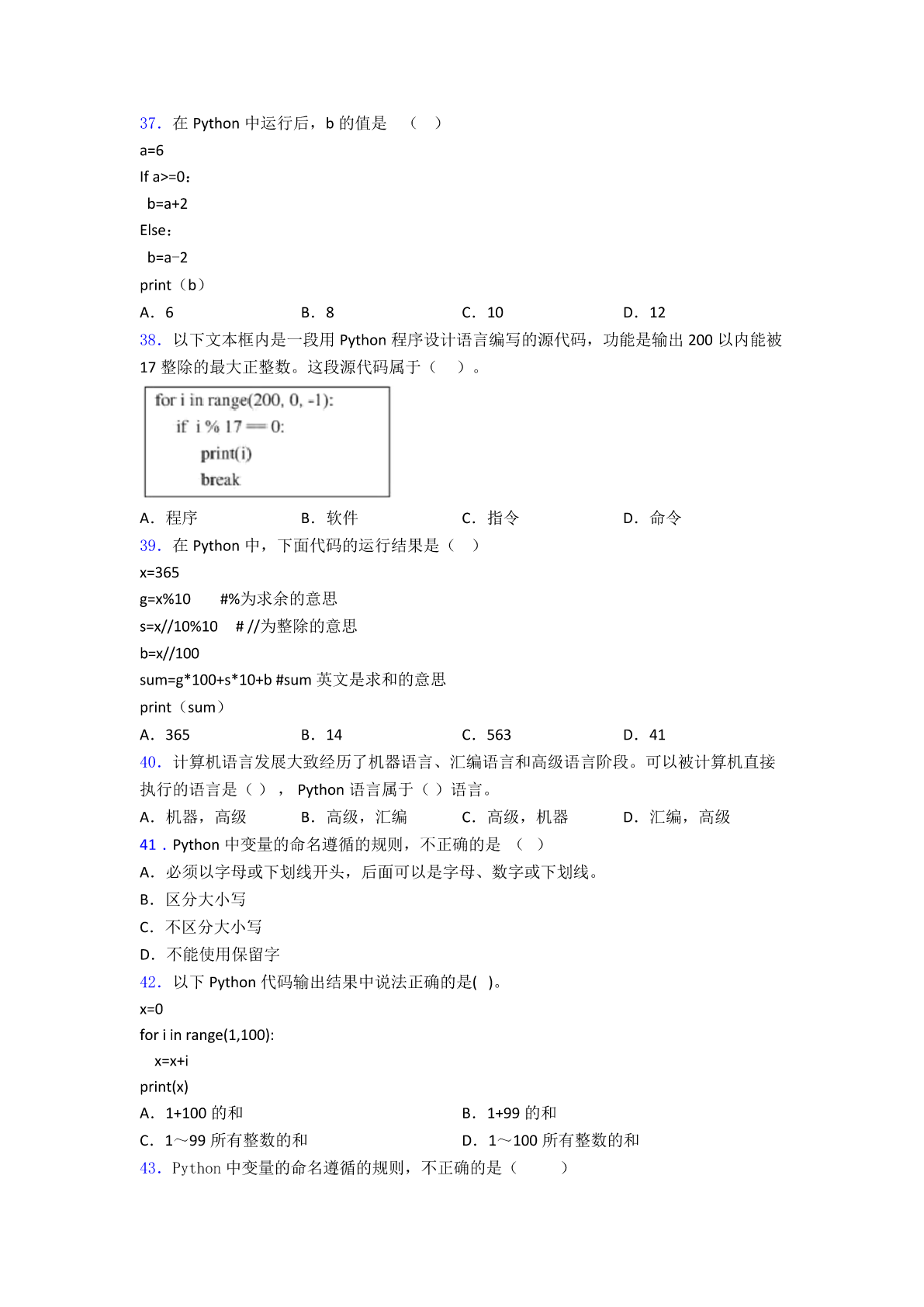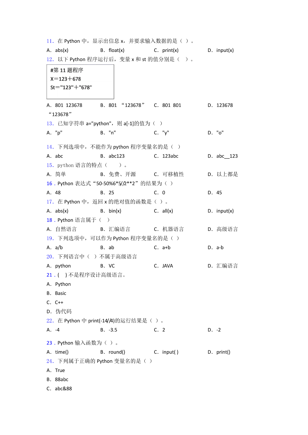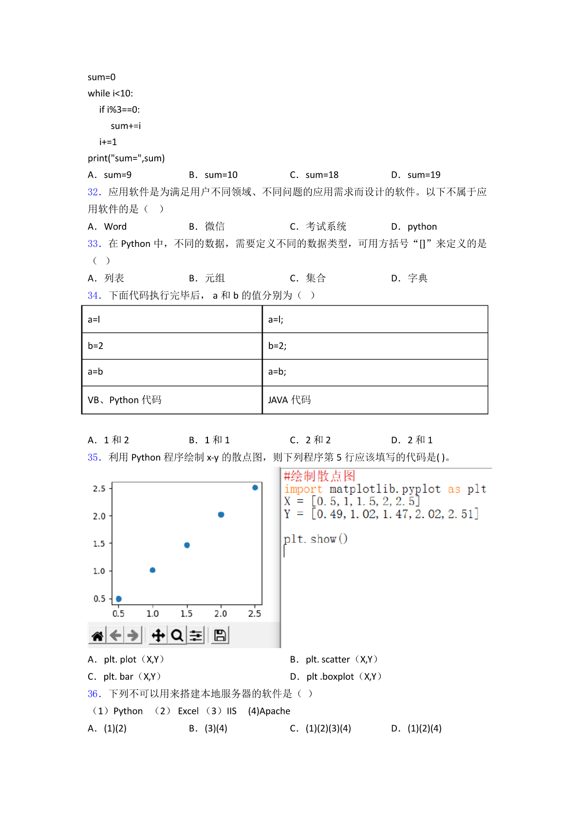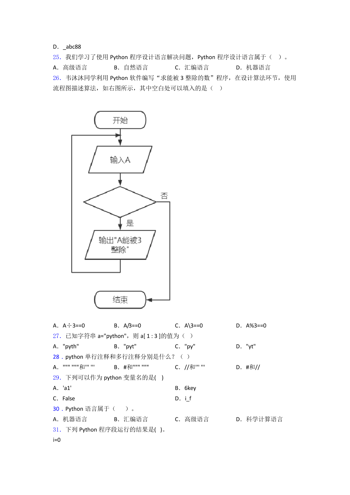 Python考试题图文复习知识点试卷试题 一、选择题 1.python文件的扩展名是() A.pyB.pyeC.vbpD.pyr 2.下面不是python特性的是(): A.免费的B.简单易学C.可移植性好D.是低级语言 3.利用Python求100以内所有能被3整除的正整数,代码如下: 则下列程序第3行的横线应该填() A.i=i*3B.i=i%3C.i%3==0D.i/3==1 4.Python中的数据类型float表示() A.布尔型B.整型C.字符串型D.浮点型 5.下列软件中,可作为服务器操作系统的是() A.WindowsB.PythonC.excelD.access 6.以下选项中,不是Python中文件操作的相关函数是()。 A.open()B.load() C.read()D.write() 7.在Python中,若x=10,y=20,下面程序段执行后,变量x、y的值分别是() x=y y=x A.10、10B.10、20C.20、20D.20、10 8.要实现将实数型变量a的值保留三位小数,以下python可以实现的是() A.a%0.001B.a//0.001C.round(a,3)D.round(3,a) 9.在python中,运行下列程序,正确的结果是() s=0 foriinrange(1,5): s=s+i print("i=",i,"s=",s) A.i=4s=10B.i=5s=10C.i=5s=15D.i=6s=15 10.Python中,保留字写法正确的是() A.PRINT() B.Print() C.print() D.Int() 11.在Python中,显示出信息x,并要求输入数据的是()。 A.abs(x)B.float(x)C.print(x)D.input(x) 12.以下Python程序运行后,变量x和st的值分别是()。 A.801123678B.801“123678”C.801801D.123678 “123678” 13.已知字符串a="python",则a[-1]的值为() A."p"B."n"C."y"D."o" 14.下列选项中,不能作为python程序变量名的是() A.abcB.abc123C.123abcD.abc__123 15.python语言的特点()。 A.简单B.免费、开源C.可移植性D.以上都是 16.Python表达式“50-50%6*5//2**2”的结果为() A.48B.25C.0D.45 17.在Python中,返回x的绝对值的函数是()。 A.abs(x)B.bin(x)C.all(x)D.input(x) 18.Python语言属于() A.自然语言B.汇编语言C.机器语言D.高级语言 19.下列选项中,可以作为Python程序变量名的是() A.a/bB.abC.a+bD.a-b 20.下列语言中()不属于高级语言 A.pythonB.VCC.JAVAD.汇编语言 21.()不是程序设计高级语言。 A.Python B.Basic C.C++ D.伪代码 22.在Python中print(-14//4)的运行结果是()。 A.-4B.-3.5C.2D.-2 23.Python输入函数为()。 A.time()B.round()C.input()D.print() 24.下列属于正确的Python变量名的是() A.True B.88abc C.abc&88 D._abc88 25.我们学习了使用Python程序设计语言解决问题,Python程序设计语言属于()。 A.高级语言B.自然语言C.汇编语言D.机器语言 26.韦沐沐同学利用Python软件编写“求能被3整除的数”程序,在设计算法环节,使用 流程图描述算法,如右图所示,其中空白处可以填入的是() A.A÷3==0B.A/3==0C.A\3==0D.A%3==0 27.已知字符串a="python",则a[1:3]的值为() A."pyth"B."pyt"C."py"D."yt" 28.python单行注释和多行注释分别是什么?() A.""""""和''''''B.#和""""""C.//和''''''D.#和// 29.下列可以作为python变量名的是() A.'a1'B.6key C.FalseD.i_f 30.Python语言属于()。 A.机器语言B.汇编语言C.高级语言D.科学计算语言 31.下列Python程序段运行的结果是()。 i=0 sum=0 whilei<10: ifi%3==0: sum+=i i+=1 print("sum=",sum) A.sum=9B.sum=10C.sum=18D.sum=19 32