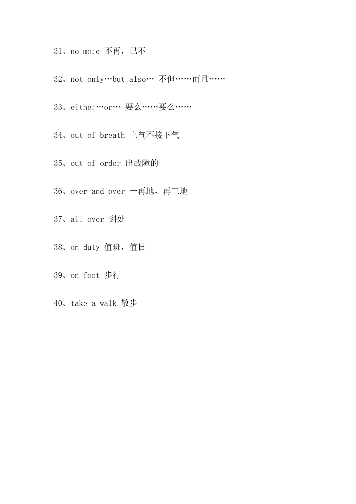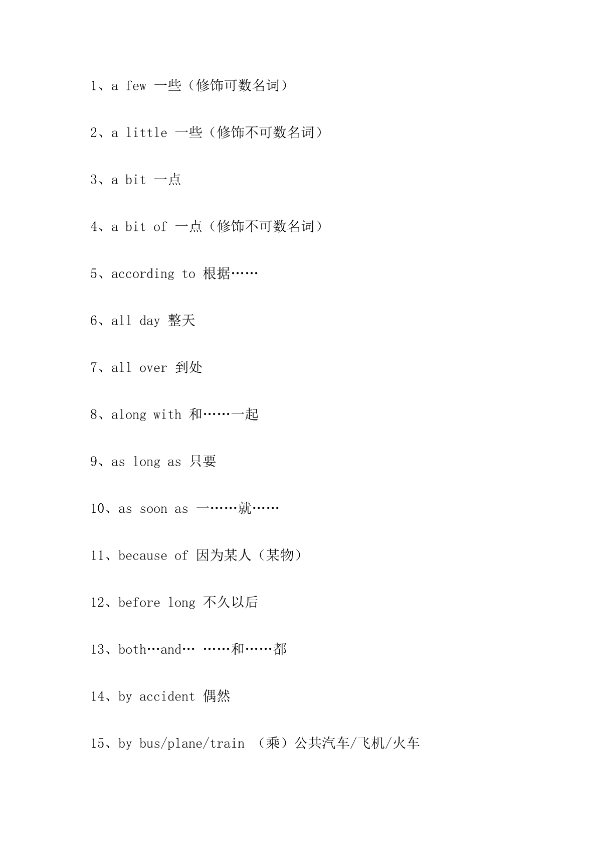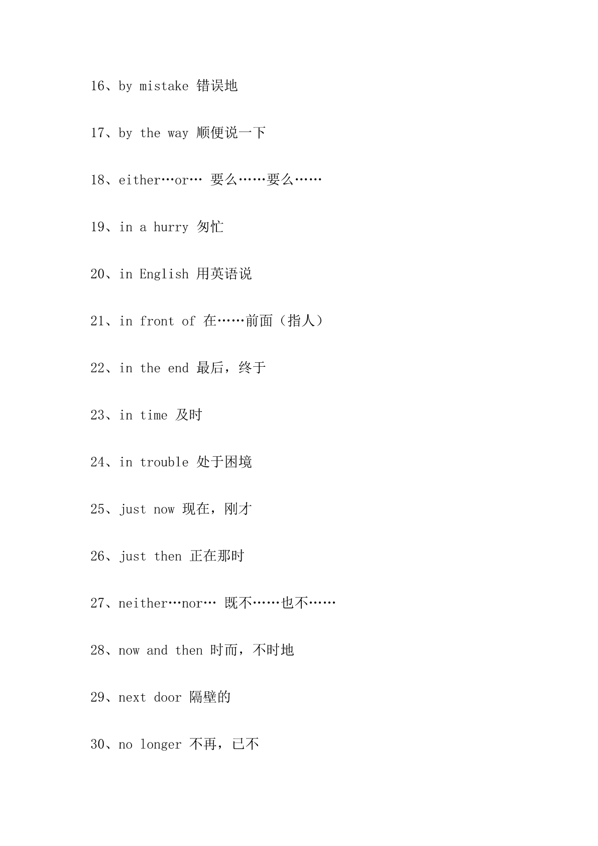最新译林版英语九年级上册单词汉译英默写 最新译林版英语九年级上册单词汉译英默写 一、状语从句 1、一边……一边……while 2、每当……whenever 3、既然……就……now(that) 4、尽管……但是……although/though 5、无论……都……nomatter 6、先……,然后……first(then) 7、自从……以来……since 8、将来/今后when 9、以前……,现在……now 10、只有才onlyif 11、如果不ifnot 二、词组翻译 1、afew一些(修饰可数名词) 2、alittle一些(修饰不可数名词) 3、abit一点 4、abitof一点(修饰不可数名词) 5、accordingto根据…… 6、allday整天 7、allover到处 8、alongwith和……一起 9、aslongas只要 10、assoonas一……就…… 11、becauseof因为某人(某物) 12、beforelong不久以后 13、both…and………和……都 14、byaccident偶然 15、bybus/plane/train(乘)公共汽车/飞机/火车 16、bymistake错误地 17、bytheway顺便说一下 18、either…or…要么……要么…… 19、inahurry匆忙 20、inEnglish用英语说 21、infrontof在……前面(指人) 22、intheend最后,终于 23、intime及时 24、introuble处于困境 25、justnow现在,刚才 26、justthen正在那时 27、neither…nor…既不……也不…… 28、nowandthen时而,不时地 29、nextdoor隔壁的 30、nolonger不再,已不 31、nomore不再,已不 32、notonly…butalso…不但……而且…… 33、either…or…要么……要么…… 34、outofbreath上气不接下气 35、outoforder出故障的 36、overandover一再地,再三地 37、allover到处 38、onduty值班,值日 39、onfoot步行 40、takeawalk散步