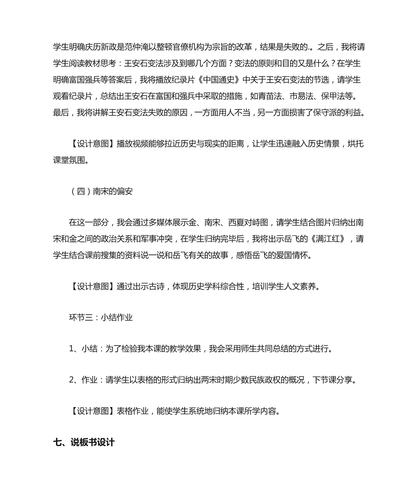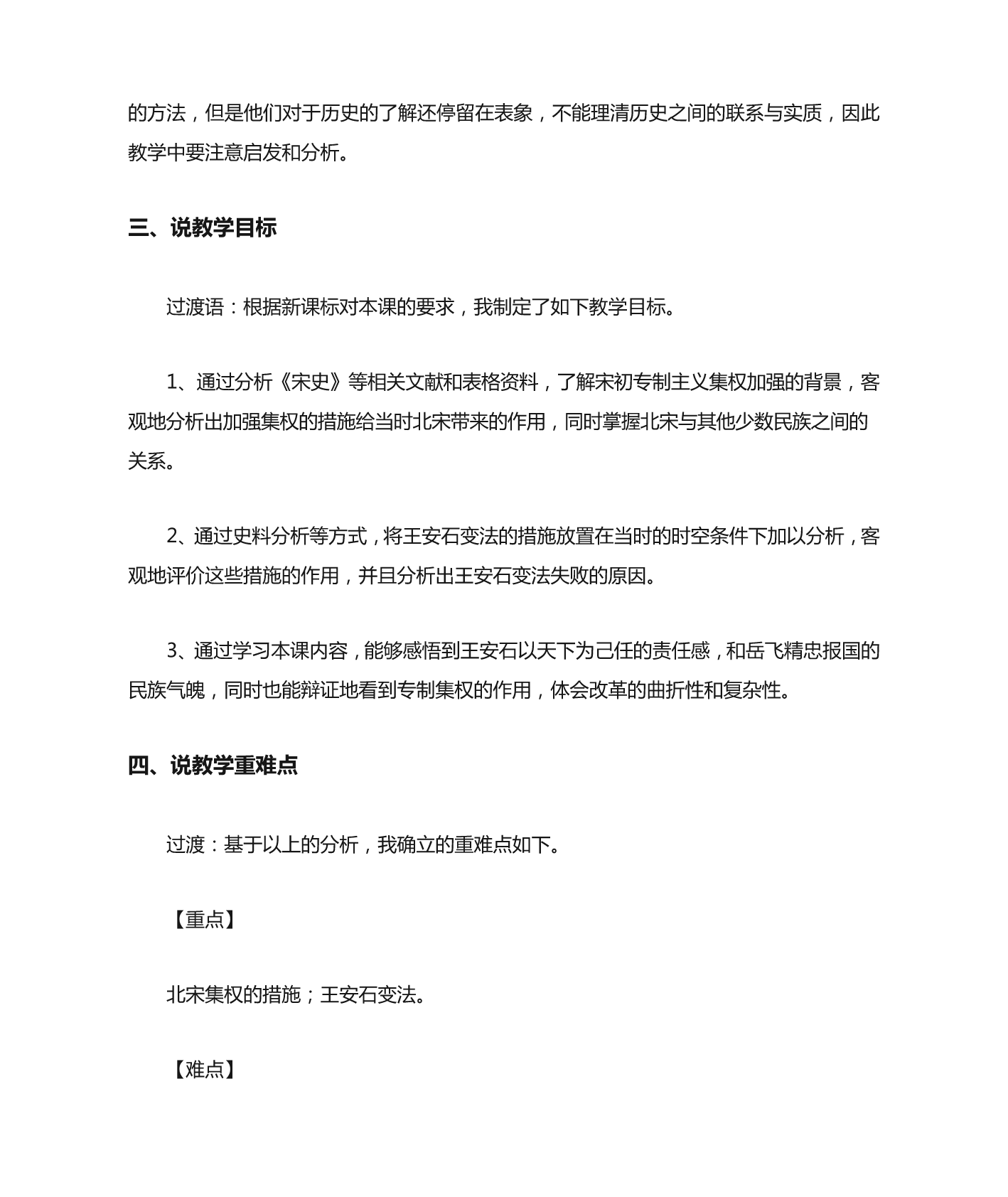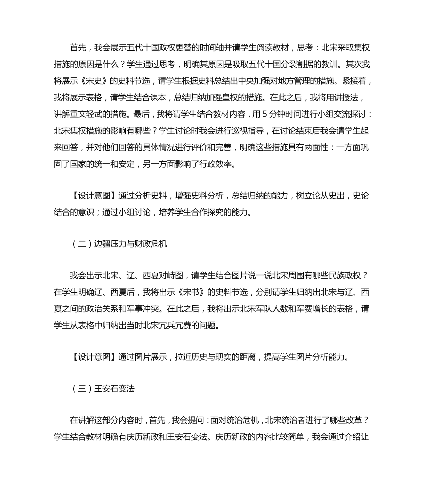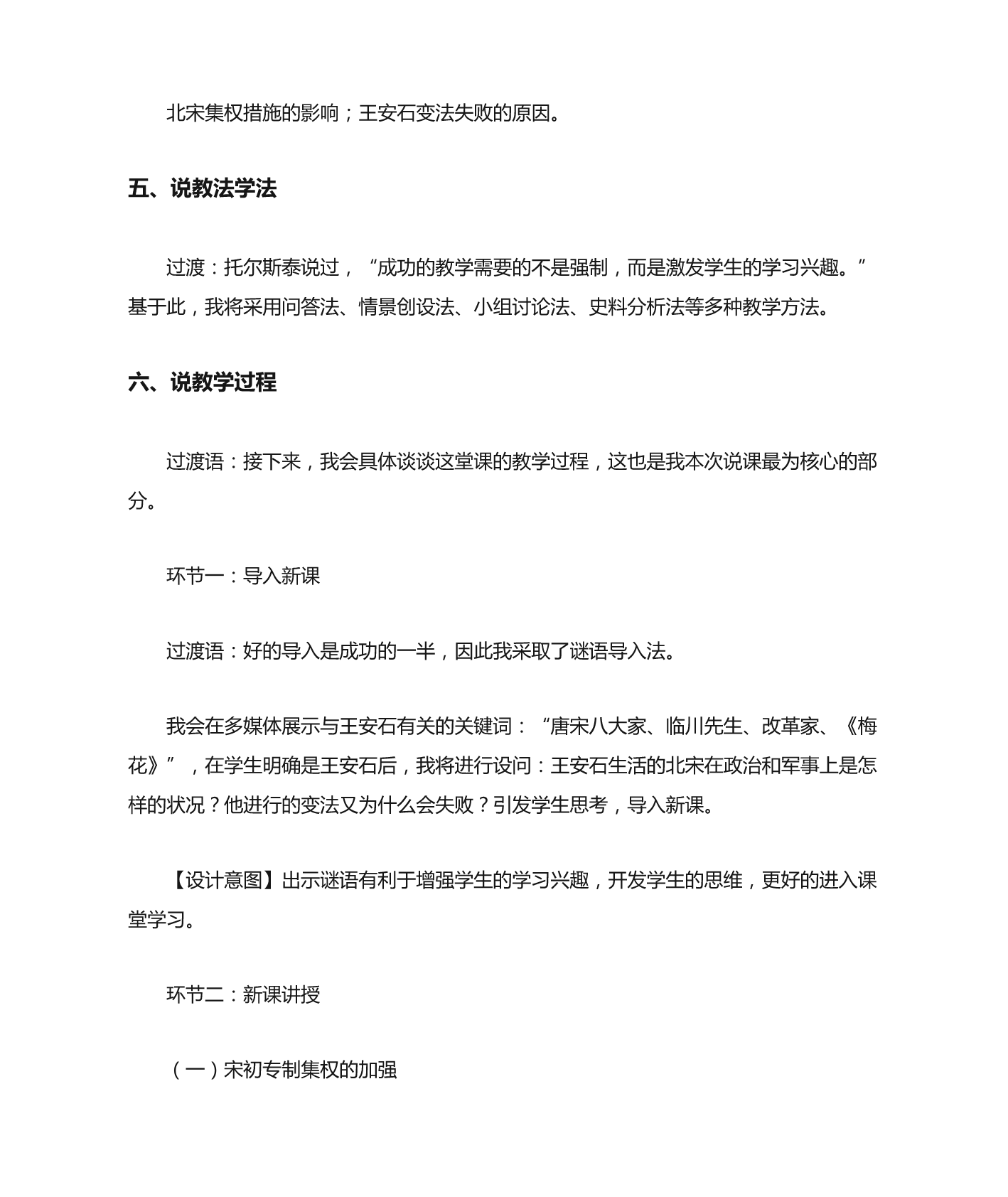 Thereisnoso-calledgeniusinthisworld,andthereisnorewardfornothing.Every glamorouspersonyouseehasmadeshockingeffortsbehindit.通用参考模板(页眉 可删) 《两宋的政治和军事》高中历史说课稿 作为一名默默奉献的教育工作者,就有可能用到说课稿,说课稿有助于教学取得成功、 提高教学质量。那么问题来了,说课稿应该怎么写?下面是收集整理的《两宋的政治和军 事》高中历史说课稿,仅供参考,大家一起来看看吧。 一、说教材 过渡语:教材是联系教师和学生之间的桥梁,首先我来谈一谈对教材的理解。 本课是部编版高中历史中外历史纲要上册第三单元第9课的内容,本课有四个子目, 分别是宋初专制集权的加强、边疆压力与财政危机、王安石变法、南宋的偏安。学好本课, 可以帮助学生梳理掌握两宋时期的政治与军事,使之有更加深刻的理解。 二、说学情 过渡语:学生是课堂的主体,教师要对学情有所把握。 通过三年的历史学习,高一的学生已经积累了一些的历史知识,掌握了一些历史学习 的方法,但是他们对于历史的了解还停留在表象,不能理清历史之间的联系与实质,因此 教学中要注意启发和分析。 三、说教学目标 过渡语:根据新课标对本课的要求,我制定了如下教学目标。 1、通过分析《宋史》等相关文献和表格资料,了解宋初专制主义集权加强的背景,客 观地分析出加强集权的措施给当时北宋带来的作用,同时掌握北宋与其他少数民族之间的 关系。 2、通过史料分析等方式,将王安石变法的措施放置在当时的时空条件下加以分析,客 观地评价这些措施的作用,并且分析出王安石变法失败的原因。 3、通过学习本课内容,能够感悟到王安石以天下为己任的责任感,和岳飞精忠报国的 民族气魄,同时也能辩证地看到专制集权的作用,体会改革的曲折性和复杂性。 四、说教学重难点 过渡:基于以上的分析,我确立的重难点如下。 【重点】 北宋集权的措施;王安石变法。 【难点】 北宋集权措施的影响;王安石变法失败的原因。 五、说教法学法 过渡:托尔斯泰说过,“成功的教学需要的不是强制,而是激发学生的学习兴趣。” 基于此,我将采用问答法、情景创设法、小组讨论法、史料分析法等多种教学方法。 六、说教学过程 过渡语:接下来,我会具体谈谈这堂课的教学过程,这也是我本次说课最为核心的部 分。 环节一:导入新课 过渡语:好的导入是成功的一半,因此我采取了谜语导入法。 我会在多媒体展示与王安石有关的关键词:“唐宋八大家、临川先生、改革家、《梅 花》”,在学生明确是王安石后,我将进行设问:王安石生活的北宋在政治和军事上是怎 样的状况?他进行的变法又为什么会失败?引发学生思考,导入新课。 【设计意图】出示谜语有利于增强学生的学习兴趣,开发学生的思维,更好的进入课 堂学习。 环节二:新课讲授 (一)宋初专制集权的加强 首先,我会展示五代十国政权更替的时间轴并请学生阅读教材,思考:北宋采取集权 措施的原因是什么?学生通过思考,明确其原因是吸取五代十国分裂割据的教训。其次我 将展示《宋史》的史料节选,请学生根据史料总结出中央加强对地方管理的措施。紧接着, 我将展示表格,请学生结合课本,总结归纳加强皇权的措施。在此之后,我将用讲授法, 讲解重文轻武的措施。最后,我将请学生结合教材内容,用5分钟时间进行小组交流探讨: 北宋集权措施的影响有哪些?学生讨论时我会进行巡视指导,在讨论结束后我会请学生起 来回答,并对他们回答的具体情况进行评价和完善,明确这些措施具有两面性:一方面巩 固了国家的统一和安定,另一方面影响了行政效率。 【设计意图】通过分析史料,增强史料分析,总结归纳的能力,树立论从史出,史论 结合的意识;通过小组讨论,培养学生合作探究的能力。 (二)边疆压力与财政危机 我会出示北宋、辽、西夏对峙图,请学生结合图片说一说北宋周围有哪些民族政权? 在学生明确辽、西夏后,我将出示《宋书》的史料节选,分别请学生归纳出北宋与辽、西 夏之间的政治关系和军事冲突。在此之后,我将出示北宋军队人数和军费增长的表格,请 学生从表格中归纳出当时北宋冗兵冗费的问题。 【设计意图】通过图片展示,拉近历史与现实的距离,提高学生图片分析能力。 (三)王安石变法 在讲解这部分内容时,首先,我会提问:面对统治危机,北宋统治者进行了哪些改革? 学生结合教材明确有庆历新政和王安石变法。庆历新政的内容比较简单,我会通过介绍让 学生明确庆历新政是范仲淹以整顿官僚机构为宗旨的改革,结果是失败的.。之后,我将请 学生阅读教材思考: