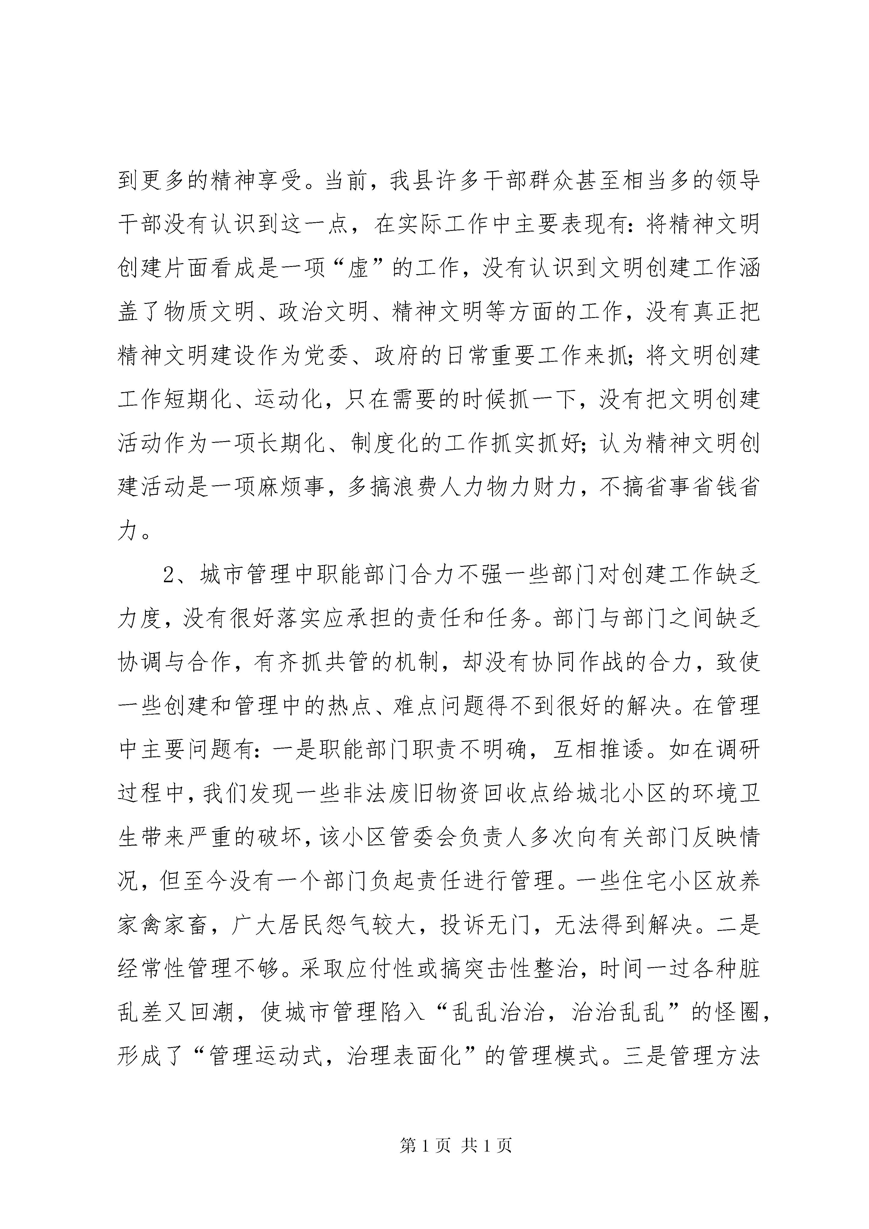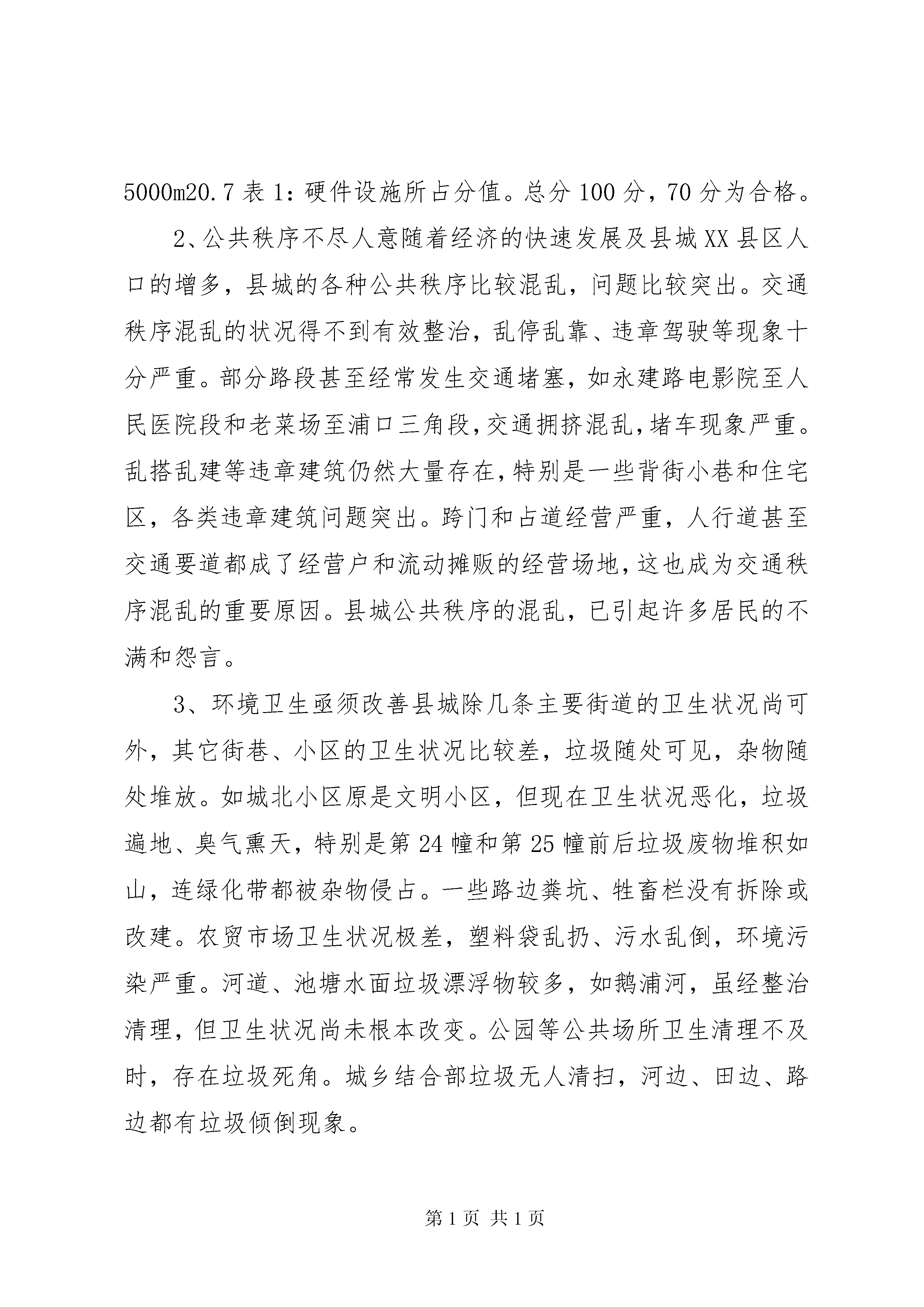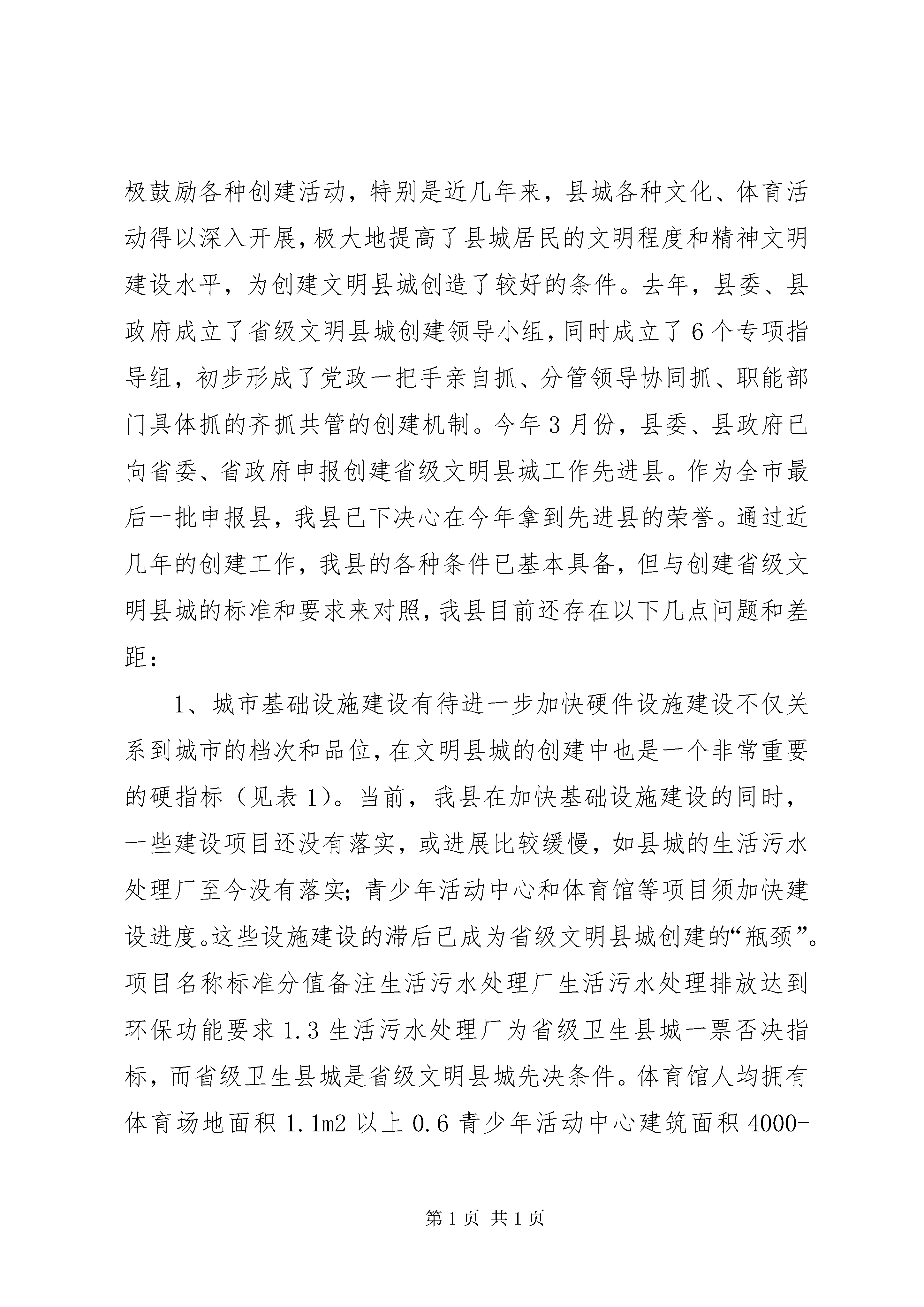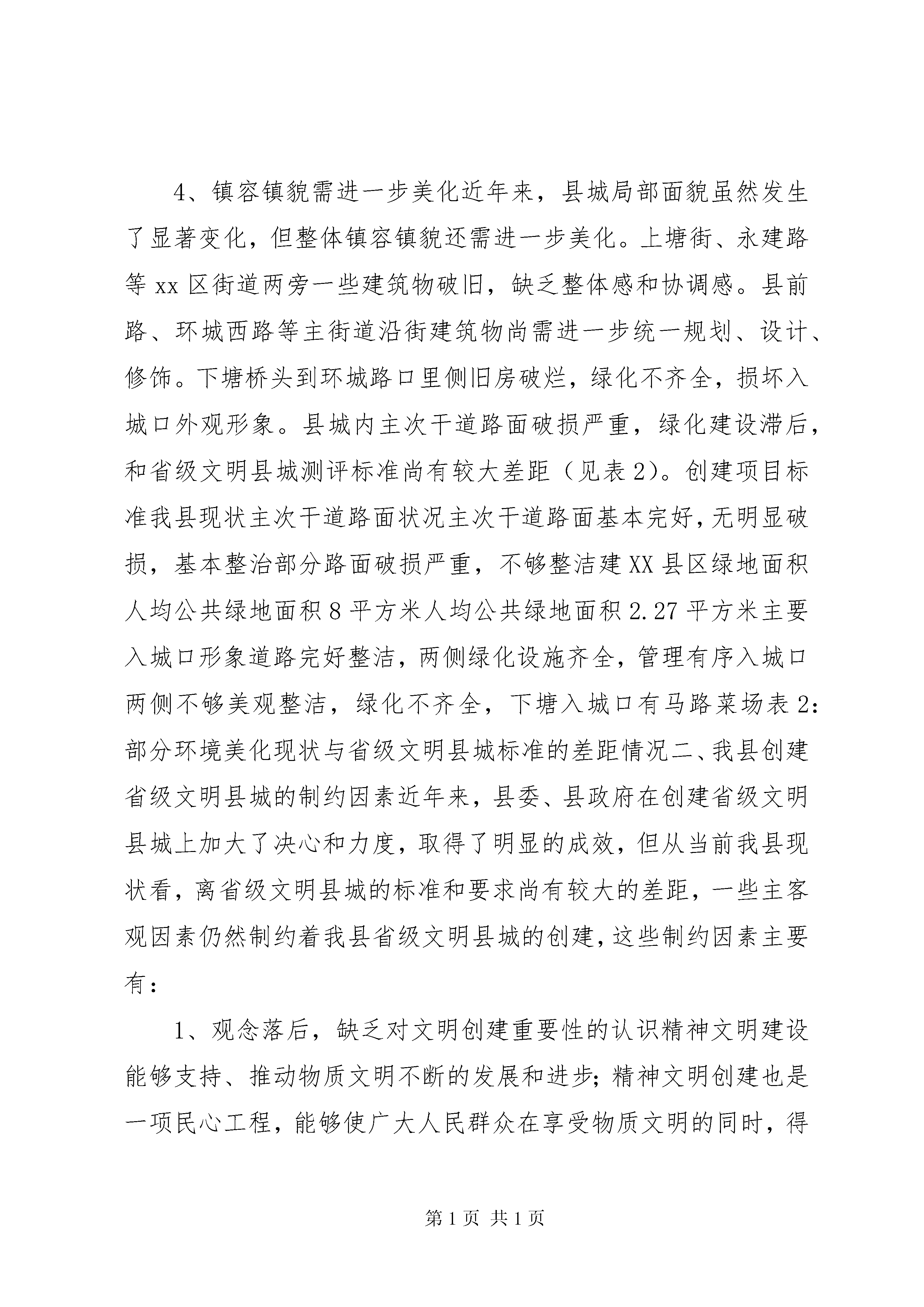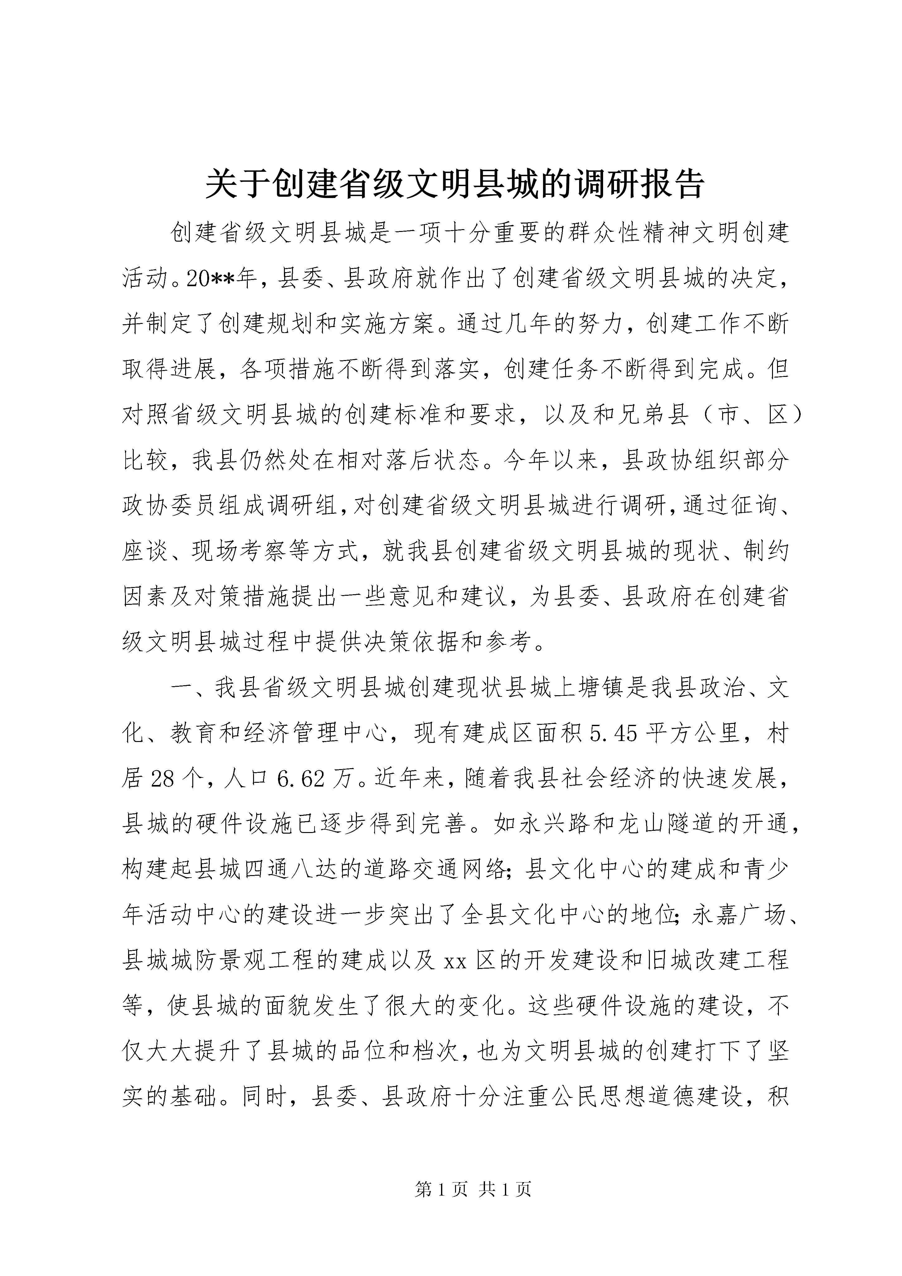 关于创建省级文明县城的调研报告创建省级文明县城是一项十分重要的群众性精神文明创建活动。20**年,县委、县政府就作出了创建省级文明县城的决定,并制定了创建规划和实施方案。通过几年的努力,创建工作不断取得进展,各项措施不断得到落实,创建任务不断得到完成。但对照省级文明县城的创建标准和要求,以及和兄弟县(市、区)比较,我县仍然处在相对落后状态。今年以来,县政协组织部分政协委员组成调研组,对创建省级文明县城进行调研,通过征询、座谈、现场考察等方式,就我县创建省级文明县城的现状、制约因素及对策措施提出一些意见和建议,为县委、县政府在创建省级文明县城过程中提供决策依据和参考。一、我县省级文明县城创建现状县城上塘镇是我县政治、文化、教育和经济管理中心,现有建成区面积5.45平方公里,村居28个,人口6.62万。近年来,随着我县社会经济的快速发展,县城的硬件设施已逐步得到完善。如永兴路和龙山隧道的开通,构建起县城四通八达的道路交通网络;县文化中心的建成和青少年活动中心的建设进一步突出了全县文化中心的地位;永嘉广场、县城城防景观工程的建成以及xx区的开发建设和旧城改建工程等,使县城的面貌发生了很大的变化。这些硬件设施的建设,不仅大大提升了县城的品位和档次,也为文明县城的创建打下了坚实的基础。同时,县委、县政府十分注重公民思想道德建设,积极鼓励各种创建活动,特别是近几年来,县城各种文化、体育活动得以深入开展,极大地提高了县城居民的文明程度和精神文明建设水平,为创建文明县城创造了较好的条件。去年,县委、县政府成立了省级文明县城创建领导小组,同时成立了6个专项指导组,初步形成了党政一把手亲自抓、分管领导协同抓、职能部门具体抓的齐抓共管的创建机制。今年3月份,县委、县政府已向省委、省政府申报创建省级文明县城工作先进县。作为全市最后一批申报县,我县已下决心在今年拿到先进县的荣誉。通过近几年的创建工作,我县的各种条件已基本具备,但与创建省级文明县城的标准和要求来对照,我县目前还存在以下几点问题和差距:1、城市基础设施建设有待进一步加快硬件设施建设不仅关系到城市的档次和品位,在文明县城的创建中也是一个非常重要的硬指标(见表1)。当前,我县在加快基础设施建设的同时,一些建设项目还没有落实,或进展比较缓慢,如县城的生活污水处理厂至今没有落实;青少年活动中心和体育馆等项目须加快建设进度。这些设施建设的滞后已成为省级文明县城创建的“瓶颈”。项目名称标准分值备注生活污水处理厂生活污水处理排放达到环保功能要求1.3生活污水处理厂为省级卫生县城一票否决指标,而省级卫生县城是省级文明县城先决条件。体育馆人均拥有体育场地面积1.1m2以上0.6青少年活动中心建筑面积4000-5000m20.7表1:硬件设施所占分值。总分100分,70分为合格。2、公共秩序不尽人意随着经济的快速发展及县城XX县区人口的增多,县城的各种公共秩序比较混乱,问题比较突出。交通秩序混乱的状况得不到有效整治,乱停乱靠、违章驾驶等现象十分严重。部分路段甚至经常发生交通堵塞,如永建路电影院至人民医院段和老菜场至浦口三角段,交通拥挤混乱,堵车现象严重。乱搭乱建等违章建筑仍然大量存在,特别是一些背街小巷和住宅区,各类违章建筑问题突出。跨门和占道经营严重,人行道甚至交通要道都成了经营户和流动摊贩的经营场地,这也成为交通秩序混乱的重要原因。县城公共秩序的混乱,已引起许多居民的不满和怨言。3、环境卫生亟须改善县城除几条主要街道的卫生状况尚可外,其它街巷、小区的卫生状况比较差,垃圾随处可见,杂物随处堆放。如城北小区原是文明小区,但现在卫生状况恶化,垃圾遍地、臭气熏天,特别是第24幢和第25幢前后垃圾废物堆积如山,连绿化带都被杂物侵占。一些路边粪坑、牲畜栏没有拆除或改建。农贸市场卫生状况极差,塑料袋乱扔、污水乱倒,环境污染严重。河道、池塘水面垃圾漂浮物较多,如鹅浦河,虽经整治清理,但卫生状况尚未根本改变。公园等公共场所卫生清理不及时,存在垃圾死角。城乡结合部垃圾无人清扫,河边、田边、路边都有垃圾倾倒现象。4、镇容镇貌需进一步美化近年来,县城局部面貌虽然发生了显著变化,但整体镇容镇貌还需进一步美化。上塘街、永建路等xx区街道两旁一些建筑物破旧,缺乏整体感和协调感。县前路、环城西路等主街道沿街建筑物尚需进一步统一规划、设计、修饰。下塘桥头到环城路口里侧旧房破烂,绿化不齐全,损坏入城口外观形象。县城内主次干道路面破损严重,绿化建设滞后,和省级文明县城测评标准尚有较大差距(见表2)。创建项目标准我县现状主次干道路面状况主次干道路面基本完好,无明显破损,基本整治部分路面破损严重,不够整洁建XX县区绿地面积人均公共绿地面积8平方米人均公共绿地面积2.27平方米主要入城口形象道路完好整洁,两侧绿化设施齐全,
