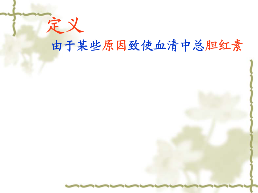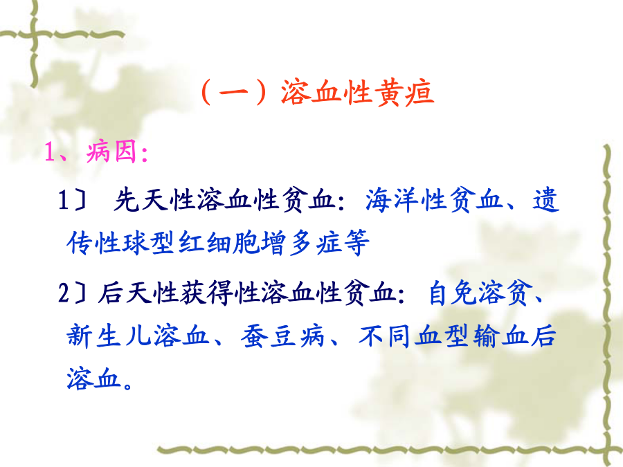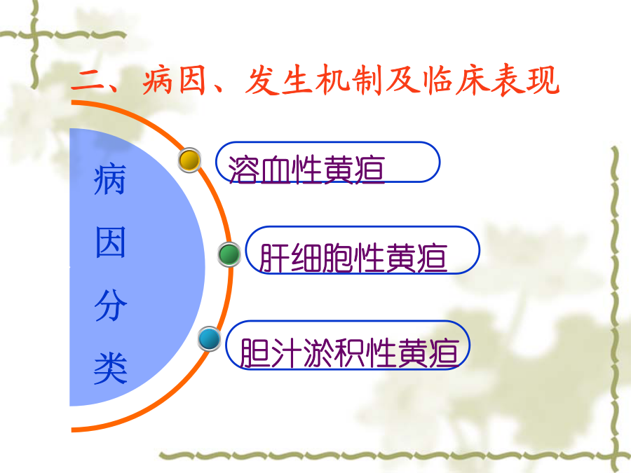 常见症状评估定义一、病因与发病机制二、病因、发生机制及临床表现(一)溶血性黄疸溶血性黄疸发病机理示意图(一)溶血性黄疸(二)肝细胞性黄疸(二)肝细胞性黄疸(三)胆汁淤积性(梗阻性)黄疸(三)胆汁淤积性(梗阻性)黄疸伴随症状伴随症状伴随症状相关护理诊断