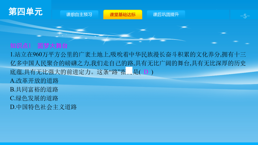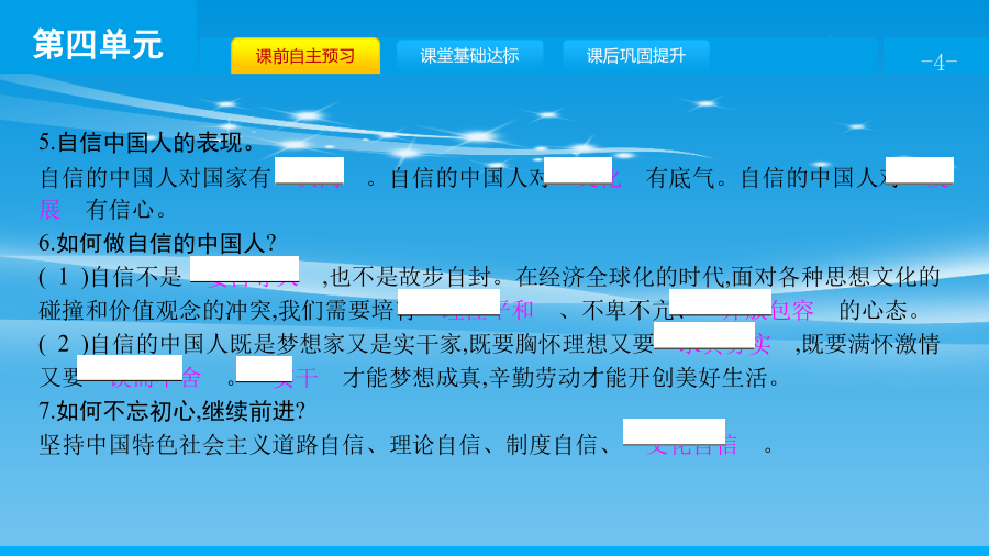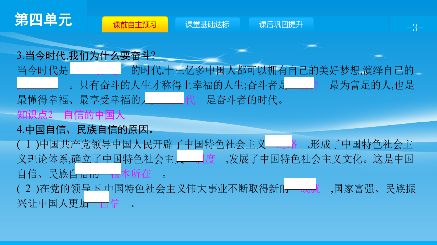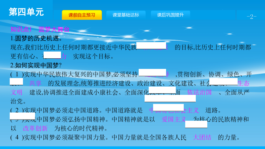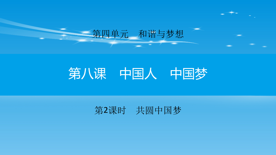第八课中国人中国梦知识点1圆梦大舞台 1.圆梦的历史机遇。 现在,我们比历史上任何时期都更接近中华民族伟大复兴的目标,比历史上任何时期都更有信心、有能力实现这个目标。 2.如何实现中国梦? (1)实现中华民族伟大复兴的中国梦,必须坚持党的领导,贯彻创新、协调、绿色、开放、共享的发展理念,统筹推进经济建设、政治建设、文化建设、社会建设、生态文明建设,协调推进全面建成小康社会、全面深化改革、全面依法治国、全面从严治党。 (2)实现中国梦必须走中国道路。中国道路就是中国特色社会主义道路。 (3)实现中国梦必须弘扬中国精神。中国精神就是以爱国主义为核心的民族精神和以改革创新为核心的时代精神。 (4)实现中国梦必须凝聚中国力量。中国力量就是全国各族人民大团结的力量。3.当今时代,我们为什么要奋斗? 当今时代是放飞梦想的时代,十三亿多中国人都可以拥有自己的美好梦想,演绎自己的美丽人生。只有奋斗的人生才称得上幸福的人生;奋斗者是精神最为富足的人,也是最懂得幸福、最享受幸福的人;新时代是奋斗者的时代。 知识点2自信的中国人 4.中国自信、民族自信的原因。 (1)中国共产党领导中国人民开辟了中国特色社会主义道路,形成了中国特色社会主义理论体系,确立了中国特色社会主义制度,发展了中国特色社会主义文化。这是中国自信、民族自信的根本所在。 (2)在党的领导下,中国特色社会主义伟大事业不断取得新的成就,国家富强、民族振兴让中国人更加自信。5.自信中国人的表现。 自信的中国人对国家有认同。自信的中国人对文化有底气。自信的中国人对发展有信心。 6.如何做自信的中国人? (1)自信不是妄自尊大,也不是故步自封。在经济全球化的时代,面对各种思想文化的碰撞和价值观念的冲突,我们需要培育理性平和、不卑不亢、开放包容的心态。 (2)自信的中国人既是梦想家又是实干家,既要胸怀理想又要求真务实,既要满怀激情又要锲而不舍。实干才能梦想成真,辛勤劳动才能开创美好生活。 7.如何不忘初心,继续前进? 坚持中国特色社会主义道路自信、理论自信、制度自信、文化自信。知识点1圆梦大舞台 1.站立在960万平方公里的广袤土地上,吸吮着中华民族漫长奋斗积累的文化养分,拥有十三亿多中国人民聚合的磅礴之力,我们走自己的路,具有无比广阔的舞台,具有无比深厚的历史底蕴,具有无比强大的前进定力。这条“路”指的是(D) A.改革开放的道路 B.共同富裕的道路 C.绿色发展的道路 D.中国特色社会主义道路2.(原创)右图启示我们,实现中国梦必须(C) A.要走中国道路 B.弘扬中国精神 C.凝聚中国力量 D.全面深化改革3.(改编)下面是习近平总书记的一些精彩话语,请联系教材知识进行思考并作答。 话语一每个人都有理想和追求,都有自己的梦想。现在,大家都在讨论中国梦,我以为,实现中华民族伟大复兴,就是中华民族近代以来最伟大的梦想。 (1)“中国梦”成为热词,成为人们议论的焦点话题。请说说你心中的“中国梦”。 ①我国经济社会快速发展,国家综合国力日益增强,人民生活水平显著提高。②有更好的教育、更稳定的工作、更满意的收入、更可靠的社会保障、更高水平的医疗卫生服务、更舒适的居住条件、更优美的环境等。话语二历史告诉我们,每个人的前途命运都与国家和民族的前途命运紧密相连。国家好、民族好,大家才会好。实现中华民族伟大复兴是一项光荣而艰巨的事业,需要一代又一代中国人共同为之努力。空谈误国,实干兴邦。 (2)“空谈误国,实干兴邦。”为实现中华民族伟大复兴,我们中学生应如何做? ①树立崇高远大理想,树立为人民、为社会服务的远大志向。②勤俭自强、艰苦奋斗、勇于创新,弘扬和培育民族精神。③珍惜受教育的权利,自觉履行受教育的义务,努力学习科学文化知识。④培养创新精神和能力,不断提高自身综合素质。⑤增强使命感和社会责任感,养成亲社会行为,积极承担责任,奉献社会等。知识点2自信的中国人 4.下面漫画启示我们,做自信的中国人要(C)5.下列对自信的认识正确的是(B) ①自信就是妄自尊大②自信需要培养理性平和的心态③自信需要不卑不亢、开放包容④自信就是故步自封 A.①② B.②③ C.②④D.③④ 6.实现中国梦必须坚持和发展中国特色社会主义。具体来说,就是坚持中国特色社会主义的,使之成为我们的信念和行动。(A) ①道路自信②理论自信③制度自信④文化自信 A.①②③④ B.①②④ C.①③④ D.②③④1.中国梦生动形象表达了全体中国人民的共同理想追求,昭示着国家富强、民族振兴、人民幸福的美好前景。为实现中华民族伟大复兴的中国梦,必(D) ①坚持党的领导②贯彻创新、协调、绿色、开放、共享的发展理念③统筹推进经济建设、政治建设、文化建设、社会建设、生态文明建设④协调推进全面建成小康社会、全面深化改革、全面依法治国、全面从严治党 A.①②