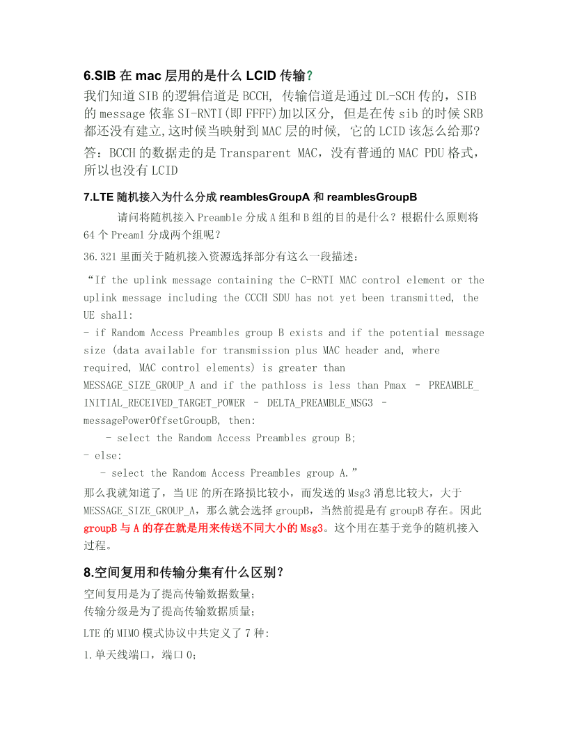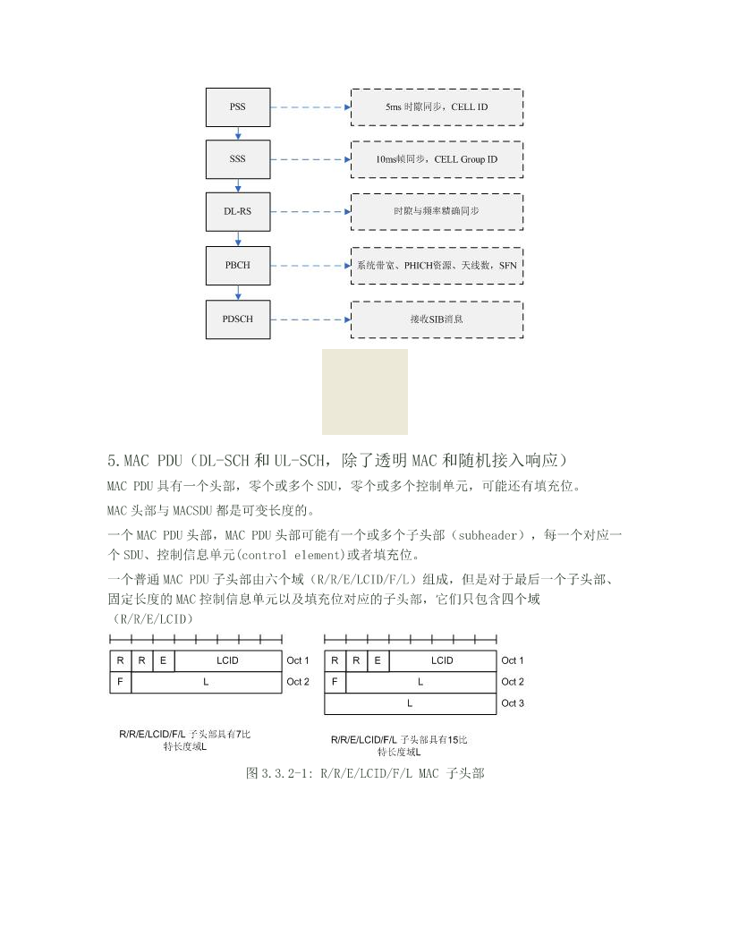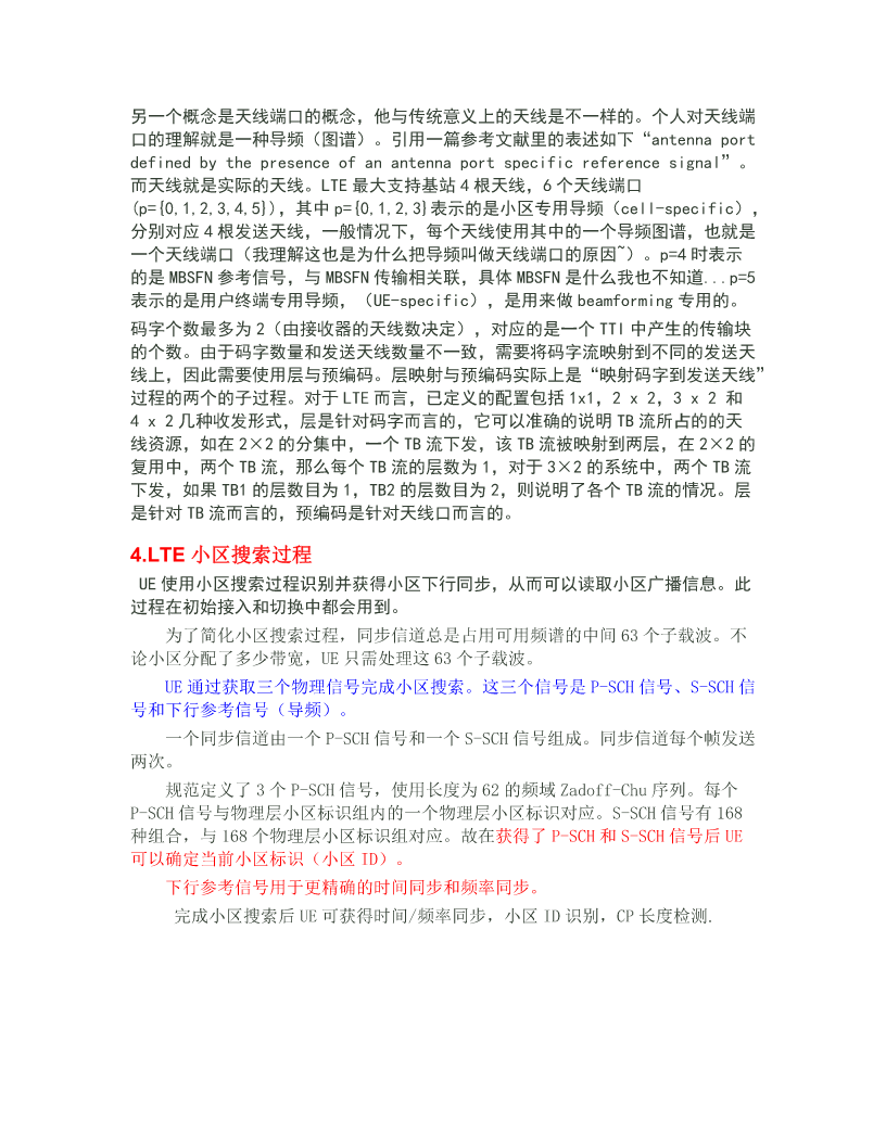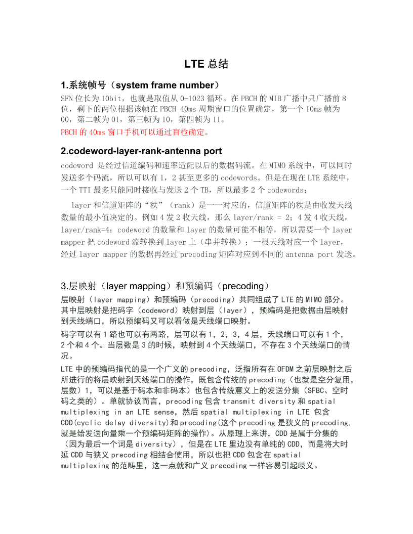 LTE总结 1.系统帧号(systemframenumber) SFN位长为10bit,也就是取值从0-1023循环。在PBCH的MIB广播中只广播前8 位,剩下的两位根据该帧在PBCH40ms周期窗口的位置确定,第一个10ms帧为 00,第二帧为01,第三帧为10,第四帧为11。 PBCH的40ms窗口手机可以通过盲检确定。 2.codeword-layer-rank-antennaport codeword是经过信道编码和速率适配以后的数据码流。在MIMO系统中,可以同时 发送多个码流,所以可以有1,2甚至更多的codewords。但是在现在LTE系统中, 一个TTI最多只能同时接收与发送2个TB,所以最多2个codewords; layer和信道矩阵的“秩”(rank)是一一对应的,信道矩阵的秩是由收发天线 数量的最小值决定的。例如4发2收天线,那么layer/rank=2;4发4收天线, layer/rank=4;codeword的数量和layer的数量可能不相等,所以需要一个layer mapper把codeword流转换到layer上(串并转换);一根天线对应一个layer, 经过layermapper的数据再经过precoding矩阵对应到不同的antennaport发送。 3.层映射(layermapping)和预编码(precoding) 层映射(layermapping)和预编码(precoding)共同组成了LTE的MIMO部分。 其中层映射是把码字(codeword)映射到层(layer),预编码是把数据由层映射 到天线端口,所以预编码又可以看做是天线端口映射。 码字可以有1路也可以有两路,层可以有1,2,3,4层,天线端口可以有1个, 2个和4个。当层数是3的时候,映射到4个天线端口,不存在3个天线端口的情 况。 LTE中的预编码指代的是一个广义的precoding,泛指所有在OFDM之前层映射之后 所进行的将层映射到天线端口的操作,既包含传统的precoding(也就是空分复用, 层数)1,可以是基于码本和非码本)也包含传统意义上的发送分集(SFBC、空时 码之类的)。单就协议而言,precoding包含transmitdiversity和spatial multiplexinginanLTEsense,然后spatialmultiplexinginLTE包含 CDD(cyclicdelaydiversity)和precoding(这个precoding是狭义的precoding, 就是给发送向量乘一个预编码矩阵的操作)。从原理上来讲,CDD是属于分集的 (因为最后一个词是diversity),但是在LTE里边没有单纯的CDD,而是将大时 延CDD与狭义precoding相结合使用,所以也把CDD包含在spatial multiplexing的范畴里,这一点就和广义precoding一样容易引起歧义。 另一个概念是天线端口的概念,他与传统意义上的天线是不一样的。个人对天线端 口的理解就是一种导频(图谱)。引用一篇参考文献里的表述如下“antennaport definedbythepresenceofanantennaportspecificreferencesignal”。 而天线就是实际的天线。LTE最大支持基站4根天线,6个天线端口 (p={0,1,2,3,4,5}),其中p={0,1,2,3}表示的是小区专用导频(cell-specific), 分别对应4根发送天线,一般情况下,每个天线使用其中的一个导频图谱,也就是 一个天线端口(我理解这也是为什么把导频叫做天线端口的原因~)。p=4时表示 的是MBSFN参考信号,与MBSFN传输相关联,具体MBSFN是什么我也不知道...p=5 表示的是用户终端专用导频,(UE-specific),是用来做beamforming专用的。 码字个数最多为2(由接收器的天线数决定),对应的是一个TTI中产生的传输块 的个数。由于码字数量和发送天线数量不一致,需要将码字流映射到不同的发送天 线上,因此需要使用层与预编码。层映射与预编码实际上是“映射码字到发送天线” 过程的两个的子过程。对于LTE而言,已定义的配置包括1x1,2x2,3x2和 4x2几种收发形式,层是针对码字而言的,它可以准确的说明TB流所占的的天 线资源,如在2×2的分集中,一个TB流下发,该TB流被映射到两层,在2×2的 复用中,两个TB流,那么每个TB流的层数为1,对于3×2的系统中,两个TB流 下发,如果TB1的层数目为1,TB2的层数目为2,则说明了各个TB流的情况。层 是针对TB流而言的,预编码是针对天线口而言的。 4.LTE小区搜索过程 UE使用小区搜索过程识别并获得小区