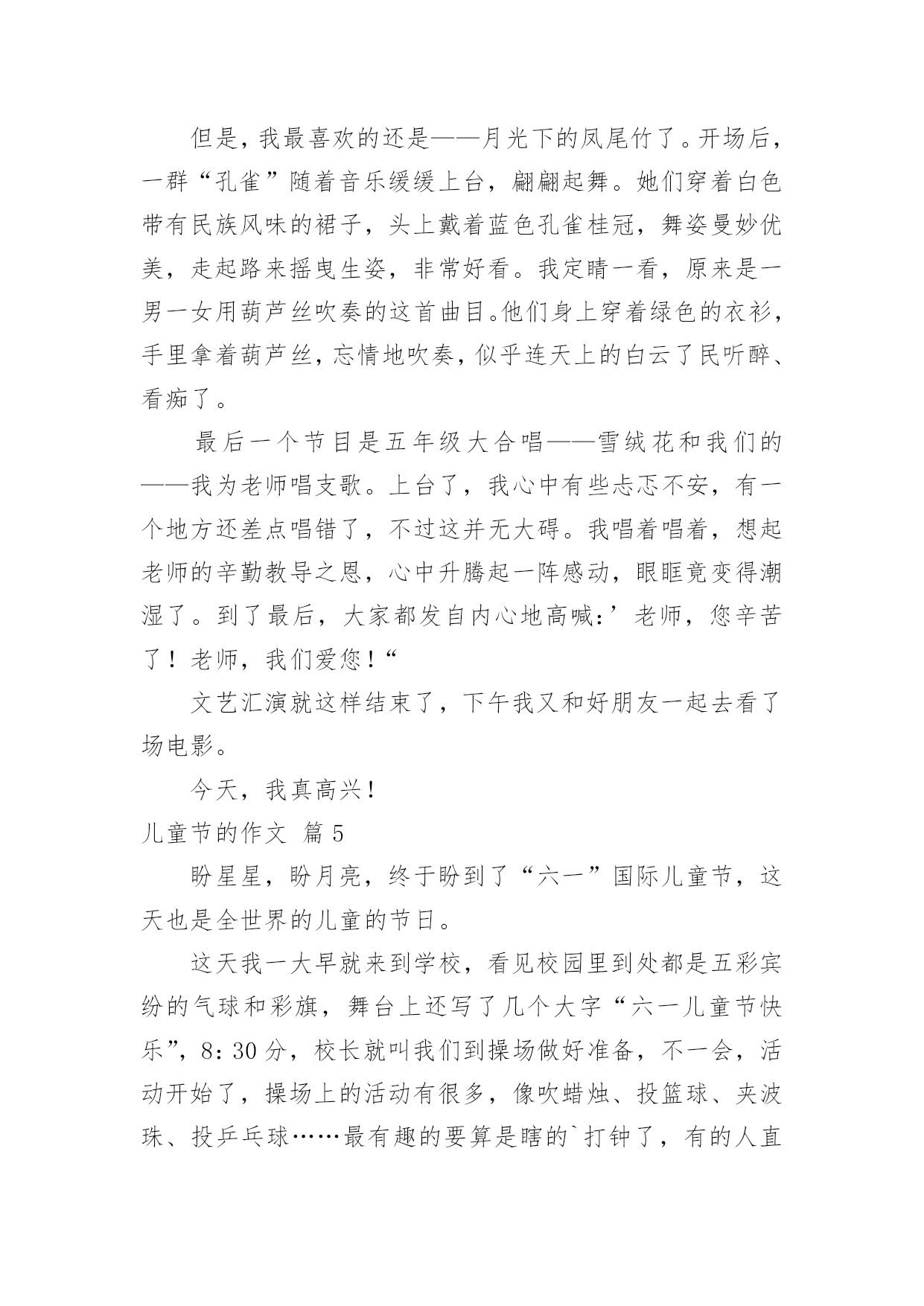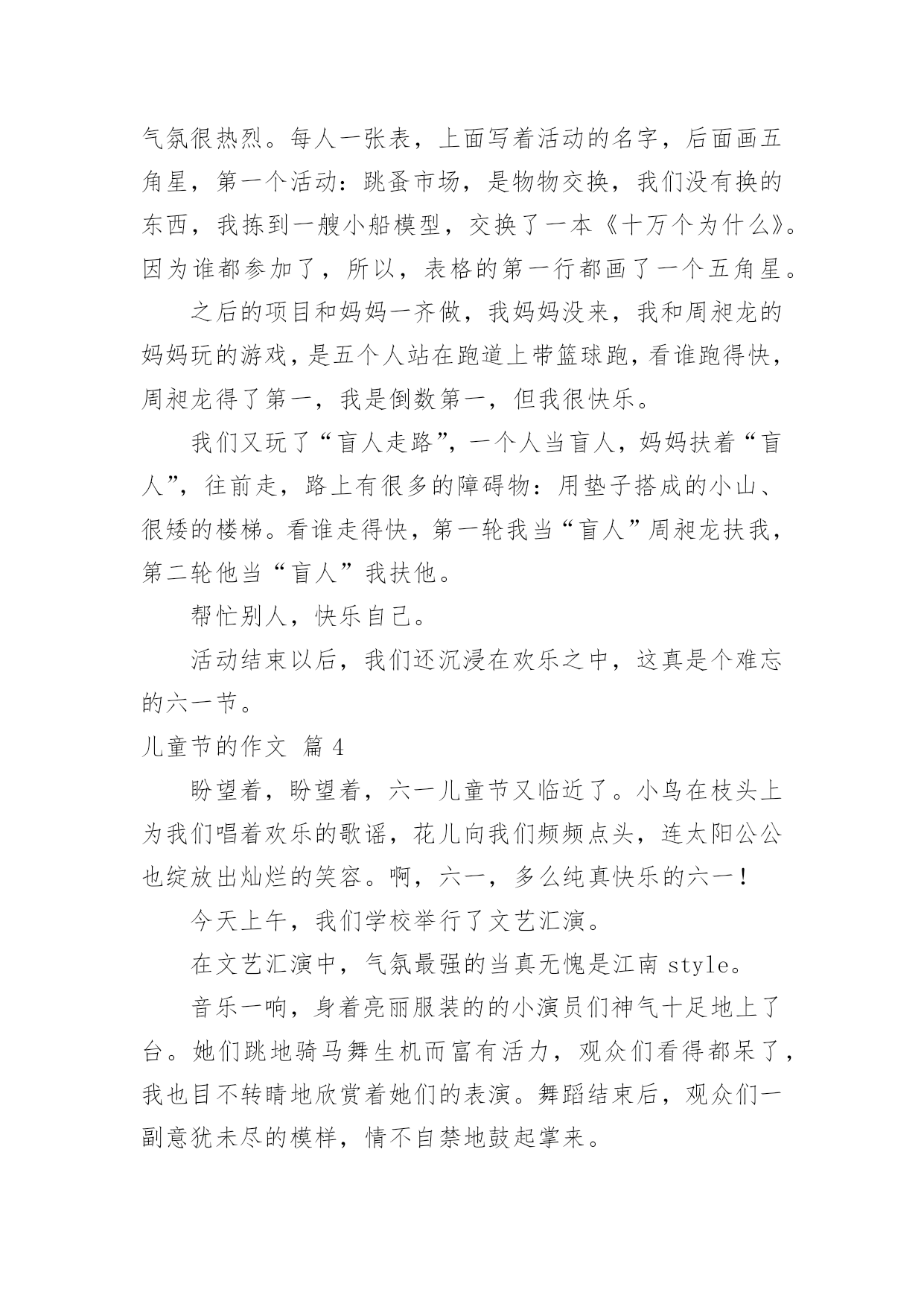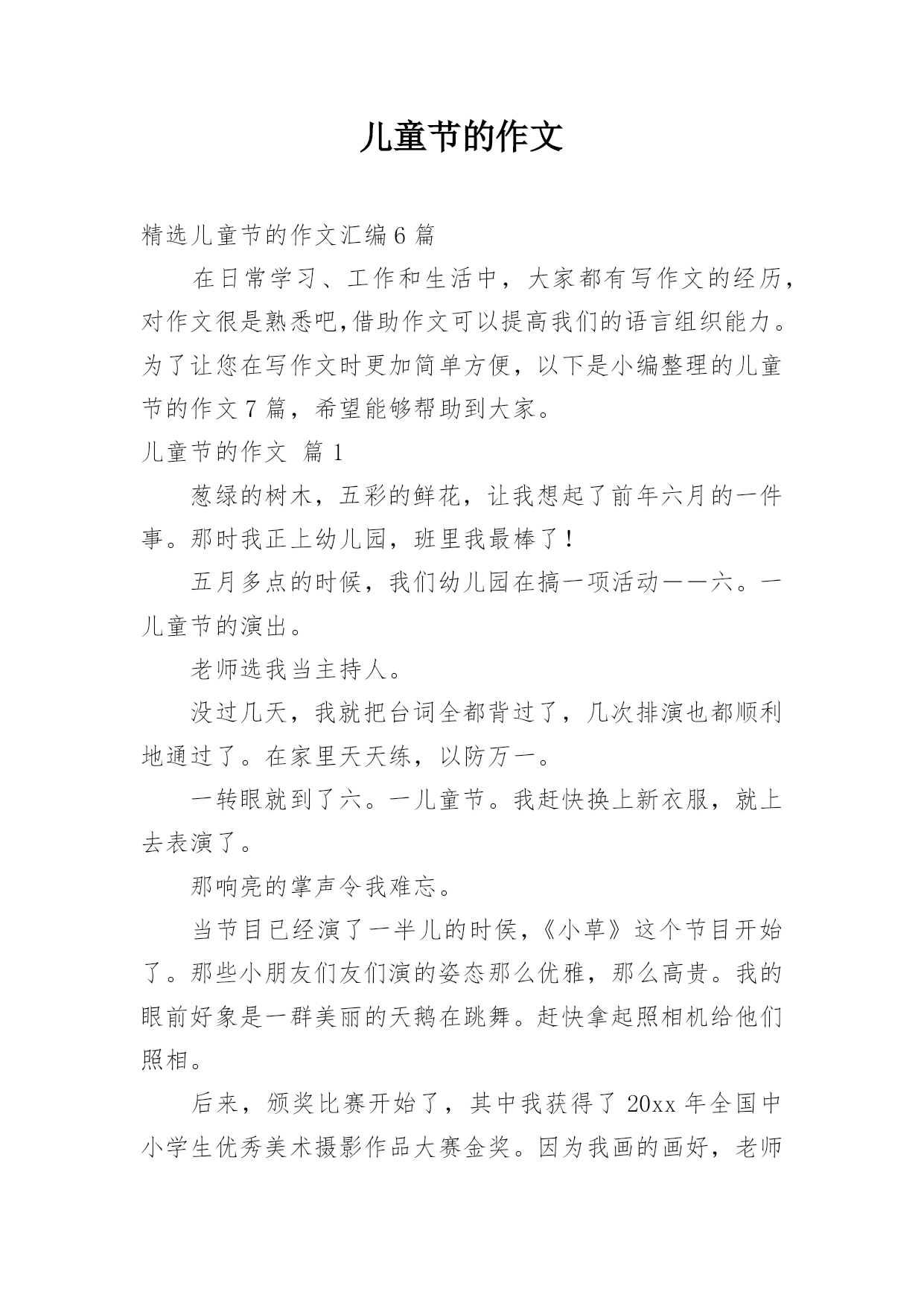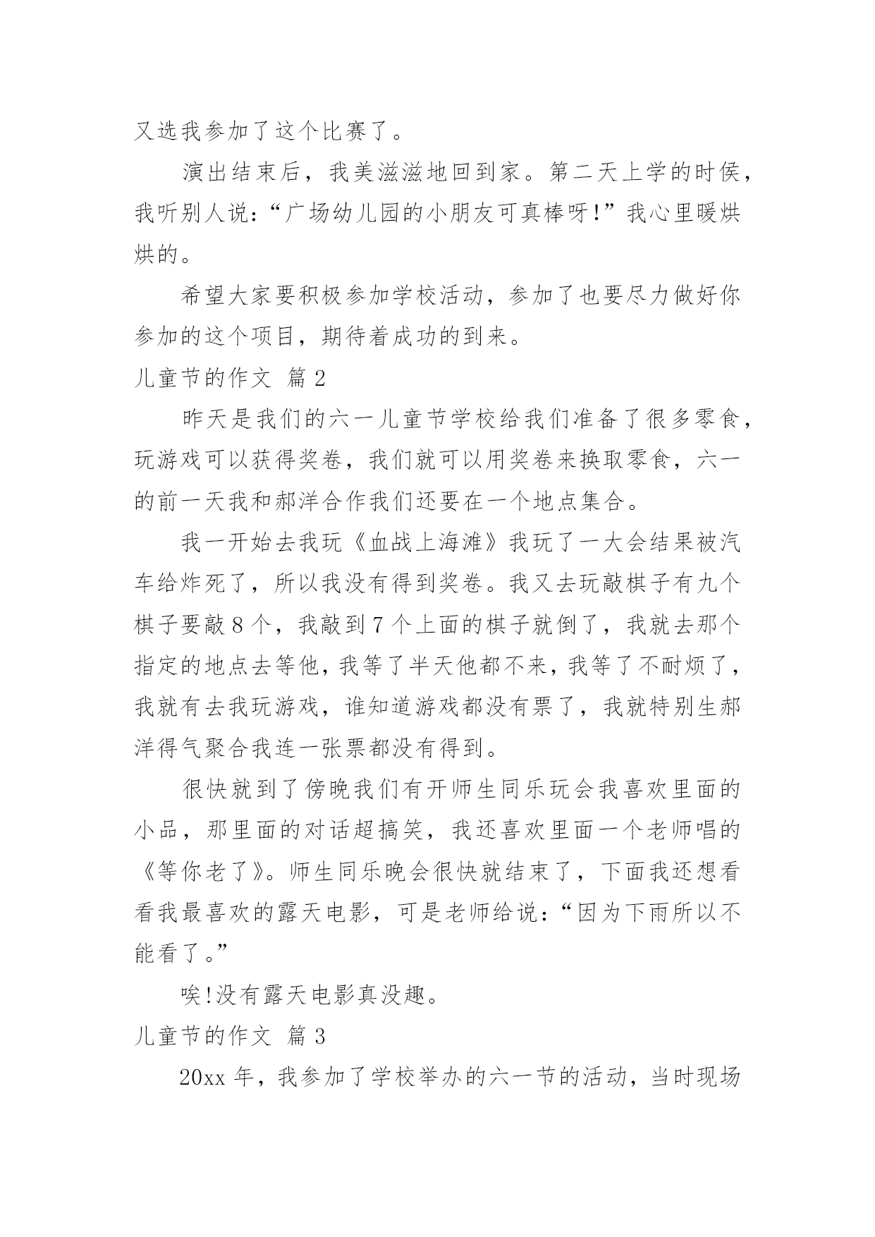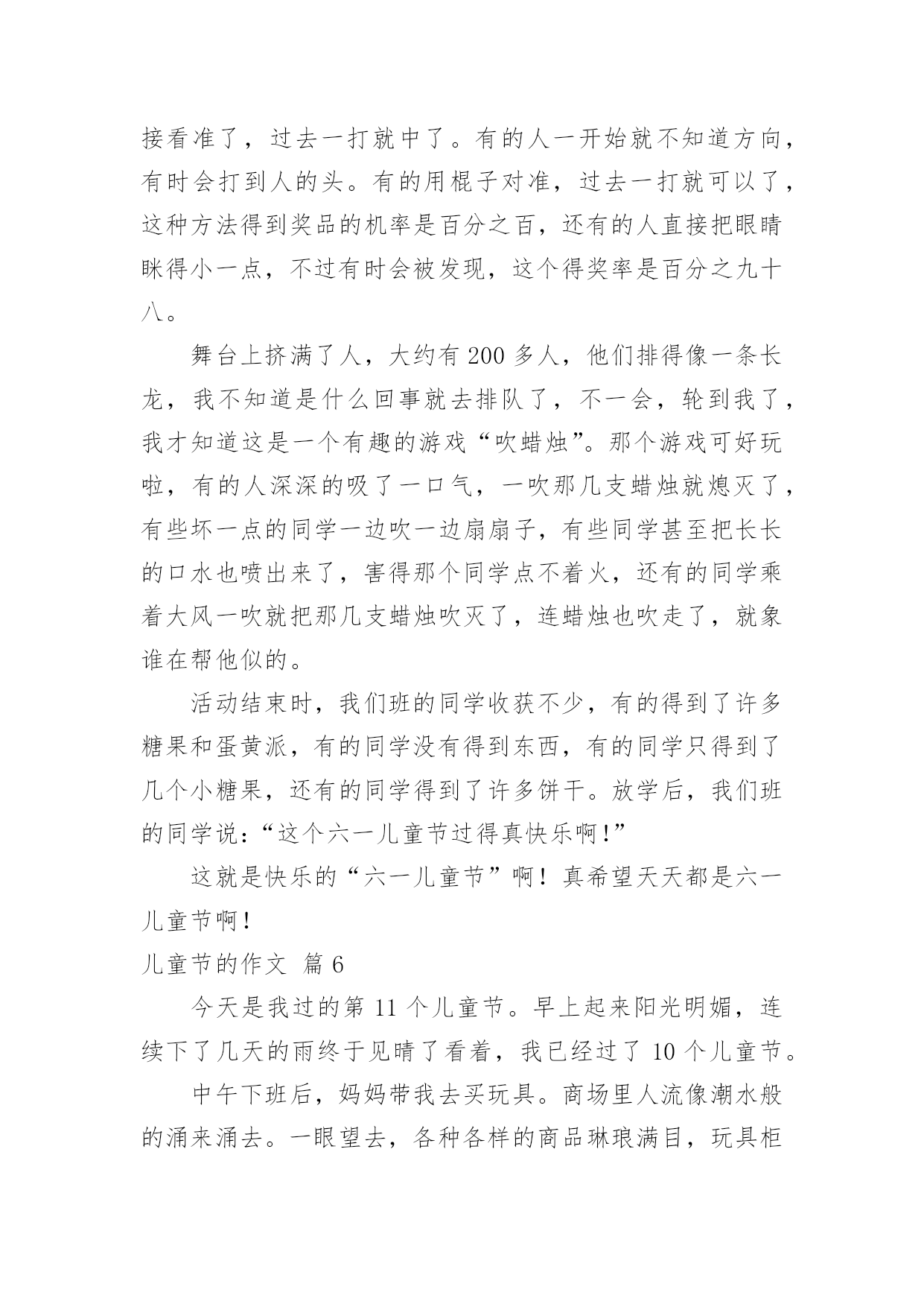 儿童节的作文 精选儿童节的作文汇编6篇在日常学习、工作和生活中,大家都有写作文的经历,对作文很是熟悉吧,借助作文可以提高我们的语言组织能力。为了让您在写作文时更加简单方便,以下是小编整理的儿童节的作文7篇,希望能够帮助到大家。儿童节的作文篇1葱绿的树木,五彩的鲜花,让我想起了前年六月的一件事。那时我正上幼儿园,班里我最棒了!五月多点的时候,我们幼儿园在搞一项活动--六。一儿童节的演出。老师选我当主持人。没过几天,我就把台词全都背过了,几次排演也都顺利地通过了。在家里天天练,以防万一。一转眼就到了六。一儿童节。我赶快换上新衣服,就上去表演了。那响亮的掌声令我难忘。当节目已经演了一半儿的时侯,《小草》这个节目开始了。那些小朋友们友们演的姿态那么优雅,那么高贵。我的眼前好象是一群美丽的天鹅在跳舞。赶快拿起照相机给他们照相。后来,颁奖比赛开始了,其中我获得了20xx年全国中小学生优秀美术摄影作品大赛金奖。因为我画的画好,老师又选我参加了这个比赛了。演出结束后,我美滋滋地回到家。第二天上学的时侯,我听别人说:“广场幼儿园的小朋友可真棒呀!”我心里暖烘烘的。希望大家要积极参加学校活动,参加了也要尽力做好你参加的这个项目,期待着成功的到来。儿童节的作文篇2昨天是我们的六一儿童节学校给我们准备了很多零食,玩游戏可以获得奖卷,我们就可以用奖卷来换取零食,六一的前一天我和郝洋合作我们还要在一个地点集合。我一开始去我玩《血战上海滩》我玩了一大会结果被汽车给炸死了,所以我没有得到奖卷。我又去玩敲棋子有九个棋子要敲8个,我敲到7个上面的棋子就倒了,我就去那个指定的地点去等他,我等了半天他都不来,我等了不耐烦了,我就有去我玩游戏,谁知道游戏都没有票了,我就特别生郝洋得气聚合我连一张票都没有得到。很快就到了傍晚我们有开师生同乐玩会我喜欢里面的小品,那里面的对话超搞笑,我还喜欢里面一个老师唱的《等你老了》。师生同乐晚会很快就结束了,下面我还想看看我最喜欢的露天电影,可是老师给说:“因为下雨所以不能看了。”唉!没有露天电影真没趣。儿童节的作文篇320xx年,我参加了学校举办的六一节的活动,当时现场气氛很热烈。每人一张表,上面写着活动的名字,后面画五角星,第一个活动:跳蚤市场,是物物交换,我们没有换的东西,我拣到一艘小船模型,交换了一本《十万个为什么》。因为谁都参加了,所以,表格的第一行都画了一个五角星。之后的项目和妈妈一齐做,我妈妈没来,我和周昶龙的妈妈玩的游戏,是五个人站在跑道上带篮球跑,看谁跑得快,周昶龙得了第一,我是倒数第一,但我很快乐。我们又玩了“盲人走路”,一个人当盲人,妈妈扶着“盲人”,往前走,路上有很多的障碍物:用垫子搭成的小山、很矮的楼梯。看谁走得快,第一轮我当“盲人”周昶龙扶我,第二轮他当“盲人”我扶他。帮忙别人,快乐自己。活动结束以后,我们还沉浸在欢乐之中,这真是个难忘的六一节。儿童节的作文篇4盼望着,盼望着,六一儿童节又临近了。小鸟在枝头上为我们唱着欢乐的歌谣,花儿向我们频频点头,连太阳公公也绽放出灿烂的笑容。啊,六一,多么纯真快乐的六一!今天上午,我们学校举行了文艺汇演。在文艺汇演中,气氛最强的当真无愧是江南style。音乐一响,身着亮丽服装的的小演员们神气十足地上了台。她们跳地骑马舞生机而富有活力,观众们看得都呆了,我也目不转睛地欣赏着她们的表演。舞蹈结束后,观众们一副意犹未尽的模样,情不自禁地鼓起掌来。但是,我最喜欢的还是——月光下的凤尾竹了。开场后,一群“孔雀”随着音乐缓缓上台,翩翩起舞。她们穿着白色带有民族风味的裙子,头上戴着蓝色孔雀桂冠,舞姿曼妙优美,走起路来摇曳生姿,非常好看。我定睛一看,原来是一男一女用葫芦丝吹奏的这首曲目。他们身上穿着绿色的衣衫,手里拿着葫芦丝,忘情地吹奏,似乎连天上的白云了民听醉、看痴了。最后一个节目是五年级大合唱——雪绒花和我们的——我为老师唱支歌。上台了,我心中有些忐忑不安,有一个地方还差点唱错了,不过这并无大碍。我唱着唱着,想起老师的辛勤教导之恩,心中升腾起一阵感动,眼眶竟变得潮湿了。到了最后,大家都发自内心地高喊:’老师,您辛苦了!老师,我们爱您!“文艺汇演就这样结束了,下午我又和好朋友一起去看了场电影。今天,我真高兴!儿童节的作文篇5盼星星,盼月亮,终于盼到了“六一”国际儿童节,这天也是全世界的儿童的节日。这天我一大早就来到学校,看见校园里到处都是五彩宾纷的气球和彩旗,舞台上还写了几个大字“六一儿童节快乐”,8:30分,校长就叫我们到操场做好准备,不一会,活动开始了,操场上的活动有很多,像吹蜡烛、投篮球、夹波珠、投乒乓球……最有趣的要算是瞎的`打钟了,有的人直接看准了,过去一打就中了。有的人一开始就不知道方向,有时会打到人的头。有的用棍子对准,过去一打就可以了,这种方法得到奖品的机率是百分之