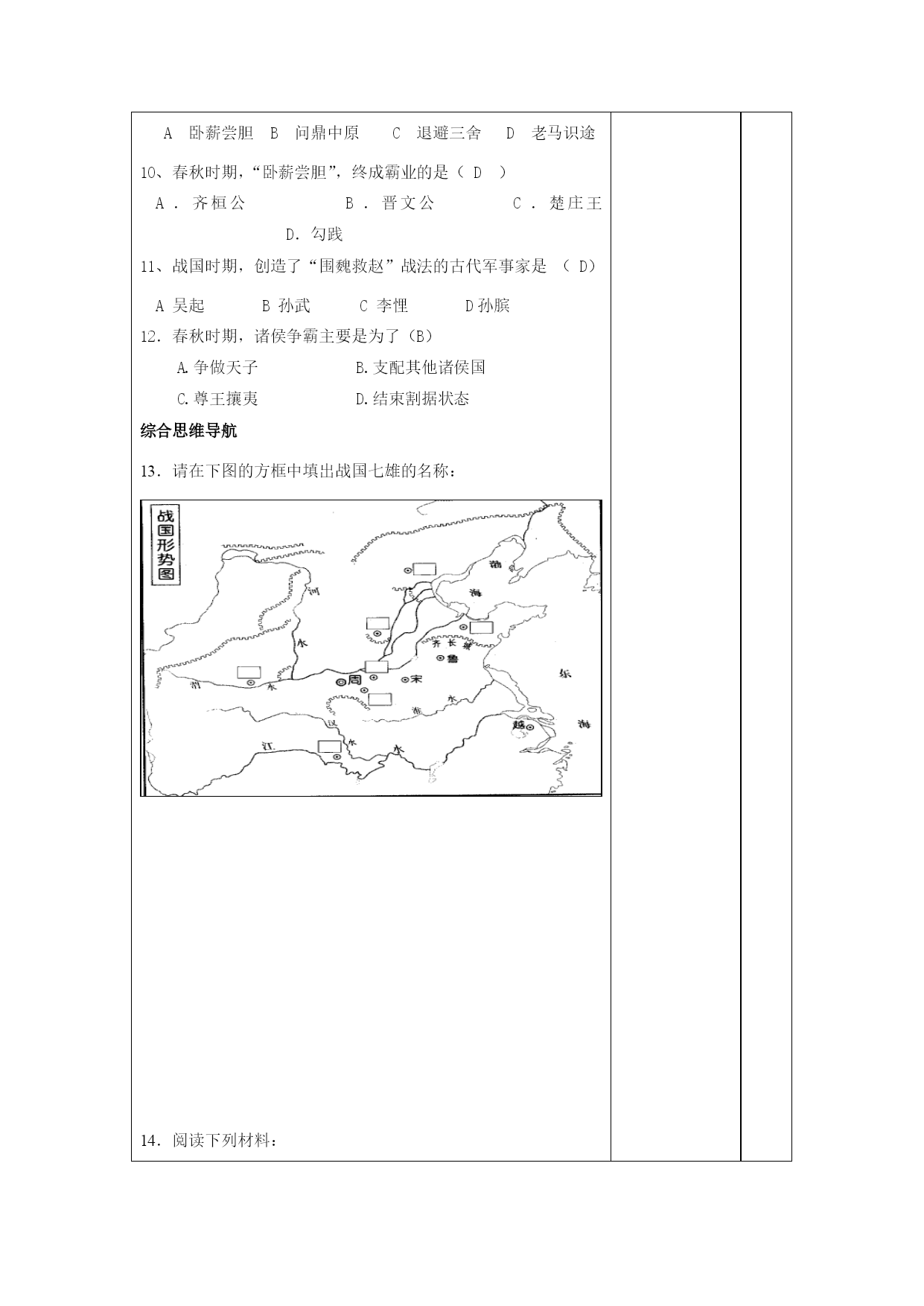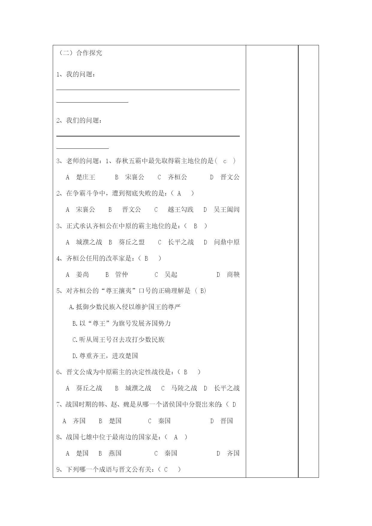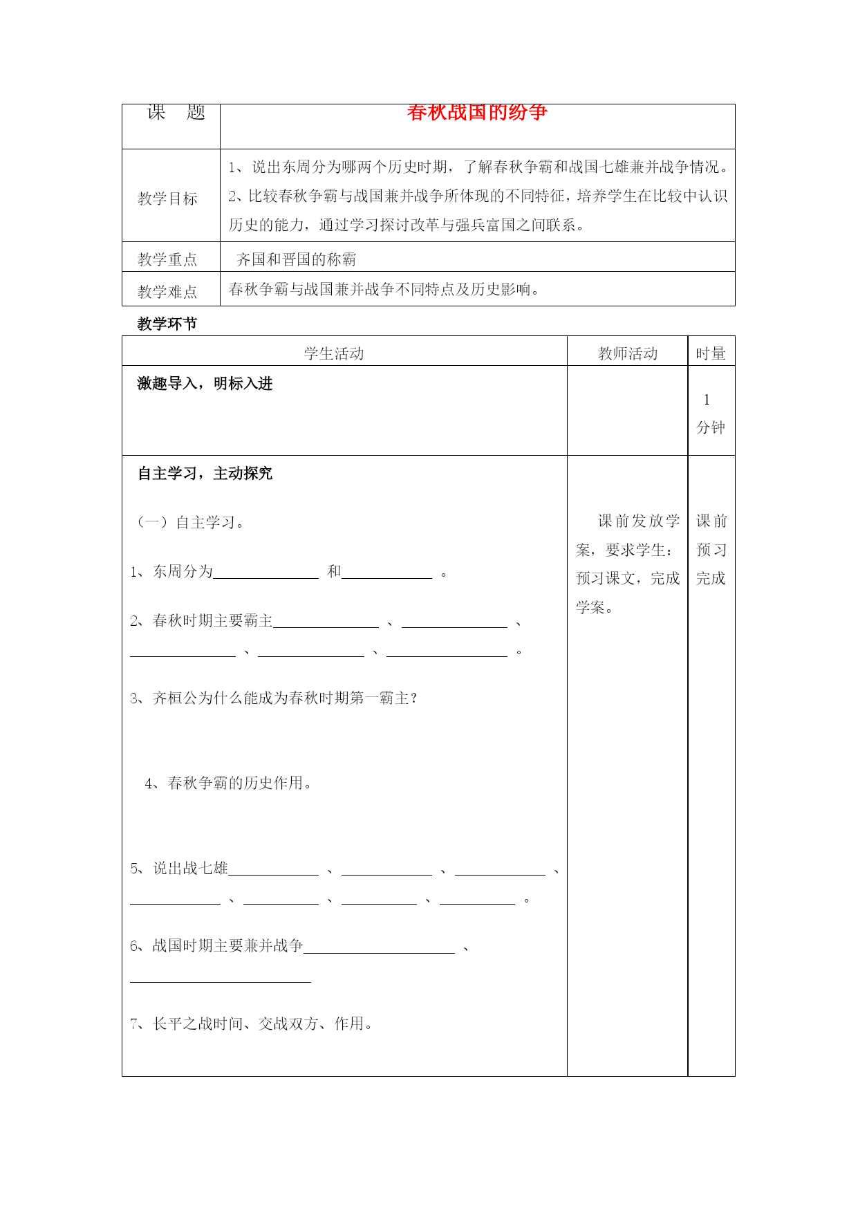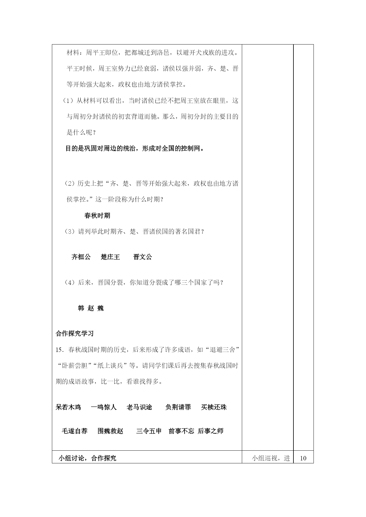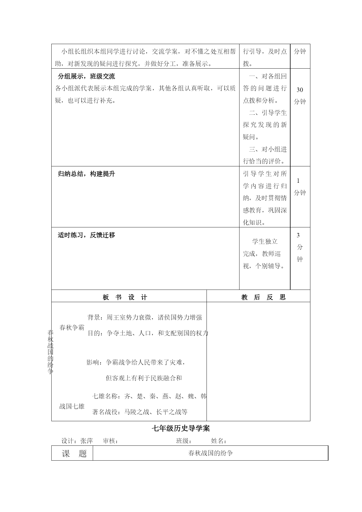 课题春秋战国的纷争教学目标1、说出东周分为哪两个历史时期,了解春秋争霸和战国七雄兼并战争情况。2、比较春秋争霸与战国兼并战争所体现的不同特征,培养学生在比较中认识历史的能力,通过学习探讨改革与强兵富国之间联系。教学重点齐国和晋国的称霸教学难点春秋争霸与战国兼并战争不同特点及历史影响。教学环节 学生活动教师活动时量激趣导入,明标入进 1 分钟自主学习,主动探究 (一)自主学习。 1、东周分为和。 2、春秋时期主要霸主、、、、。 3、齐桓公为什么能成为春秋时期第一霸主? 4、春秋争霸的历史作用。 5、说出战七雄、、、、、、。 6、战国时期主要兼并战争、 7、长平之战时间、交战双方、作用。 (二)合作探究 1、我的问题: 2、我们的问题: 3、老师的问题:1、春秋五霸中最先取得霸主地位的是(c) A楚庄王B宋襄公C齐桓公D晋文公 2、在争霸斗争中,遭到彻底失败的是:(A) A宋襄公B晋文公C越王勾践D吴王阖闾 3、正式承认齐桓公在中原的霸主地位的是:(B) A城濮之战B葵丘之盟C长平之战D问鼎中原 4、齐桓公任用的改革家是:(B) A姜尚B管仲C吴起D商鞅 5、对齐桓公的“尊王攘夷”口号的正确理解是(B) A.抵御少数民族入侵以维护国王的尊严 B.以“尊王”为旗号发展齐国势力 C.听从周王号召去攻打少数民族 D.尊重齐王,进攻楚国 6、晋文公成为中原霸主的决定性战役是:(B) A葵丘之战B城濮之战C马陵之战D长平之战 7、战国时期的韩、赵、魏是从哪一个诸侯国中分裂出来的:(D) A齐国B楚国C秦国D晋国 8、战国七雄中位于最南边的国家是:(A) A楚国B燕国C秦国D齐国 9、下列哪一个成语与晋文公有关:(C) A卧薪尝胆B问鼎中原C退避三舍D老马识途 10、春秋时期,“卧薪尝胆”,终成霸业的是(D) A.齐桓公B.晋文公C.楚庄王D.勾践 11、战国时期,创造了“围魏救赵”战法的古代军事家是(D) A吴起B孙武C李悝D孙膑 12.春秋时期,诸侯争霸主要是为了(B) A.争做天子B.支配其他诸侯国 C.尊王攘夷D.结束割据状态 综合思维导航 13.请在下图的方框中填出战国七雄的名称: 14.阅读下列材料: 1、材料:周平王即位,把都城迁到洛邑,以避开犬戎族的进攻。平王时候,周王室势力已经衰弱,诸侯以强并弱,齐、楚、晋等开始强大起来,政权也由地方诸侯掌控。 (1)从材料可以看出,当时诸侯已经不把周王室放在眼里,这与周初分封诸侯的初衷背道而驰。那么,周初分封的主要目的是什么呢? 目的是巩固对周边的统治,形成对全国的控制网。 (2)历史上把“齐、楚、晋等开始强大起来,政权也由地方诸侯掌控。”这一阶段称为什么时期? 春秋时期 (3)请列举此时期齐、楚、晋诸侯国的著名国君? 齐桓公楚庄王晋文公 (4)后来,晋国分裂,你知道分裂成了哪三个国家了吗? 韩赵魏 合作探究学习 15.春秋战国时期的历史,后来形成了许多成语,如“退避三舍”“卧薪尝胆”“纸上谈兵”等。请同学们课后再去搜集春秋战国时期的成语故事,比一比,看谁找得多。 呆若木鸡一鸣惊人老马识途负荆请罪买椟还珠 毛遂自荐围魏救赵三令五申前事不忘后事之师 课前发放学案,要求学生:预习课文,完成学案。 课前预习完成小组讨论,合作探究 小组长组织本组同学进行讨论,交流学案,对不懂之处互相帮助,对新发现的疑问进行探究,并做好分工,准备展示。小组巡视,进行引导,及时点拨。10 分钟分组展示,班级交流 各小组派代表展示本组完成的学案,其他各组认真听取,可以质疑,也可以进行补充。一、对各组回答的问题进行点拨和分析。 二、引导学生探究发现的新疑问。 三、对小组进行恰当的评价。 30分钟归纳总结,构建提升 引导学生对所学内容进行归纳,及时贯彻情感教育,巩固深化知识。 1 分钟适时练习,反馈迁移 学生独立完成,教师巡视,个别辅导。 3分 钟板书设计教后反思背景:周王室势力衰微,诸侯国势力增强 目的:争夺土地、人口,和支配别国的权力 春秋争霸 春秋战国的纷争 影响:争霸战争给人民带来了灾难, 但客观上有利于民族融合和 国家走上统一 七雄名称:齐、楚、秦、燕、赵、魏、韩 著名战役:马陵之战、长平之战等 战国七雄 七年级历史导学案 设计:张萍审核:班级:姓名: 课题春秋战国的纷争 学习目标1、说出东周分为哪两个历史时期,了解春秋争霸和战国七雄兼并战争情况。2、比较春秋争霸与战国兼并战争所体现的不同特征,培养学生在比较中认识历史的能力,通过学习探讨改革与强兵富国之间联系。学习重点齐国和晋国的称霸学习难点春秋争霸与战国兼并战争不同特点及历史影响。学习环节学生活动激趣导入,明标入进自主学习,主动探究 1、东周分为和。 2、春秋时期主要霸主、、、、。 3