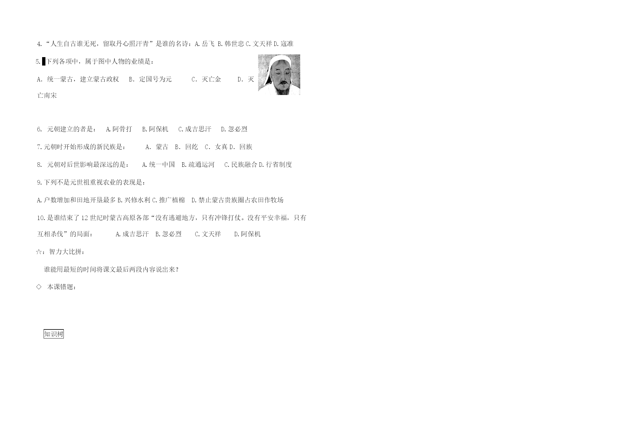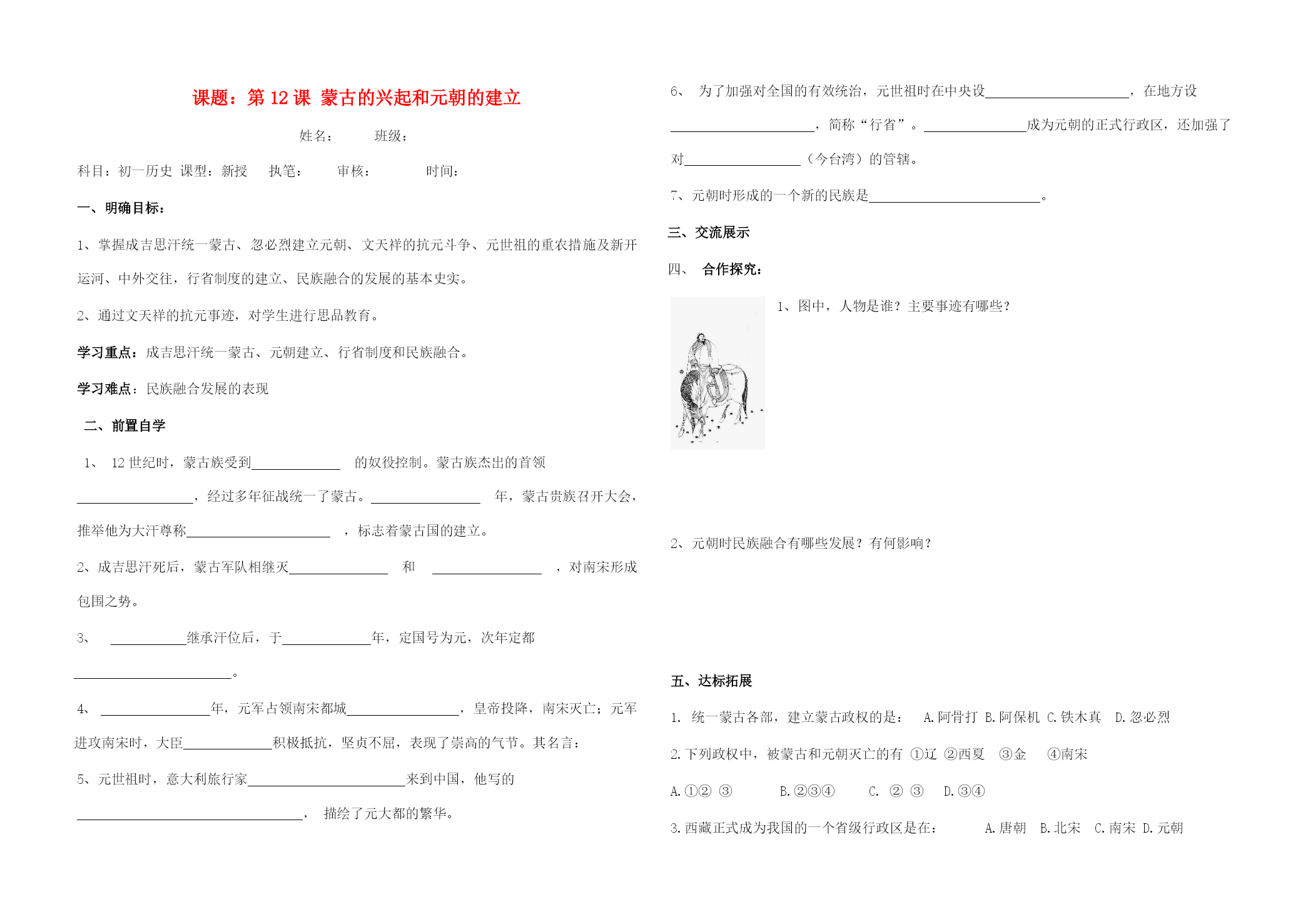 课题:第12课蒙古的兴起和元朝的建立 姓名:班级: 科目:初一历史课型:新授执笔:审核:时间: 一、明确目标: 1、掌握成吉思汗统一蒙古、忽必烈建立元朝、文天祥的抗元斗争、元世祖的重农措施及新开运河、中外交往,行省制度的建立、民族融合的发展的基本史实。www.zk5u.com中考资源网 2、通过文天祥的抗元事迹,对学生进行思品教育。www.zk5u.com中考资源网 学习重点:成吉思汗统一蒙古、元朝建立、行省制度和民族融合。www.zk5u.com中考资源网www.zk5u.com中考资源网 学习难点:民族融合发展的表现 二、前置自学 1、12世纪时,蒙古族受到的奴役控制。www.zk5u.com中考资源网蒙古族杰出的首领,经过多年征战统一了蒙古。www.zk5u.com中考资源网年,蒙古贵族召开大会,推举他为大汗尊称,标志着蒙古国的建立。www.zk5u.com中考资源网 2、成吉思汗死后,蒙古军队相继灭和,对南宋形成包围之势。www.zk5u.com中考资源网 3、继承汗位后,于年,定国号为元,次年定都。www.zk5u.com中考资源网 4、年,元军占领南宋都城,皇帝投降,南宋灭亡;元军进攻南宋时,大臣积极抵抗,坚贞不屈,表现了崇高的气节。www.zk5u.com中考资源网其名言: 5、元世祖时,意大利旅行家来到中国,他写的,描绘了元大都的繁华。www.zk5u.com中考资源网 6、为了加强对全国的有效统治,元世祖时在中央设,在地方设,简称“行省”。www.zk5u.com中考资源网成为元朝的正式行政区,还加强了对(今台湾)www.zk5u.com中考资源网的管辖。www.zk5u.com中考资源网 7、元朝时形成的一个新的民族是。www.zk5u.com中考资源网 三、交流展示 四、合作探究: 1、图中,人物是谁?主要事迹有哪些? 2、元朝时民族融合有哪些发展?有何影响? 五、达标拓展 1.统一蒙古各部,建立蒙古政权的是:A.阿骨打B.阿保机C.铁木真D.忽必烈 2.下列政权中,被蒙古和元朝灭亡的有①辽②西夏③金④南宋 A.①②③B.②③④C.②③D.③④ 3.西藏正式成为我国的一个省级行政区是在:A.唐朝B.北宋C.南宋D.元朝 4.“人生自古谁无死,留取丹心照汗青”是谁的名诗:A.岳飞B.韩世忠C.文天祥D.寇准 5.下列各项中,属于图中人物的业绩是: A.统一蒙古,建立蒙古政权B.定国号为元C.灭亡金D.灭亡南宋 6.元朝建立的者是:A.阿骨打B.阿保机C.成吉思汗D.忽必烈 7.元朝时开始形成的新民族是:A.蒙古B.回纥C.女真D.回族 8.元朝对后世影响最深远的是:A.统一中国B.疏通运河C.民族融合D.行省制度 9.下列不是元世祖重视农业的表现是: A.户数增加和田地开垦最多B.兴修水利C.推广植棉D.禁止蒙古贵族圈占农田作牧场 10.是谁结束了12世纪时蒙古高原各部“没有逃避地方,只有冲锋打仗。www.zk5u.com中考资源网没有平安幸福,只有互相杀伐”的局面:A.成吉思汗B.忽必烈C.文天祥D.阿保机 ☆:智力大比拼: 谁能用最短的时间将课文最后两段内容说出来? 本课错题: 知识树