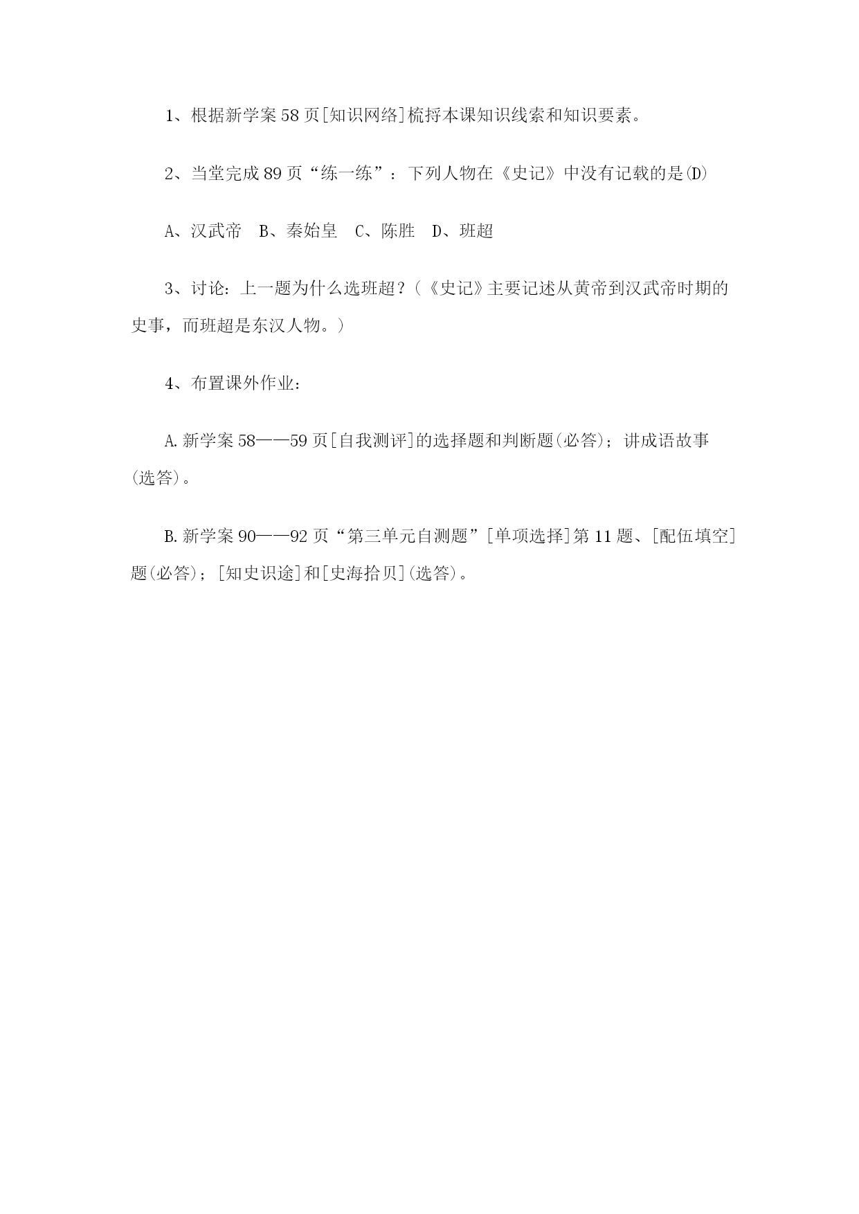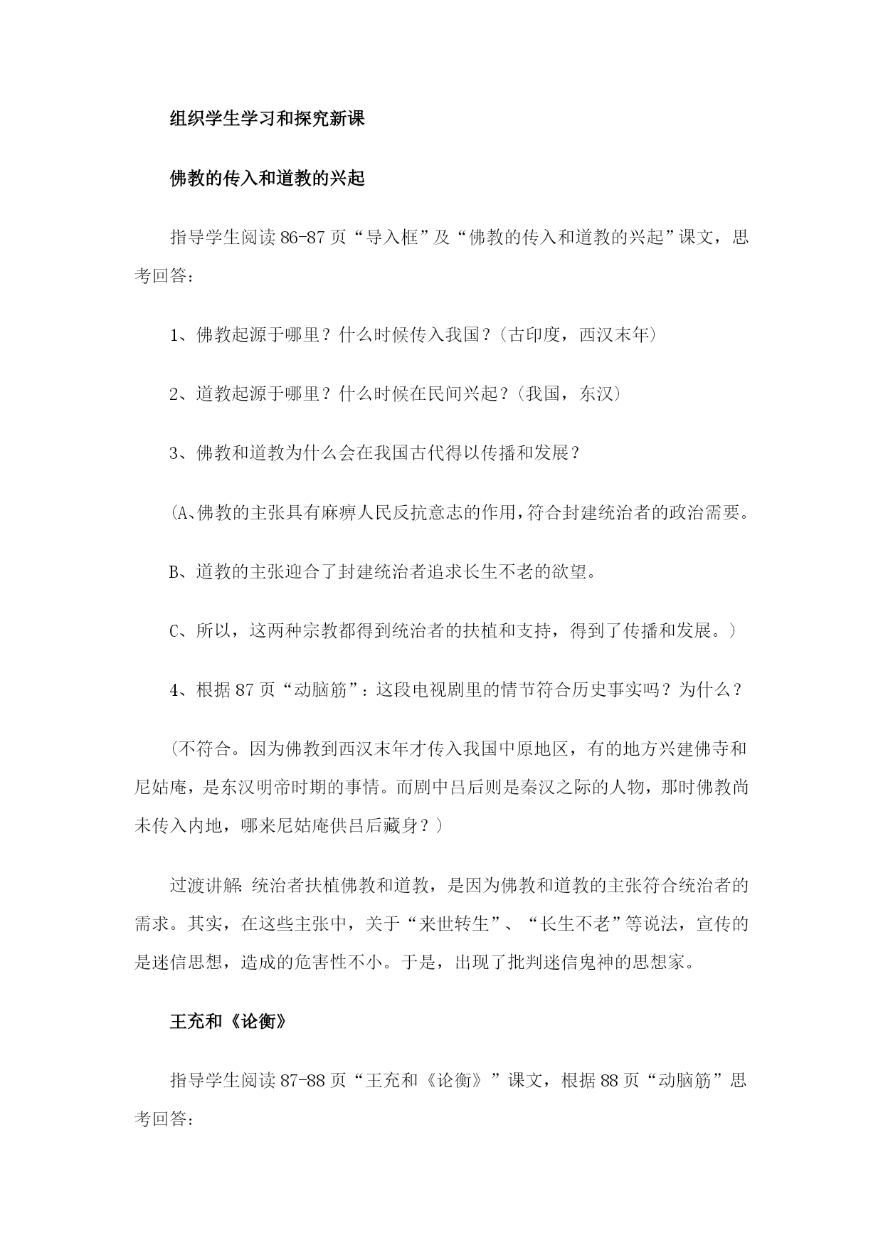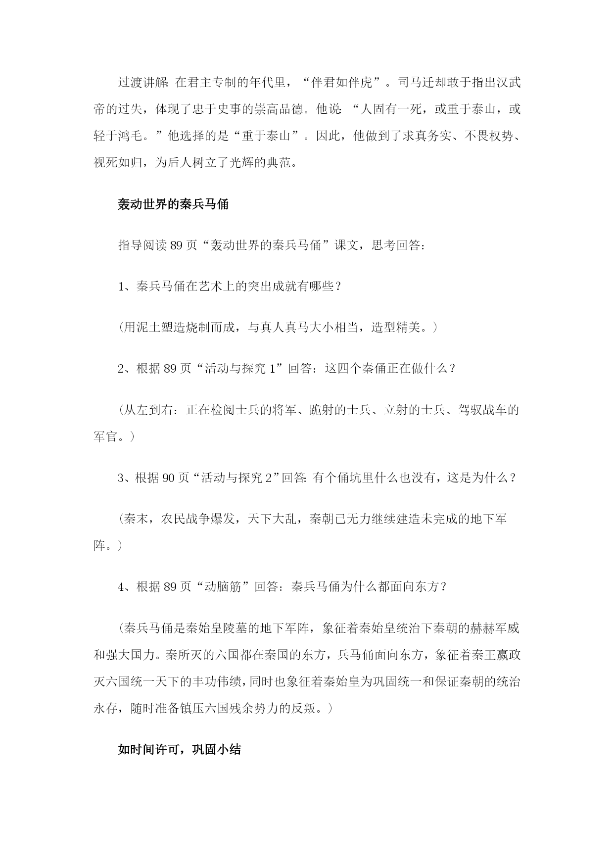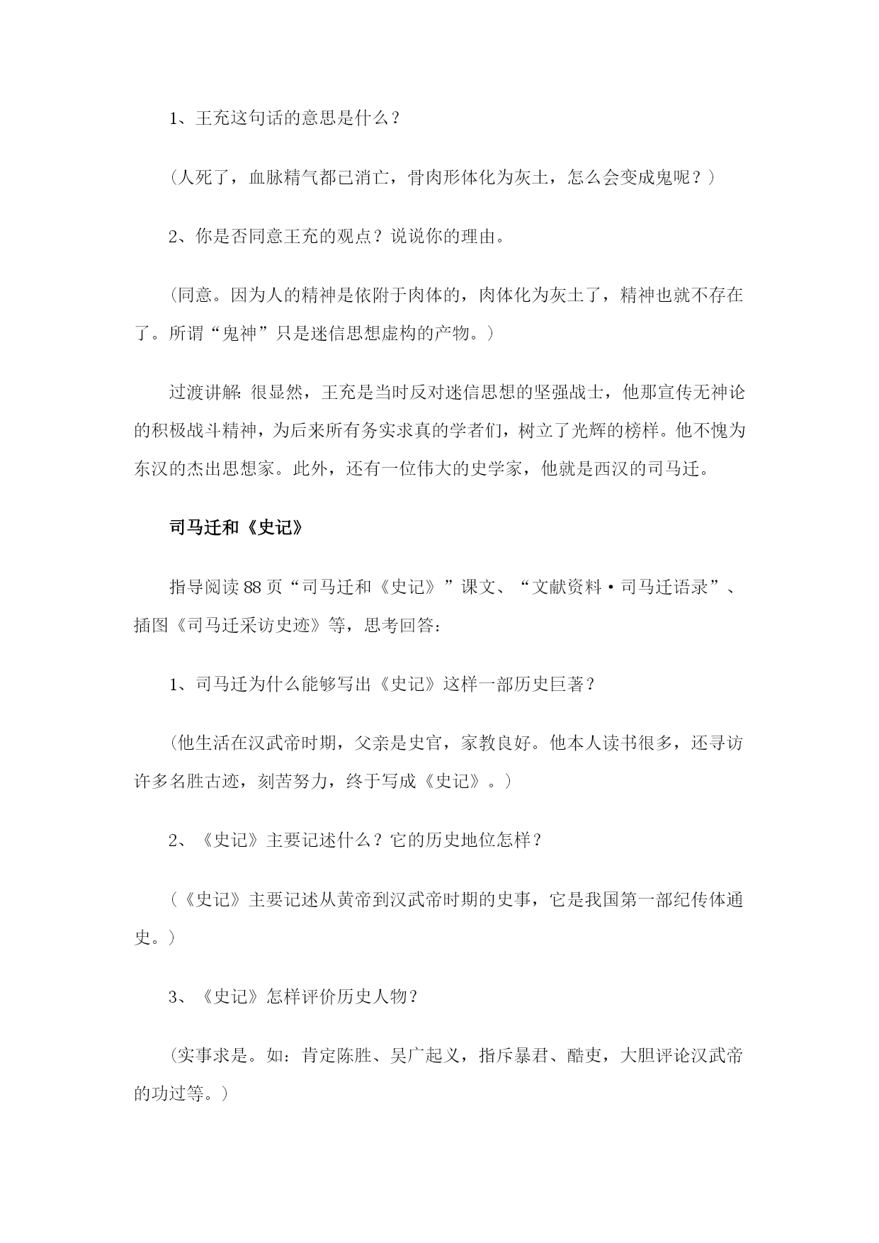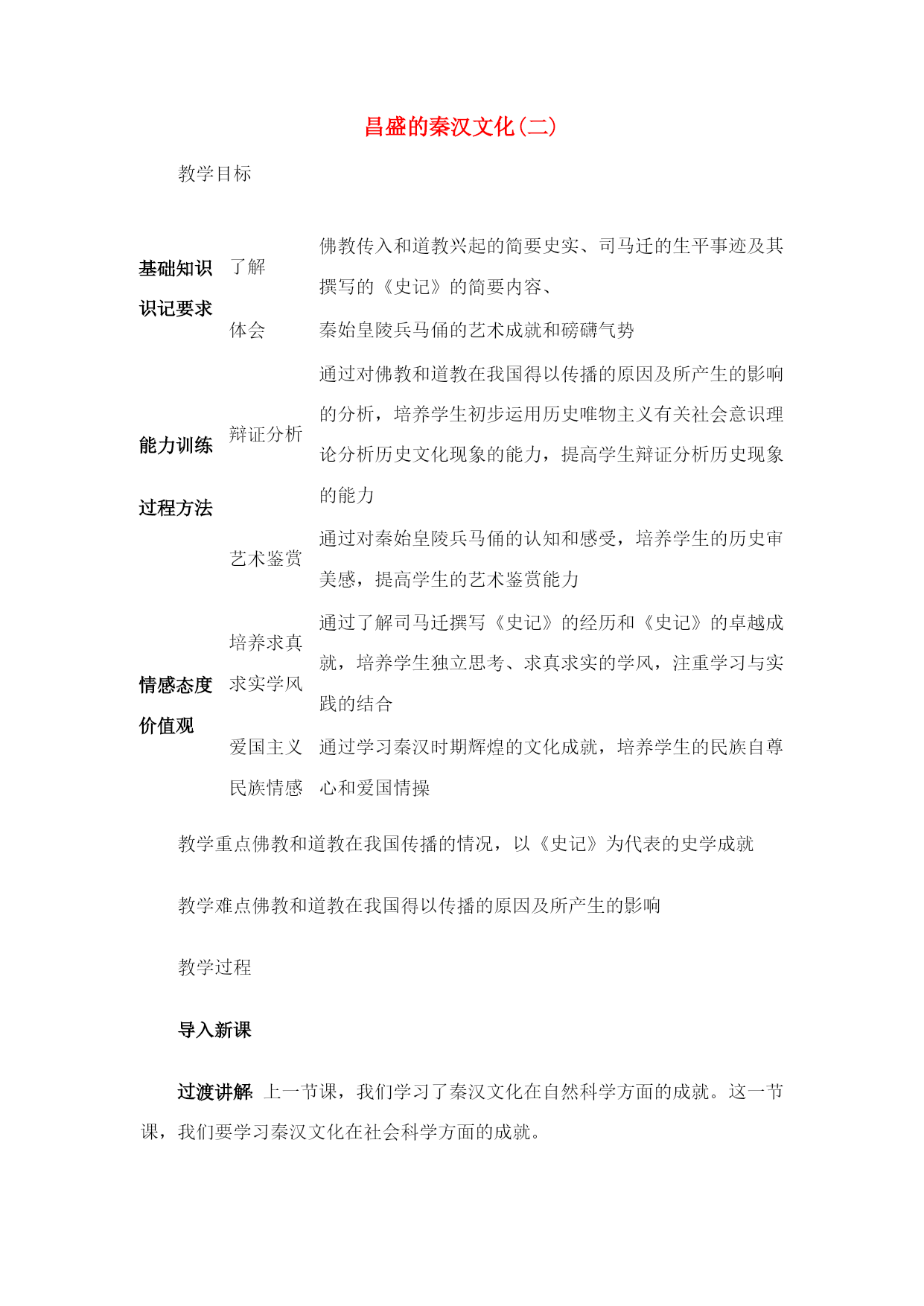 昌盛的秦汉文化(二) 教学目标 基础知识识记要求了解佛教传入和道教兴起的简要史实、司马迁的生平事迹及其撰写的《史记》的简要内容、体会秦始皇陵兵马俑的艺术成就和磅礴气势能力训练 过程方法辩证分析通过对佛教和道教在我国得以传播的原因及所产生的影响的分析,培养学生初步运用历史唯物主义有关社会意识理论分析历史文化现象的能力,提高学生辩证分析历史现象的能力艺术鉴赏通过对秦始皇陵兵马俑的认知和感受,培养学生的历史审美感,提高学生的艺术鉴赏能力情感态度价值观培养求真求实学风通过了解司马迁撰写《史记》的经历和《史记》的卓越成就,培养学生独立思考、求真求实的学风,注重学习与实践的结合爱国主义民族情感通过学习秦汉时期辉煌的文化成就,培养学生的民族自尊心和爱国情操教学重点佛教和道教在我国传播的情况,以《史记》为代表的史学成就 教学难点佛教和道教在我国得以传播的原因及所产生的影响 教学过程 导入新课 过渡讲解:上一节课,我们学习了秦汉文化在自然科学方面的成就。这一节课,我们要学习秦汉文化在社会科学方面的成就。 组织学生学习和探究新课 佛教的传入和道教的兴起 指导学生阅读86-87页“导入框”及“佛教的传入和道教的兴起”课文,思考回答: 1、佛教起源于哪里?什么时候传入我国?(古印度,西汉末年) 2、道教起源于哪里?什么时候在民间兴起?(我国,东汉) 3、佛教和道教为什么会在我国古代得以传播和发展? (A、佛教的主张具有麻痹人民反抗意志的作用,符合封建统治者的政治需要。 B、道教的主张迎合了封建统治者追求长生不老的欲望。 C、所以,这两种宗教都得到统治者的扶植和支持,得到了传播和发展。) 4、根据87页“动脑筋”:这段电视剧里的情节符合历史事实吗?为什么? (不符合。因为佛教到西汉末年才传入我国中原地区,有的地方兴建佛寺和尼姑庵,是东汉明帝时期的事情。而剧中吕后则是秦汉之际的人物,那时佛教尚未传入内地,哪来尼姑庵供吕后藏身?) 过渡讲解:统治者扶植佛教和道教,是因为佛教和道教的主张符合统治者的需求。其实,在这些主张中,关于“来世转生”、“长生不老”等说法,宣传的是迷信思想,造成的危害性不小。于是,出现了批判迷信鬼神的思想家。 王充和《论衡》 指导学生阅读87-88页“王充和《论衡》”课文,根据88页“动脑筋”思考回答: 1、王充这句话的意思是什么? (人死了,血脉精气都已消亡,骨肉形体化为灰土,怎么会变成鬼呢?) 2、你是否同意王充的观点?说说你的理由。 (同意。因为人的精神是依附于肉体的,肉体化为灰土了,精神也就不存在了。所谓“鬼神”只是迷信思想虚构的产物。) 过渡讲解:很显然,王充是当时反对迷信思想的坚强战士,他那宣传无神论的积极战斗精神,为后来所有务实求真的学者们,树立了光辉的榜样。他不愧为东汉的杰出思想家。此外,还有一位伟大的史学家,他就是西汉的司马迁。 司马迁和《史记》 指导阅读88页“司马迁和《史记》”课文、“文献资料·司马迁语录”、插图《司马迁采访史迹》等,思考回答: 1、司马迁为什么能够写出《史记》这样一部历史巨著? (他生活在汉武帝时期,父亲是史官,家教良好。他本人读书很多,还寻访许多名胜古迹,刻苦努力,终于写成《史记》。) 2、《史记》主要记述什么?它的历史地位怎样? (《史记》主要记述从黄帝到汉武帝时期的史事,它是我国第一部纪传体通史。) 3、《史记》怎样评价历史人物? (实事求是。如:肯定陈胜、吴广起义,指斥暴君、酷吏,大胆评论汉武帝的功过等。) 过渡讲解:在君主专制的年代里,“伴君如伴虎”。司马迁却敢于指出汉武帝的过失,体现了忠于史事的崇高品德。他说:“人固有一死,或重于泰山,或轻于鸿毛。”他选择的是“重于泰山”。因此,他做到了求真务实、不畏权势、视死如归,为后人树立了光辉的典范。 轰动世界的秦兵马俑 指导阅读89页“轰动世界的秦兵马俑”课文,思考回答: 1、秦兵马俑在艺术上的突出成就有哪些? (用泥土塑造烧制而成,与真人真马大小相当,造型精美。) 2、根据89页“活动与探究1”回答:这四个秦俑正在做什么? (从左到右:正在检阅士兵的将军、跪射的士兵、立射的士兵、驾驭战车的军官。) 3、根据90页“活动与探究2”回答:有个俑坑里什么也没有,这是为什么? (秦末,农民战争爆发,天下大乱,秦朝已无力继续建造未完成的地下军阵。) 4、根据89页“动脑筋”回答:秦兵马俑为什么都面向东方? (秦兵马俑是秦始皇陵墓的地下军阵,象征着秦始皇统治下秦朝的赫赫军威和强大国力。秦所灭的六国都在秦国的东方,兵马俑面向东方,象征着秦王嬴政灭六国统一天下的丰功伟绩,同时也象征着秦始皇为巩固统一和保证秦朝的统治永存,随时准备镇压六国残余势力的反叛。) 如时间许可,巩固小结 1、根据新学案58页[知识网络]梳捋本课知识线索和知识要素。 2、当堂完成89页“