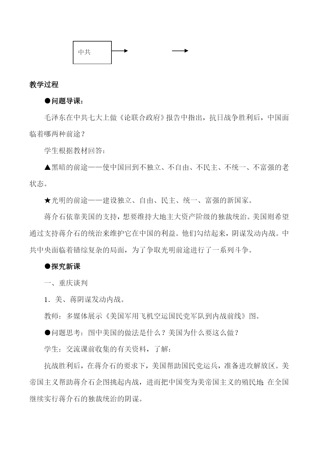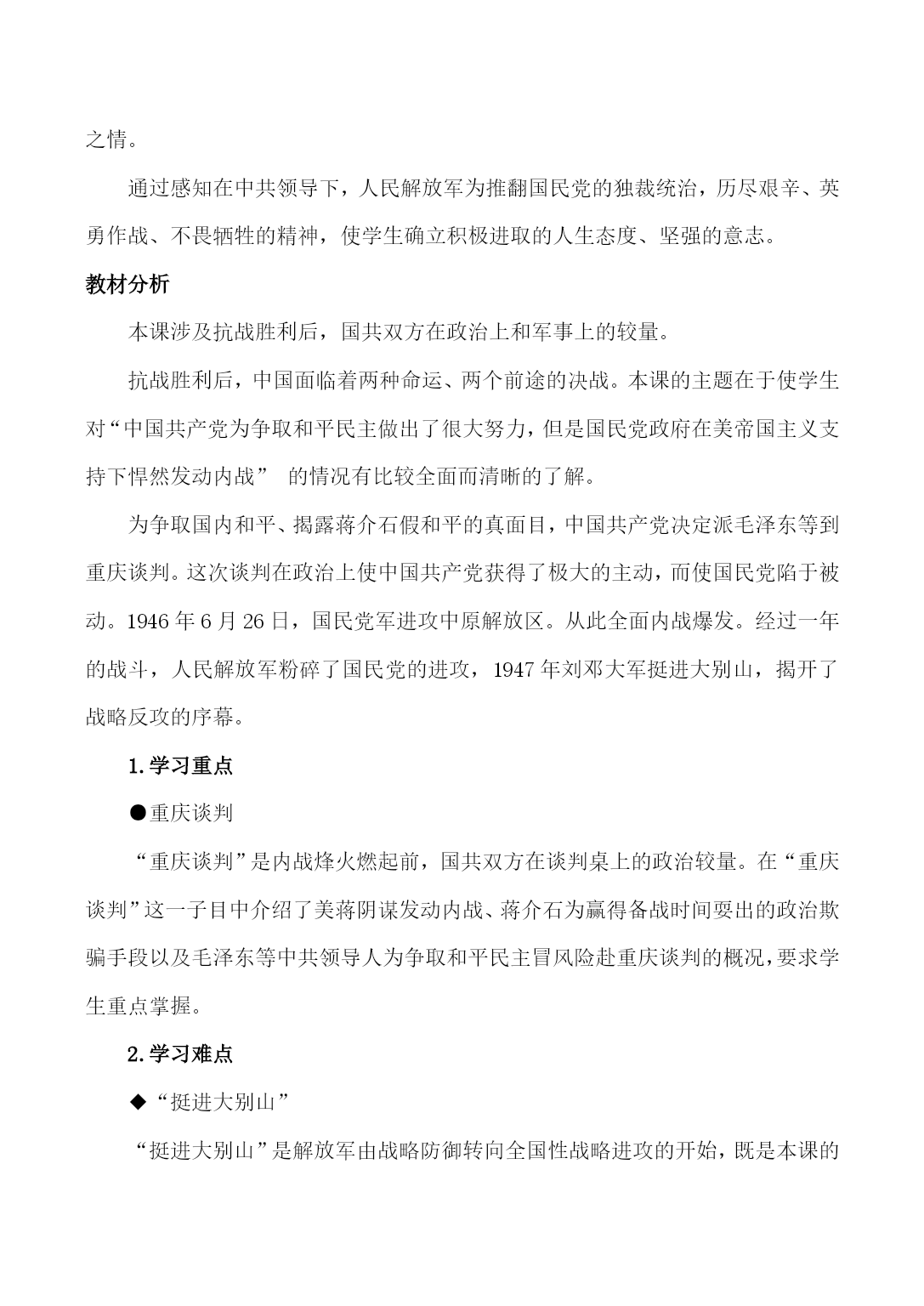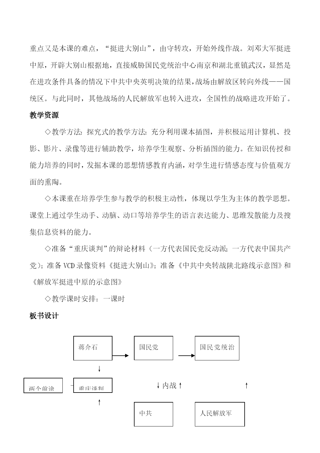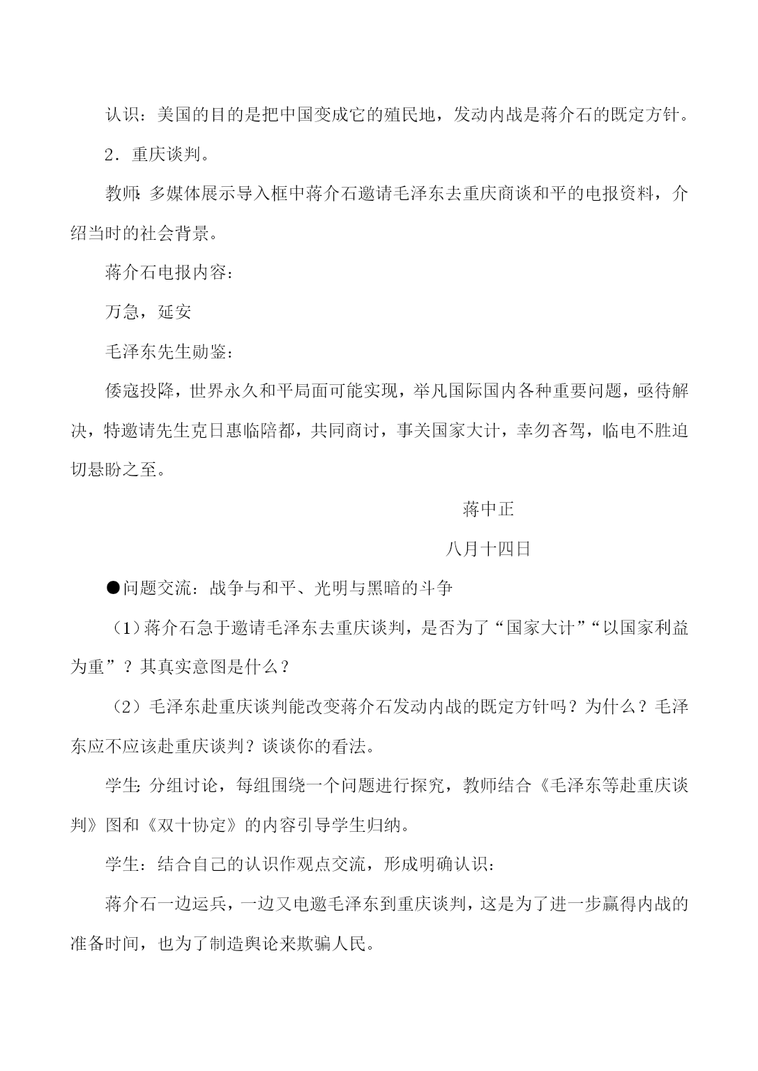 内战烽火 教学理念 结合所收集到的插图、电文照片等多种资料,分析具体的史实,从而学会从不同角度思考问题、解决历史问题的一些基本方法。 内容标准 ●知道重庆谈判,理解中国共产党为争取和平民主做出的努力,认识国民党独裁内战的本质。 ●了解中共中央转战陕北和刘邓大军挺进大别山的史实,知道人民解放战争开始转入战略进攻。 学习目标 1.知识与能力 了解美蔣勾结阴谋发动内战的目的,知道重庆谈判和《双十协定》等基本史实;通过思考“毛泽东为什么要去重庆谈判?”培养学生初步形成在独立思考的基础上得出结论的能力。了解全面内战爆发、转战陕北、刘邓大军挺进大别山等史实。 2.过程与方法 全面收集美帝国主义和蒋介石阴谋发动全面内战的资料,通过模拟现场采访、辩论等方式,探究重庆谈判的目的和原因,学会用历史的眼光来分析历史问题。 通过收集到的资料,结合有关地图,了解中共中央转战陕北和挺进大别山的史实,从而学会从不同角度思考问题,学习解决历史问题的一些基本方法。 3.情感、态度与价值观 通过了解中共为争取和平民主与国民党反动派的专制独裁进行斗争的史实,使学生感知和平民主来之不易,增强学生维护和平民主的自觉性,并增强对党的热爱之情。 通过感知在中共领导下,人民解放军为推翻国民党的独裁统治,历尽艰辛、英勇作战、不畏牺牲的精神,使学生确立积极进取的人生态度、坚强的意志。 教材分析 本课涉及抗战胜利后,国共双方在政治上和军事上的较量。 抗战胜利后,中国面临着两种命运、两个前途的决战。本课的主题在于使学生对“中国共产党为争取和平民主做出了很大努力,但是国民党政府在美帝国主义支持下悍然发动内战”的情况有比较全面而清晰的了解。 为争取国内和平、揭露蒋介石假和平的真面目,中国共产党决定派毛泽东等到重庆谈判。这次谈判在政治上使中国共产党获得了极大的主动,而使国民党陷于被动。1946年6月26日,国民党军进攻中原解放区。从此全面内战爆发。经过一年的战斗,人民解放军粉碎了国民党的进攻,1947年刘邓大军挺进大别山,揭开了战略反攻的序幕。 1.学习重点 ●重庆谈判 “重庆谈判”是内战烽火燃起前,国共双方在谈判桌上的政治较量。在“重庆谈判”这一子目中介绍了美蒋阴谋发动内战、蒋介石为赢得备战时间耍出的政治欺骗手段以及毛泽东等中共领导人为争取和平民主冒风险赴重庆谈判的概况,要求学生重点掌握。 2.学习难点 ◆“挺进大别山” “挺进大别山”是解放军由战略防御转向全国性战略进攻的开始,既是本课的重点又是本课的难点,“挺进大别山”,由守转攻,开始外线作战。刘邓大军挺进中原,开辟大别山根据地,直接威胁国民党统治中心南京和湖北重镇武汉,显然是在进攻条件具备的情况下中共中央英明决策的结果,战场由解放区转向外线——国统区。与此同时,其他战场的人民解放军也转入进攻,全国性的战略进攻开始了。 教学资源 ◇教学方法:探究式的教学方法:充分利用课本插图,并积极运用计算机、投影、影片、录像等进行辅助教学,培养学生观察、分析插图的能力。在知识传授和能力培养的同时,发掘本课的思想情感教育内涵,对学生进行情感态度与价值观方面的熏陶。 ◇本课重在培养学生参与教学的积极主动性,体现以学生为主体的教学思想。课堂上通过学生动手、动脑、动口等培养学生的语言表达能力、思维发散能力及搜集信息资料的能力。 ◇准备“重庆谈判”的辩论材料(一方代表国民党反动派;一方代表中国共产党);准备VCD录像资料《挺进大别山》;准备《中共中央转战陕北路线示意图》和《解放军挺进中原的示意图》 ◇教学课时安排:一课时 板书设计 国民党统治中心受威胁 国民党 挑起内战 蒋介石 内战阴谋 ↓ 重庆谈判 两个前途 →↓内战↑↑ 人民解放军 挺进大别山 中共 转战陕北 ↑ 中共 和平民主 教学过程 ●问题导课: 毛泽东在中共七大上做《论联合政府》报告中指出,抗日战争胜利后,中国面临着哪两种前途? 学生根据教材回答: ▲黑暗的前途——使中国回到不独立、不自由、不民主、不统一、不富强的老状态。 ★光明的前途——建设独立、自由、民主、统一、富强的新国家。 蒋介石依靠美国的支持,想要维持大地主大资产阶级的独裁统治。美国则希望通过支持蒋介石的统治来维护它在中国的利益。他们勾结起来,阴谋发动内战。中共中央面临着错综复杂的局面,为了争取光明前途进行了一系列斗争。 ●探究新课 一、重庆谈判 1.美、蒋阴谋发动内战。 教师:多媒体展示《美国军用飞机空运国民党军队到内战前线》图。 ●问题思考:图中美国的做法是什么?美国为什么要这么做? 学生:交流课前收集的有关资料,了解: 抗战胜利后,在蒋介石的要求下,美国帮助国民党运兵,准备进攻解放区。美帝国主义帮助蒋介石企图挑起内战,进而把中国变为美帝国主义的殖民地;在全国继续实行蒋介石的独裁统治的阴谋。 认识:美国的目的是把中国