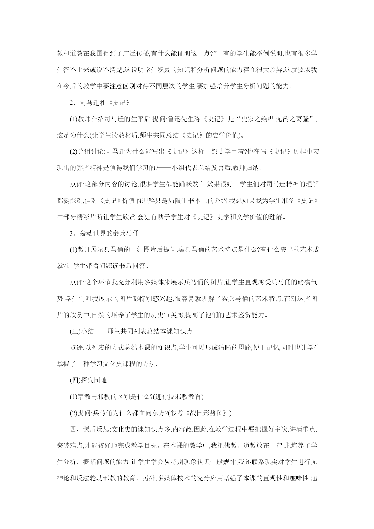 昌盛的秦汉文化 二、教学设计背景:本课主要学习秦汉时期有关宗教、思想和史学、艺术等方面的成就。学生通过课本、电视、网络及其它方式,对秦汉时期的文化发展已有一定的了解,但初一学生的认知水平有限,他们的了解不深入,不系统,对一些历史概念也比较模糊。为了体现新课程“以学生为主体”的教学理念,课前我指导学生以小组为单位利用多种方式搜集、整理与本课相关的材料,以备师生共同交流、探讨;在教学过程中我充分运用多媒体课件,增加课堂教学的直观性和趣味性,让学生多讨论、多思考,尽量让学生自己总结、概括,从而培养学生自主学习的良好习惯和辩证分析历史文化现象的能力。 三、教学过程与点评 (一)导入新课 师生共同回忆秦汉时期文化昌盛的原因,教师指出本节课的学习内容,然后让一名学生介绍白马寺的由来,由此引出佛教的传入,从而导入新课。 点评:这样安排是让学生明白文化现象的产生不是孤立的,要与政治经济的发展联系起来分析。在介绍白马寺由来的时候,我提前安排好一个学生做了充分的准备,她绘声绘色的讲述,吸引了大家的注意力,激发了学生的学习兴趣。 (二)教授新课 1、佛教的传入和道教的兴起 (1)教师先提出问题:佛教起源于何地,是何时又是如何传入中国的?教义是什么?当时的中国除了佛教还有什么其他宗教吗?它兴起于什么时间?创始人是谁?教义又是什么?让学生带着以上几个问题读课文后师生共同总结答案。 (2)学生分组讨论:佛教、道教得以传播的原因及其影响是什么?(提示:传播原因要结合当时的社会背景、宗教教义加以分析;影响方面让学生重点举例说出佛教和道教对我国文学和艺术的影响)。讨论后,各组选一名代表发言,总结小组讨论的结果,最后由教师总结宗教得以传播的根本原因并以列表方式投影总结佛教和道教对我国文化发展的影响。 点评:我在讲课时把简单的问题留给学习成绩较差的学生回答,以增强其学习的信心,为了培养学生辩证分析历史文化现象的能力,我把佛教和道教的传播原因与影响放到一起让学生讨论,最后由教师总结,这两点在实际应用中都取得了预期效果。但是当我提问“为什么说佛教和道教在我国得到了广泛传播,有什么能证明这一点?”有的学生能举例说明,也有很多学生答不上来或说不清楚,这说明学生积累的知识和分析问题的能力存在很大差异,这就要求我在今后的教学中要注意区别对待不同层次的学生,要加强培养学生分析问题的能力。 2、司马迁和《史记》 (1)教师介绍司马迁的生平后,提问:鲁迅先生称《史记》是“史家之绝唱,无韵之离骚”,这是为什么(让学生读教材后,师生共同总结《史记》的史学价值)。 (2)分组讨论:司马迁为什么能写出《史记》这样一部史学巨着?他在写《史记》过程中表现出的哪些精神是值得我们学习的?──小组代表总结发言后,教师归纳。 点评:这部分内容的讨论,很多学生都能踊跃发言,效果很好。学生们对司马迁精神的理解都挺深刻,但对《史记》价值的理解只是局限于书本上的介绍,我想如果我为学生准备《史记》中部分精彩片断让学生欣赏,会更有助于学生对《史记》史学和文学价值的理解。 3、轰动世界的秦兵马俑 (1)教师展示兵马俑的一组图片后提问:秦兵马俑的艺术特点是什么?有什么突出的艺术成就?让学生带着问题读书后回答。 点评:这个环节我充分利用多媒体来展示兵马俑的图片,让学生直观感受兵马俑的磅礴气势,学生们对我展示的图片都特别感兴趣,很容易就理解了秦兵马俑的艺术特点,在对这些图片的欣赏中,自然的培养了学生的历史审美感,提高了他们的艺术鉴赏能力。 (三)小结──师生共同列表总结本课知识点 点评:以列表的方式总结本课的知识点,学生可以形成清晰的思路,便于记忆,同时也让学生掌握了一种学习文化史课程的方法。 (四)探究园地 (1)宗教与邪教的区别是什么?(进行反邪教教育) (2)提问:兵马俑为什么都面向东方?(参考《战国形势图》) 四、课后反思:文化史的课知识点多,内容散,因此,在教学过程中要把握好主次,讲清重点,突破难点,才能较好地完成教学目标。在本课的教学中,我把佛教、道教放在一起讲,培养了学生分析、概括问题的能力,让学生学会从特别现象认识一般规律;我还联系现实对学生进行无神论和反法轮功邪教的教育。另外,多媒体技术的充分应用增强了本课的直观性和趣味性,起到了很好的效果。总的来说,这一教学设计应用于教学实际还是比较成功的,但在教学中也存在一定的问题,即初一学生对历史知识掌握不多,分析问题的能力不强,加上有的同学准备不充分,在讨论中有一部分学生说不出自己的想法,只会顺着课本走或听从学习较好学生的意见,讨论结果难以形成“百家争鸣”,这就要求我们在日常教学中既要注重学生基础知识的积累还要加强其分析问题能力的培养。