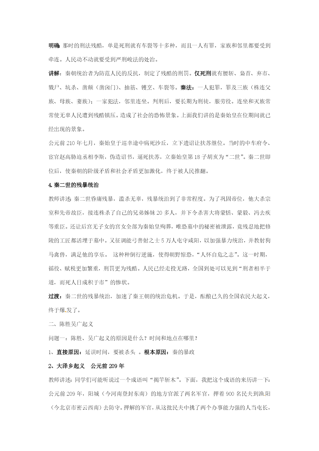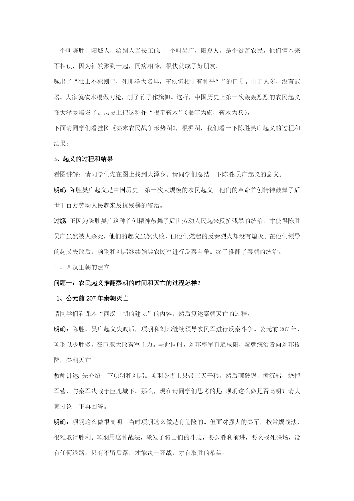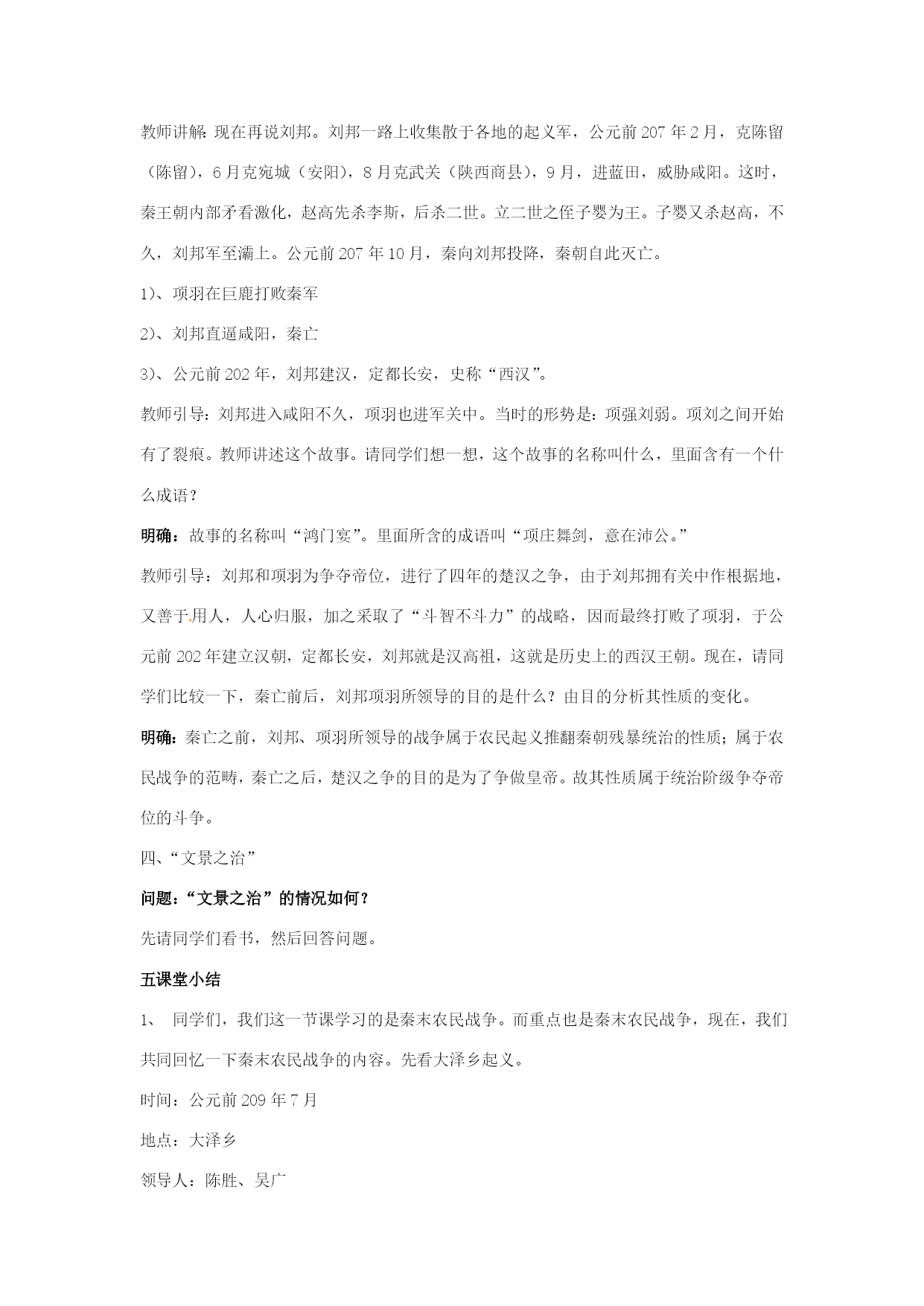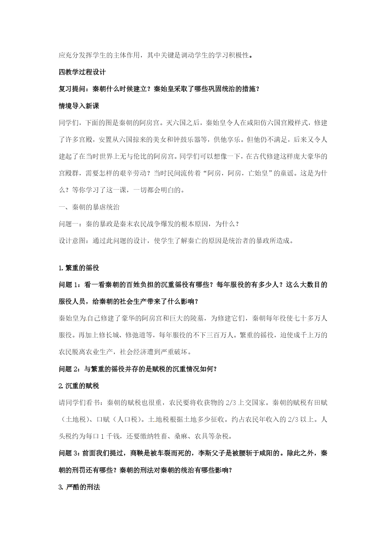 第10课秦朝的速亡与西汉王朝的建立 本节课要学的内容秦朝的速亡与西汉王朝的建立,指的是秦朝的暴虐统治;陈胜吴广起义;西汉王朝的建立。其核心秦末农民起义,理解它关键就是要通过对秦末农民起义爆发原因探究,清楚陈胜、吴广和项羽、刘邦起义的过程。学生已在小学六年级社会里学过有关秦、汉简单的历史,本节课的内容秦的暴政,陈胜吴广起义;西汉王朝的建立。,就是在此基础上的发展的,由于它还与政治有重要的联系,所以在本学科有重要的地位,教学的重点是秦末农民战争。解决重点的关键是通过文字材料、图片资料和《秦末农民战争形势图》等,运用问题教学法,让学生分组讨论理解秦末农民起义的原因,经过和历史意义。 二目标与分析 目标 1.了解和掌握秦末农民起义的原因——秦的暴政。 2.掌握陈胜、吴广起义的过程和意义。 3.了解楚汉之争的简单过程。 分析 1、了解暴政和秦朝灭亡的关系秦末农民起义暴发的原因,培养学生用历史唯物主义分析问题的能力。 2、分析理解秦亡前后,项羽、刘邦所领导的战争性质的变化,培养学生初步学会评判历史事件性质的能力。 3、.通过本课学习使学生认识到秦的暴政是激起农民起义的根本原因,从而理解得民心者得天下的道理。 2.通过从秦朝灭亡中得出的教训,让学生明白儒家思想后来成为封建社会指导思想的真正原因。 三问题诊断分析 在本节课的教学中,学生可能遇到的问题是对秦朝的暴政内容较为抽象,学生易产生厌烦情绪,产生这一问题的困难的原因是对历史知识比较薄弱。要解决这一问题,就要从动手、动脑、动口等方面调动学生思维,激发兴趣。利用图片、历史成语故事等学生喜欢的素材,应充分发挥学生的主体作用,其中关键是调动学生的学习积极性。 四教学过程设计 复习提问:秦朝什么时候建立?秦始皇采取了哪些巩固统治的措施? 情境导入新课 同学们,下面的图是秦朝的阿房宫。灭六国之后,秦始皇令人在咸阳仿六国宫殿样式,修建了许多宫殿,安置从六国掠来的美女和钟鼓乐器等,供他享乐。但他仍不满足,后来又令人建起了在当时世界上无与伦比的阿房宫。同学们可以想像一下,在古代修建这样庞大豪华的宫殿群,需要怎样的艰辛劳动?当时民间流传着“阿房,阿房,亡始皇”的童谣。这是为什么?等你学习了这一课,一切都会明白的。 一、秦朝的暴虐统治 问题一:秦的暴政是秦末农民战争爆发的根本原因,为什么? 设计意图:通过此问题的设计,使学生了解秦亡的原因是统治者的暴政所造成。 1.繁重的徭役 问题1:看一看秦朝的百姓负担的沉重徭役有哪些?每年服役的有多少人?这么大数目的服役人员,给秦朝的社会生产带来了什么影响? 秦始皇为自己修建了豪华的阿房宫和巨大的陵墓,为修建它们,秦朝每年役使七十多万人服役。再加上修长城、修弛道等,每年服役的不下三百万人。繁重的徭役,迫使成千上万的农民脱离农业生产,社会经济遭到严重破坏。 问题2:与繁重的徭役并存的是赋税的沉重情况如何? 2.沉重的赋税 请同学们看书:秦朝的赋税也很重,农民要将收获物的2/3上交国家。秦朝的赋税有田赋(土地税)、口赋(人口税)。土地税根据土地多少征收。约占农民年收入的2/3以上。人头税约为每口1千钱,还要缴纳牲畜、桑麻、农具等杂税。 问题3:前面我们提过,商鞅是被车裂而死的,李斯父子是被腰斩于咸阳的。除此之外,秦朝的刑罚还有哪些?秦朝的刑法对秦朝的统治有哪些影响? 3.严酷的刑法 明确:那时的刑法残酷,单是死刑就有车裂等十多种,而且一人有罪,家族和邻里都要受到牵连。人民动不动就要受到严刑峻法的处治。 讲解:秦朝统治者为防范人民的反抗,制定了残酷的刑罚。仅死刑就有腰斩、枭首、弃市、戮尸、坑杀、凿颠(凿囟门)、抽筋、镬烹、车裂等。秦法:一人犯罪,罪及三族(株连父族、母族、妻族);一家犯法,邻里连坐。判刑后,要长期为刑徒,服劳役。连坐和灭族常常使无辜人民遭到残酷镇压。造成了社会的恐怖景象。上面我们讲的是秦始皇在位期间就已经出现的景象。 公元前210年七月,秦始皇于巡幸途中病死沙丘,立下遗诏让扶苏继位。当时的中车府令、宦官赵高胁迫丞相李斯,伪造诏书,逼死扶苏,立秦始皇第18子胡亥为“二世”。秦二世即位后,使秦朝的阶级矛盾和社会矛盾更加激化,终于被人民推翻。 4.秦二世的残暴统治 教师讲述:秦二世昏庸残暴,滥杀无辜,残暴统治到了非常程度。为了巩固帝位,他大杀宗室和先帝故臣,接连株杀了自己的兄弟姊妹20多人,并下令杀害大将蒙恬、蒙毅、冯去疾等重臣。还让后宫无子女的宫女全部为秦始皇殉葬,唯恐墓中的秘密被泄露,竟残忍地把修陵的工匠都活埋于墓中。又征调能弓善射之士5万人屯守咸阳,以加强暴力统治,并教射狗马禽兽,满足他的享乐。这种种倒行逆施,使得朝野惊恐,“人怀自危之志”。这一时期,徭役、赋税更加繁重,刑罚更为残酷。人民已经走投无路,全国到处可以见到“刑者相半于道,而死人日成积于市”的惨状。