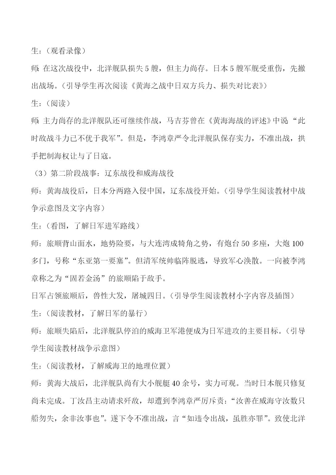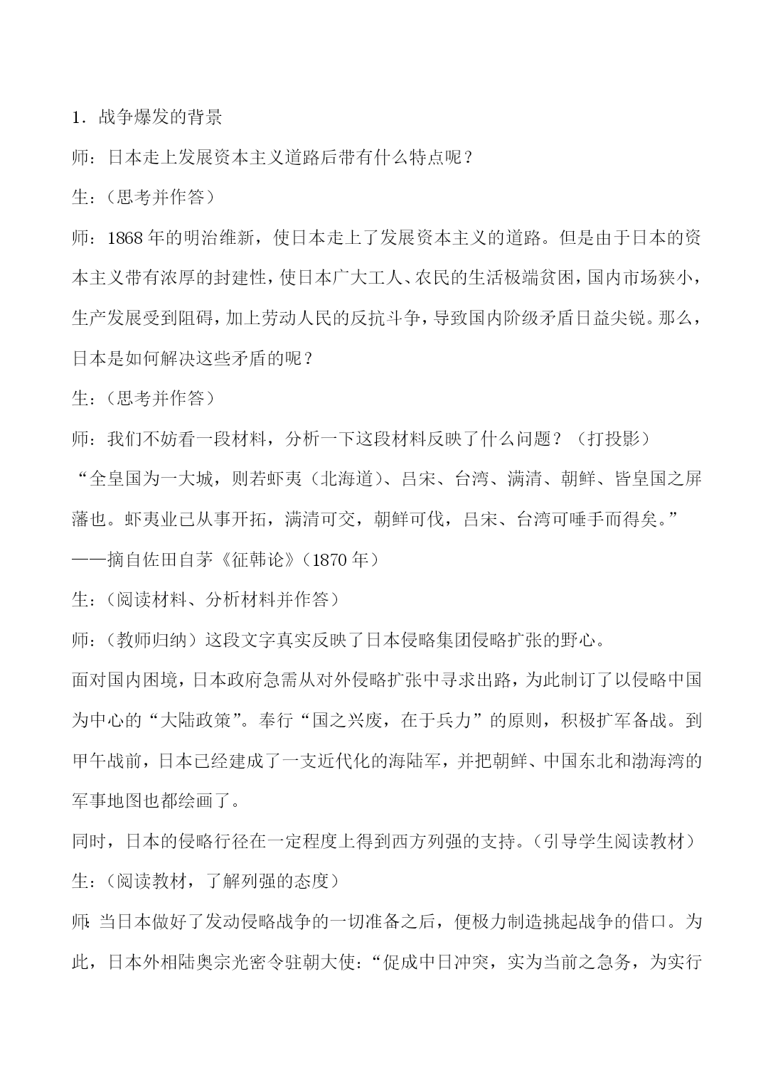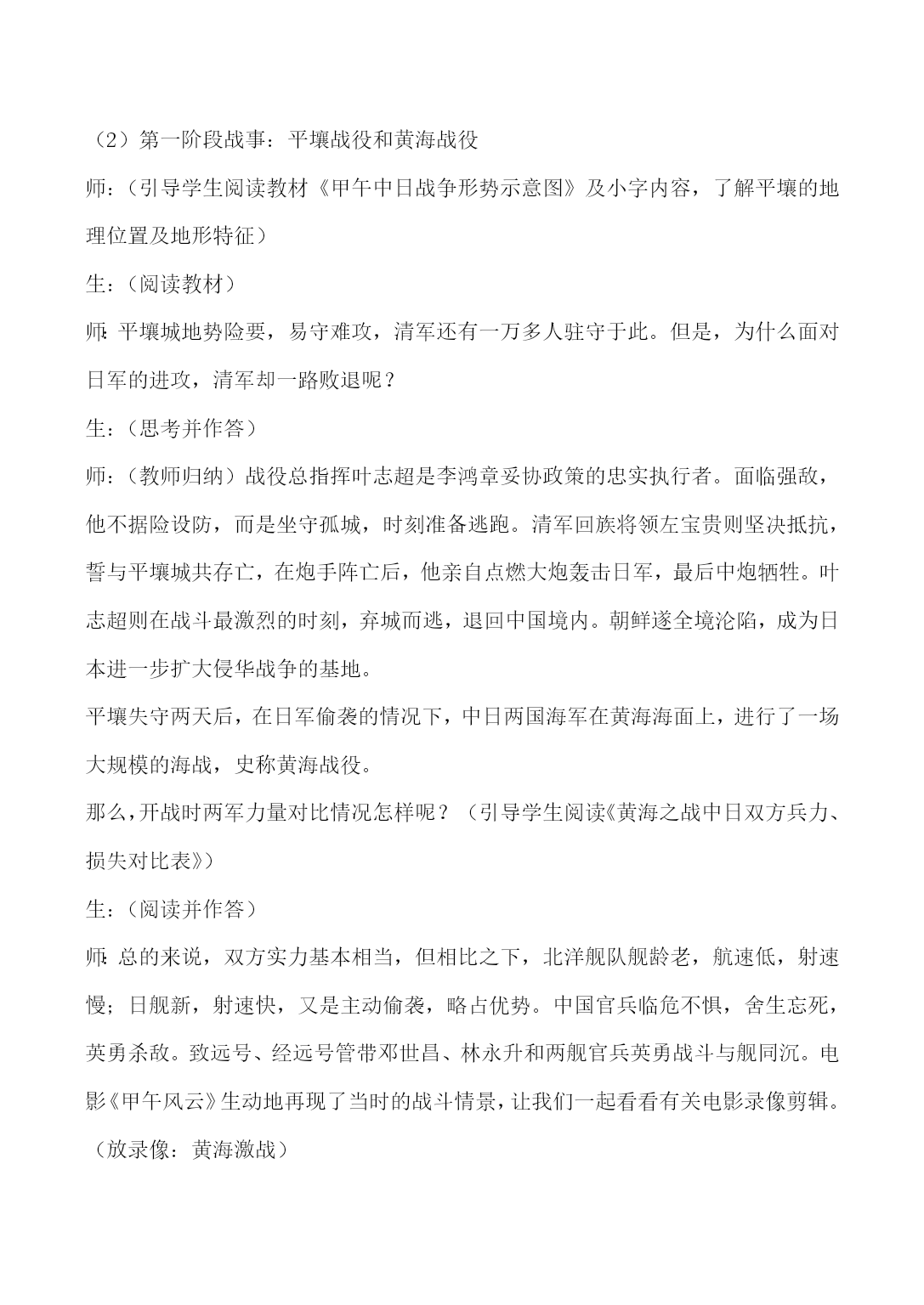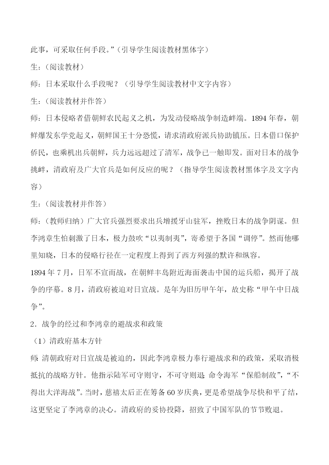 甲午中日战争 教学目标 1.知识要求:甲午中日战争爆发的背景、标志、两个阶段、主要战役、战争中涌现的爱国将领;《马关条约》签定的时间、内容、危害;三国干涉还辽;台湾人民的反割台斗争。 2.能力要求:(1)比较《马关条约》和《南京条约》的异同,说明《马关条约》的签定使中国半殖民地程度大大加深了。(2)分析甲午中日战争对中国民主革命进程的影响。 3.情感目标:(1)甲午中日战争不仅决定了中国海军的命运,而且决定了此后近半个世纪中日关系的格局。(2)爱国官兵的英勇抗争,沉重打击了日本侵略者,我们应当继承和发扬中华民族保卫祖国的优良传统。 课时安排1课时 重点、难点分析 1.重点分析:(1)甲午中日战争爆发的背景是一个重点。1894年爆发的中日战争,是日本政府推行扩张政策和长期以来蓄谋侵略中国的必然结果。(2)《马关条约》的签订及影响是本课的第二个重点。《马关条约》的签订是《南京条约》以来最严重的丧权辱国的条约,是日本强加给中国人民的一付沉重枷锁,是帝国主义与封建主义相结合,把中国变成殖民地半殖民地的一个极严重的步骤。 2.难点分析:《马关条约》大大加深了中国社会的半殖民地化是本节课的难点。教学中要引导学生对比《马关条约》和《南京条约》的内容,分析《马关条约》的严重危害。 课堂教学设计 1.战争爆发的背景 师:日本走上发展资本主义道路后带有什么特点呢? 生:(思考并作答) 师:1868年的明治维新,使日本走上了发展资本主义的道路。但是由于日本的资本主义带有浓厚的封建性,使日本广大工人、农民的生活极端贫困,国内市场狭小,生产发展受到阻碍,加上劳动人民的反抗斗争,导致国内阶级矛盾日益尖锐。那么,日本是如何解决这些矛盾的呢? 生:(思考并作答) 师:我们不妨看一段材料,分析一下这段材料反映了什么问题?(打投影) “全皇国为一大城,则若虾夷(北海道)、吕宋、台湾、满清、朝鲜、皆皇国之屏藩也。虾夷业已从事开拓,满清可交,朝鲜可伐,吕宋、台湾可唾手而得矣。” ——摘自佐田自茅《征韩论》(1870年) 生:(阅读材料、分析材料并作答) 师:(教师归纳)这段文字真实反映了日本侵略集团侵略扩张的野心。 面对国内困境,日本政府急需从对外侵略扩张中寻求出路,为此制订了以侵略中国为中心的“大陆政策”。奉行“国之兴废,在于兵力”的原则,积极扩军备战。到甲午战前,日本已经建成了一支近代化的海陆军,并把朝鲜、中国东北和渤海湾的军事地图也都绘画了。 同时,日本的侵略行径在一定程度上得到西方列强的支持。(引导学生阅读教材) 生:(阅读教材,了解列强的态度) 师:当日本做好了发动侵略战争的一切准备之后,便极力制造挑起战争的借口。为此,日本外相陆奥宗光密令驻朝大使:“促成中日冲突,实为当前之急务,为实行此事,可采取任何手段。”(引导学生阅读教材黑体字) 生:(阅读教材) 师:日本采取什么手段呢?(引导学生阅读教材中文字内容) 生:(阅读教材并作答) 师:日本侵略者借朝鲜农民起义之机,为发动侵略战争制造衅端。1894年春,朝鲜爆发东学党起义,朝鲜国王十分恐慌,请求清政府派兵协助镇压。日本借口保护侨民,也乘机出兵朝鲜,兵力远远超过了清军,战争已一触即发。面对日本的战争挑衅,清政府及广大官兵是如何反应的呢?(指导学生阅读教材黑体字及文字内容) 生:(阅读教材并作答) 师:(教师归纳)广大官兵强烈要求出兵增援牙山驻军,挫败日本的战争阴谋。但李鸿章生怕刺激了日本,极力鼓吹“以夷制夷”,寄希望于各国“调停”。然而他哪里知晓,日本的侵略行径在一定程度上得到了西方列强的默许和纵容。 1894年7月,日军不宣而战,在朝鲜丰岛附近海面袭击中国的运兵船,揭开了战争的序幕。8月,清政府被迫对日宣战。是年为旧历甲午年,故史称“甲午中日战争”。 2.战争的经过和李鸿章的避战求和政策 (1)清政府基本方针 师:清朝政府对日宣战是被迫的,因此李鸿章极力奉行避战求和的政策,采取消极抵抗的战略方针。他指示陆军可守则守,不可守则退;命令海军“保船制敌”,“不得出大洋海战”。当时,慈禧太后正在筹备60岁庆典,更是希望战争尽快和平了结,这更坚定了李鸿章的决心。清政府的妥协投降,招致了中国军队的节节败退。 (2)第一阶段战事:平壤战役和黄海战役 师:(引导学生阅读教材《甲午中日战争形势示意图》及小字内容,了解平壤的地理位置及地形特征) 生:(阅读教材) 师:平壤城地势险要,易守难攻,清军还有一万多人驻守于此。但是,为什么面对日军的进攻,清军却一路败退呢? 生:(思考并作答) 师:(教师归纳)战役总指挥叶志超是李鸿章妥协政策的忠实执行者。面临强敌,他不据险设防,而是坐守孤城,时刻准备逃跑。清军回族将领左宝贵则坚决抵抗,誓与平壤城共存亡,在炮手阵亡后,他亲自点燃大炮轰击日军,最后中炮牺牲。叶志超则在战斗最激烈的时刻,弃