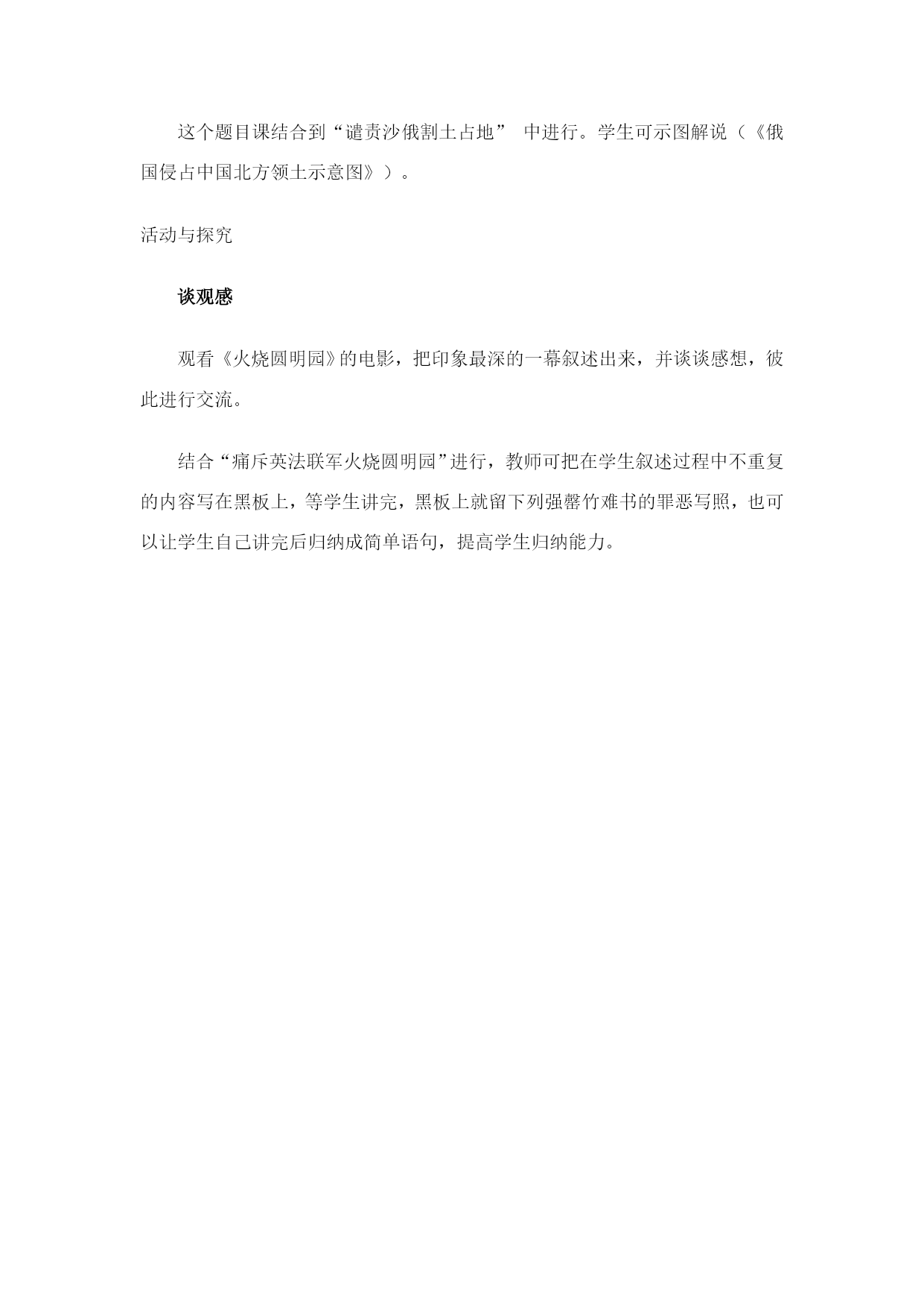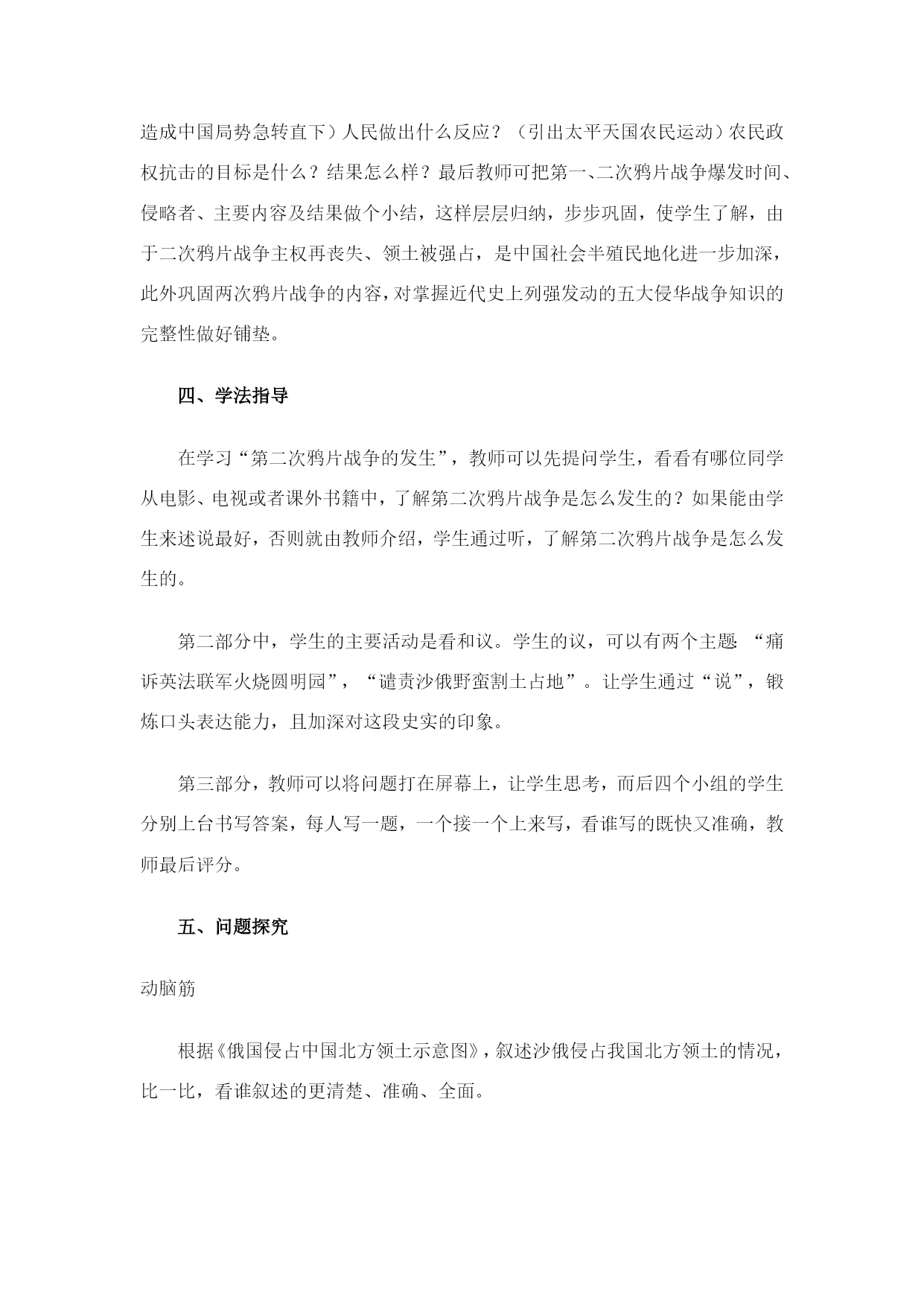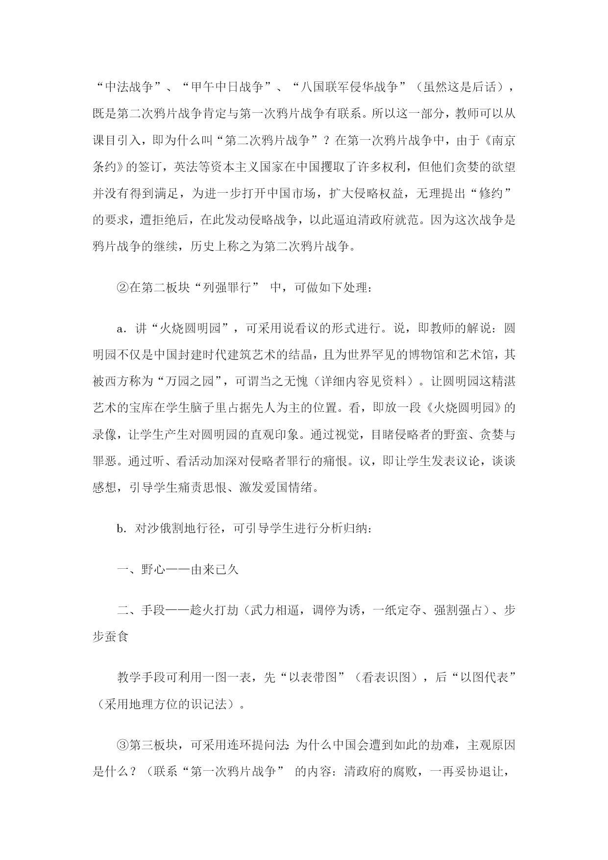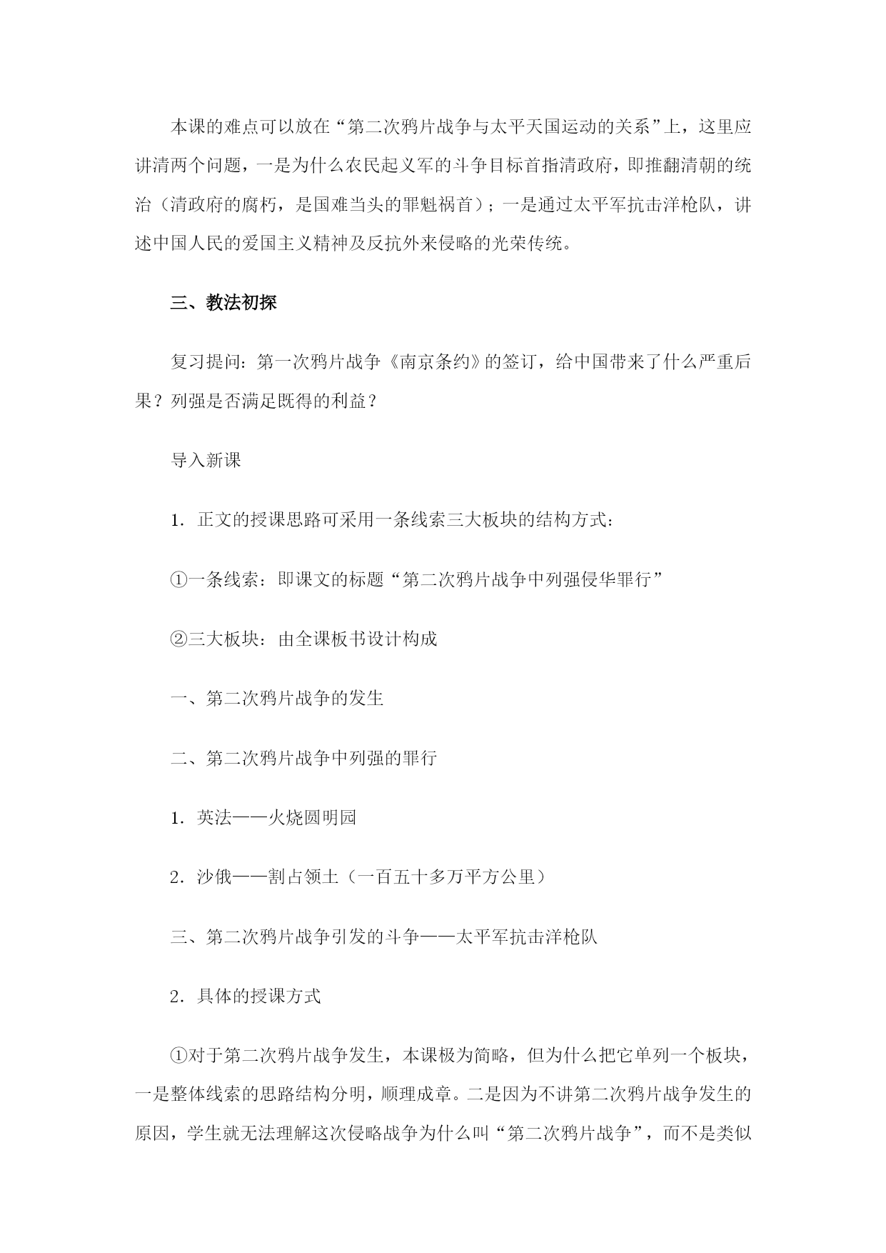 第2课第二次鸦片战争期间列强侵华罪行 一、教学目标 通过本课的教学,使学生了解第二次鸦片战争期间,列强侵华的罪恶行径,清朝统治者的腐败无能,使中国举世闻名的皇家宫苑付之一炬,主权进一步丧失,土地被强暴割占,以及在国难当头的岁月里,农民起义军反抗斗争的历史史实。 本课通过教师的指导,学生的自主学习(听、看、议),培养学生分析历史现象的能力,并透过现象看本质(即列强之所以肆无忌惮,如此嚣张、放肆的根源所在)从中领会太平天国农民运动斗争的首指目标为什么是清政府(不彻底消除腐朽的根源,今天赶走“法兰西”“英吉利”,明天还有新的“法兰西”“英吉利”接踵而至)。 分析民族的强与弱,国家的先进与落后与它们的命运息息相关,从而激发学生的爱国情绪,为民族的振兴、国家的强大发愤学习,努力奋斗。通过太平军抗击洋枪队的史实进行中国人民一贯具有反抗外来侵略的坚强决心和光荣传统的爱国主义教育。 二、重点和难点 第二次鸦片战争的发生是一个重点,对这部分的内容学生只须掌握其知识点:第二次鸦片战争发生的时间及发动战争的国家即可,但教师应抓住课文的标题,讲述这次战争为什么叫第二次鸦片战争,它与第一次鸦片战争的关系,使课文内容上下衔接。 “列强侵华罪行”是本课的又一个重点,也是本课大量篇幅所叙述的内容,为使学生化繁为简,轻松掌握这一段史实,可把其罪行归纳为八个字“洗劫空前”(英、法)、“割地最多”(俄)。 本课的难点可以放在“第二次鸦片战争与太平天国运动的关系”上,这里应讲清两个问题,一是为什么农民起义军的斗争目标首指清政府,即推翻清朝的统治(清政府的腐朽,是国难当头的罪魁祸首);一是通过太平军抗击洋枪队,讲述中国人民的爱国主义精神及反抗外来侵略的光荣传统。 三、教法初探 复习提问:第一次鸦片战争《南京条约》的签订,给中国带来了什么严重后果?列强是否满足既得的利益? 导入新课 1.正文的授课思路可采用一条线索三大板块的结构方式: ①一条线索:即课文的标题“第二次鸦片战争中列强侵华罪行” ②三大板块:由全课板书设计构成 一、第二次鸦片战争的发生 二、第二次鸦片战争中列强的罪行 1.英法——火烧圆明园 2.沙俄——割占领土(一百五十多万平方公里) 三、第二次鸦片战争引发的斗争——太平军抗击洋枪队 2.具体的授课方式 ①对于第二次鸦片战争发生,本课极为简略,但为什么把它单列一个板块,一是整体线索的思路结构分明,顺理成章。二是因为不讲第二次鸦片战争发生的原因,学生就无法理解这次侵略战争为什么叫“第二次鸦片战争”,而不是类似“中法战争”、“甲午中日战争”、“八国联军侵华战争”(虽然这是后话),既是第二次鸦片战争肯定与第一次鸦片战争有联系。所以这一部分,教师可以从课目引入,即为什么叫“第二次鸦片战争”?在第一次鸦片战争中,由于《南京条约》的签订,英法等资本主义国家在中国攫取了许多权利,但他们贪婪的欲望并没有得到满足,为进一步打开中国市场,扩大侵略权益,无理提出“修约”的要求,遭拒绝后,在此发动侵略战争,以此逼迫清政府就范。因为这次战争是鸦片战争的继续,历史上称之为第二次鸦片战争。 ②在第二板块“列强罪行”中,可做如下处理: a.讲“火烧圆明园”,可采用说看议的形式进行。说,即教师的解说:圆明园不仅是中国封建时代建筑艺术的结晶,且为世界罕见的博物馆和艺术馆,其被西方称为“万园之园”,可谓当之无愧(详细内容见资料)。让圆明园这精湛艺术的宝库在学生脑子里占据先人为主的位置。看,即放一段《火烧圆明园》的录像,让学生产生对圆明园的直观印象。通过视觉,目睹侵略者的野蛮、贪婪与罪恶。通过听、看活动加深对侵略者罪行的痛恨。议,即让学生发表议论,谈谈感想,引导学生痛责思恨、激发爱国情绪。 b.对沙俄割地行径,可引导学生进行分析归纳: 一、野心——由来已久 二、手段——趁火打劫(武力相逼,调停为诱,一纸定夺、强割强占)、步步蚕食 教学手段可利用一图一表,先“以表带图”(看表识图),后“以图代表”(采用地理方位的识记法)。 ③第三板块,可采用连环提问法:为什么中国会遭到如此的劫难,主观原因是什么?(联系“第一次鸦片战争”的内容:清政府的腐败,一再妥协退让,造成中国局势急转直下)人民做出什么反应?(引出太平天国农民运动)农民政权抗击的目标是什么?结果怎么样?最后教师可把第一、二次鸦片战争爆发时间、侵略者、主要内容及结果做个小结,这样层层归纳,步步巩固,使学生了解,由于二次鸦片战争主权再丧失、领土被强占,是中国社会半殖民地化进一步加深,此外巩固两次鸦片战争的内容,对掌握近代史上列强发动的五大侵华战争知识的完整性做好铺垫。 四、学法指导 在学习“第二次鸦片战争的发生”,教师可以先提问学生,看看有哪位同学从电影、电视或者课外书籍中,了解第二次鸦片战争是怎么发生的?如果能由学生来述说最好,否则就由教师介绍