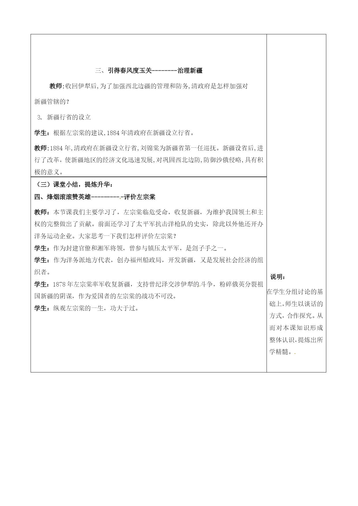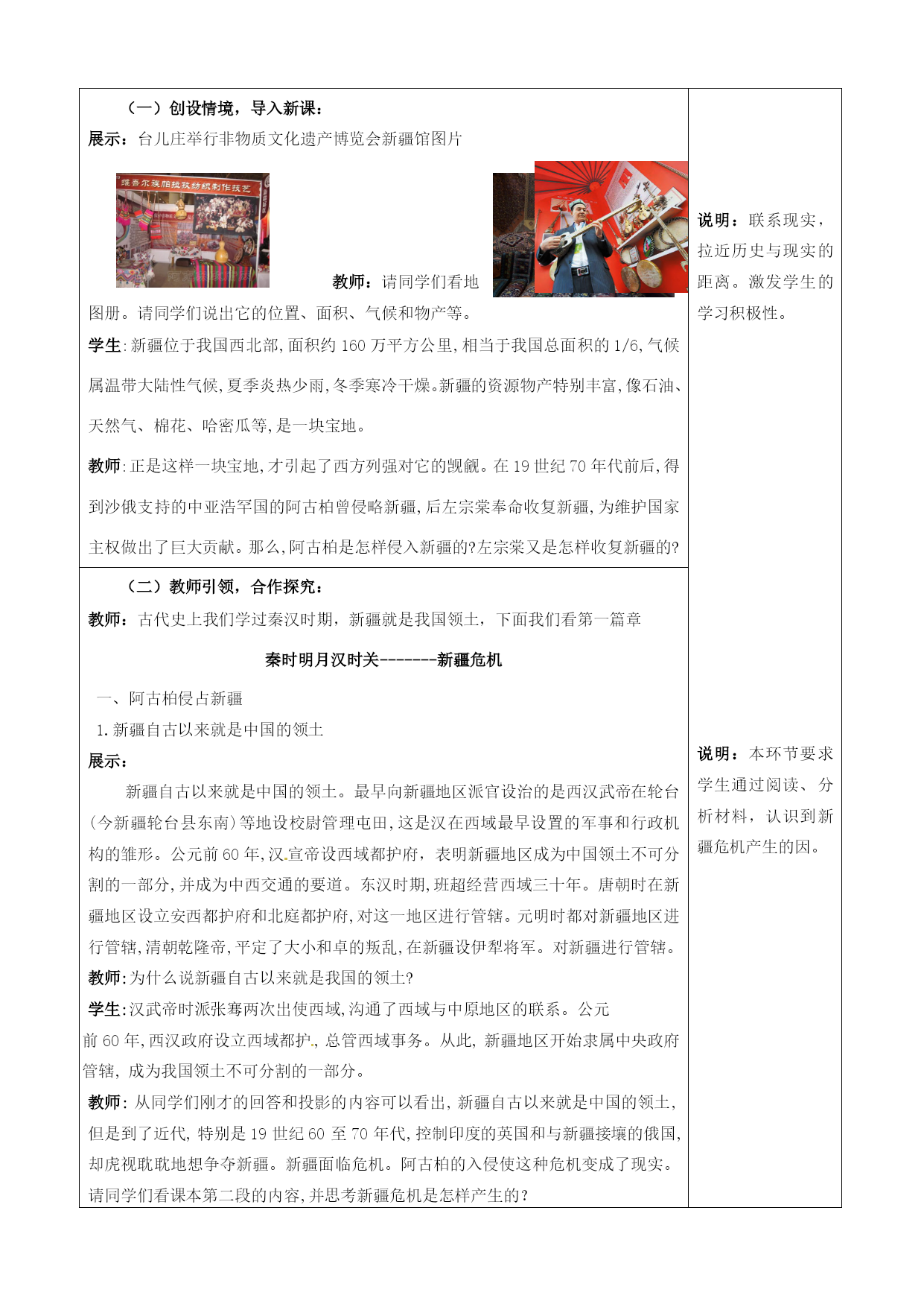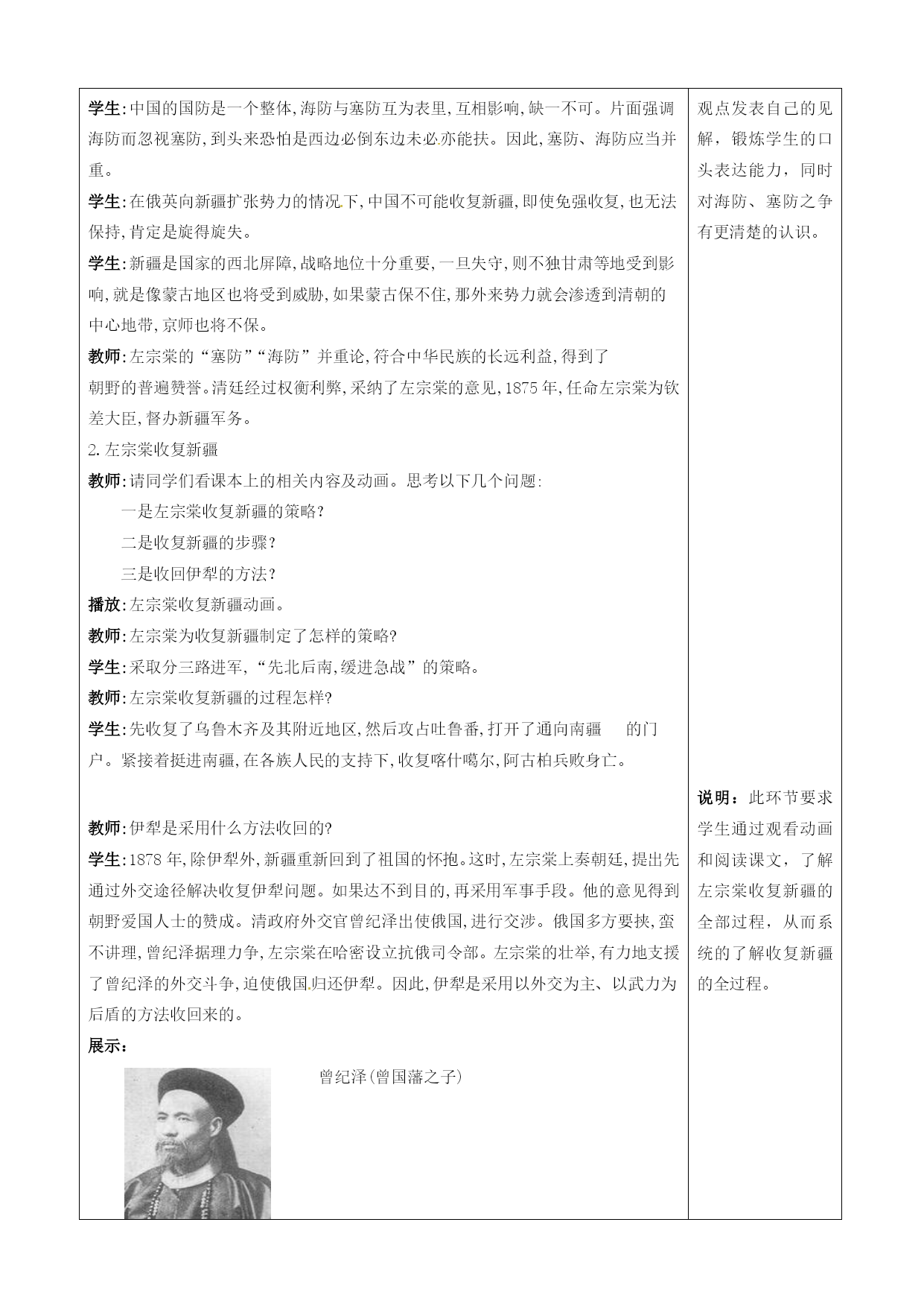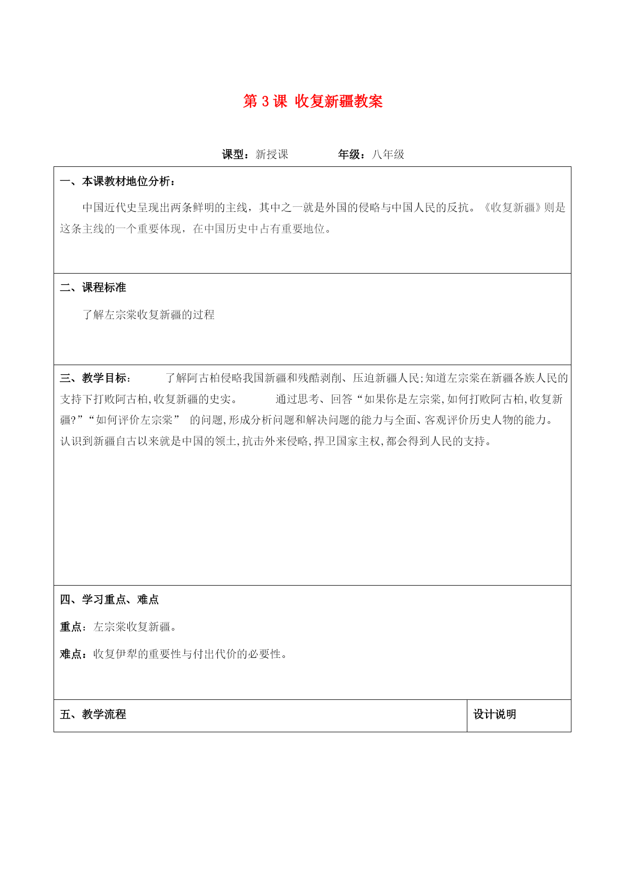 第3课收复新疆教案 课型:新授课年级:八年级 一、本课教材地位分析: 中国近代史呈现出两条鲜明的主线,其中之一就是外国的侵略与中国人民的反抗。《收复新疆》则是这条主线的一个重要体现,在中国历史中占有重要地位。二、课程标准 了解左宗棠收复新疆的过程三、教学目标: 了解阿古柏侵略我国新疆和残酷剥削、压迫新疆人民;知道左宗棠在新疆各族人民的支持下打败阿古柏,收复新疆的史实。 通过思考、回答“如果你是左宗棠,如何打败阿古柏,收复新疆?”“如何评价左宗棠”的问题,形成分析问题和解决问题的能力与全面、客观评价历史人物的能力。 认识到新疆自古以来就是中国的领土,抗击外来侵略,捍卫国家主权,都会得到人民的支持。四、学习重点、难点 重点:左宗棠收复新疆。 难点:收复伊犁的重要性与付出代价的必要性。五、教学流程设计说明(一)创设情境,导入新课: 展示:台儿庄举行非物质文化遗产博览会新疆馆图片 教师:请同学们看地图册。请同学们说出它的位置、面积、气候和物产等。 学生:新疆位于我国西北部,面积约160万平方公里,相当于我国总面积的1/6,气候属温带大陆性气候,夏季炎热少雨,冬季寒冷干燥。新疆的资源物产特别丰富,像石油、天然气、棉花、哈密瓜等,是一块宝地。 教师:正是这样一块宝地,才引起了西方列强对它的觊觎。在19世纪70年代前后,得到沙俄支持的中亚浩罕国的阿古柏曾侵略新疆,后左宗棠奉命收复新疆,为维护国家主权做出了巨大贡献。那么,阿古柏是怎样侵入新疆的?左宗棠又是怎样收复新疆的? 说明:联系现实,拉近历史与现实的距离。激发学生的学习积极性。 说明:本环节要求学生通过阅读、分析材料,认识到新疆危机产生的因。 说明:此环节要求学生结合“阿古柏占领新疆形势图”,阅读课本,了解新疆危机的经过和结果。 说明:此环节要求学生通过讨论海防与塞防之争,认识到进而为正确理解“左宗棠收复新疆”做好铺垫。 说明:教师组织:请同学们根据我们所学过的知识,分成两组,分别就“海防”“塞防”两种观点发表自己的见解,锻炼学生的口头表达能力,同时对海防、塞防之争有更清楚的认识。 说明:此环节要求学生通过观看动画和阅读课文,了解左宗棠收复新疆的全部过程,从而系统的了解收复新疆的全过程。 说明: 说明在学生分组讨论的基础上,师生以谈话的方式,合作探究。从而对本课知识形成整体认识,提炼出所学精髓。 (二)教师引领,合作探究: 教师:古代史上我们学过秦汉时期,新疆就是我国领土,下面我们看第一篇章 秦时明月汉时关-------新疆危机 一、阿古柏侵占新疆 1.新疆自古以来就是中国的领土 展示: 新疆自古以来就是中国的领土。最早向新疆地区派官设治的是西汉武帝在轮台(今新疆轮台县东南)等地设校尉管理屯田,这是汉在西域最早设置的军事和行政机构的雏形。公元前60年,汉宣帝设西域都护府,表明新疆地区成为中国领土不可分割的一部分,并成为中西交通的要道。东汉时期,班超经营西域三十年。唐朝时在新疆地区设立安西都护府和北庭都护府,对这一地区进行管辖。元明时都对新疆地区进行管辖,清朝乾隆帝,平定了大小和卓的叛乱,在新疆设伊犁将军。对新疆进行管辖。 教师:为什么说新疆自古以来就是我国的领土? 学生:汉武帝时派张骞两次出使西域,沟通了西域与中原地区的联系。公元 前60年,西汉政府设立西域都护,总管西域事务。从此,新疆地区开始隶属中央政府管辖,成为我国领土不可分割的一部分。 教师:从同学们刚才的回答和投影的内容可以看出,新疆自古以来就是中国的领土,但是到了近代,特别是19世纪60至70年代,控制印度的英国和与新疆接壤的俄国,却虎视耽耽地想争夺新疆。新疆面临危机。阿古柏的入侵使这种危机变成了现实。请同学们看课本第二段的内容,并思考新疆危机是怎样产生的? 2、新疆危机 学生:1864年,新疆陷入割据纷争的混乱局面,造成了浩罕国阿古柏匪邦和沙俄军队入侵的可乘之机。浩罕国派军官阿古柏于1865年初侵入南疆。阿古柏于1866年吞并了以和田为中心的割据政权。宣布成立哲德沙尔国。1870年,南疆的全部和北疆的部分地区都被阿古柏所占。阿古柏对各族人民进行野蛮的压迫和恣意搜刮。在阿古柏的蹂躏下,新疆的社会经济遭到空前的破坏,人民极度贫困。 教师:英俄两国都想通过支持阿古柏进而控制新疆。他们承认阿古柏伪政权,还为阿古柏提供军火武器。阿古柏成为英俄两国分裂中国领土新疆的共同傀儡。 大将筹边尚未还----------收复新疆 教师:面对西北边疆的严重局势,清政府采取了哪些措施呢?1865年阿古柏就侵入新疆,为什么一直到1875年,才开始任
