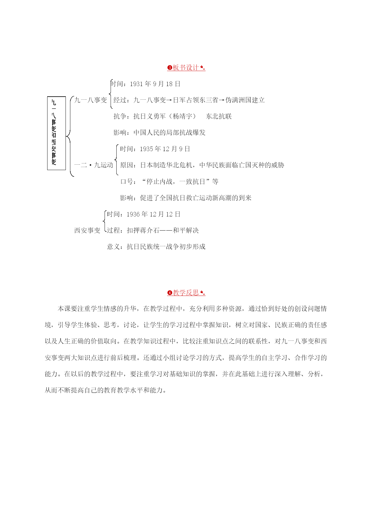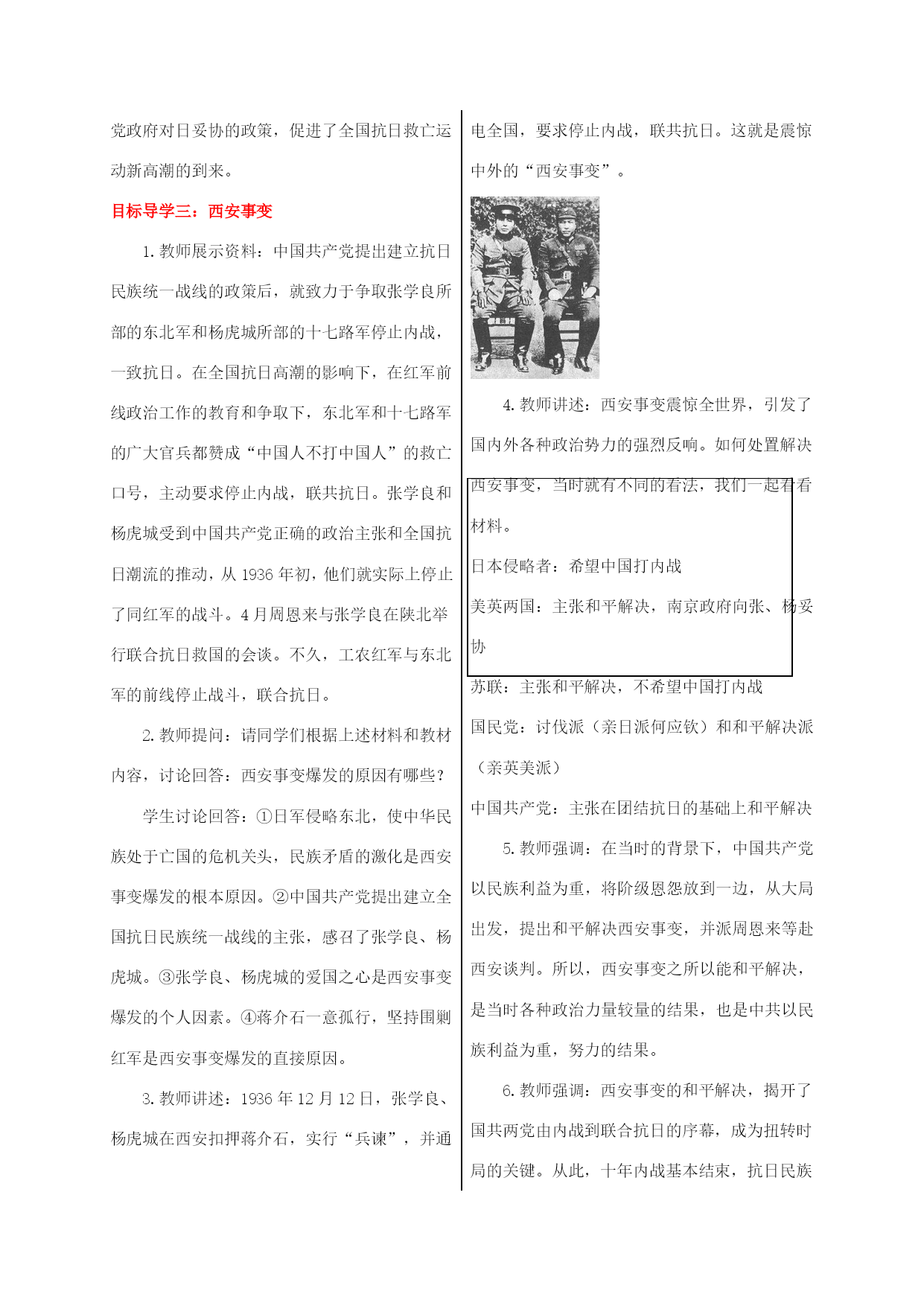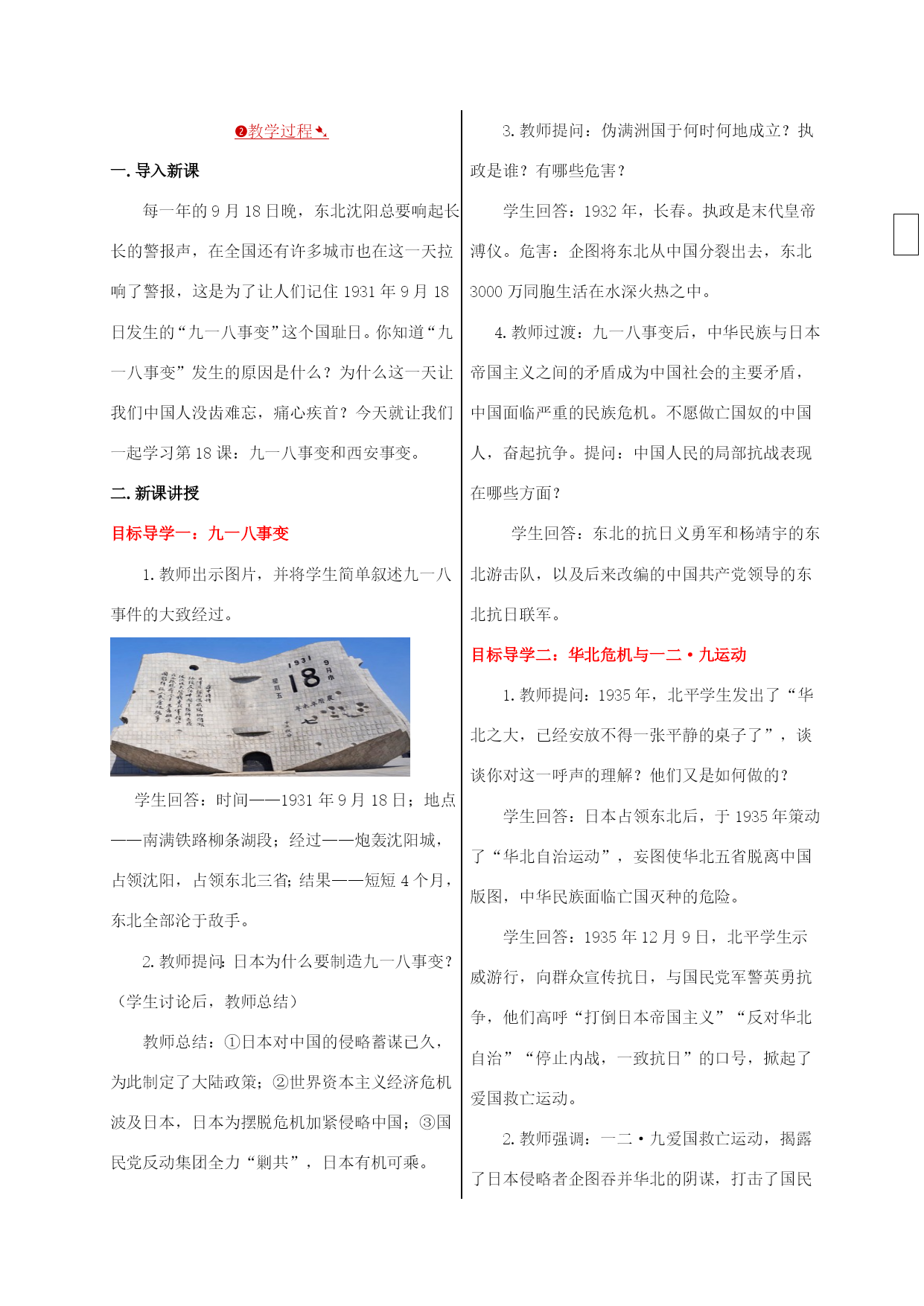 第18课从九一八事变到西安事变 ❶教学分析➷ 【教学目标】 知识与能力知道九一八事变的经过、结果以及东北人民的抗日斗争;知道华北危机、一二·九运动以及西安事变;分析理解西安事变的和平解决及意义过程与方法通过对本课的学习,培养学生描述历史事件的能力,培养学生用历史唯物主义的基本观点分析问题的能力以及主动探究历史的意识情感态度与价值观使学生认识到抗日救亡运动的兴起反映了中华民族具有反侵略的光荣传统,当代青少年应以先辈们为榜样,树立和培养强烈的爱国主义精神和民族责任感【重点难点】 重点:九一八事变与西安事变。 难点:西安事变的和平解决及意义。 ❷教学过程➷ 一.导入新课 每一年的9月18日晚,东北沈阳总要响起长长的警报声,在全国还有许多城市也在这一天拉响了警报,这是为了让人们记住1931年9月18日发生的“九一八事变”这个国耻日。你知道“九一八事变”发生的原因是什么?为什么这一天让我们中国人没齿难忘,痛心疾首?今天就让我们一起学习第18课:九一八事变和西安事变。 二.新课讲授 目标导学一:九一八事变 教师出示图片,并将学生简单叙述九一八事件的大致经过。 学生回答:时间——1931年9月18日;地点——南满铁路柳条湖段;经过——炮轰沈阳城,占领沈阳,占领东北三省;结果——短短4个月,东北全部沦于敌手。 2.教师提问:日本为什么要制造九一八事变?(学生讨论后,教师总结) 教师总结:①日本对中国的侵略蓄谋已久,为此制定了大陆政策;②世界资本主义经济危机波及日本,日本为摆脱危机加紧侵略中国;③国民党反动集团全力“剿共”,日本有机可乘。 教师提问:伪满洲国于何时何地成立?执政是谁?有哪些危害? 学生回答:1932年,长春。执政是末代皇帝溥仪。危害:企图将东北从中国分裂出去,东北3000万同胞生活在水深火热之中。 4.教师过渡:九一八事变后,中华民族与日本帝国主义之间的矛盾成为中国社会的主要矛盾,中国面临严重的民族危机。不愿做亡国奴的中国人,奋起抗争。提问:中国人民的局部抗战表现在哪些方面? 学生回答:东北的抗日义勇军和杨靖宇的东北游击队,以及后来改编的中国共产党领导的东北抗日联军。 目标导学二:华北危机与一二·九运动 教师提问:1935年,北平学生发出了“华北之大,已经安放不得一张平静的桌子了”,谈谈你对这一呼声的理解?他们又是如何做的? 学生回答:日本占领东北后,于1935年策动了“华北自治运动”,妄图使华北五省脱离中国版图,中华民族面临亡国灭种的危险。 学生回答:1935年12月9日,北平学生示威游行,向群众宣传抗日,与国民党军警英勇抗争,他们高呼“打倒日本帝国主义”“反对华北自治”“停止内战,一致抗日”的口号,掀起了爱国救亡运动。 教师强调:一二·九爱国救亡运动,揭露了日本侵略者企图吞并华北的阴谋,打击了国民党政府对日妥协的政策,促进了全国抗日救亡运动新高潮的到来。 目标导学三:西安事变 教师展示资料:中国共产党提出建立抗日民族统一战线的政策后,就致力于争取张学良所部的东北军和杨虎城所部的十七路军停止内战,一致抗日。在全国抗日高潮的影响下,在红军前线政治工作的教育和争取下,东北军和十七路军的广大官兵都赞成“中国人不打中国人”的救亡口号,主动要求停止内战,联共抗日。张学良和杨虎城受到中国共产党正确的政治主张和全国抗日潮流的推动,从1936年初,他们就实际上停止了同红军的战斗。4月周恩来与张学良在陕北举行联合抗日救国的会谈。不久,工农红军与东北军的前线停止战斗,联合抗日。 教师提问:请同学们根据上述材料和教材内容,讨论回答:西安事变爆发的原因有哪些? 学生讨论回答:①日军侵略东北,使中华民族处于亡国的危机关头,民族矛盾的激化是西安事变爆发的根本原因。②中国共产党提出建立全国抗日民族统一战线的主张,感召了张学良、杨虎城。③张学良、杨虎城的爱国之心是西安事变爆发的个人因素。④蒋介石一意孤行,坚持围剿红军是西安事变爆发的直接原因。 教师讲述:1936年12月12日,张学良、杨虎城在西安扣押蒋介石,实行“兵谏”,并通电全国,要求停止内战,联共抗日。这就是震惊中外的“西安事变”。 教师讲述:西安事变震惊全世界,引发了国内外各种政治势力的强烈反响。如何处置解决西安事变,当时就有不同的看法,我们一起看看材料。 日本侵略者:希望中国打内战 美英两国:主张和平解决,南京政府向张、杨妥协 苏联:主张和平解决,不希望中国打内战 国民党:讨伐派(亲日派何应钦)和和平解决派(亲英美派) 中国共产党:主张在团结抗日的基础上和平解决 5.教师强调:在当时的背景下,中国共产党以民族利益为重,将阶级恩怨放到一边,从大局出发,提出和平解决西安事变,并派周恩来等赴西安谈判。所以,西安事变之所以能和平解决,是当时各种政治力量较量的结果,也是中共以民族利益为重,努力的结果。 6