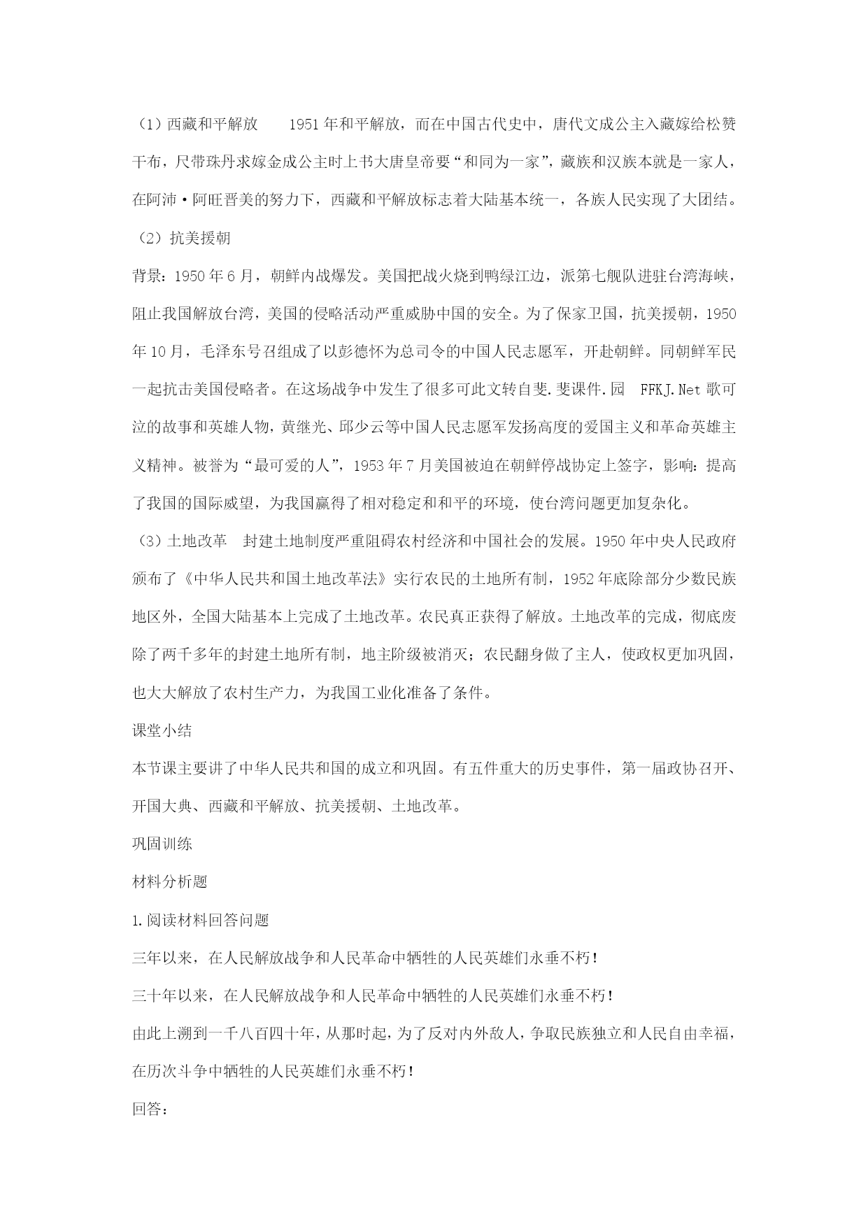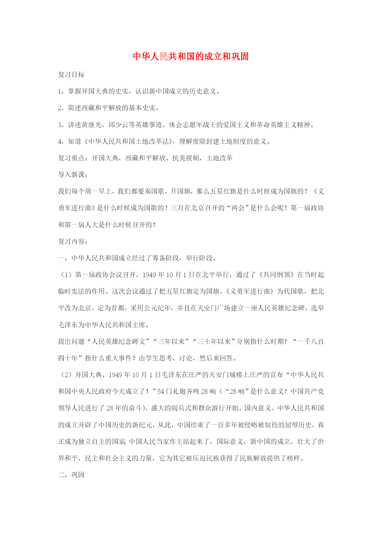 中华人民共和国的成立和巩固 复习目标 1、掌握开国大典的史实,认识新中国成立的历史意义。 2、简述西藏和平解放的基本史实。 3、讲述黄继光、邱少云等英雄事迹,体会志愿军战士的爱国主义和革命英雄主义精神。 4、知道《中华人民共和国土地改革法》,理解废除封建土地制度的意义。 复习重点:开国大典、西藏和平解放、抗美援朝、土地改革 导入新课: 我们每个周一早上,我们都要奏国歌,升国旗,那么五星红旗是什么时候成为国旗的?《义勇军进行曲》是什么时候成为国歌的?三月在北京召开的“两会”是什么会呢?第一届政协和第一届人大是什么时候召开的? 复习内容: 一、中华人民共和国成立经过了筹备阶段,举行阶段。 (1)第一届政协会议召开,1949年10月1日在北平举行,通过了《共同纲领》在当时起临时宪法的作用。这次会议通过了把五星红旗定为国旗,《义勇军进行曲》为代国歌,把北平改为北京,定为首都,采用公元纪年,并且在天安门广场建立一座人民英雄纪念碑,选举毛泽东为中华人民共和国主席。 提出问题“人民英雄纪念碑文”“三年以来”“三十年以来”分别指什么时期?“一千八百四十年”指什么重大事件?由学生思考、讨论,然后来回答。 (2)开国大典、1949年10月1日毛泽东在庄严的天安门城楼上庄严的宣布“中华人民共和国中央人民政府今天成立了!”54门礼炮齐鸣28响(“28响”是什么意义?中国共产党领导人民进行了28年的奋斗),盛大的阅兵式和群众游行开始。国内意义,中华人民共和国的成立开辟了中国历史的新纪元,从此,中国结束了一百多年被侵略被奴役的屈辱历史,真正成为独立自主的国家;中国人民当家作主站起来了,国际意义,新中国的成立,壮大了世界和平、民主和社会主义的力量,它为其它被压迫民族获得了民族解放提供了榜样。 二、巩固 (1)西藏和平解放1951年和平解放,而在中国古代史中,唐代文成公主入藏嫁给松赞干布,尺带珠丹求嫁金成公主时上书大唐皇帝要“和同为一家”,藏族和汉族本就是一家人,在阿沛·阿旺晋美的努力下,西藏和平解放标志着大陆基本统一,各族人民实现了大团结。 (2)抗美援朝 背景:1950年6月,朝鲜内战爆发。美国把战火烧到鸭绿江边,派第七舰队进驻台湾海峡,阻止我国解放台湾,美国的侵略活动严重威胁中国的安全。为了保家卫国,抗美援朝,1950年10月,毛泽东号召组成了以彭德怀为总司令的中国人民志愿军,开赴朝鲜。同朝鲜军民一起抗击美国侵略者。在这场战争中发生了很多可此文转自斐.斐课件.园FFKJ.Net歌可泣的故事和英雄人物,黄继光、邱少云等中国人民志愿军发扬高度的爱国主义和革命英雄主义精神。被誉为“最可爱的人”,1953年7月美国被迫在朝鲜停战协定上签字,影响:提高了我国的国际威望,为我国赢得了相对稳定和和平的环境,使台湾问题更加复杂化。 (3)土地改革封建土地制度严重阻碍农村经济和中国社会的发展。1950年中央人民政府颁布了《中华人民共和国土地改革法》实行农民的土地所有制,1952年底除部分少数民族地区外,全国大陆基本上完成了土地改革。农民真正获得了解放。土地改革的完成,彻底废除了两千多年的封建土地所有制,地主阶级被消灭;农民翻身做了主人,使政权更加巩固,也大大解放了农村生产力,为我国工业化准备了条件。 课堂小结 本节课主要讲了中华人民共和国的成立和巩固。有五件重大的历史事件,第一届政协召开、开国大典、西藏和平解放、抗美援朝、土地改革。 巩固训练 材料分析题 1.阅读材料回答问题 三年以来,在人民解放战争和人民革命中牺牲的人民英雄们永垂不朽! 三十年以来,在人民解放战争和人民革命中牺牲的人民英雄们永垂不朽! 由此上溯到一千八百四十年,从那时起,为了反对内外敌人,争取民族独立和人民自由幸福,在历次斗争中牺牲的人民英雄们永垂不朽! 回答: (1)“三年以来”指什么时期以来? (2)“三十年以来”指什么事件以来?它标志着什么? (3)“上溯到一千八百四十年”指什么事件?标志着什么从那时起,中国人民的内外敌人是谁? (4)今天,.新中国成立的历史意义是什么?新中国成立后,为了巩固新政权,党和政府采取了哪些措施? 作业布置 我们青少年应当怎样纪念革命先烈?怎样继承革命事业?