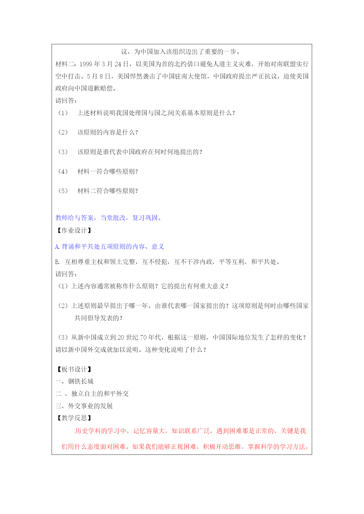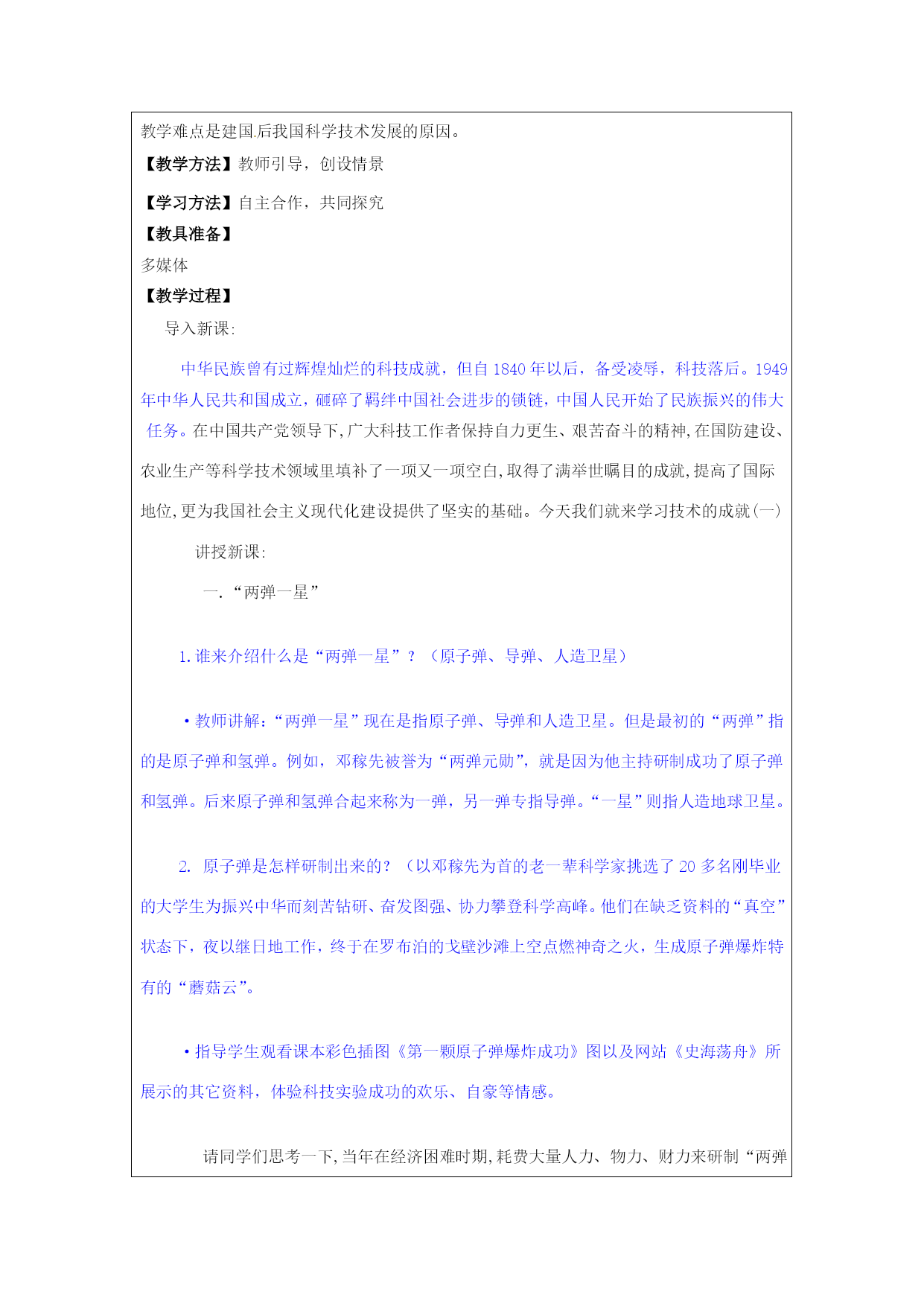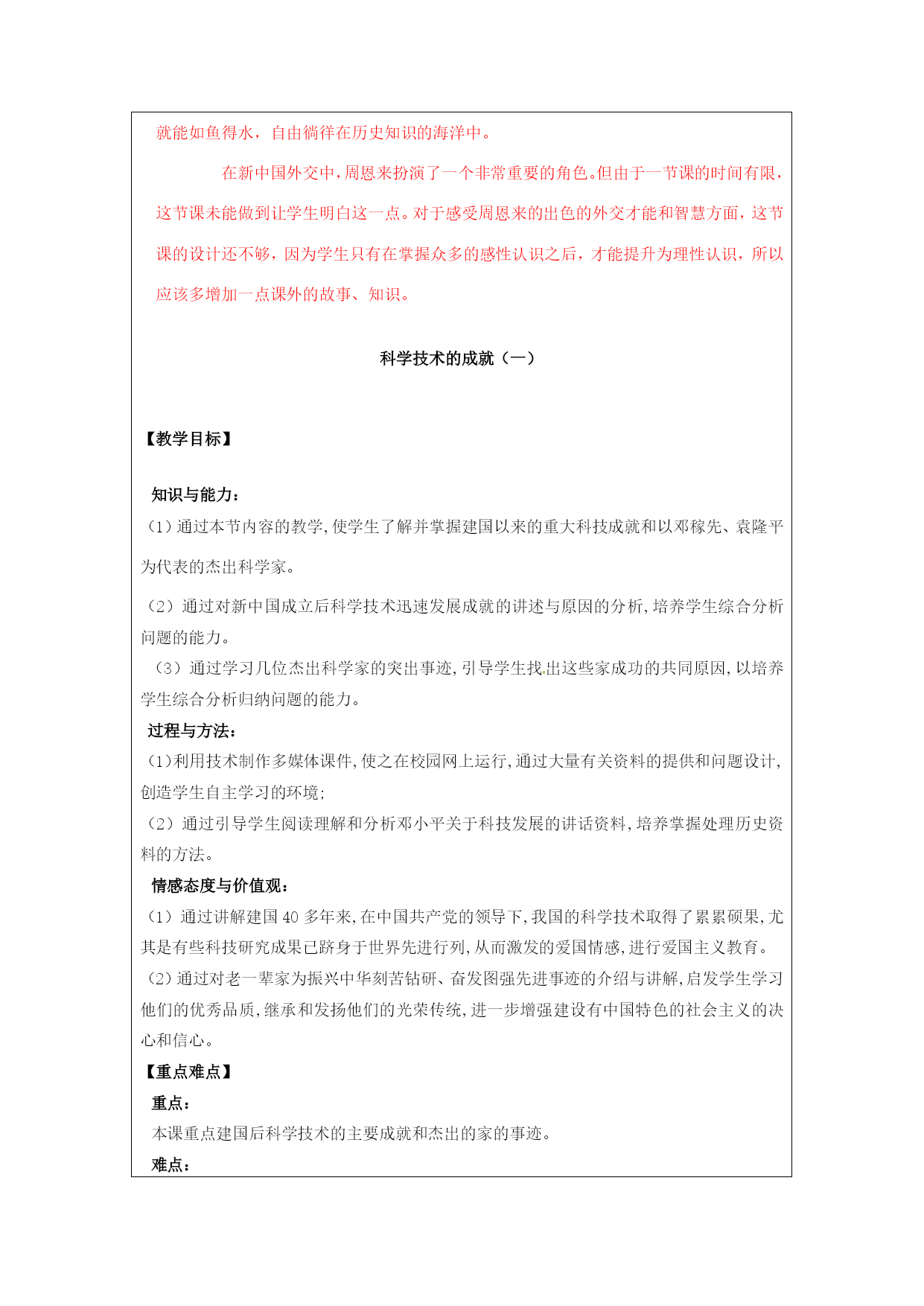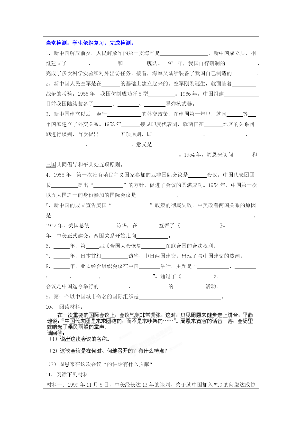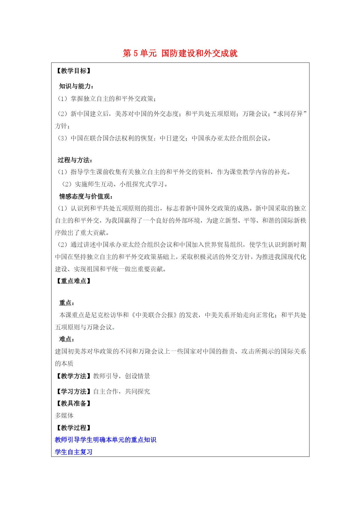 第5单元国防建设和外交成就 【教学目标】 知识与能力: (1)掌握独立自主的和平外交政策; (2)新中国建立后,美苏对中国的外交态度;和平共处五项原则;万隆会议;“求同存异”方针; (3)中国在联合国合法权利的恢复;中日建交;中国承办亚太经合组织会议。 过程与方法: (1)指导学生课前收集有关独立自主的和平外交的资料,作为课堂教学内容的补充。 (2)实施师生互动、小组探究式学习。 情感态度与价值观: (1)认识到和平共处五项原则的提出,标志着新中国外交政策的成熟。新中国采取的独立自主的和平外交,为我国赢得了一个良好的外部环境,为建立新型、平等、和谐的国际新秩序做出了重大贡献。 (2)通过讲述中国承办亚太经合组织会议和中国加入世界贸易组织,使学生认识到新时期中国在坚持独立自主的和平外交政策基础上,采取积极灵活的外交方针,为推进我国现代化建设、实现祖国和平统一做出重要贡献。 【重点难点】 重点: 本课重点是尼克松访华和《中美联合公报》的发表,中美关系开始走向正常化;和平共处五项原则与万隆会议。 难点: 建国初美苏对华政策的不同和万隆会议上一些国家对中国的指责、攻击所揭示的国际关系的本质 【教学方法】教师引导,创设情景 【学习方法】自主合作,共同探究 【教具准备】 多媒体 【教学过程】 教师引导学生明确本单元的重点知识 学生自主复习 当堂检测:学生依纲复习,完成检测。 1、新中国解放前夕,人民解放军的第一支海军是,新中国成立后,相继建立了、和舰队。1971年,我国自行研制的,完成了多次科学实验和对外出访任务。接着,海军又陆续装备了我国自己制造的。 2、新中国人民空军是在的基础上建立起来的。空军刚刚诞生,就面临着战争的考验。1956年,我国仿制成功歼5型。1966年,中国组建。目前我国陆续装备了、、导弹核武器。 3、新中国建立以后,奉行的外交政策。在建国第一年里,就同等个国家建立了外交关系。1953年接见印度代表团,就两国在地区的关系问题进行谈判,首次提出五项原则,即、、、 、。意义是, 。1954年,周恩来访问和三国共同倡导和平共处五项原则。 4、1955年,第一次没有殖民主义国家参加的亚非国际会议是会议。中国代表团团长提出“”的方针,促进了会议的圆满成功。1954年,中国第一次以五大国之一的身份参加的国际会议是。 5、新中国的成立宣告美国“”政策的彻底失败。中美改善两国关系的原因是。 1972年,美国总统访华,在签署了《》。年,中美正式建交,两国关系开始走向。 6、年,第届联合国大会恢复在联合国的合法权利。 7、年,日本首相访华,中日两国建交。出现了与中国建交的热潮。 8、年,亚太经合组织会议在中国举行,主题是“、 :、,”。通过了《》。会议是中国迄今举行的、的活动。 9、第一个以中国城市命名的国际组织是。 10、阅读材料: (3)周恩来在这次会议上的讲话有什么贡献? 11、阅读下列材料 材料一:1999年11月5日,中美经长达13年的谈判,终于就中国加入WTO的问题达成协议,为中国加入该组织迈出了重要的一步。 材料二:1999年3月24日,以美国为首的北约借口避免人道主义灾难,开始对南联盟实行空中打击。5月8日,美国悍然袭击了中国驻南大使馆,中国政府提出严正抗议,迫使美国政府向中国道歉赔偿。 请回答: 上述材料说明我国处理国与国之间关系基本原则是什么? 该原则的内容是什么? 该原则是谁代表中国政府在何时何地提出的? 材料一符合哪些原则? 材料二符合哪些原则? 教师给与答案,当堂批改,复习巩固。 【作业设计】 A.背诵和平共处五项原则的内容、意义 B.互相尊重主权和领土完整,互不侵犯,互不干涉内政,平等互利,和平共处。 请回答: (1)上述内容通常被称作什么原则?它的提出有何重大意义? (2)上述原则最早提出于哪一年,由谁代表哪一国家提出的?这项原则是何时由哪些国家共同倡导发表的? (3)从新中国成立到20世纪70年代,根据这一原则,中国国际地位发生了怎样的变化?请以新中国外交成就加以说明。这种变化说明了什么? 【板书设计】 钢铁长城 二、独立自主的和平外交 三、外交事业的发展 【教学反思】 历史学科的学习中,记忆容量大,知识联系广泛,遇到困难那是正常的,关键是我们用什么态度面对困难。如果我们能够正视困难,积极开动思维,掌握科学的学习方法,就能如鱼得水,自由徜徉在历史知识的海洋中。 在新中国外交中,周恩来扮演了一个非常重要的角色。但由于一节课的时间有限,这节课未能做到让学生明白这一点。对于感受周恩来的出色的外交才能和智慧方面,这节课的设计还不够,因为学生只有在掌握众多的感性认识之后,才能提升为理性认识,所以应该多增加一点课外的故事、知识。 科学技术的成就(一) 【教学目标】 知识与能力: (1)通过