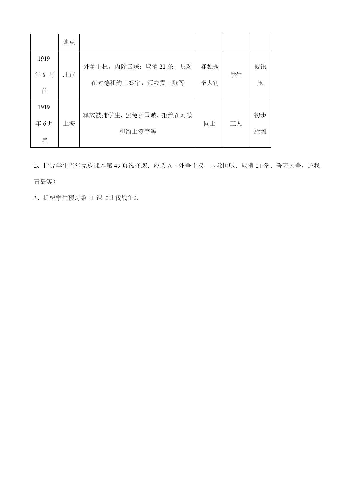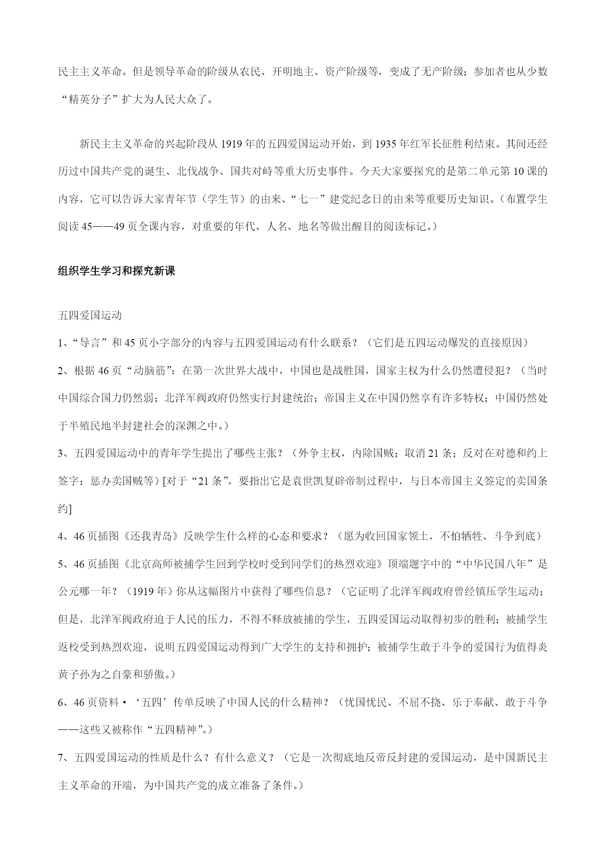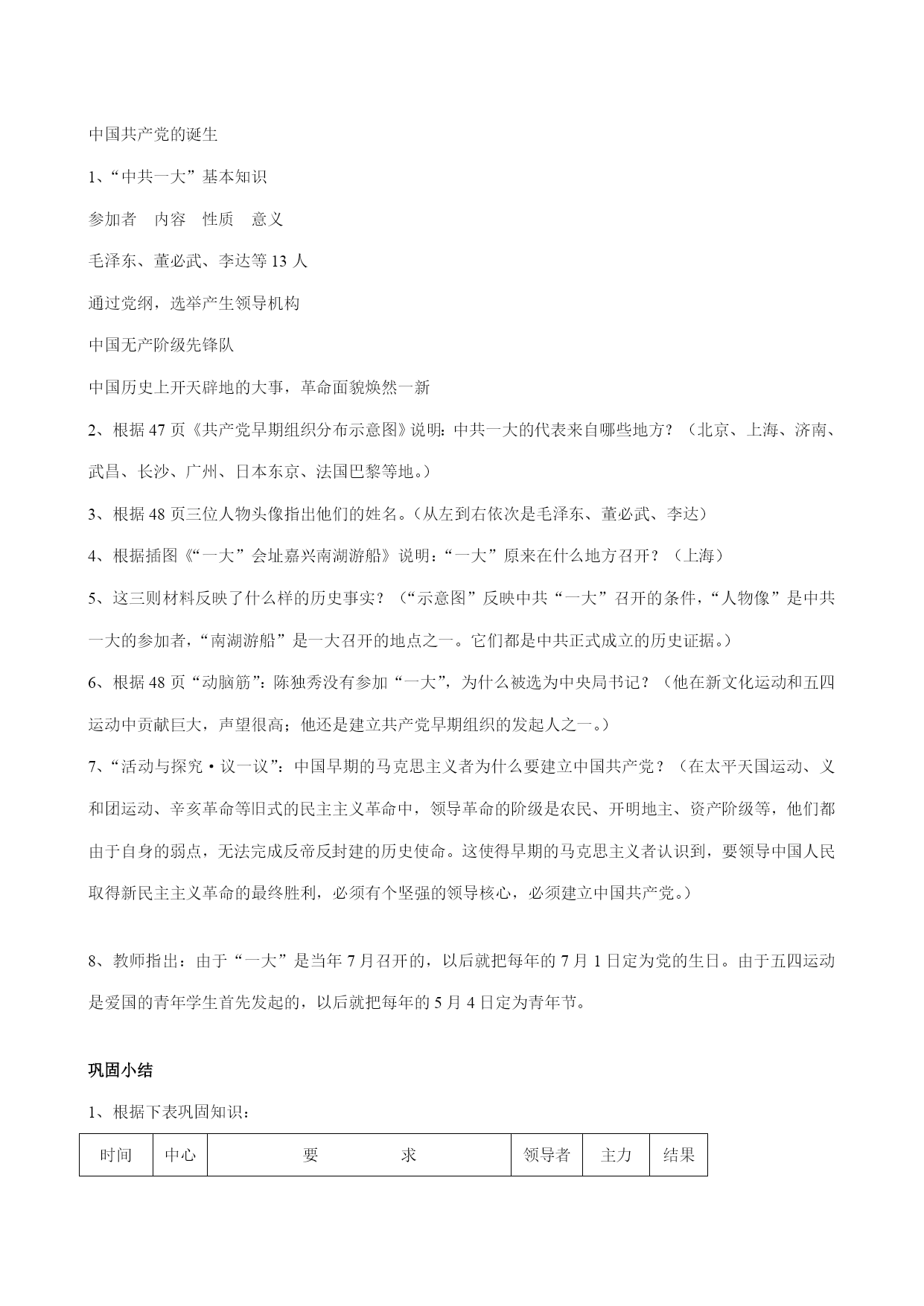 八年级历史第10课五四爱国运动和中国共产党的成立 教学目标 基础知识了解五四运动的背景、内容(时、地、人、口号等)、结果及其意义;中国共产党的成立及其意义掌握五四爱国运动的历史意义,中国共产党诞生的概况能力训练过程方法阅读观察再造场景从课文和插图、图表中提取有效信息,再现五四运动的时代背景,探索其对于中国共产党的诞生所起的作用讨论分析理解概念从五四运动的传单、口号分析其性质,理解其精神;从中共一大、二大的召开,理解中国共产党诞生的历史意义构建宏观知识结构五四运动为中共的成立奠定了思想基础和组织基础,它属于中共成立的重要原因,是中国新民主主义革命的开端;中共的成立是中国近代史上开天辟地的大事,中国革命的面貌从此焕然一新情感态度价值观爱国情感五四青年表现出来的斗争精神是极其崇高的爱国主义精神,新时代的青年学生应当继承光荣传统,奋发学习,矢志完成民族复兴大业思想意识中国的资产阶级天生软弱妥协,无法完成彻底反帝反封建的历史使命,中国革命需要建立一个坚强的领导核心——中国共产党教学重点五四爱国运动的历史意义和中国共产党的诞生 教学难点对于五四精神和中国共产党诞生意义的理解 教学过程 导入新课:组织学生回顾上一节课学过的线索,讨论回答问题:新文化运动有什么历史意义?(它是我国历史上一次空前的思想大解放运动,启发人们追求民主和科学,探索救国救民的真理,为马克思主义在中国的传播创造了条件。) 承上启下,教师讲授:就在新文化运动发展的过程中,爆发了五四爱国运动,中国历史进入了新民主主义革命时期。新民主主义革命就是无产阶级领导的人民大众的反帝反封建的革命。她同太平天国运动、义和团运动、辛亥革命等旧式的民主主义革命相比,在反帝反封建这个目标上是一脉相承的,所以还属于民主主义革命。但是领导革命的阶级从农民、开明地主、资产阶级等,变成了无产阶级;参加者也从少数“精英分子”扩大为人民大众了。 新民主主义革命的兴起阶段从1919年的五四爱国运动开始,到1935年红军长征胜利结束。其间还经历过中国共产党的诞生、北伐战争、国共对峙等重大历史事件。今天大家要探究的是第二单元第10课的内容,它可以告诉大家青年节(学生节)的由来、“七一”建党纪念日的由来等重要历史知识。(布置学生阅读45——49页全课内容,对重要的年代、人名、地名等做出醒目的阅读标记。) 组织学生学习和探究新课 五四爱国运动 1、“导言”和45页小字部分的内容与五四爱国运动有什么联系?(它们是五四运动爆发的直接原因) 2、根据46页“动脑筋”:在第一次世界大战中,中国也是战胜国,国家主权为什么仍然遭侵犯?(当时中国综合国力仍然弱;北洋军阀政府仍然实行封建统治;帝国主义在中国仍然享有许多特权;中国仍然处于半殖民地半封建社会的深渊之中。) 3、五四爱国运动中的青年学生提出了哪些主张?(外争主权,内除国贼;取消21条;反对在对德和约上签字;惩办卖国贼等)[对于“21条”,要指出它是袁世凯复辟帝制过程中,与日本帝国主义签定的卖国条约] 4、46页插图《还我青岛》反映学生什么样的心态和要求?(愿为收回国家领土,不怕牺牲、斗争到底) 5、46页插图《北京高师被捕学生回到学校时受到同学们的热烈欢迎》顶端题字中的“中华民国八年”是公元哪一年?(1919年)你从这幅图片中获得了哪些信息?(它证明了北洋军阀政府曾经镇压学生运动;但是,北洋军阀政府迫于人民的压力,不得不释放被捕的学生,五四爱国运动取得初步的胜利;被捕学生返校受到热烈欢迎,说明五四爱国运动得到广大学生的支持和拥护;被捕学生敢于斗争的爱国行为值得炎黄子孙为之自豪和骄傲。) 6、46页资料·‘五四’传单反映了中国人民的什么精神?(忧国忧民、不屈不挠、乐于奉献、敢于斗争——这些又被称作“五四精神”。) 7、五四爱国运动的性质是什么?有什么意义?(它是一次彻底地反帝反封建的爱国运动,是中国新民主主义革命的开端,为中国共产党的成立准备了条件。) 中国共产党的诞生 1、“中共一大”基本知识 参加者内容性质意义 毛泽东、董必武、李达等13人 通过党纲,选举产生领导机构 中国无产阶级先锋队 中国历史上开天辟地的大事,革命面貌焕然一新 2、根据47页《共产党早期组织分布示意图》说明:中共一大的代表来自哪些地方?(北京、上海、济南、武昌、长沙、广州、日本东京、法国巴黎等地。) 3、根据48页三位人物头像指出他们的姓名。(从左到右依次是毛泽东、董必武、李达) 4、根据插图《“一大”会址嘉兴南湖游船》说明:“一大”原来在什么地方召开?(上海) 5、这三则材料反映了什么样的历史事实?(“示意图”反映中共“一大”召开的条件,“人物像”是中共一大的参加者,“南湖游船”是一大召开的地点之一。它们都是中共正式成立的历史证据。) 6、根据48页“动脑筋”:陈独秀没有参加“一大”,为