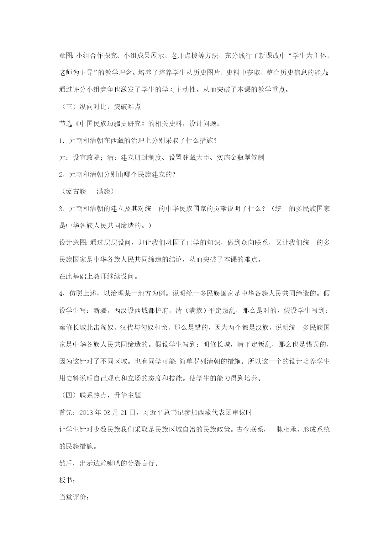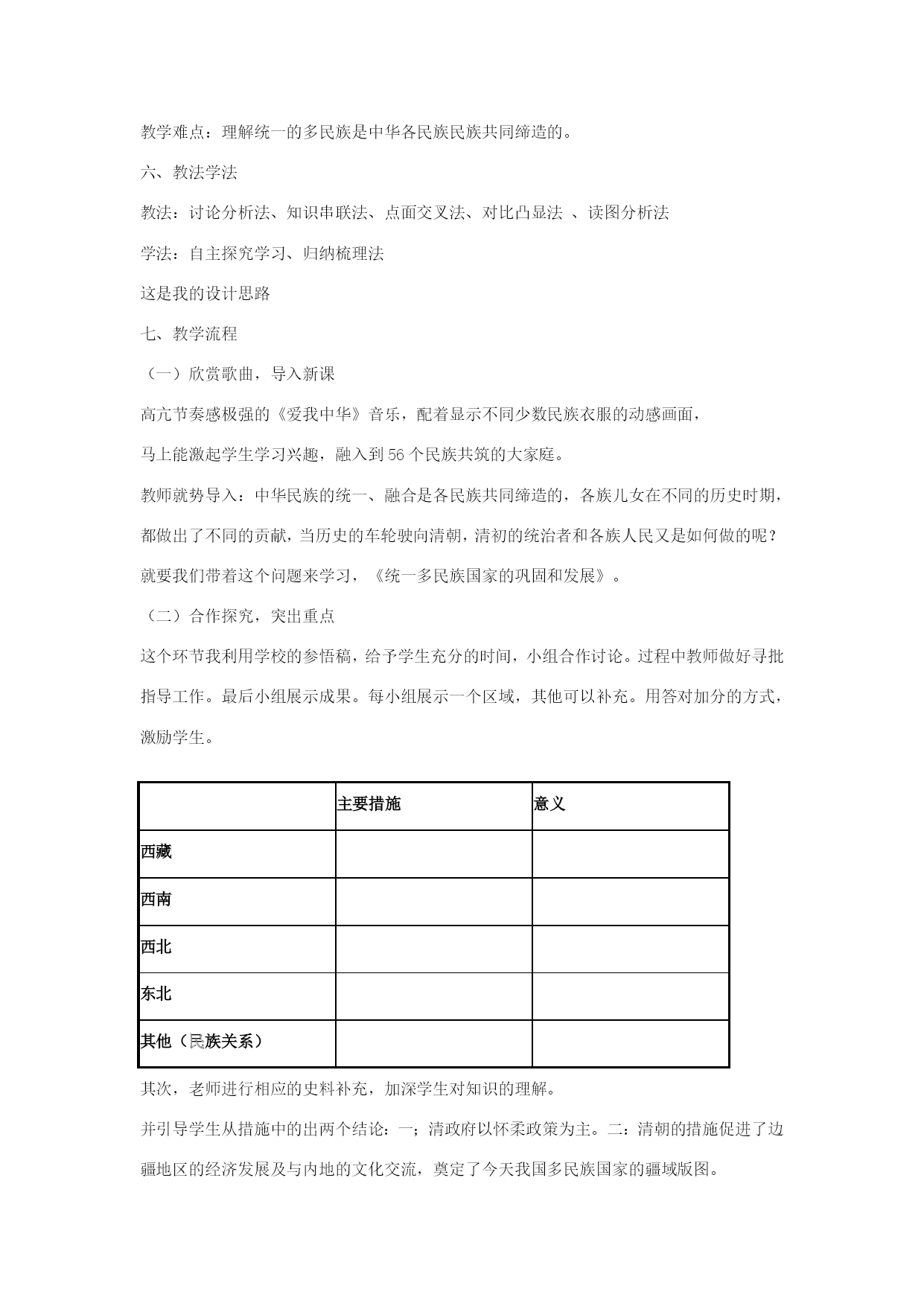 《统一多民族国家的巩固和发展》优质说课稿 各位评为: 下午好! 依据课标2—2—4讲述中国古代不同历史时期各民族相互交往、交流、交融的事例,说明统一的多民族国家是中华各族人民共同缔造的。我选取人教版八下第五单元第五课第二框《统一多民族国家的巩固和发展》为载体,来阐释本课标内容,做到依标施教。 二、教材地位: 本课主要讲述清朝前期,采取一系列民族治理措施,促进了少数民族与内地的交流、交融,进一步巩固和发展自秦汉以来开创的统一的多民族国家,奠定了今天我国多民族国家的疆域版图。因此,清朝的民族政策是这一体系中不可缺少的至关重要的一环。 三、学情分析 学生都知道我国是一个统一的多民族国家,也能列举出不少少数民族的名称,或者也能用以前的知识来说明,但对清朝的民族政策、史实知之甚少。 学生已具备一定的历史分析和历史学习能力,理性思维逐步增强的特点,很需要用史实与他们对话,从而调动学生思维的活跃和情感的升华。 四、教学目标 科学的教学目标具有良好的导向和激励作用,根据课标要求,结合教材内容和学生实际,我拟定了如下三维教学目标。 1、知识与技能目标:了解清政府加强边疆地区管理采取的措施及其意义,掌握清朝的疆域,充分认识到统一的多民族国家是中国各民族人民共同缔造的。 2、过程与方法目标:培养学生从历史图片、史料中获取历史信息的能力;初步掌握收集和整理史料与学习历史的方法;培养用史料说明自己观点和立场的态度和技能。 3、情感态度价值观目标:培养学生热爱祖国、努力学习、反对分裂的爱国主义情感和态度。 五、教学重难点 根据学生已有的知识储备和学习能力,我认为本课的教学重点在于: 教学重点:了解清政府加强边疆地区管理采取的措施及其意义。 教学难点:理解统一的多民族是中华各民族民族共同缔造的。 六、教法学法 教法:讨论分析法、知识串联法、点面交叉法、对比凸显法、读图分析法 学法:自主探究学习、归纳梳理法 这是我的设计思路 七、教学流程 (一)欣赏歌曲,导入新课 高亢节奏感极强的《爱我中华》音乐,配着显示不同少数民族衣服的动感画面, 马上能激起学生学习兴趣,融入到56个民族共筑的大家庭。 教师就势导入:中华民族的统一、融合是各民族共同缔造的,各族儿女在不同的历史时期,都做出了不同的贡献,当历史的车轮驶向清朝,清初的统治者和各族人民又是如何做的呢?就要我们带着这个问题来学习,《统一多民族国家的巩固和发展》。 (二)合作探究,突出重点 这个环节我利用学校的参悟稿,给予学生充分的时间,小组合作讨论。过程中教师做好寻批指导工作。最后小组展示成果。每小组展示一个区域,其他可以补充。用答对加分的方式,激励学生。 主要措施意义西藏西南西北东北其他(民族关系)其次,老师进行相应的史料补充,加深学生对知识的理解。 并引导学生从措施中的出两个结论:一;清政府以怀柔政策为主。二:清朝的措施促进了边疆地区的经济发展及与内地的文化交流,奠定了今天我国多民族国家的疆域版图。 意图:小组合作探究、小组成果展示、老师点拨等方法,充分践行了新课改中“学生为主体,老师为主导”的教学理念。培养了培养学生从历史图片、史料中获取、整合历史信息的能力;通过评分小组竞争也激发了学生的学习主动性。从而突破了本课的教学重点。 (三)纵向对比,突破难点 节选《中国民族边疆史研究》的相关史料,设计问题: 1.元朝和清朝在西藏的治理上分别采取了什么措施? 元:设宣政院;清:建立册封制度、设置驻藏大臣、实施金瓶掣签制 2、元朝和清朝分别由哪个民族建立的? (蒙古族满族) 3、元朝和清朝的建立及其对统一的中华民族国家的贡献说明了什么?(统一的多民族国家是中华各族人民共同缔造的。) 设计意图:通过层层设问,即让我们巩固了已学的知识,做到众向联系,又让我们统一的多民族国家是中华各族人民共同缔造的结论,从而突破了本课的难点。 在此基础上教师继续设问。 4、仿照上述,以治理某一地方为例。说明统一多民族国家是中华各族人民共同缔造的。假设学生写:新疆,西汉设西域都护府,清(满族)平定叛乱,那么是对的。假设学生写到:秦修长城北击匈奴,汉代与匈奴和亲,那么是错的,因为两个都是汉族,说明统一多民族国家是中华各族人民共同缔造的。假设学生写到:明修长城,清平定叛乱,那么也是错误的,因为这针对了不同区域。也有同学可能:简单罗列清朝的措施。所以这一个的设计培养学生用史料说明自己观点和立场的态度和技能。使学生的能力得到培养。 (四)联系热点,升华主题 首先:2013年03月21日,习近平总书记参加西藏代表团审议时 让学生针对少数民族我们采取是民族区域自治的民族政策。古今联系,一脉相承,形成系统的民族措施。 然后,出示达赖喇叭的分裂言行。 板书: 当堂评价:
