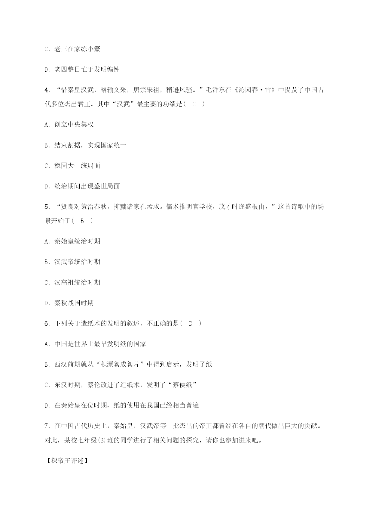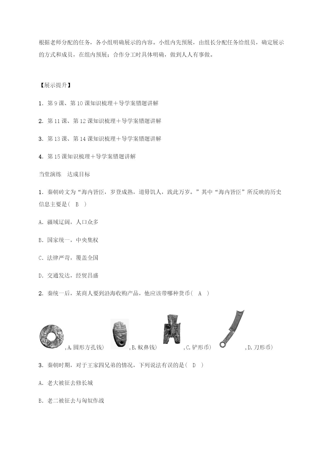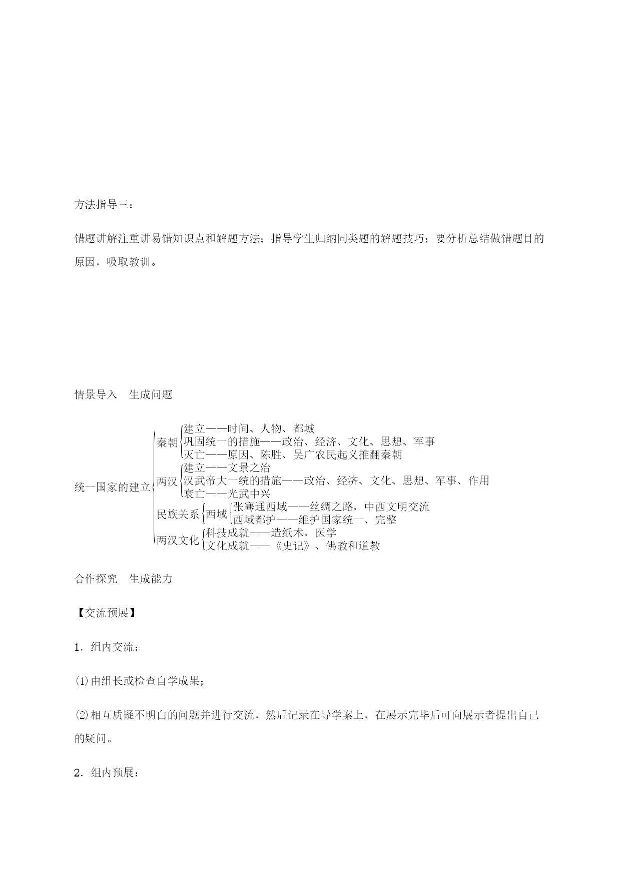 统一国家的建立 【复习目标】 1.掌握秦统一的时间,秦朝巩固统一的措施。 2.全面客观一分为二地评价秦始皇功过。 3.了解陈胜、吴广领导的农民起义的历史意义;项羽、刘邦所领导的战争性质在秦亡前后的变化。 4.掌握汉武帝为实现大一统所采取的措施;张骞 两次出使西域的时间、影响;丝绸之路的路线及作用。 5.了解造纸术的发明和蔡伦改进造纸术;华佗、张仲景和《伤寒杂病论》。 6.了解佛教的传入时间、道教的兴起及创始人;司马迁《史记》的体例及内容。 要求学生了解“复习目标”,划记其中的关键词,明确复习目标。 方法指导一: 知识梳理注重构建框架,落实重难点。注意各知识点之间的重要联系。 方法指导二: 老师巡查课堂,及时指导薄弱小组,适当给出色完成任务的小组加分。 方法指导三: 错题讲解注重讲易错知识点和解题方法;指导学生归纳同类题的解题技巧;要分析总结做错题目的原因,吸取教训。 情景导入生成问题 eq\a\vs4\al\co1(统一国家的建立)eq\b\lc\{(\a\vs4\al\co1(秦朝\b\lc\{(\a\vs4\al\co1(建立——时间、人物、都城,巩固统一的措施——政治、经济、文化、思想、军事,灭亡——原因、陈胜、吴广农民起义推翻秦朝)),两汉\b\lc\{(\a\vs4\al\co1(建立——文景之治,汉武帝大一统的措施——政治、经济、文化、思想、军事、作用,衰亡——光武中兴)),民族关系\b\lc\{(\a\vs4\al\co1(西域\b\lc\{(\a\vs4\al\co1(张骞通西域——丝绸之路,中西文明交流,西域都护——维护国家统一、完整)))),两汉文化\b\lc\{(\a\vs4\al\co1(科技成就——造纸术,医学,文化成就——《史记》、佛教和道教)))) 合作探究生成能力 【交流预展】 1.组内交流: (1)由组长或检查自学成果; (2)相互质疑不明白的问题并进行交流,然后记录在导学案上,在展示完毕后可向展示者提出自己的疑问。 2.组内预展: 根据老师分配的任务,各小组明确展示的内容。小组内先预展,由组长分配任务给组员,确定展示的方式和成员,在组内预展;合作分工时具体明确,做到人人有事做。 【展示提升】 1.第9课、第10课知识梳理+导学案错题讲解 2.第11课、第12课知识梳理+导学案错题讲解 3.第13课、第14课知识梳理+导学案错题讲解 4.第15课知识梳理+导学案错题讲解 当堂演练达成目标 1.秦朝砖文为“海内皆臣,岁登成熟,道毋饥人,践此万岁。”其中“海内皆臣”所反映的历史信息主要是(B) A.疆域辽阔,人口众多 B.国家统一,中央集权 C.法律严苛,覆盖全国 D.交通发达,经贸昌盛 2.秦统一后,某商人要到沿海收购产品,他应该带哪种货币(A) ,A.圆形方孔钱),B.蚁鼻钱),C.铲形币),D.刀形币) 3.秦朝时期,对于王家四兄弟的情况,下列说法有误的是(D) A.老大被征去修长城 B.老二被征去与匈奴作战 C.老三在家练小篆 D.老四整日忙于发明编钟 4.“惜秦皇汉武,略输文采,唐宗宋祖,稍逊风骚。”毛泽东在《沁园春·雪》中提及了中国古代多位杰出君王。其中“汉武”最主要的功绩是(C) A.创立中央集权 B.结束割据,实现国家统一 C.稳固大一统局面 D.统治期间出现盛世局面 5.“贤良对策治春秋,抑黜诸家孔孟求。儒术推明官学校,茂才时逢盛根由。”这首诗歌中的场景开始于(B) A.秦始皇统治时期 B.汉武帝统治时期 C.汉高祖统治时期 D.秦秋战国时期 6.下列关于造纸术的发明的叙述,不正确的是(D) A.中国是世界上最早发明纸的国家 B.西汉前期就从“积漂絮成絮片”中得到启示,发明了纸 C.东汉时期,蔡伦改进了造纸术,发明了“蔡侯纸” D.在秦始皇在位时期,纸的使用在我国已经相当普遍 7.在中国古代历史上,秦始皇、汉武帝等一批杰出的帝王都曾经在各自的朝代做出巨大的贡献。对此,某校七年级(3)班的同学进行了相关问题的探究,请你也参加进来吧。 【探帝王评述】 评述一秦始皇是第一个把中国统一起来的人物。他统一了中国的……促进了各地区经济文化的交流。 评述二汉武帝是我国历史上又一位很有作为的皇帝。他在位时,采取了一系列措施,加强中央集权,使西汉出现了“大一统”的局面。 请回答: (1)请结合所学知识分析评述一中的“……”处应该填写什么内容? 文字、货币、度量衡。 (2)结合所学知识说明汉武帝采取了哪些措施来实理由“大一统”? 政治上:颁布“推恩令”,解除王国对中央的威胁;思想上:“罢黜百家,独尊儒术”;军事上:对匈奴展开反击战;经济上:统一铸造五铢钱和盐铁官营。 【比帝王不同】 (3)比较是我们学习历史最常见的一种方法,试比较秦始皇和汉武帝