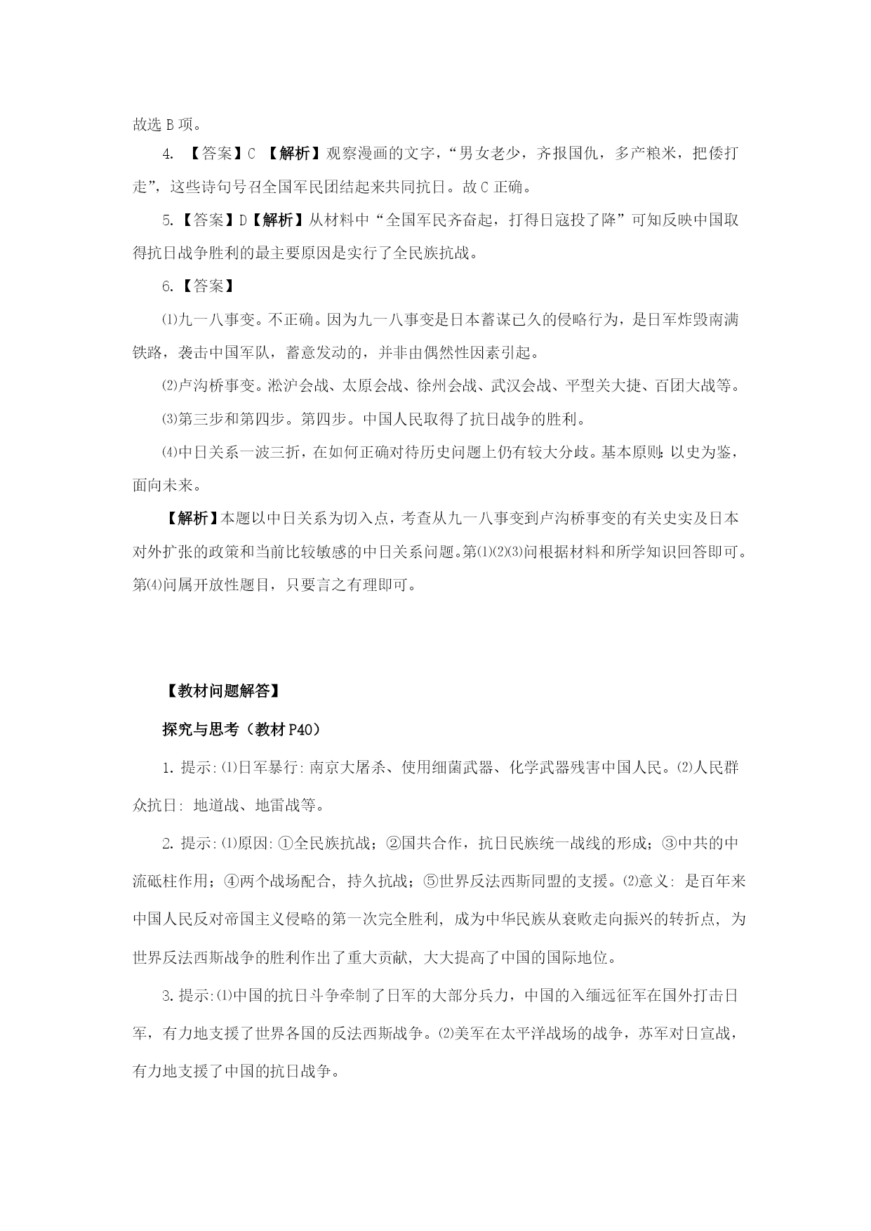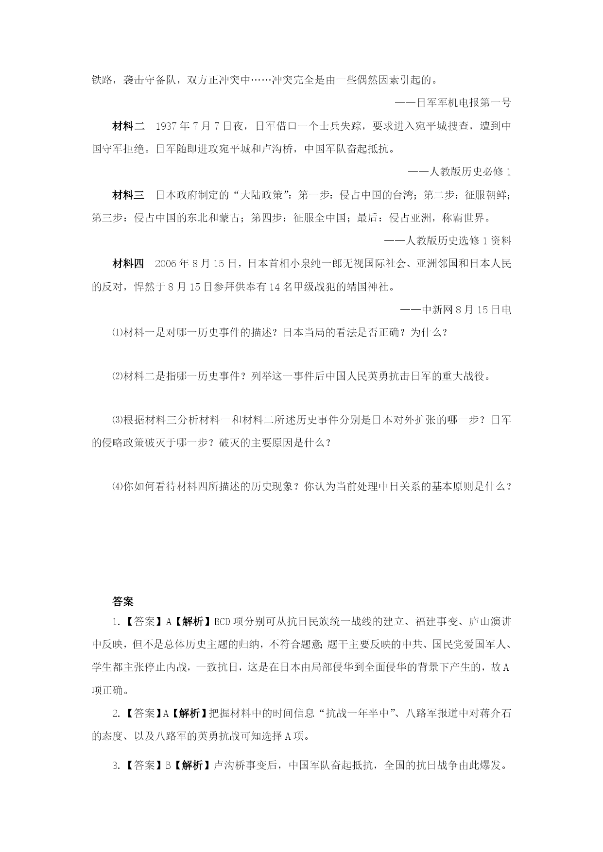 2.9中华民族的抗日战争(教学素材) 1.1933年,国民革命军十九路军发动福建事变,与红军签订反蒋抗日军事协定;1935年12月,北平学生掀起一二•九运动,呼吁停止内战,共赴国难;1936年,8月中共向国民党呼吁停止内战,建立抗日民族统一战线;1937年7月蒋介石庐山演讲,誓言不惜一切牺牲,抗战到底。上述信息反应的共同历史主题是 A.民族危机促使民族意识觉醒B.国共两党由对峙走向抗日 C.国民党内部的分化逐渐加剧D.国民政府的抗战态度日益坚决 2.抗战期间八路军某刊物报道:“八路军在抗战一年半中,在蒋委员长与战区司令长官的领导之下,在朱彭总副司令及各部各级长官与共产党员的领导之下,协同各部友军,进行了英勇的抗战。”与报道相一致的“英勇的抗战”是 A.平型关大捷B.百团大战C.徐州会战 D.淞沪会战 3.《大刀进行曲》如此唱道:“大刀向鬼子们的头上砍去!全国武装的弟兄们!抗战的一天来到了,抗战的一天来到了!”促使“全国武装的弟兄们!抗战的一天来到了”的事件是 A.九一八事变B.卢沟桥事变C.华北事变D.八一三事变 4.下图为某时期的漫画,从其主题可以获取的历史信息是 A.晚清政府实业救国B.国民政府发动国民大革命 C.宣传中国军民团结抗日D.赞扬解放区土地改革 5.“日本鬼子野心狼,侵略中国逞凶狂。全国军民齐备起,打得日寇投了降。”此童谣反映了中国取得抗日战争胜利的最主要原因是 A.得到了海外华侨的大力援助B.进行了正面战场的抵抗 C.加入了世界反法西斯同盟D.实行了全民族抗战 6.阅读下列材料: 材料一1931年9月18日晚上10点钟,暴戾的中国军队在北大营西侧,破坏南满铁路,袭击守备队,双方正冲突中……冲突完全是由一些偶然因素引起的。 ——日军军机电报第一号 材料二1937年7月7日夜,日军借口一个士兵失踪,要求进入宛平城搜查,遭到中国守军拒绝。日军随即进攻宛平城和卢沟桥,中国军队奋起抵抗。 ——人教版历史必修1 材料三日本政府制定的“大陆政策”:第一步:侵占中国的台湾;第二步:征服朝鲜;第三步:侵占中国的东北和蒙古;第四步:征服全中国;最后:侵占亚洲,称霸世界。 ——人教版历史选修1资料 材料四2006年8月15日,日本首相小泉纯一郎无视国际社会、亚洲邻国和日本人民的反对,悍然于8月15日参拜供奉有14名甲级战犯的靖国神社。 ——中新网8月15日电 ⑴材料一是对哪一历史事件的描述?日本当局的看法是否正确?为什么? ⑵材料二是指哪一历史事件?列举这一事件后中国人民英勇抗击日军的重大战役。 ⑶根据材料三分析材料一和材料二所述历史事件分别是日本对外扩张的哪一步?日军的侵略政策破灭于哪一步?破灭的主要原因是什么? ⑷你如何看待材料四所描述的历史现象?你认为当前处理中日关系的基本原则是什么? 答案 1.【答案】A【解析】BCD项分别可从抗日民族统一战线的建立、福建事变、庐山演讲中反映,但不是总体历史主题的归纳,不符合题意;题干主要反映的中共、国民党爱国军人、学生都主张停止内战,一致抗日,这是在日本由局部侵华到全面侵华的背景下产生的,故A项正确。 2.【答案】A【解析】把握材料中的时间信息“抗战一年半中”、八路军报道中对蒋介石的态度、以及八路军的英勇抗战可知选择A项。 3.【答案】B【解析】卢沟桥事变后,中国军队奋起抵抗,全国的抗日战争由此爆发。故选B项。 4.【答案】C【解析】观察漫画的文字,“男女老少,齐报国仇,多产粮米,把倭打走”,这些诗句号召全国军民团结起来共同抗日。故C正确。 5.【答案】D【解析】从材料中“全国军民齐奋起,打得日寇投了降”可知反映中国取得抗日战争胜利的最主要原因是实行了全民族抗战。 6.【答案】 ⑴九一八事变。不正确。因为九一八事变是日本蓄谋已久的侵略行为,是日军炸毁南满铁路,袭击中国军队,蓄意发动的,并非由偶然性因素引起。 ⑵卢沟桥事变。淞沪会战、太原会战、徐州会战、武汉会战、平型关大捷、百团大战等。 ⑶第三步和第四步。第四步。中国人民取得了抗日战争的胜利。 ⑷中日关系一波三折,在如何正确对待历史问题上仍有较大分歧。基本原则:以史为鉴,面向未来。 【解析】本题以中日关系为切入点,考查从九一八事变到卢沟桥事变的有关史实及日本对外扩张的政策和当前比较敏感的中日关系问题。第⑴⑵⑶问根据材料和所学知识回答即可。第⑷问属开放性题目,只要言之有理即可。 【教材问题解答】 探究与思考(教材P40) 1.提示:⑴日军暴行:南京大屠杀、使用细菌武器、化学武器残害中国人民。⑵人民群众抗日:地道战、地雷战等。 2.提示:⑴原因:①全民族抗战;②国共合作,抗日民族统一战线的形成;③中共的中流砥柱作用;④两个战场配合,持久抗战;⑤世界反法西斯同盟的支援。⑵意义:是百年来中国人民反对帝国主义侵略的第一次完全胜
