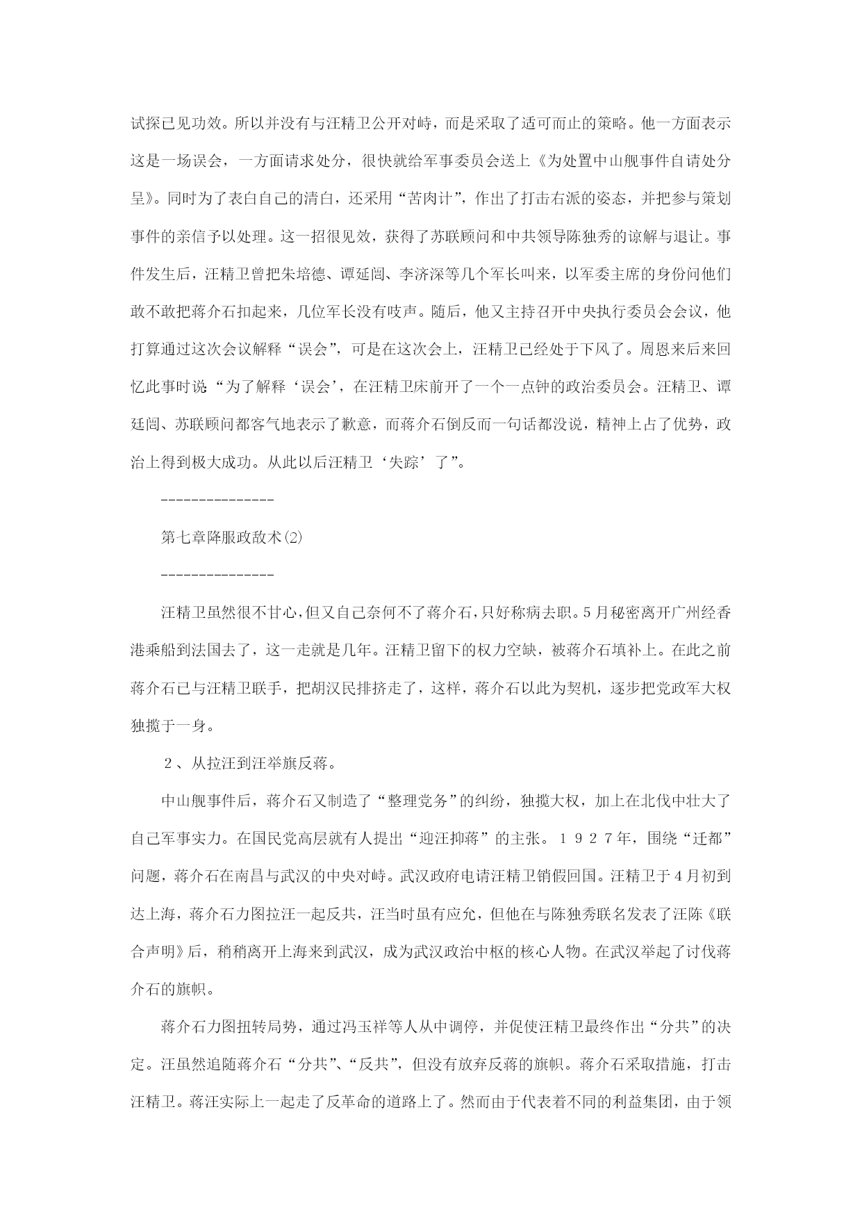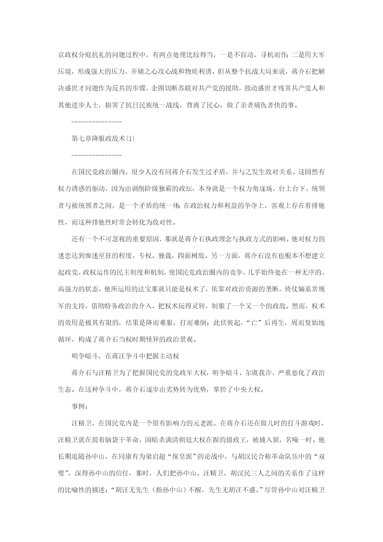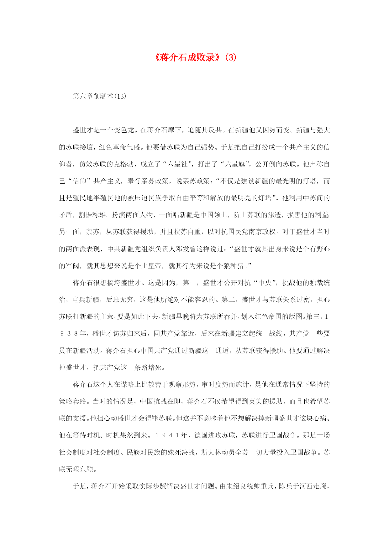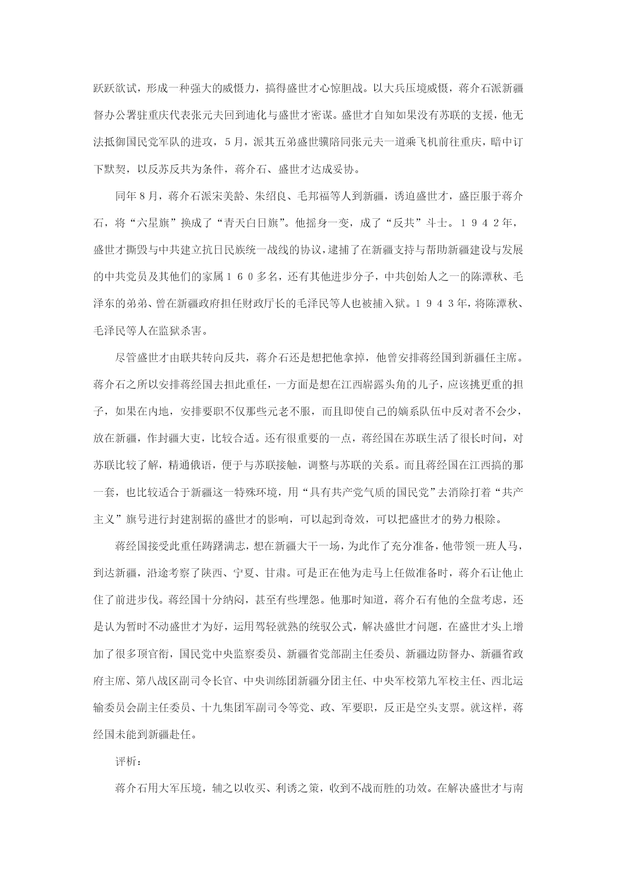 《蒋介石成败录》(3) 第六章削藩术(13) --------------- 盛世才是一个变色龙。在蒋介石麾下,追随其反共。在新疆他又因势而变。新疆与强大的苏联接壤,红色革命气盛。他要借苏联为自己强势。于是把自己打扮成一个共产主义的信仰者,仿效苏联的克格勃,成立了“六星社”,打出了“六星旗”,公开倒向苏联。他声称自己“信仰”共产主义,奉行亲苏政策,说亲苏政策:“不仅是建设新疆的最光明的灯塔,而且是殖民地半殖民地的被压迫民族争取自由平等和解放的最明亮的灯塔”。他利用中苏间的矛盾,割据称雄。扮演两面人物,一面唱新疆是中国领土,防止苏联的渗透,损害他的利益;另一面,亲苏,从苏联获得援助,并且挟苏自重,以对抗国民党南京政权。对于盛世才当时的两面派表现,中共新疆党组织负责人邓发曾这样说过:“盛世才就其出身来说是个有野心的军阀,就其思想来说是个土皇帝,就其行为来说是个狼种猪。” 蒋介石很想搞垮盛世才。这是因为,第一,盛世才公开对抗“中央”,挑战他的独裁统治,屯兵新疆,后患无穷,这是他所绝对不能容忍的。第二,盛世才与苏联关系过密,担心苏联打新疆的主意,要是如此下去,新疆早晚将为苏联所吞并,划入红色帝国的版图。第三,1938年,盛世才访苏归来后,同共产党靠近,后来在新疆建立起统一战线。共产党一些要员在新疆活动。蒋介石担心中国共产党通过新疆这一通道,从苏联获得援助。他要通过解决掉盛世才,把共产党这一条路堵死。 蒋介石这个人在谋略上比较善于观察形势,审时度势而施计,是他在通常情况下坚持的策略套路。当时的情况是,中国抗战在即,蒋介石不仅希望得到英美的援助,而且也希望苏联的支援。他担心动盛世才会得罪苏联。但这并不意味着他不想解决掉新疆盛世才这块心病。他在等待时机。时机果然到来。1941年,德国进攻苏联,苏联进行卫国战争。那是一场社会制度对社会制度、民族对民族的殊死决战,斯大林动员全苏一切力量投入卫国战争。苏联无暇东顾。 于是,蒋介石开始采取实际步骤解决盛世才问题。由朱绍良统帅重兵,陈兵于河西走廊,跃跃欲试,形成一种强大的威慑力,搞得盛世才心惊胆战。以大兵压境威慑,蒋介石派新疆督办公署驻重庆代表张元夫回到迪化与盛世才密谋。盛世才自知如果没有苏联的支援,他无法抵御国民党军队的进攻,5月,派其五弟盛世骥陪同张元夫一道乘飞机前往重庆,暗中订下默契,以反苏反共为条件,蒋介石、盛世才达成妥协。 同年8月,蒋介石派宋美龄、朱绍良、毛邦福等人到新疆,诱迫盛世才,盛臣服于蒋介石,将“六星旗”换成了“青天白日旗”。他摇身一变,成了“反共”斗士。1942年,盛世才撕毁与中共建立抗日民族统一战线的协议,逮捕了在新疆支持与帮助新疆建设与发展的中共党员及其他们的家属160多名,还有其他进步分子,中共创始人之一的陈潭秋、毛泽东的弟弟、曾在新疆政府担任财政厅长的毛泽民等人也被捕入狱。1943年,将陈潭秋、毛泽民等人在监狱杀害。 尽管盛世才由联共转向反共,蒋介石还是想把他拿掉,他曾安排蒋经国到新疆任主席。蒋介石之所以安排蒋经国去担此重任,一方面是想在江西崭露头角的儿子,应该挑更重的担子,如果在内地,安排要职不仅那些元老不服,而且即使自己的嫡系队伍中反对者不会少,放在新疆,作封疆大吏,比较合适。还有很重要的一点,蒋经国在苏联生活了很长时间,对苏联比较了解,精通俄语,便于与苏联接触,调整与苏联的关系。而且蒋经国在江西搞的那一套,也比较适合于新疆这一特殊环境,用“具有共产党气质的国民党”去消除打着“共产主义”旗号进行封建割据的盛世才的影响,可以起到奇效,可以把盛世才的势力根除。 蒋经国接受此重任踌躇满志,想在新疆大干一场,为此作了充分准备,他带领一班人马,到达新疆,沿途考察了陕西、宁夏、甘肃。可是正在他为走马上任做准备时,蒋介石让他止住了前进步伐。蒋经国十分纳闷,甚至有些埋怨。他那时知道,蒋介石有他的全盘考虑,还是认为暂时不动盛世才为好,运用驾轻就熟的统驭公式,解决盛世才问题,在盛世才头上增加了很多顶官衔,国民党中央监察委员、新疆省党部副主任委员、新疆边防督办、新疆省政府主席、第八战区副司令长官、中央训练团新疆分团主任、中央军校第九军校主任、西北运输委员会副主任委员、十九集团军副司令等党、政、军要职,反正是空头支票。就这样,蒋经国未能到新疆赴任。 评析: 蒋介石用大军压境,辅之以收买、利诱之策,收到不战而胜的功效。在解决盛世才与南京政权分庭抗礼的问题过程中,有两点处理比较得当,一是不盲动,寻机而作;二是用大军压境,形成强大的压力,并辅之心攻心战和物质利诱。但从整个抗战大局来说,蒋介石把解决盛世才问题作为反共的步骤,企图切断苏联对共产党的援助,鼓动盛世才残害共产党人和其他进步人士,损害了抗日民族统一战线,背离了民心,做了亲者痛仇者快的事。 --------------- 第七章降服政敌术
