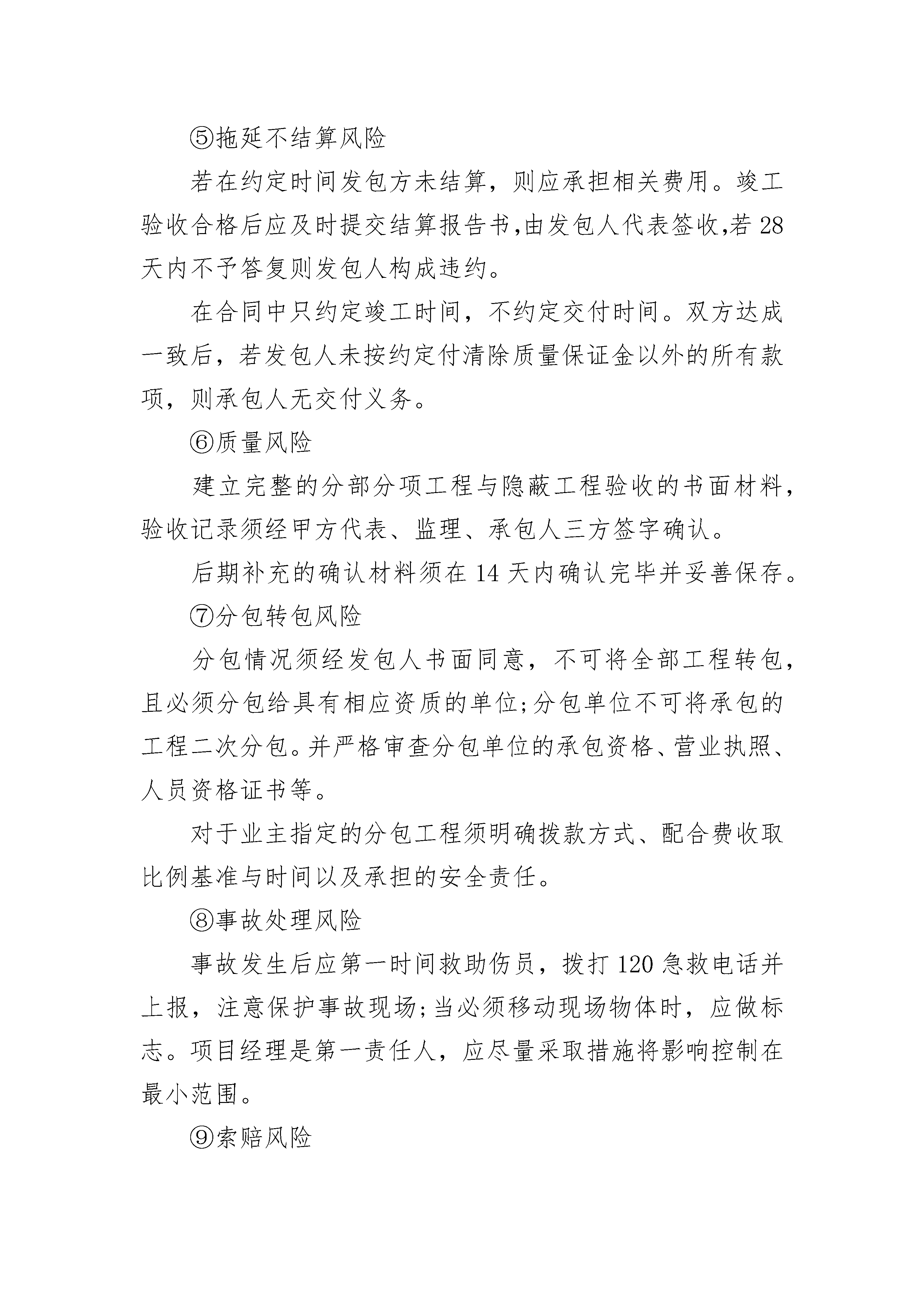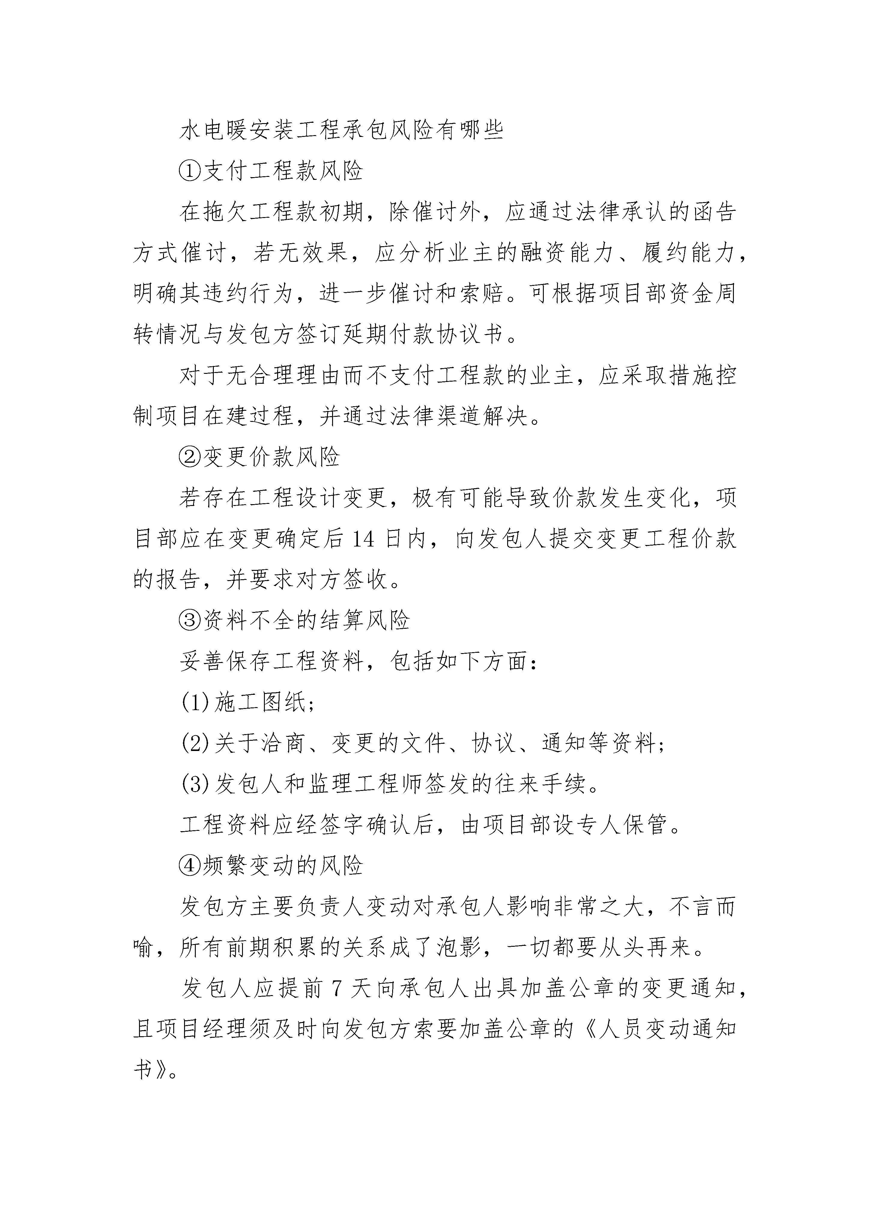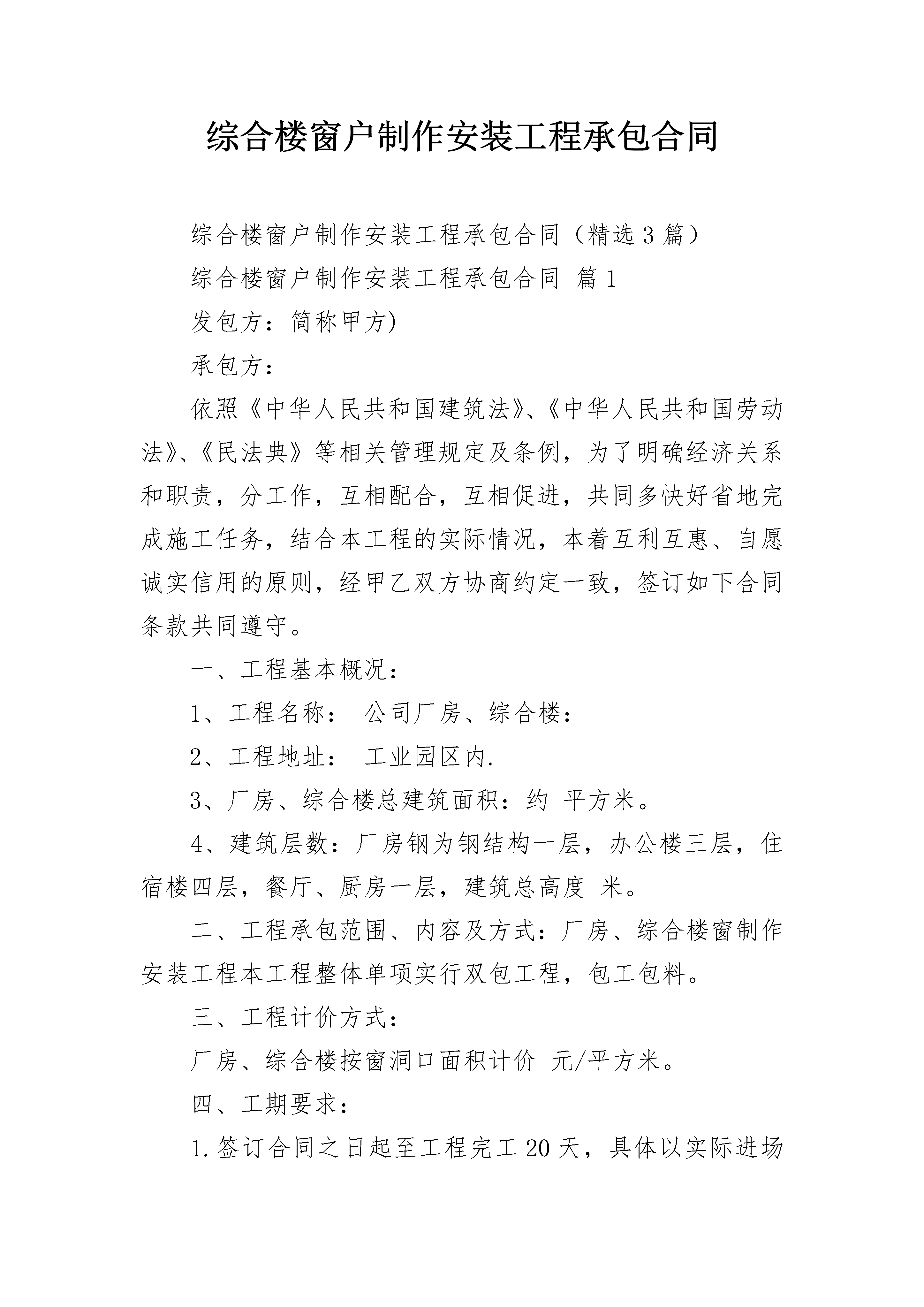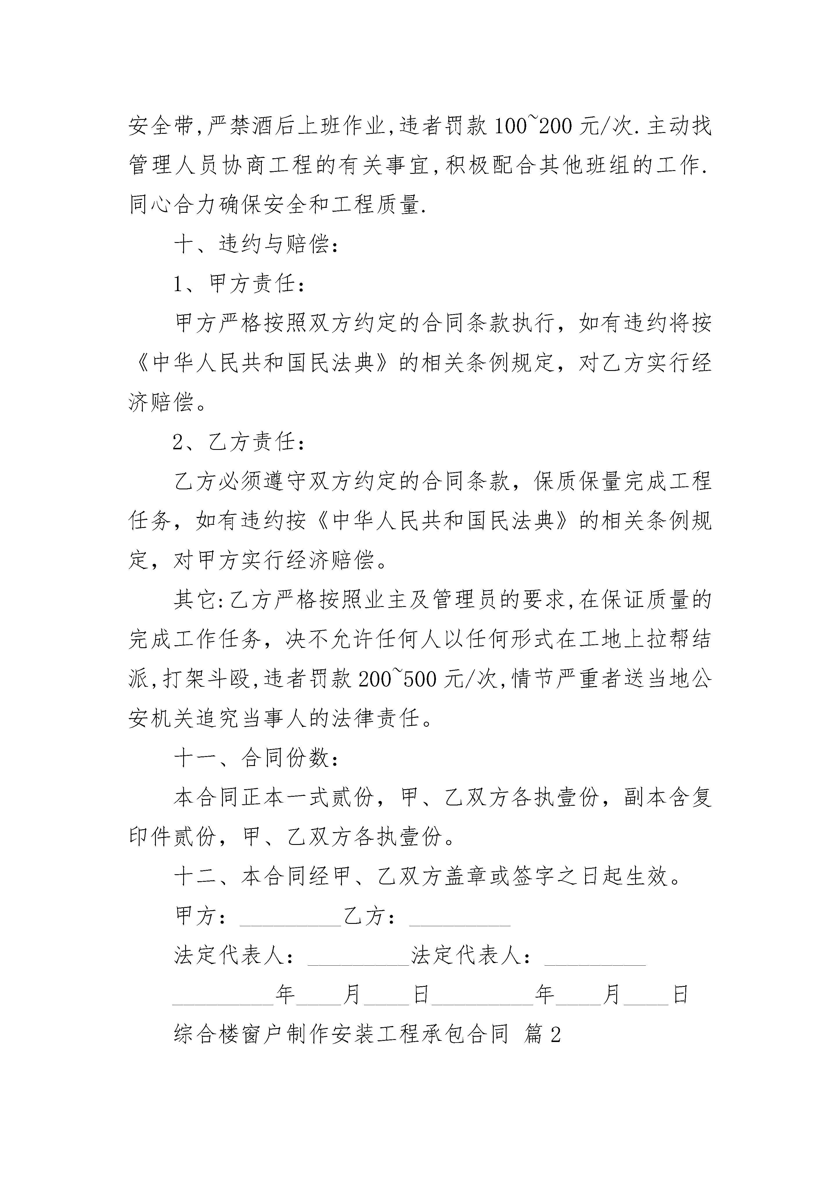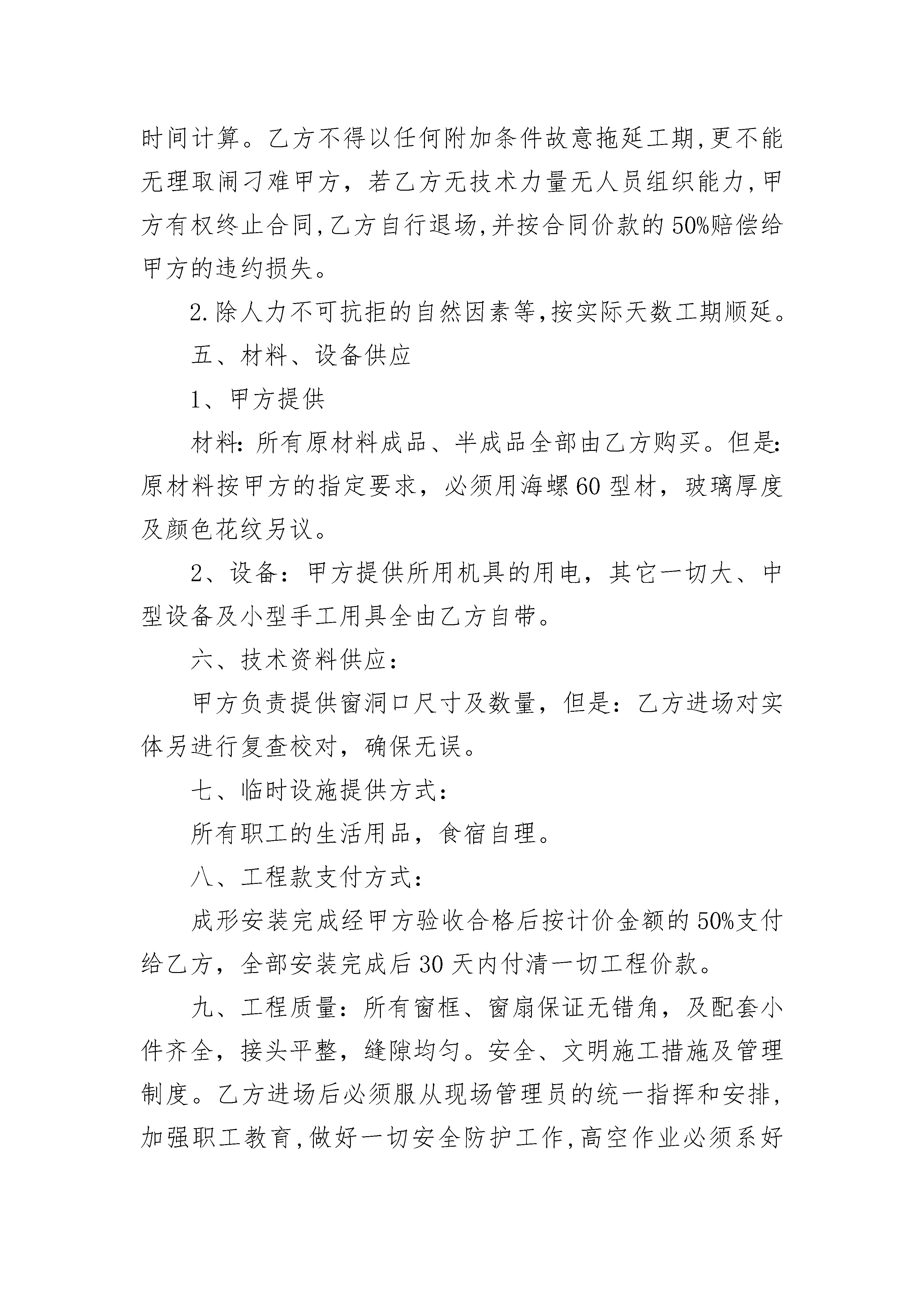 综合楼窗户制作安装工程承包合同综合楼窗户制作安装工程承包合同(精选3篇)综合楼窗户制作安装工程承包合同篇1发包方:简称甲方)承包方:依照《中华人民共和国建筑法》、《中华人民共和国劳动法》、《民法典》等相关管理规定及条例,为了明确经济关系和职责,分工作,互相配合,互相促进,共同多快好省地完成施工任务,结合本工程的实际情况,本着互利互惠、自愿诚实信用的原则,经甲乙双方协商约定一致,签订如下合同条款共同遵守。一、工程基本概况:1、工程名称:公司厂房、综合楼:2、工程地址:工业园区内.3、厂房、综合楼总建筑面积:约平方米。4、建筑层数:厂房钢为钢结构一层,办公楼三层,住宿楼四层,餐厅、厨房一层,建筑总高度米。二、工程承包范围、内容及方式:厂房、综合楼窗制作安装工程本工程整体单项实行双包工程,包工包料。三、工程计价方式:厂房、综合楼按窗洞口面积计价元/平方米。四、工期要求:1.签订合同之日起至工程完工20天,具体以实际进场时间计算。乙方不得以任何附加条件故意拖延工期,更不能无理取闹刁难甲方,若乙方无技术力量无人员组织能力,甲方有权终止合同,乙方自行退场,并按合同价款的50%赔偿给甲方的违约损失。2.除人力不可抗拒的自然因素等,按实际天数工期顺延。五、材料、设备供应1、甲方提供材料:所有原材料成品、半成品全部由乙方购买。但是:原材料按甲方的指定要求,必须用海螺60型材,玻璃厚度及颜色花纹另议。2、设备:甲方提供所用机具的用电,其它一切大、中型设备及小型手工用具全由乙方自带。六、技术资料供应:甲方负责提供窗洞口尺寸及数量,但是:乙方进场对实体另进行复查校对,确保无误。七、临时设施提供方式:所有职工的生活用品,食宿自理。八、工程款支付方式:成形安装完成经甲方验收合格后按计价金额的50%支付给乙方,全部安装完成后30天内付清一切工程价款。九、工程质量:所有窗框、窗扇保证无错角,及配套小件齐全,接头平整,缝隙均匀。安全、文明施工措施及管理制度。乙方进场后必须服从现场管理员的统一指挥和安排,加强职工教育,做好一切安全防护工作,高空作业必须系好安全带,严禁酒后上班作业,违者罚款100~200元/次.主动找管理人员协商工程的有关事宜,积极配合其他班组的工作.同心合力确保安全和工程质量.十、违约与赔偿:1、甲方责任:甲方严格按照双方约定的合同条款执行,如有违约将按《中华人民共和国民法典》的相关条例规定,对乙方实行经济赔偿。2、乙方责任:乙方必须遵守双方约定的合同条款,保质保量完成工程任务,如有违约按《中华人民共和国民法典》的相关条例规定,对甲方实行经济赔偿。其它:乙方严格按照业主及管理员的要求,在保证质量的完成工作任务,决不允许任何人以任何形式在工地上拉帮结派,打架斗殴,违者罚款200~500元/次,情节严重者送当地公安机关追究当事人的法律责任。十一、合同份数:本合同正本一式贰份,甲、乙双方各执壹份,副本含复印件贰份,甲、乙双方各执壹份。十二、本合同经甲、乙双方盖章或签字之日起生效。甲方:_________乙方:_________法定代表人:_________法定代表人:__________________年____月____日_________年____月____日综合楼窗户制作安装工程承包合同篇2水电暖安装工程承包风险有哪些①支付工程款风险在拖欠工程款初期,除催讨外,应通过法律承认的函告方式催讨,若无效果,应分析业主的融资能力、履约能力,明确其违约行为,进一步催讨和索赔。可根据项目部资金周转情况与发包方签订延期付款协议书。对于无合理理由而不支付工程款的业主,应采取措施控制项目在建过程,并通过法律渠道解决。②变更价款风险若存在工程设计变更,极有可能导致价款发生变化,项目部应在变更确定后14日内,向发包人提交变更工程价款的报告,并要求对方签收。③资料不全的结算风险妥善保存工程资料,包括如下方面:(1)施工图纸;(2)关于洽商、变更的文件、协议、通知等资料;(3)发包人和监理工程师签发的往来手续。工程资料应经签字确认后,由项目部设专人保管。④频繁变动的风险发包方主要负责人变动对承包人影响非常之大,不言而喻,所有前期积累的关系成了泡影,一切都要从头再来。发包人应提前7天向承包人出具加盖公章的变更通知,且项目经理须及时向发包方索要加盖公章的《人员变动通知书》。⑤拖延不结算风险若在约定时间发包方未结算,则应承担相关费用。竣工验收合格后应及时提交结算报告书,由发包人代表签收,若28天内不予答复则发包人构成违约。在合同中只约定竣工时间,不约定交付时间。双方达成一致后,若发包人未按约定付清除质量保证金以外的所有款项,则承包人无交付义务。⑥质量风险建立完整的分部分项工程与隐蔽工程验收的书面材料,验收记录须经甲方代表、监理、承包人三方签字确认。后期补充的确认材料须在1