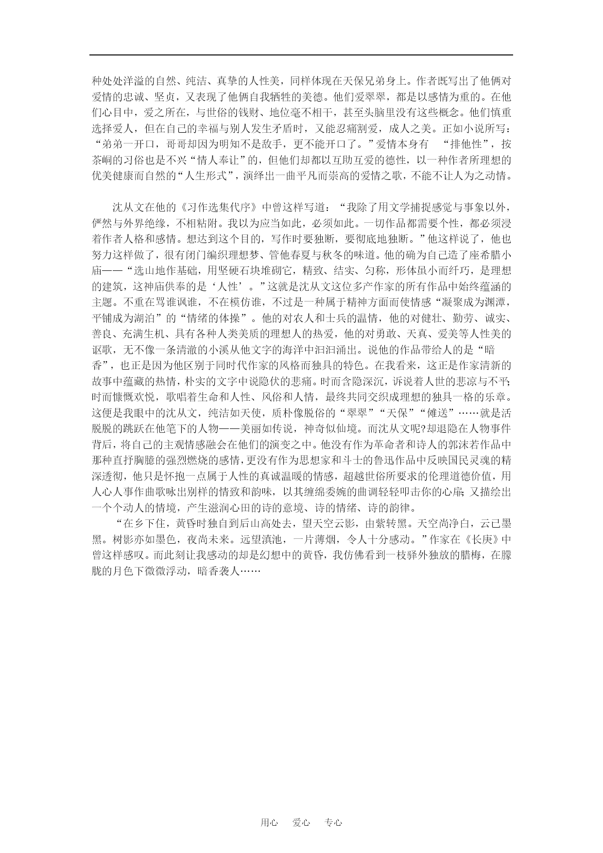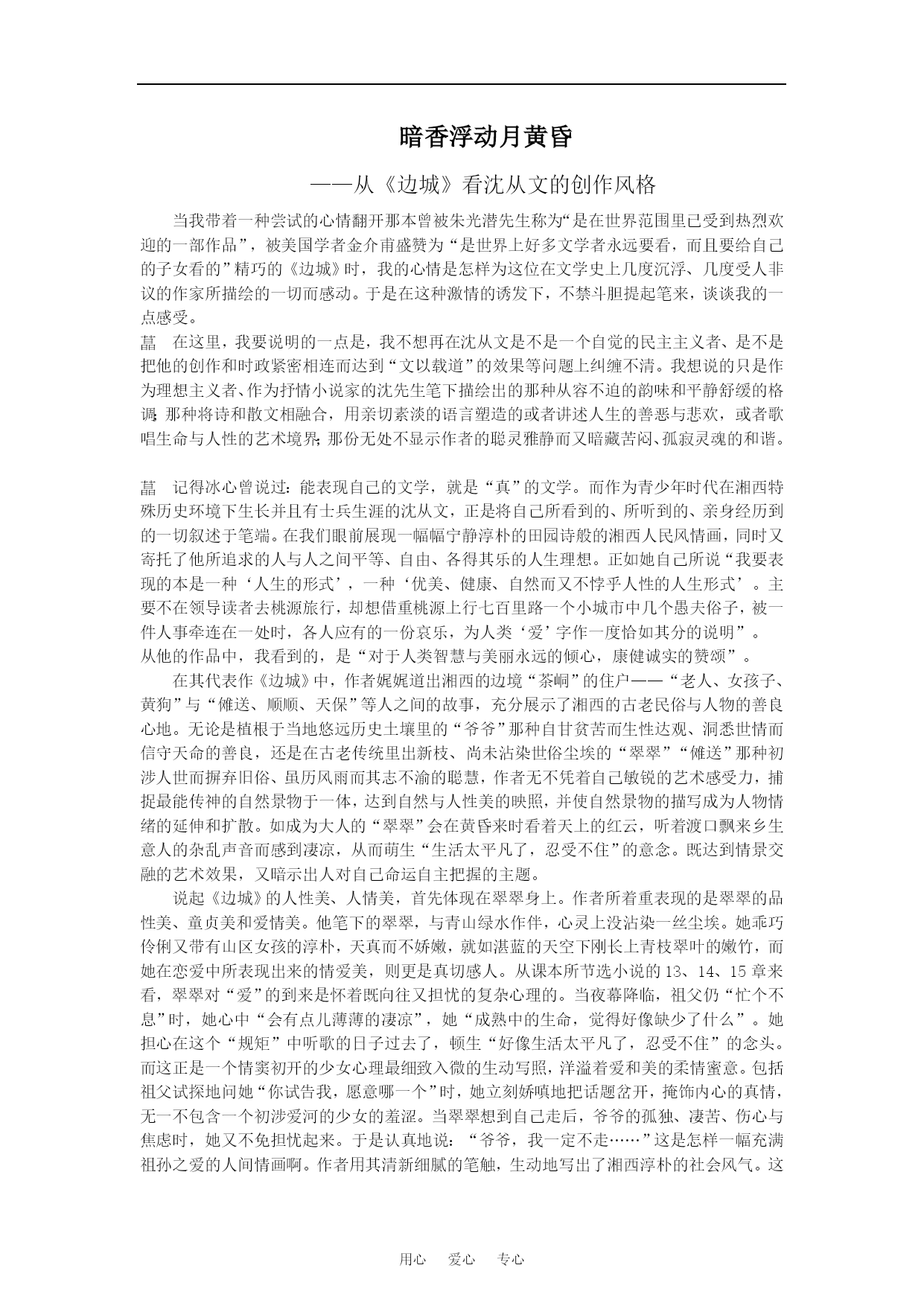 用心爱心专心 暗香浮动月黄昏 ——从《边城》看沈从文的创作风格 当我带着一种尝试的心情翻开那本曾被朱光潜先生称为“是在世界范围里已受到热烈欢迎的一部作品”,被美国学者金介甫盛赞为“是世界上好多文学者永远要看,而且要给自己的子女看的”精巧的《边城》时,我的心情是怎样为这位在文学史上几度沉浮、几度受人非议的作家所描绘的一切而感动。于是在这种激情的诱发下,不禁斗胆提起笔来,谈谈我的一点感受。在这里,我要说明的一点是,我不想再在沈从文是不是一个自觉的民主主义者、是不是把他的创作和时政紧密相连而达到“文以载道”的效果等问题上纠缠不清。我想说的只是作为理想主义者、作为抒情小说家的沈先生笔下描绘出的那种从容不迫的韵味和平静舒缓的格调;那种将诗和散文相融合,用亲切素淡的语言塑造的或者讲述人生的善恶与悲欢,或者歌唱生命与人性的艺术境界;那份无处不显示作者的聪灵雅静而又暗藏苦闷、孤寂灵魂的和谐。记得冰心曾说过:能表现自己的文学,就是“真”的文学。而作为青少年时代在湘西特殊历史环境下生长并且有士兵生涯的沈从文,正是将自己所看到的、所听到的、亲身经历到的一切叙述于笔端。在我们眼前展现一幅幅宁静淳朴的田园诗般的湘西人民风情画,同时又寄托了他所追求的人与人之间平等、自由、各得其乐的人生理想。正如她自己所说“我要表现的本是一种‘人生的形式’,一种‘优美、健康、自然而又不悖乎人性的人生形式’。主要不在领导读者去桃源旅行,却想借重桃源上行七百里路一个小城市中几个愚夫俗子,被一件人事牵连在一处时,各人应有的一份哀乐,为人类‘爱’字作一度恰如其分的说明”。从他的作品中,我看到的,是“对于人类智慧与美丽永远的倾心,康健诚实的赞颂”。在其代表作《边城》中,作者娓娓道出湘西的边境“茶峒”的住户——“老人、女孩子、黄狗”与“傩送、顺顺、天保”等人之间的故事,充分展示了湘西的古老民俗与人物的善良心地。无论是植根于当地悠远历史土壤里的“爷爷”那种自甘贫苦而生性达观、洞悉世情而信守天命的善良,还是在古老传统里出新枝、尚未沾染世俗尘埃的“翠翠”“傩送”那种初涉人世而摒弃旧俗、虽历风雨而其志不渝的聪慧,作者无不凭着自己敏锐的艺术感受力,捕捉最能传神的自然景物于一体,达到自然与人性美的映照,并使自然景物的描写成为人物情绪的延伸和扩散。如成为大人的“翠翠”会在黄昏来时看着天上的红云,听着渡口飘来乡生意人的杂乱声音而感到凄凉,从而萌生“生活太平凡了,忍受不住”的意念。既达到情景交融的艺术效果,又暗示出人对自己命运自主把握的主题。说起《边城》的人性美、人情美,首先体现在翠翠身上。作者所着重表现的是翠翠的品性美、童贞美和爱情美。他笔下的翠翠,与青山绿水作伴,心灵上没沾染一丝尘埃。她乖巧伶俐又带有山区女孩的淳朴,天真而不娇嫩,就如湛蓝的天空下刚长上青枝翠叶的嫩竹,而她在恋爱中所表现出来的情爱美,则更是真切感人。从课本所节选小说的13、14、15章来看,翠翠对“爱”的到来是怀着既向往又担忧的复杂心理的。当夜幕降临,祖父仍“忙个不息”时,她心中“会有点儿薄薄的凄凉”,她“成熟中的生命,觉得好像缺少了什么”。她担心在这个“规矩”中听歌的日子过去了,顿生“好像生活太平凡了,忍受不住”的念头。而这正是一个情窦初开的少女心理最细致入微的生动写照,洋溢着爱和美的柔情蜜意。包括祖父试探地问她“你试告我,愿意哪一个”时,她立刻娇嗔地把话题岔开,掩饰内心的真情,无一不包含一个初涉爱河的少女的羞涩。当翠翠想到自己走后,爷爷的孤独、凄苦、伤心与焦虑时,她又不免担忧起来。于是认真地说:“爷爷,我一定不走……”这是怎样一幅充满祖孙之爱的人间情画啊。作者用其清新细腻的笔触,生动地写出了湘西淳朴的社会风气。这种处处洋溢的自然、纯洁、真挚的人性美,同样体现在天保兄弟身上。作者既写出了他俩对爱情的忠诚、坚贞,又表现了他俩自我牺牲的美德。他们爱翠翠,都是以感情为重的。在他们心目中,爱之所在,与世俗的钱财、地位毫不相干,甚至头脑里没有这些概念。他们慎重选择爱人,但在自己的幸福与别人发生矛盾时,又能忍痛割爱,成人之美。正如小说所写:“弟弟一开口,哥哥却因为明知不是敌手,更不能开口了。”爱情本身有“排他性”,按茶峒的习俗也是不兴“情人奉让”的,但他们却都以互助互爱的德性,以一种作者所理想的优美健康而自然的“人生形式”,演绎出一曲平凡而崇高的爱情之歌,不能不让人为之动情。沈从文在他的《习作选集代序》中曾这样写道:“我除了用文学捕捉感觉与事象以外,俨然与外界绝缘,不相粘附。我以为应当如此,必须如此。一切作品都需要个性,都必须浸着作者人格和感情。想达到这个目的,写作时要独断,要彻底地独断。”他这样说了,他也努力这样做了,很有闭门编织理想梦、管他春夏与秋冬的味道。他的确为自己造了座希腊小庙——“选山地作基础,用坚硬石块堆砌它,精致
