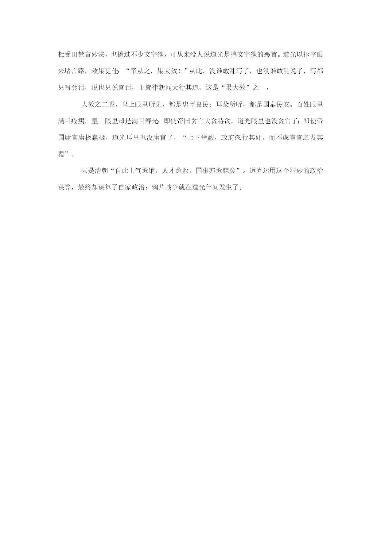 为何道光皇帝也搞“文字狱”却没留下千古骂名? 可以使文字成狱,却不能让文人成名,不但不能让文人成名,而且可使之无比羞愧,使之永远钉在历史耻辱柱上;可以搞文字狱,却不能让文人在书上记录皇上搞文字狱。要达到这双赢效果,有什么办法吗? 大臣们纷纷上谏疏举报,左右非君,动辄得咎,弄得道光很闹心。道光想做个好皇帝,既不想在竹帛上留下他以文字构狱滥杀文人的记录,也不想有文人以文字来打扰他当皇帝的快活。可这是个大难题,君臣为此博弈千年,道光自然也解决不了,所以,他问他的首席智囊杜受田,“帝尝厌群臣之进言,问杜以何法禁止之”。 杜教授脱口就出:“凡进言者,不问所言如何,但挑剔其奏中格式之失,字体之误,交吏部议处,则言者苦之,封奏自稀。”拿帝国钦定的公文格式,一一核对,找格式纰漏;若找不出格式有误,那就找错别字。找出了格式错误,找出了错别字,剩下的就交给吏部去定罪吧。 其实,这种禁言之法,明朝皇帝早就用上了。成化十八年,天下大灾,南京御史李珊上书叫皇帝赈济子民。成化皇帝大发脾气,但从思想上又挑不出毛病,于是,就从文字上找,结果找出来好几个错别字。成化皇帝马上将李珊交吏部议处,押赴午门,重重地打了20大板!隆庆初,御史詹仰庇奉命去检查国库,看到国库空虚,于是上疏叫皇上戒奢,结果出于同样的理由,隆庆皇帝找出了文体上的错误,詹被廷杖一百,削籍为民! 因为错别字而被打屁股、被双开的,在明朝有很多,如南京工部尚书吴廷举,兵部右侍郎翁万达,都是因为文字而构狱,但一个也不在文字狱里挂名,也就是说,他们的案子不是冤假错案,皇上都给办成了铁案、真案、对案,连翻案都不可能;文人想因文字狱而成名的梦想也全落空。 被打成思想犯,文人有时觉得挺高兴,因为可以青史留名,但因错别字而被打屁股、被双开的,文人都不好意思记载。道光的禁言之计,实在很妙:“且使臣下见帝于此等小节尚不肯稍贷,若犯忌讳之大者,被罪必更深矣,如此,则无禁遏言路之名,而言路自然结舌!” 成化帝、隆庆帝,搞了很多文字狱,但没人说他们是搞文字狱的罪魁;道光采用了杜受田禁言妙法,也搞过不少文字狱,可从来没人说道光是搞文字狱的恶首。道光以抠字眼来堵言路,效果更佳:“帝从之,果大效!”从此,没谁敢乱写了,也没谁敢乱说了,写都只写套话,说也只说官话,主旋律新闻大行其道,这是“果大效”之一。 大效之二呢,皇上眼里所见,都是忠臣良民;耳朵所听,都是国泰民安。百姓眼里满目疮痍,皇上眼里却是满目春光;即使帝国贪官大贪特贪,道光眼里也没贪官了;即使帝国庸官庸极蠢极,道光耳里也没庸官了,“上下壅蔽,政府恣行其奸,而不虑言官之发其覆”。 只是清朝“自此士气愈销,人才愈败,国事亦愈棘矣”。道光运用这个精妙的政治谋算,最终却谋算了自家政治:鸦片战争就在道光年间发生了。